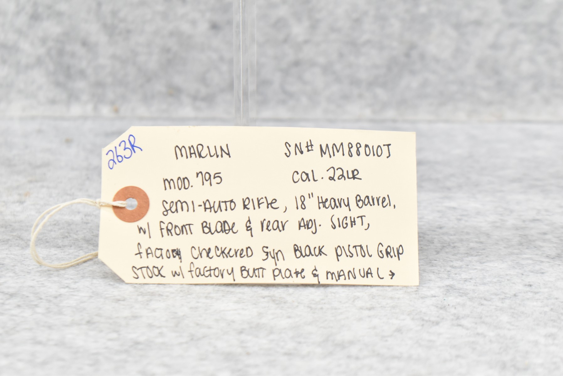 263R. Marlin – Mod. 795 – 22LR Cal. Semi-Auto Rifle – w/18” Heavy Barrel w/Front Blade & Rear Adj. Sights – w/Factory Checkered Synthetic Black Pistol Grip Stock w/Factory Butt Plate – w/Manual – Note: Missing Magazine