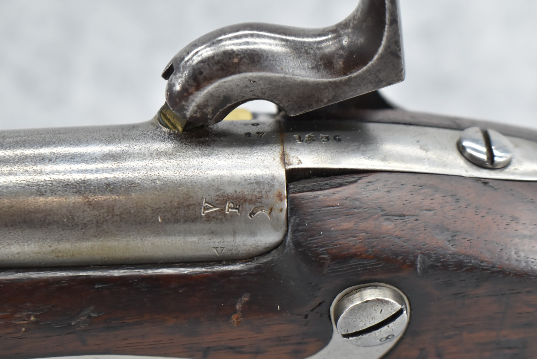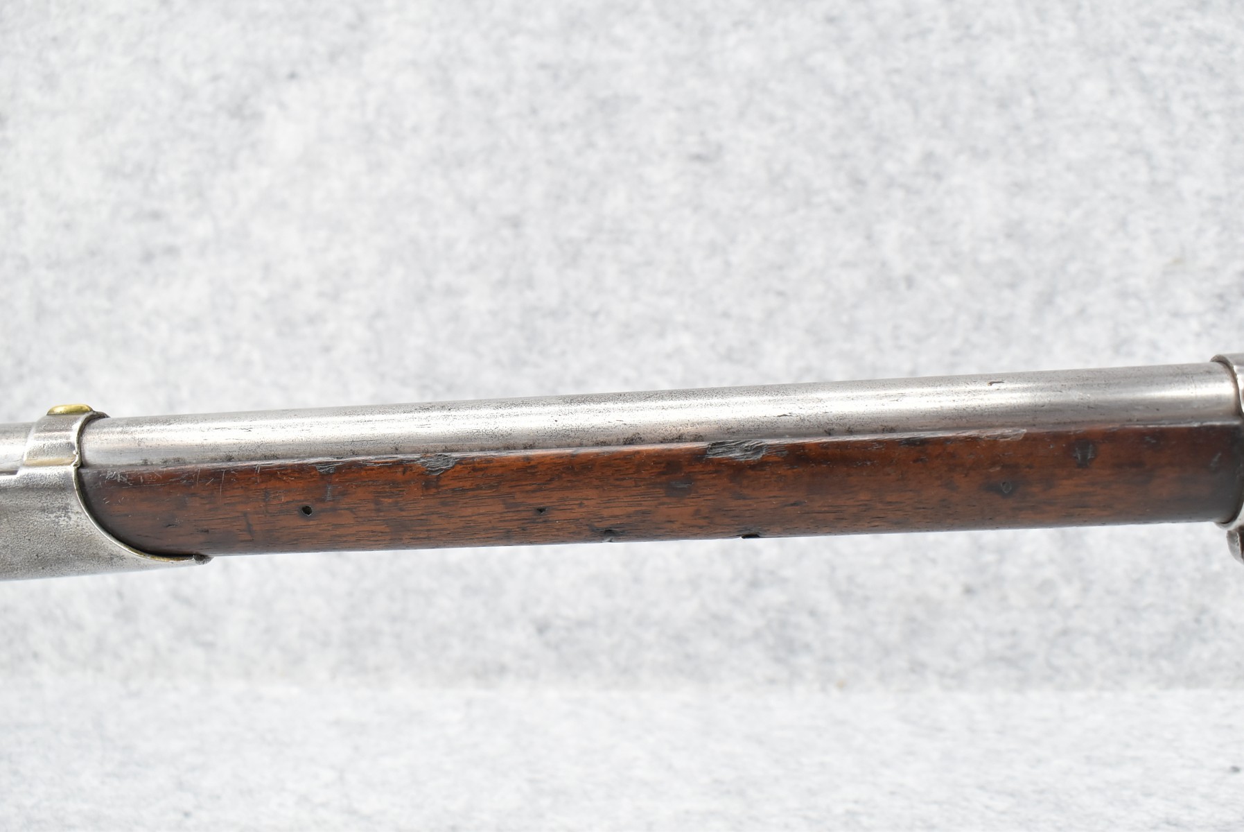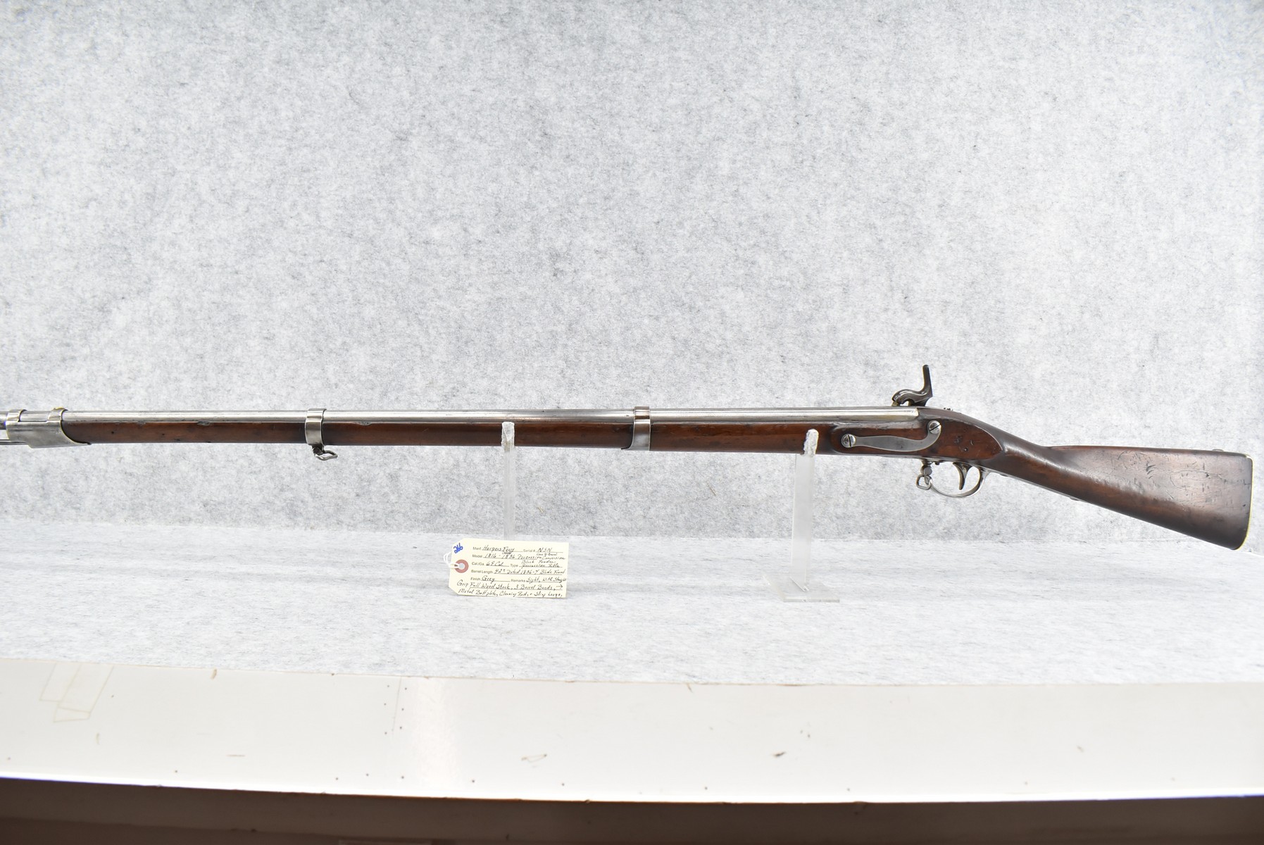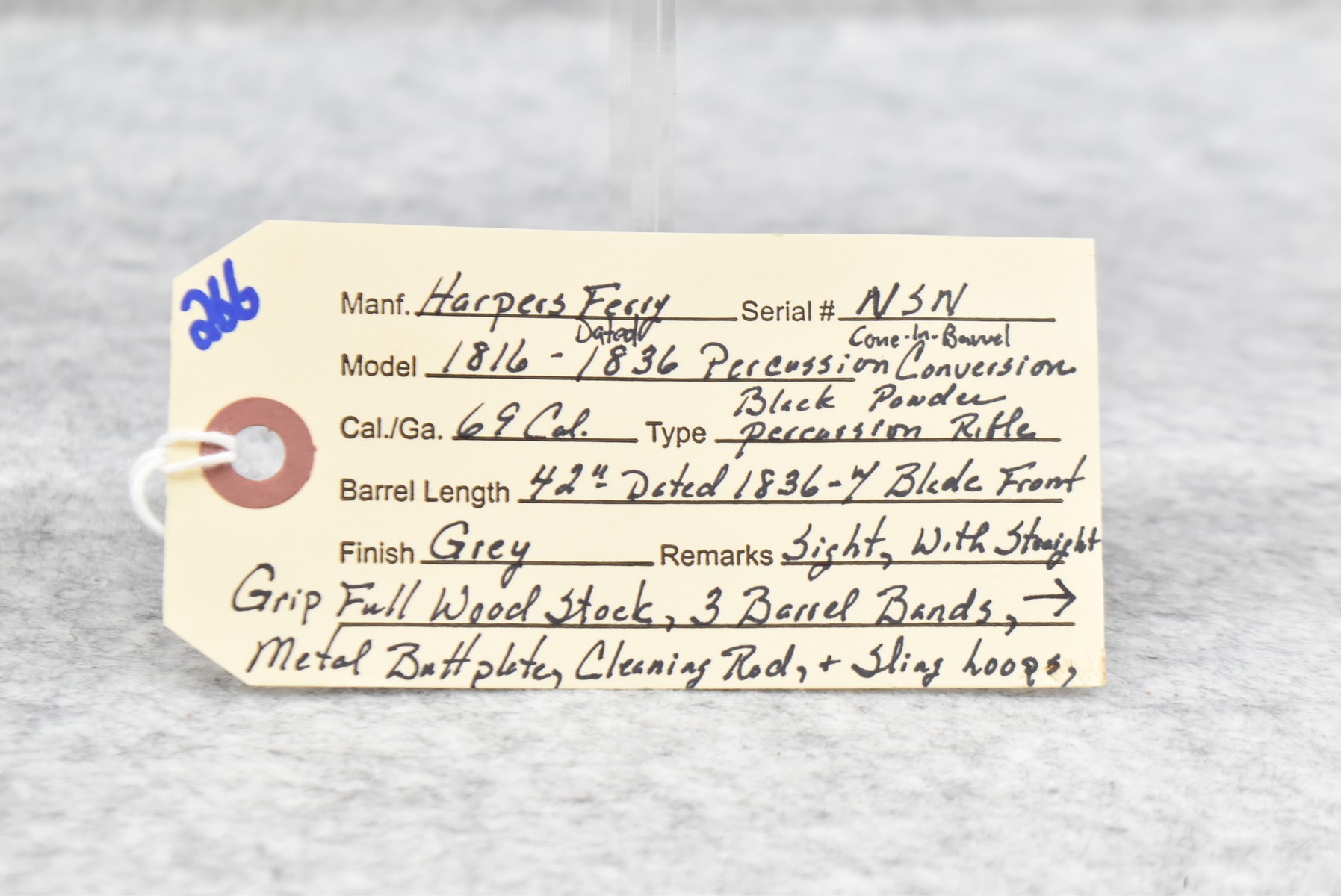 266. Harpers Ferry – Mod. 1816 – 69 Cal. Cone in Barrel Conversion Percussion Black Powder Rifle – w/42” Barrel w/Blade Front Sight – Gray Finish – w/Straight Grip Full Wood Stock w/Metal Butt Plate & 3 Barrel Bands – w/Sling Loops – w/Cleaning Rod – Both Barrel & Lock Dated 1836