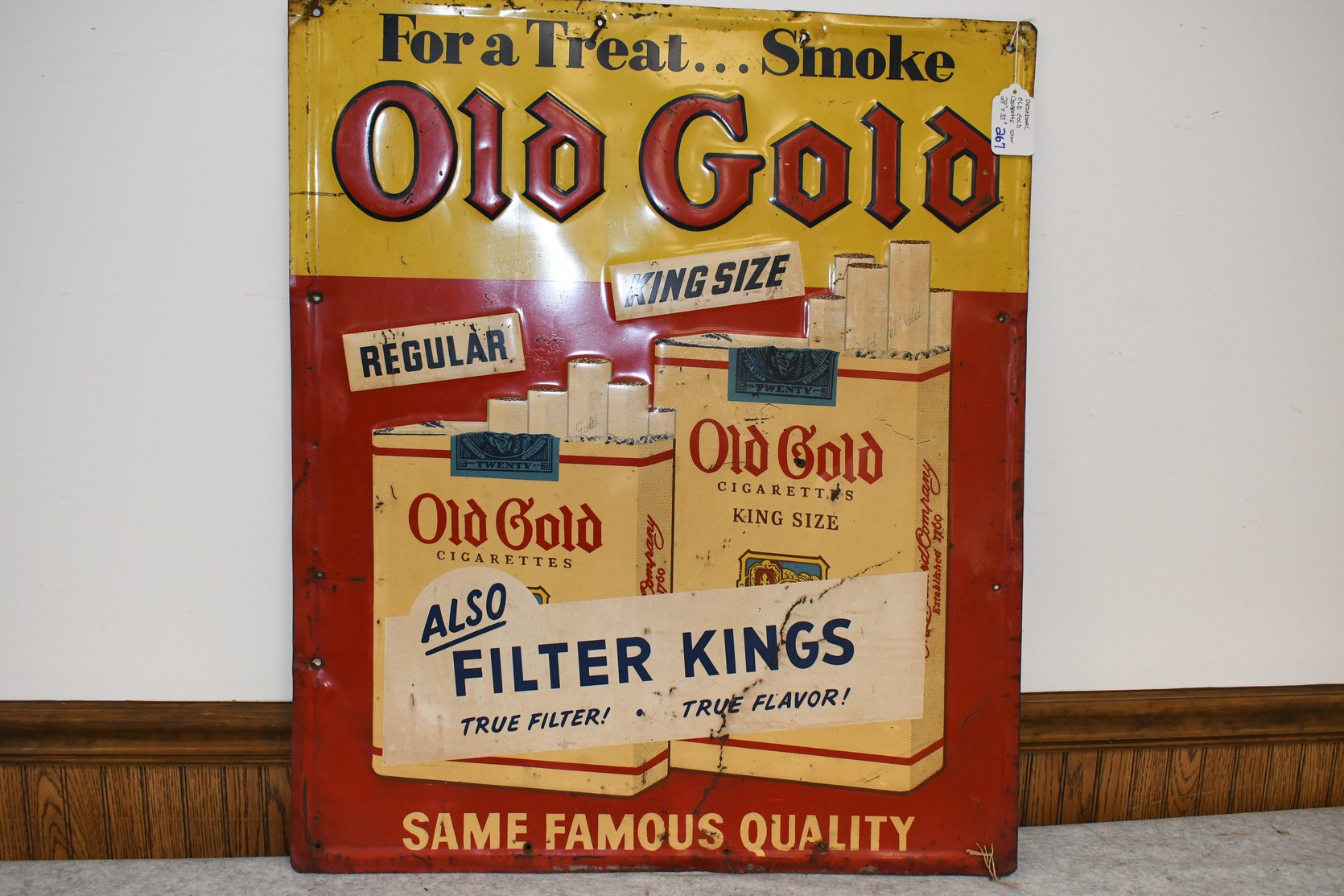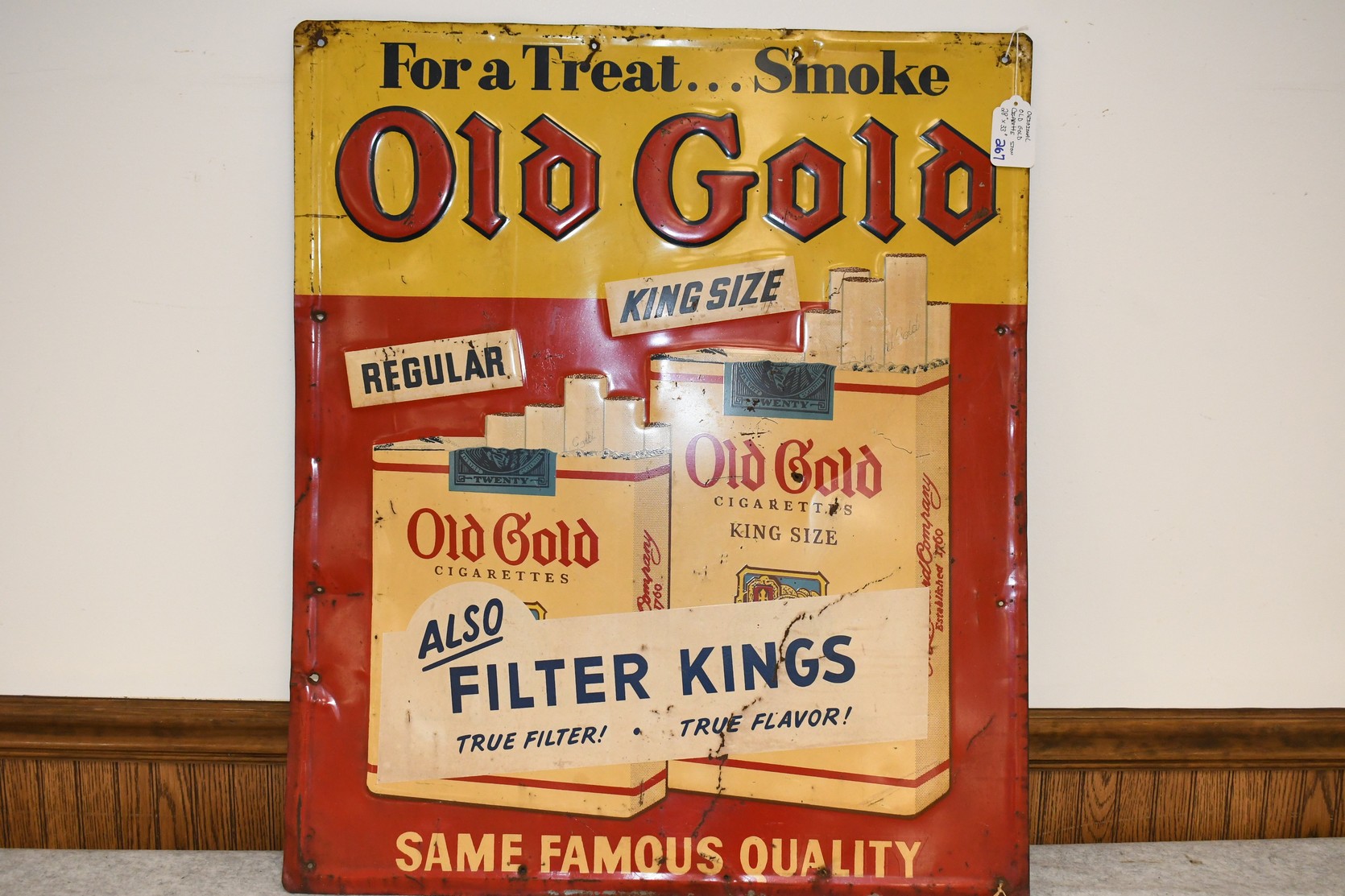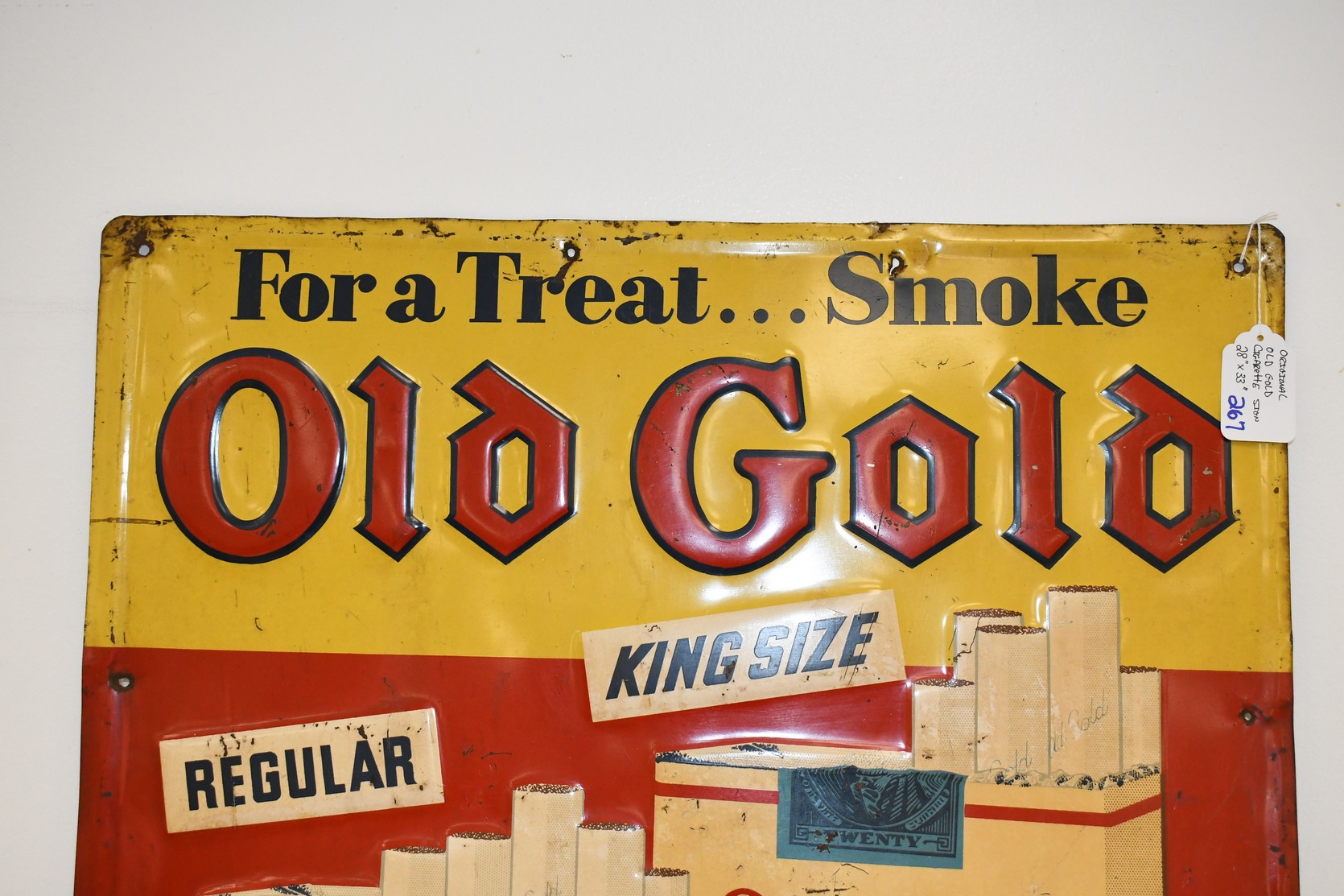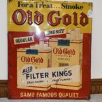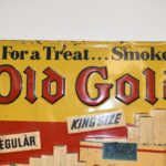 267.   Original Old Gold Cigarette Tin Sign w/Raised Lettering – “For a Treat… Smoke Old Gold”