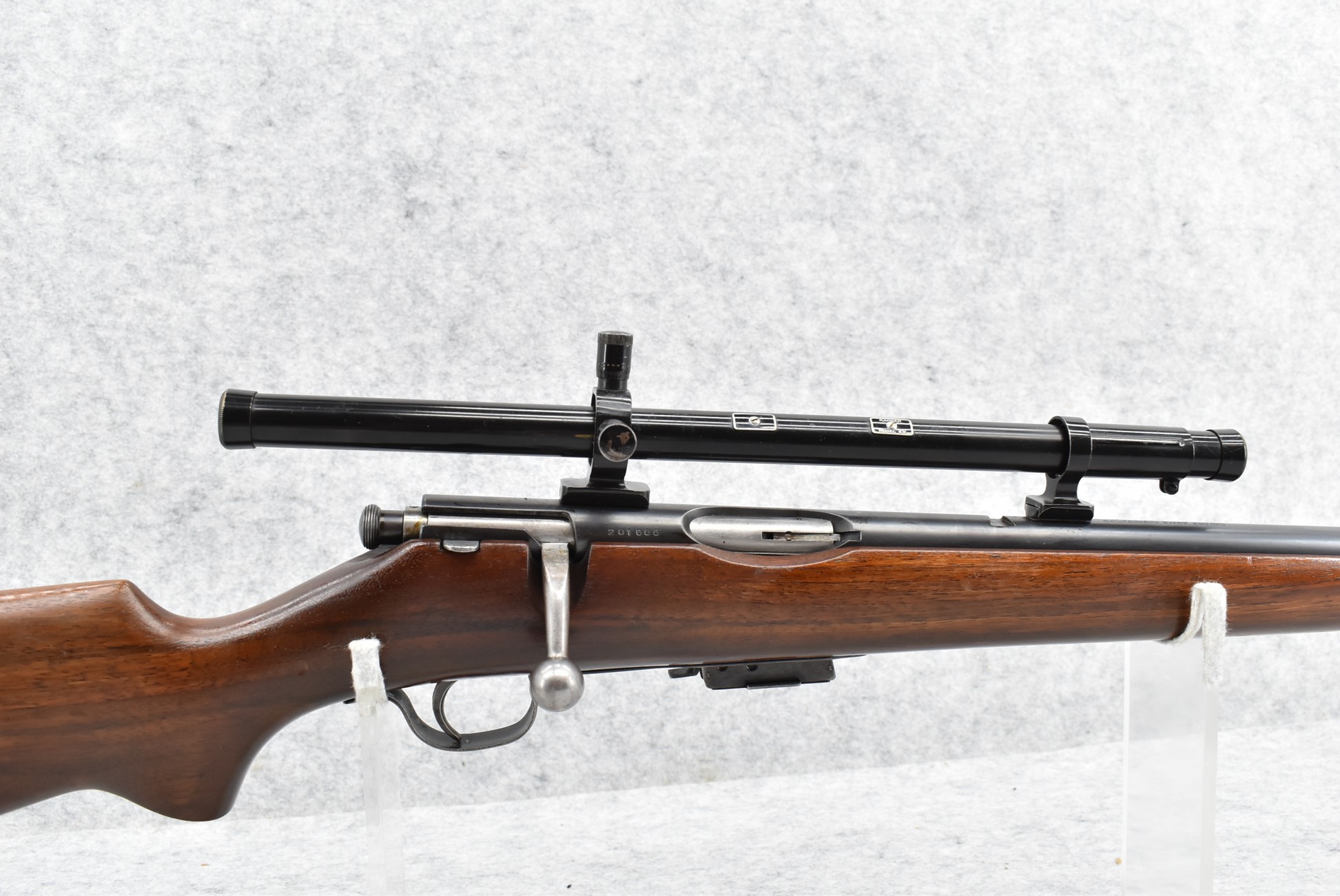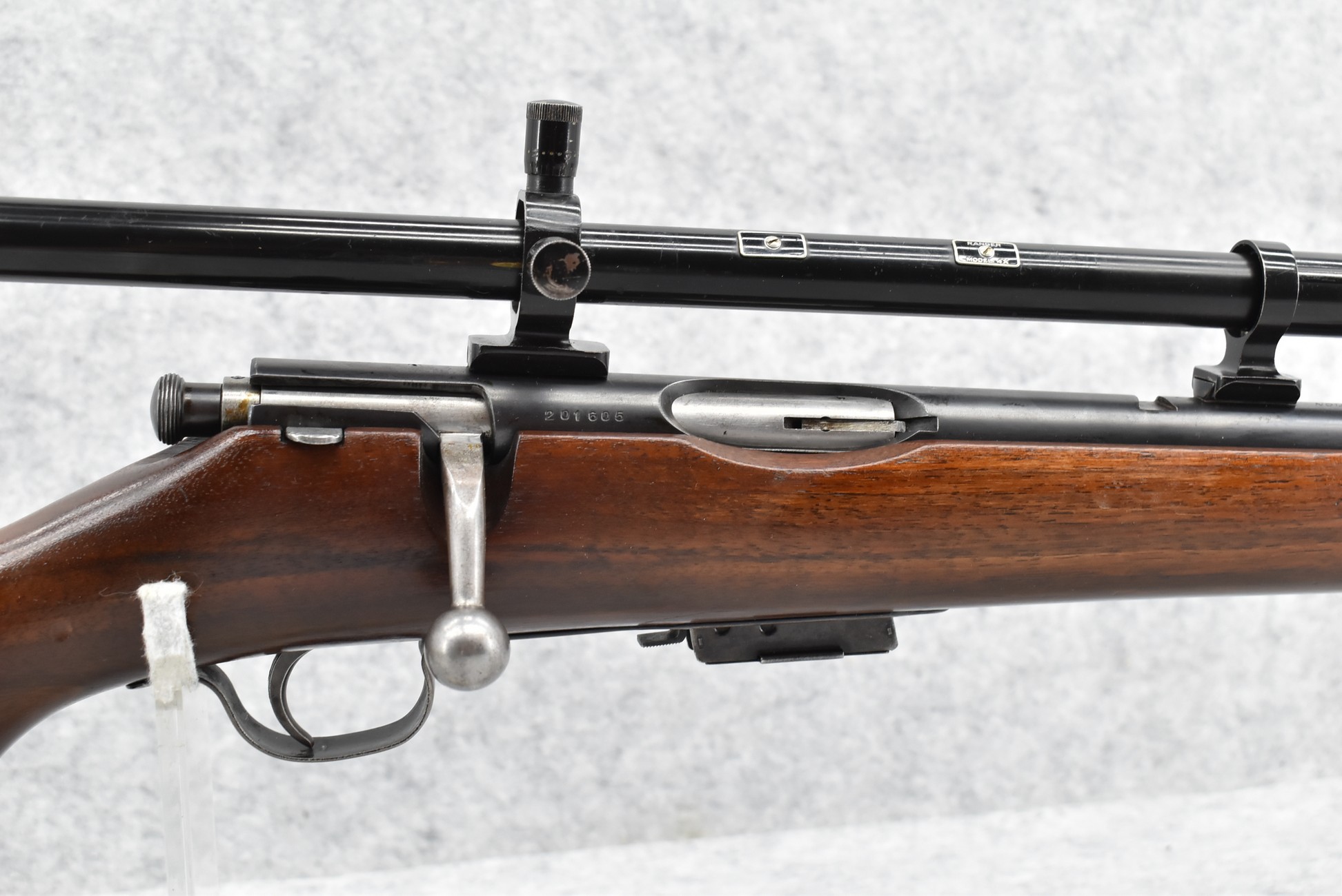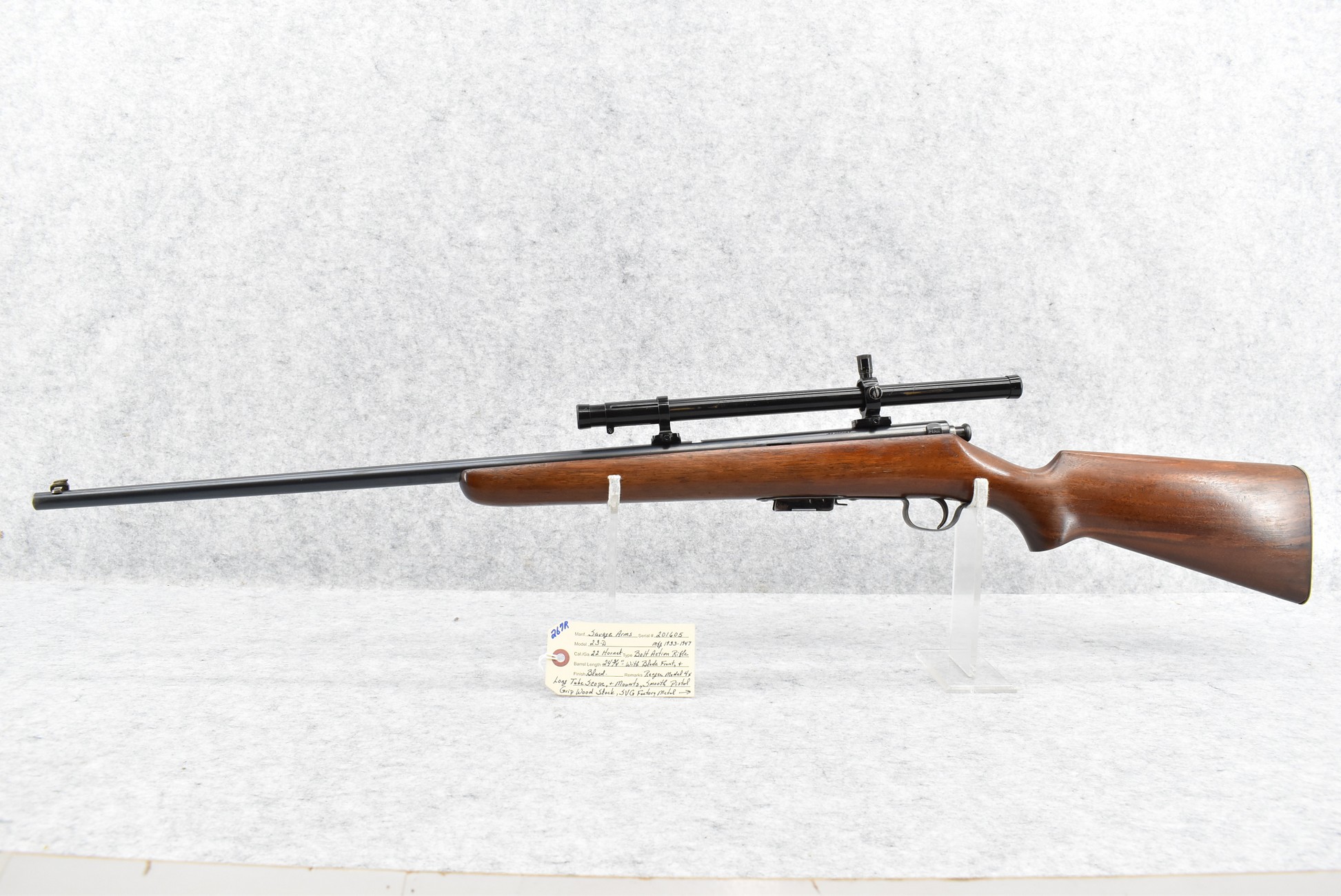 267R. Savage Arms – Mod. 23-D – 22 Hornet Cal. Bolt Action Rifle – w/24 ¾” Barrel w/Blade Front Sight – Blued Finish – w/Smooth Pistol Grip Wood Stock w/Savage Factory Metal Butt Plate – w/Detachable Magazine – w/Ranger Model 4x Long Tube Scope & Mounts