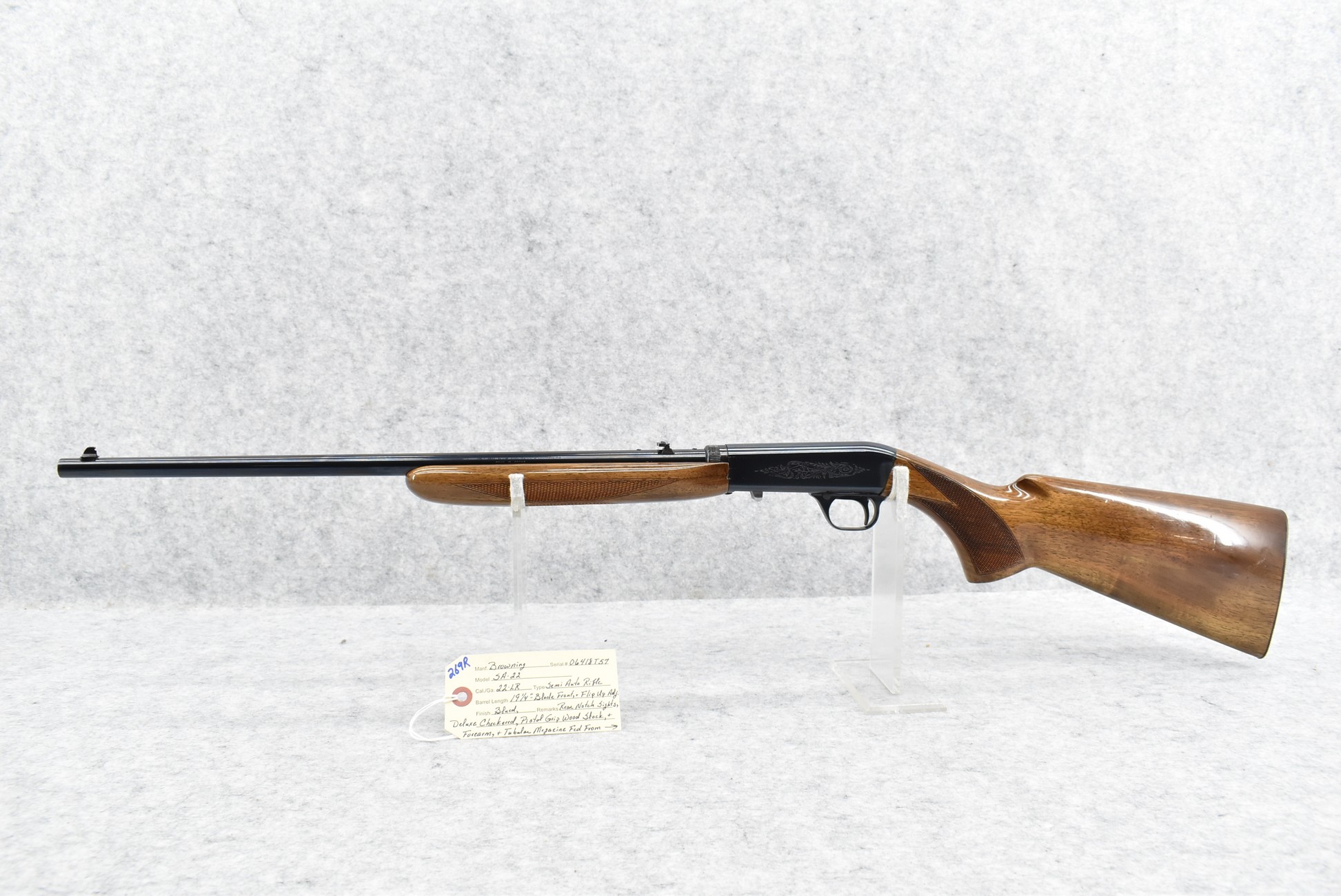 269R. Browning – Mod. SA-22 – 22LR Cal. Semi-Auto Rifle – w/19 ¼” Barrel w/Blade Front & Flip Up Adj. Rear Notch Sights – Blued Finish w/Enhanced Receiver on Both Sides – w/Deluxe Checkered Pistol Grip Wood Stocks w/Tubular Magazine Fed From Metal Butt Plate