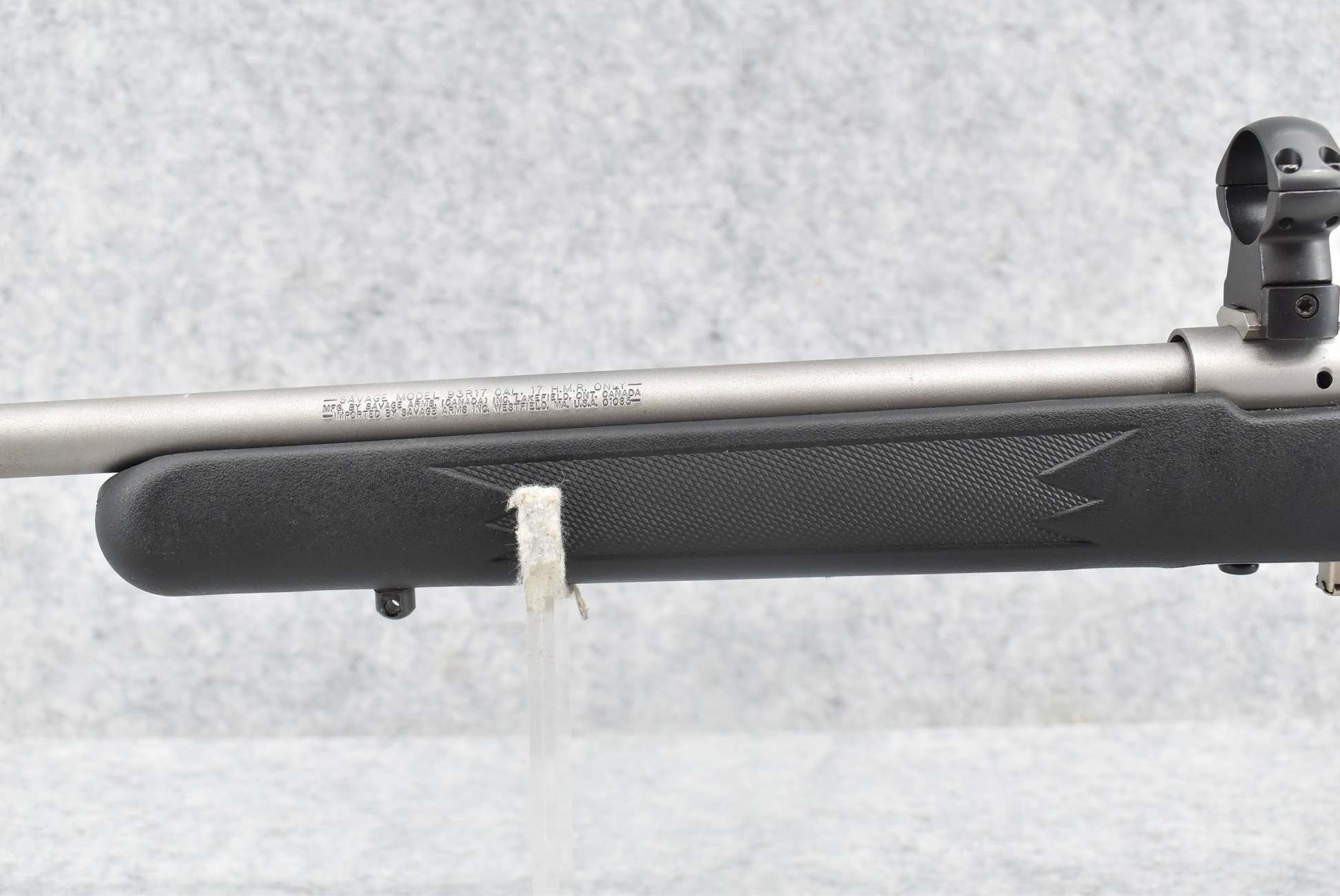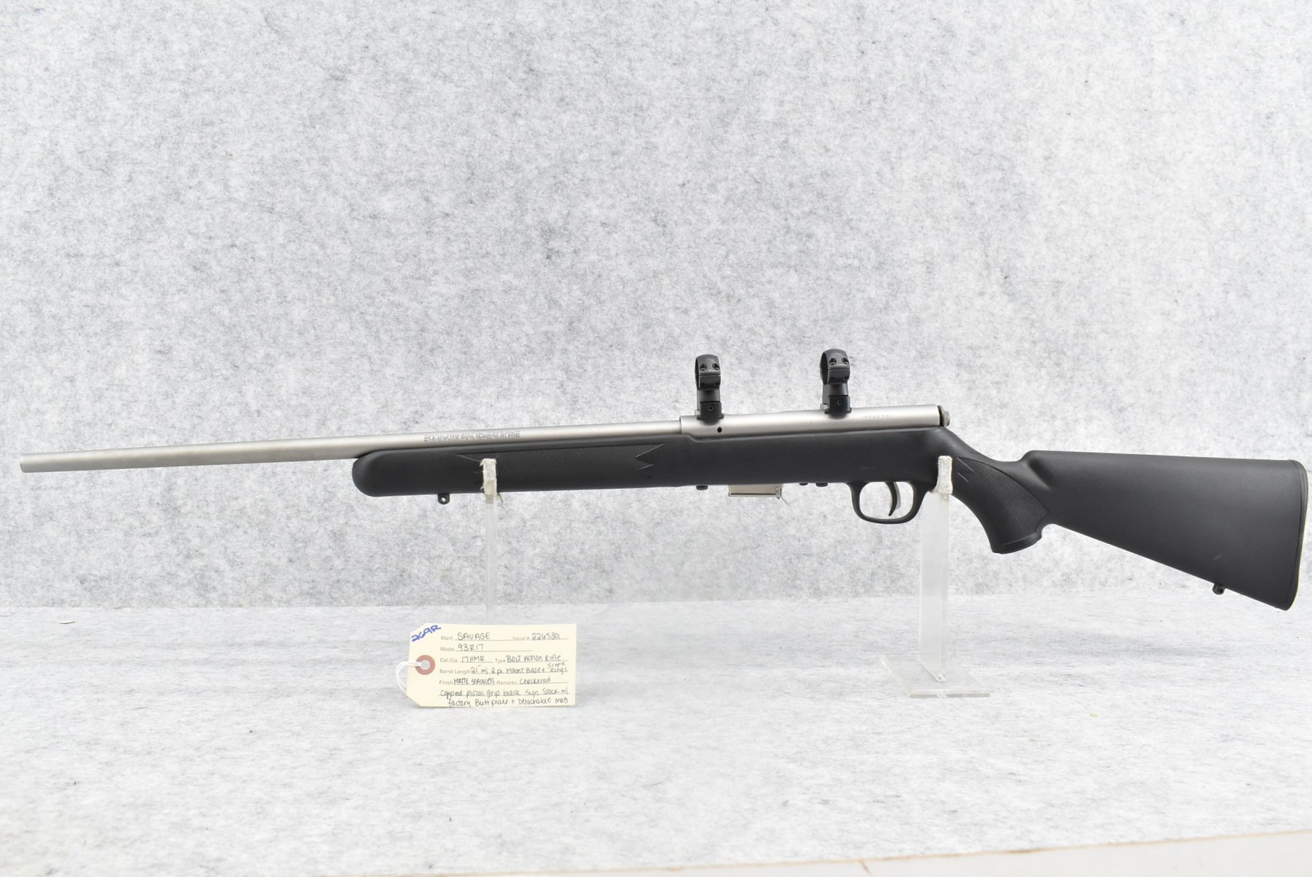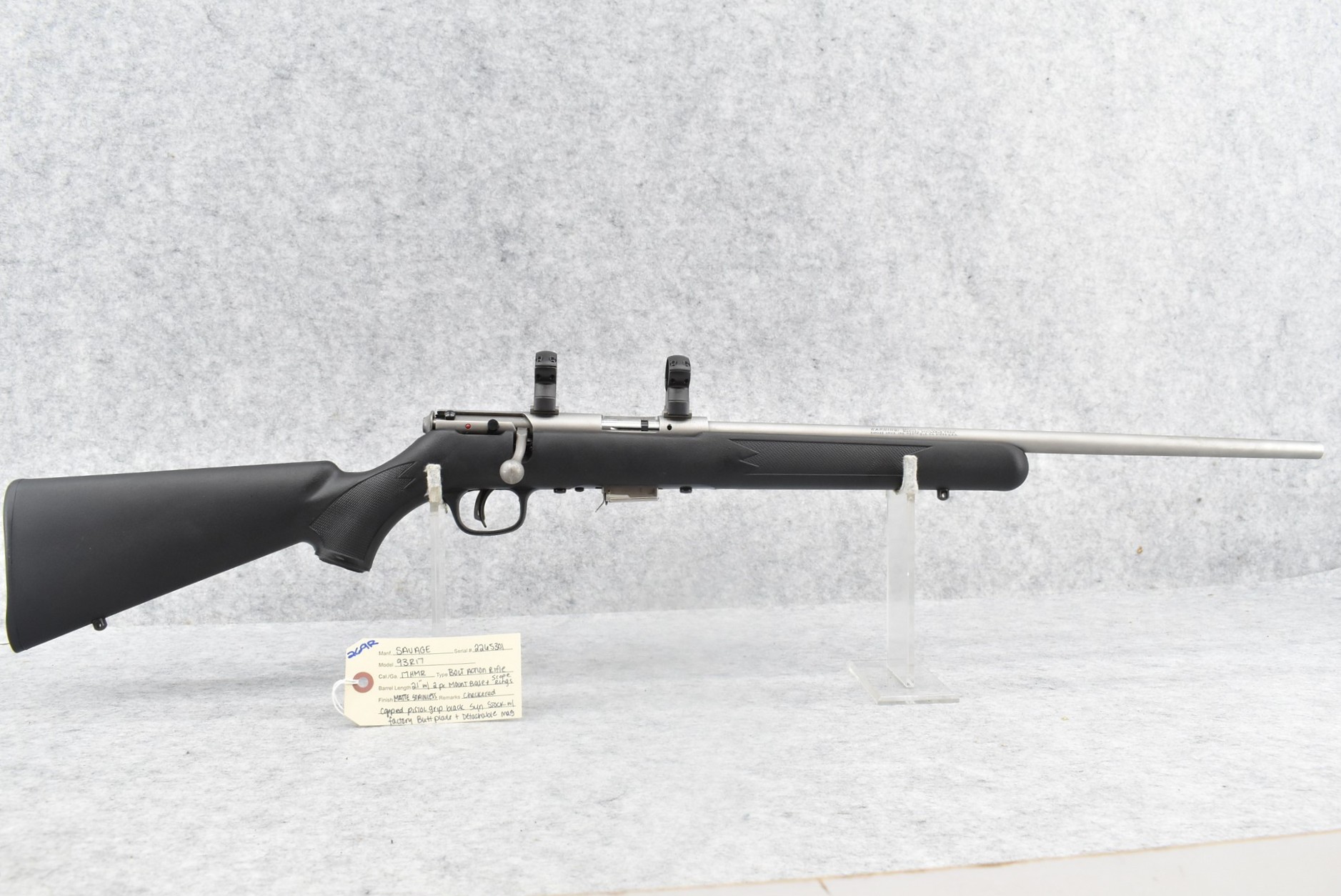 269R.     Savage – Mod. 93R17 – 17 HMR Cal. Bolt Action Rifle – w/21” Barrel – Matte Stainless Finish – w/Checkered Capped Pistol Grip Black Synthetic Stock w/Factory Butt Plate – w/Detachable Mag – w/Rings