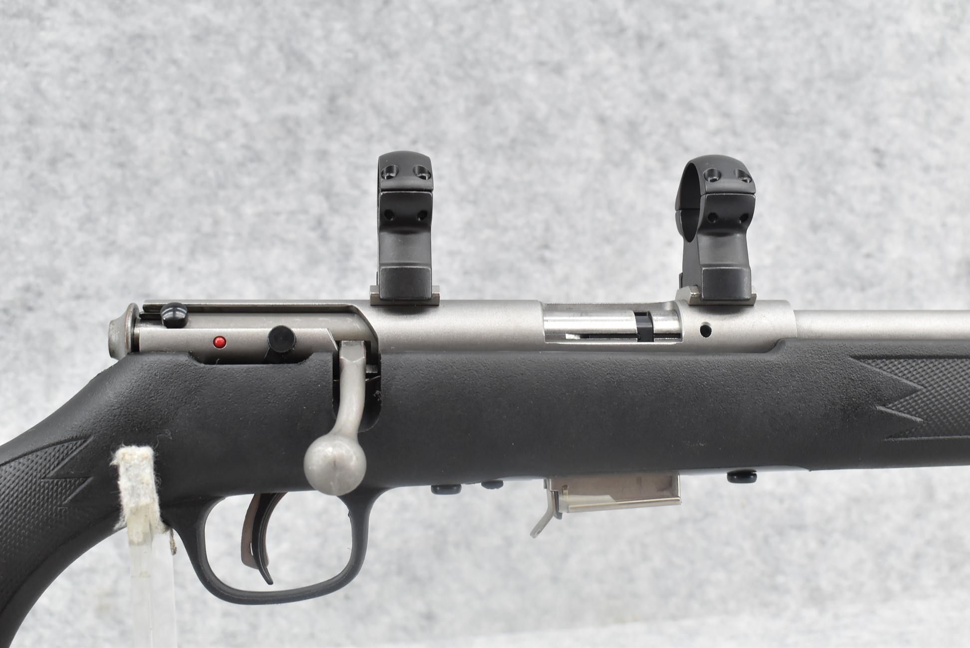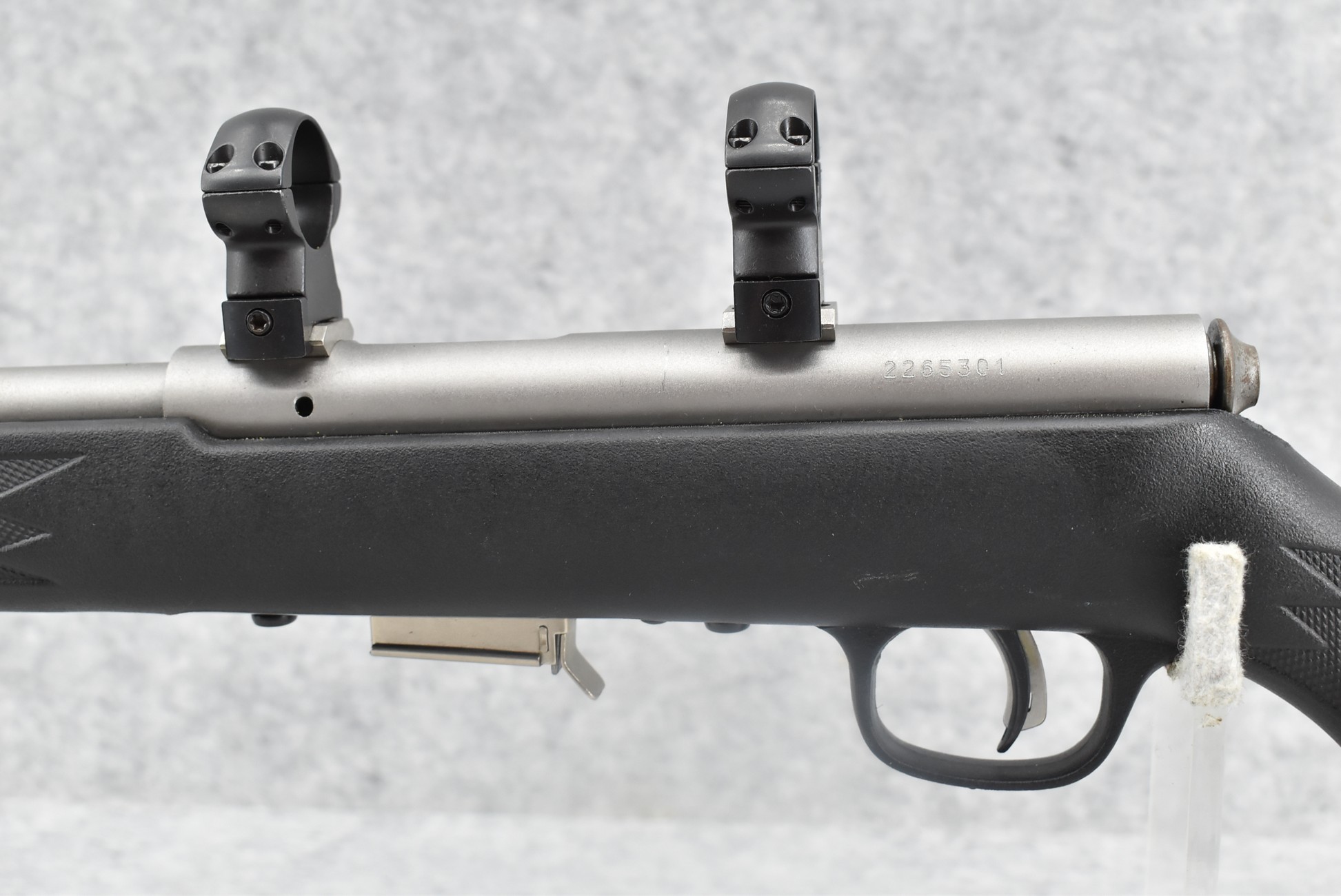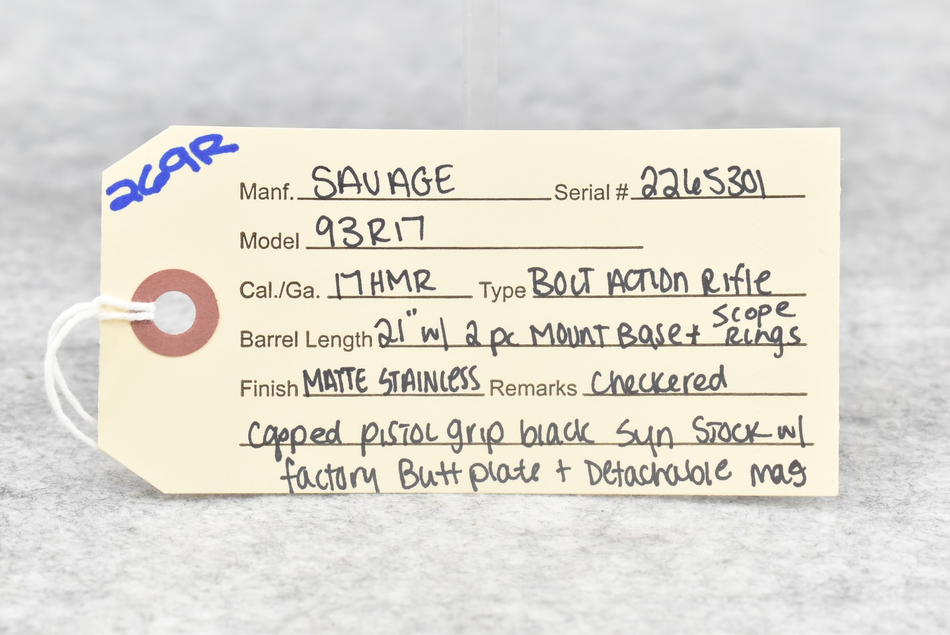 269R.     Savage – Mod. 93R17 – 17 HMR Cal. Bolt Action Rifle – w/21” Barrel – Matte Stainless Finish – w/Checkered Capped Pistol Grip Black Synthetic Stock w/Factory Butt Plate – w/Detachable Mag – w/Rings