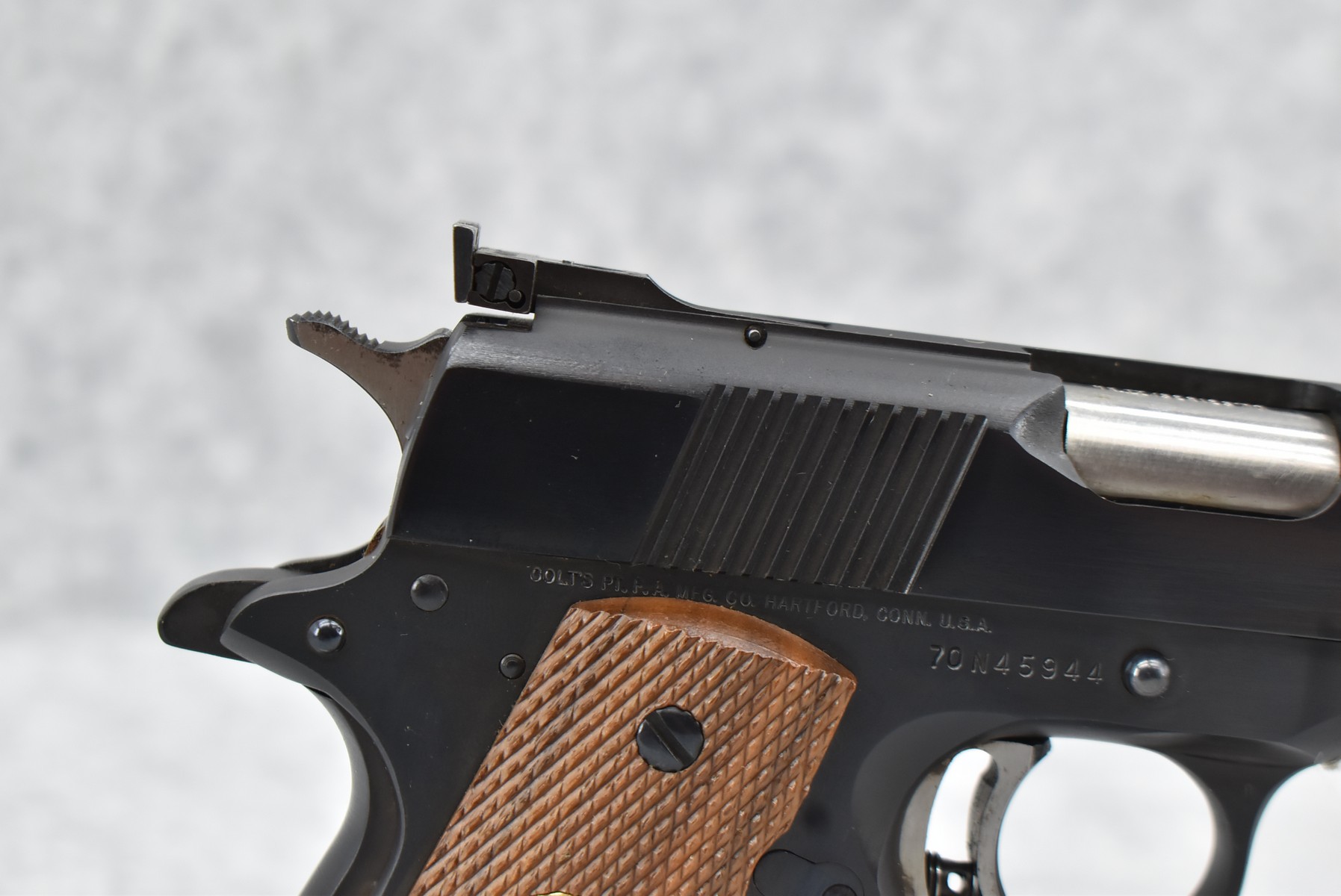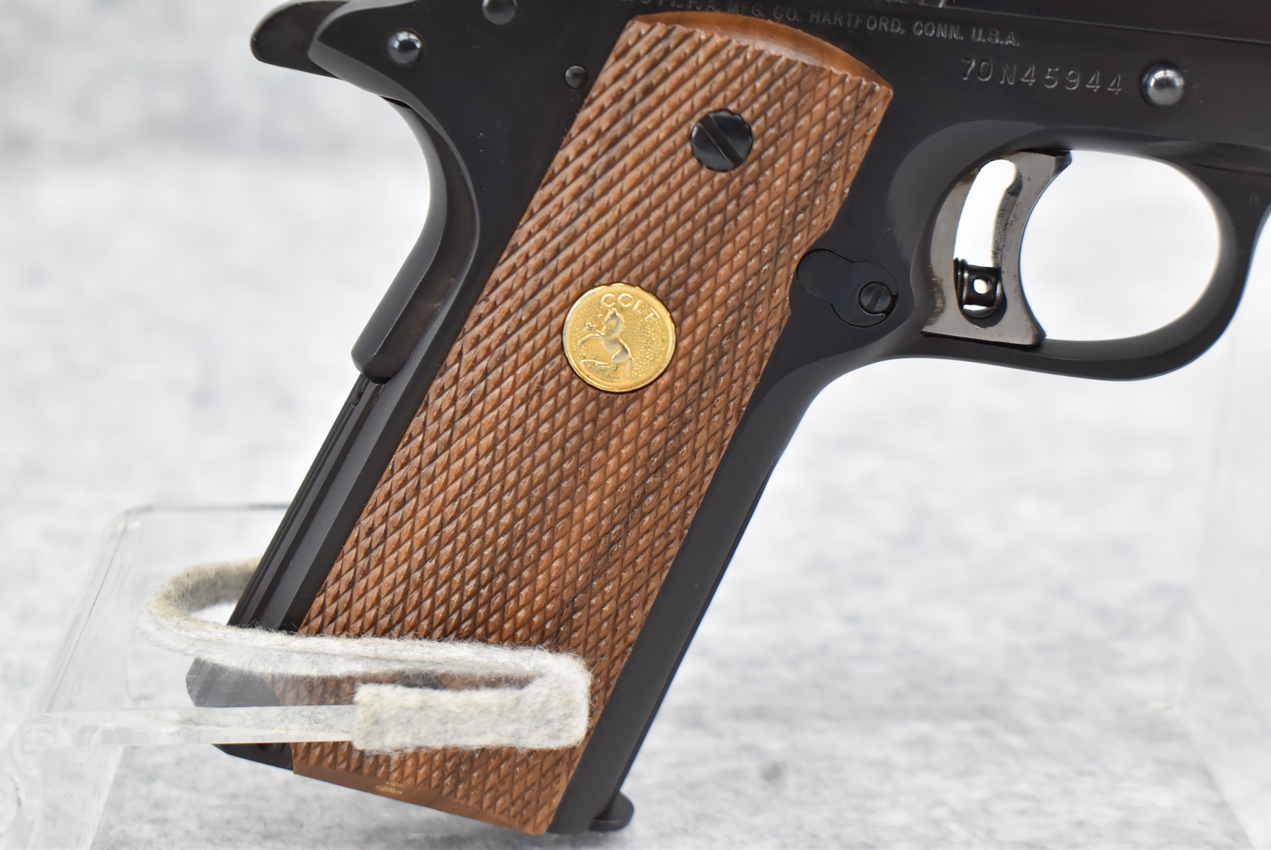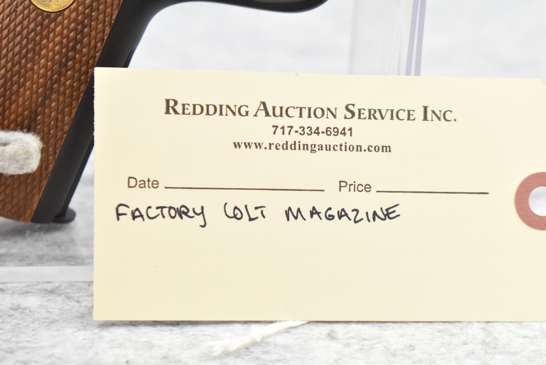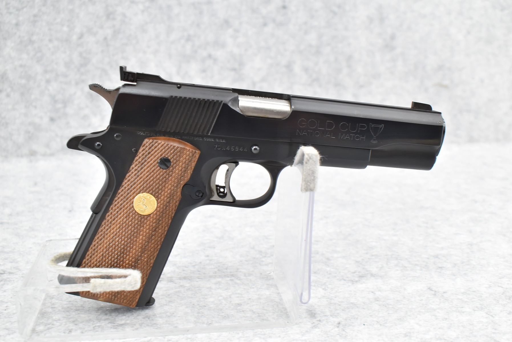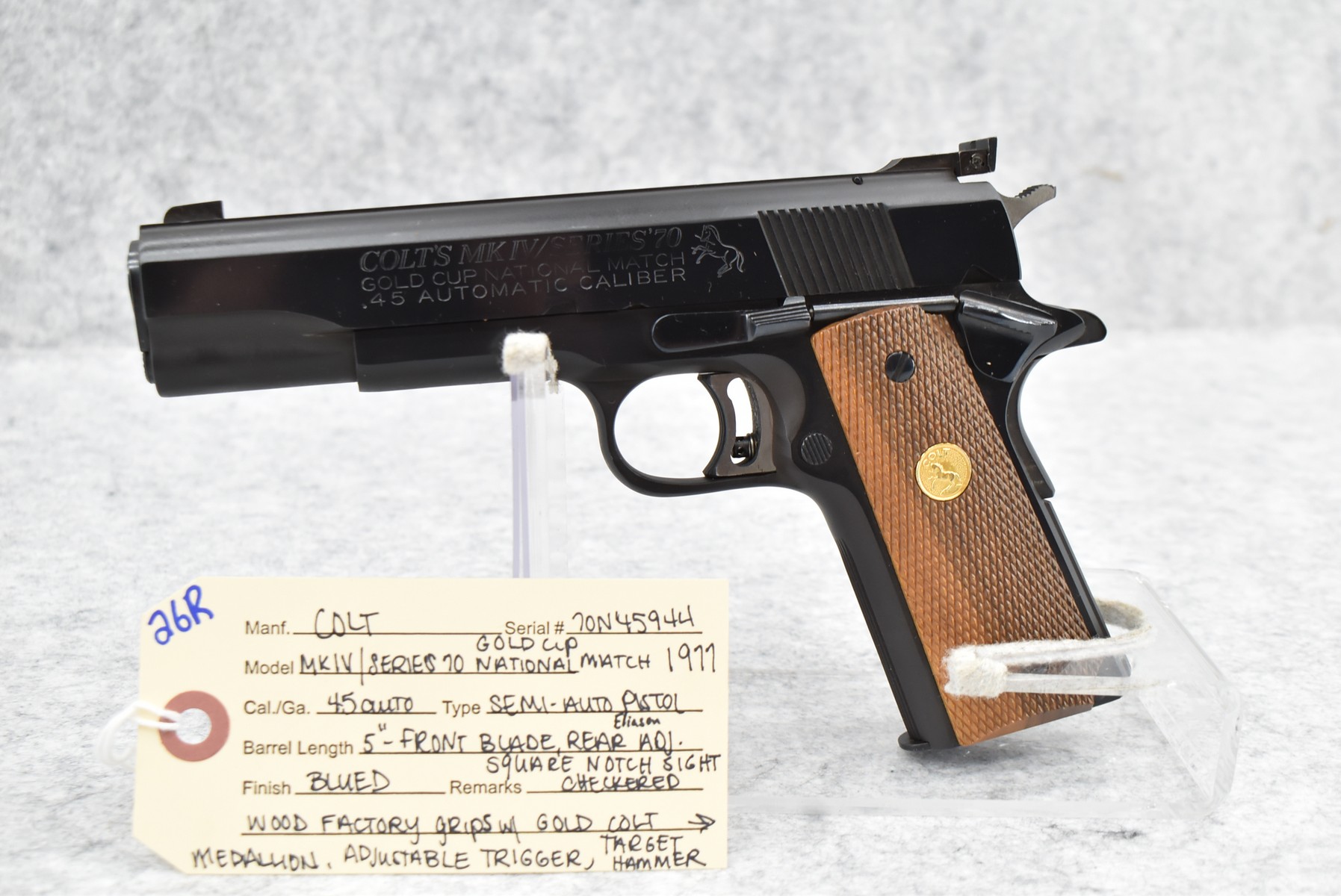 26R. Colt – Mod. MKIV/Series 70 Gold Cup National Match – 45 Auto Cal. Semi-Auto Pistol – w/5” Barrel w/Front Blade & Rear Eliason Adj. Square Notch Sights – Blued Finish – w/Checkered Wood Factory Grips w/Gold Colt Medallion – w/Adj. Trigger – w/Target Hammer – w/Factory Colt Magazine – Mfg. 1977