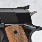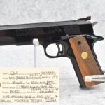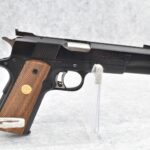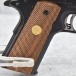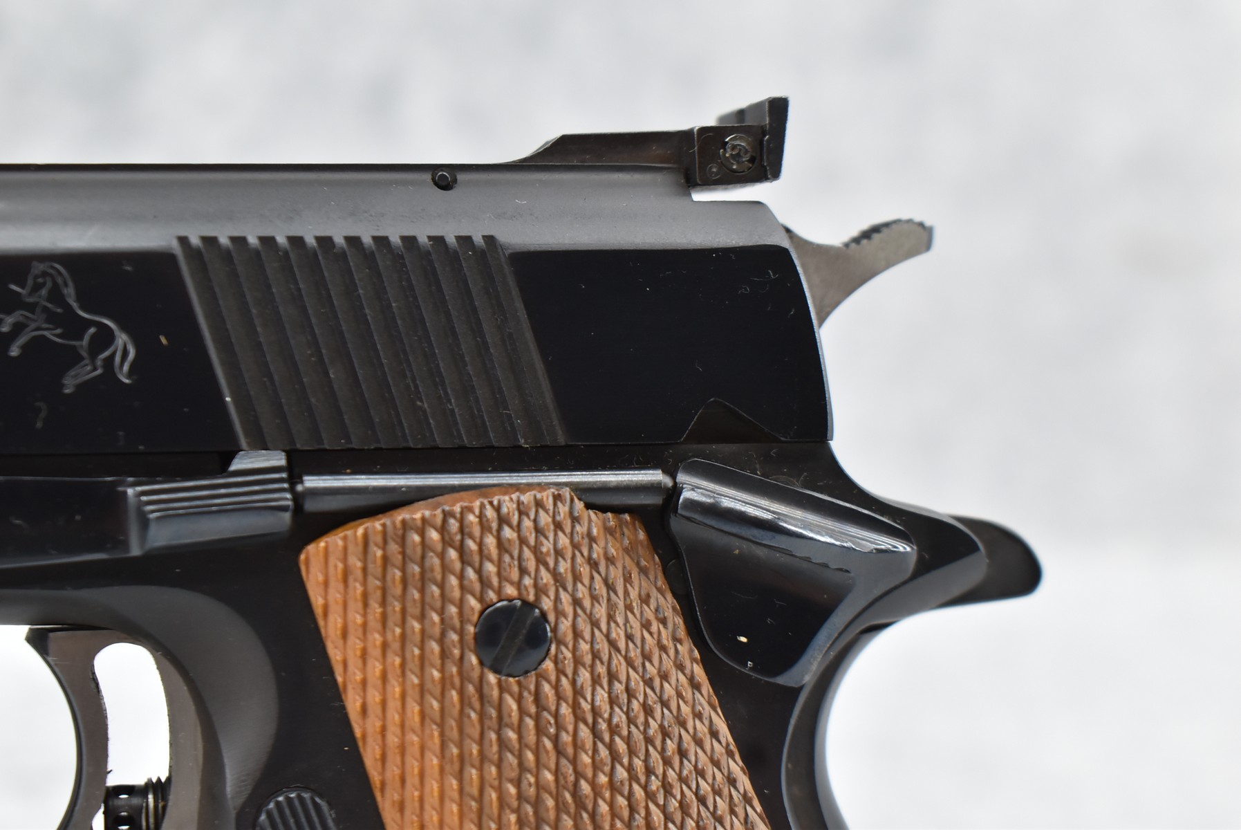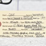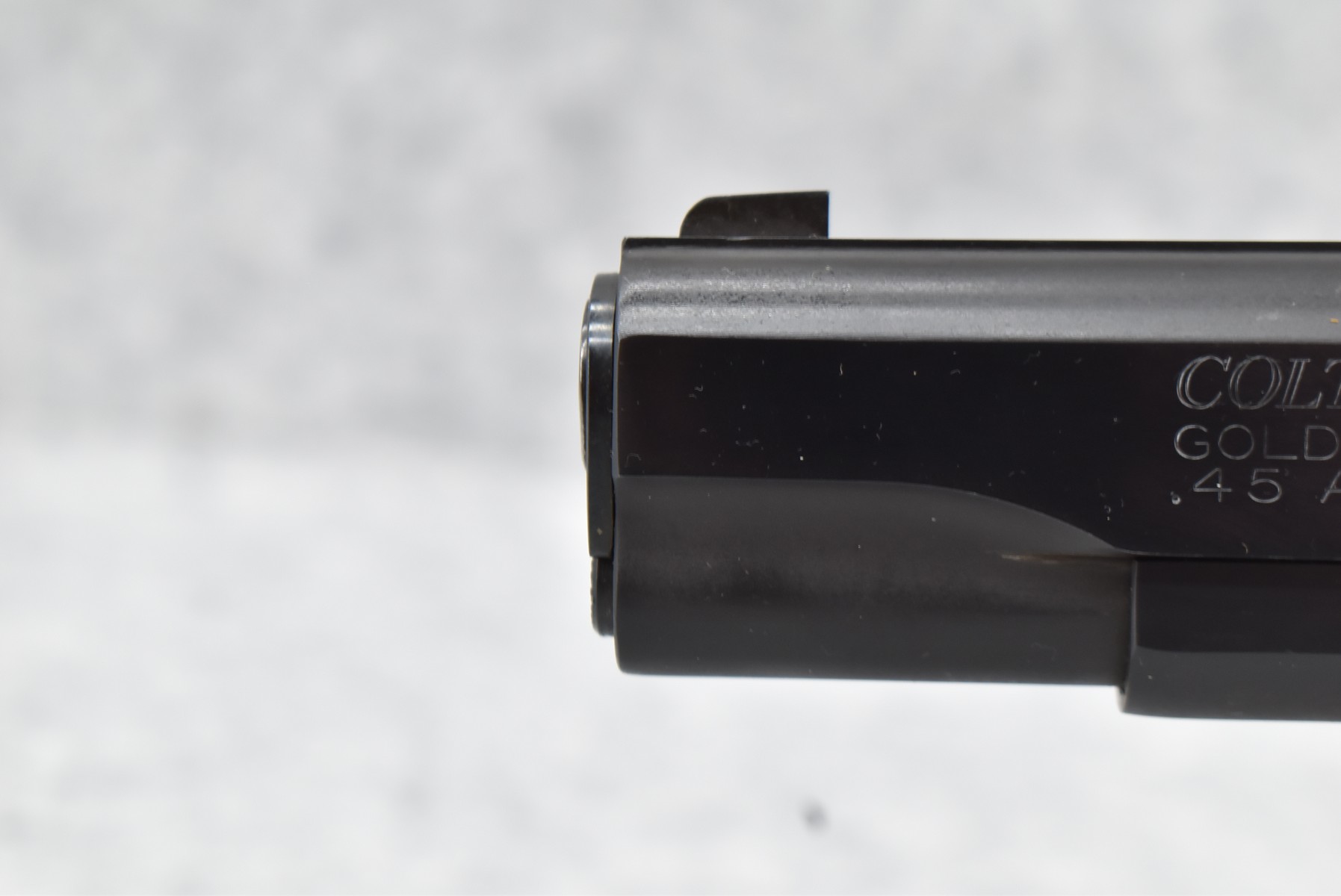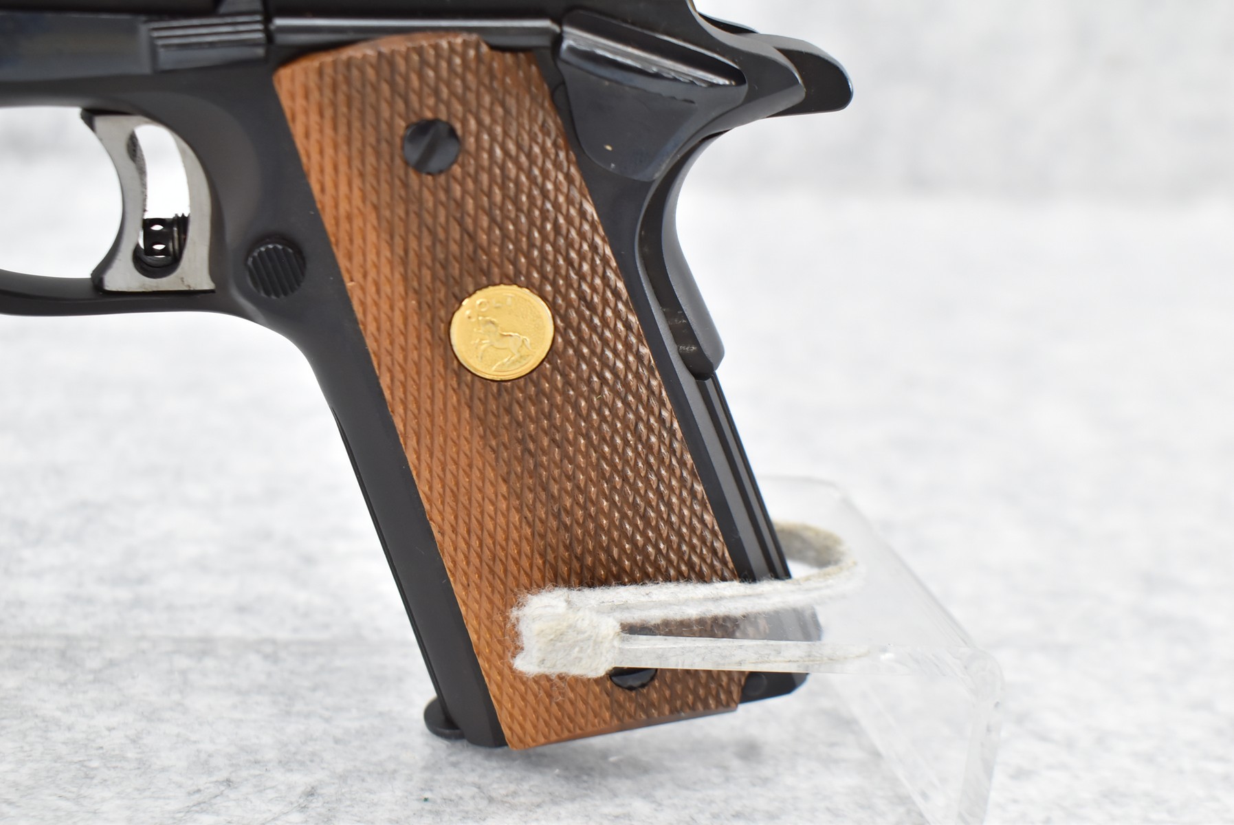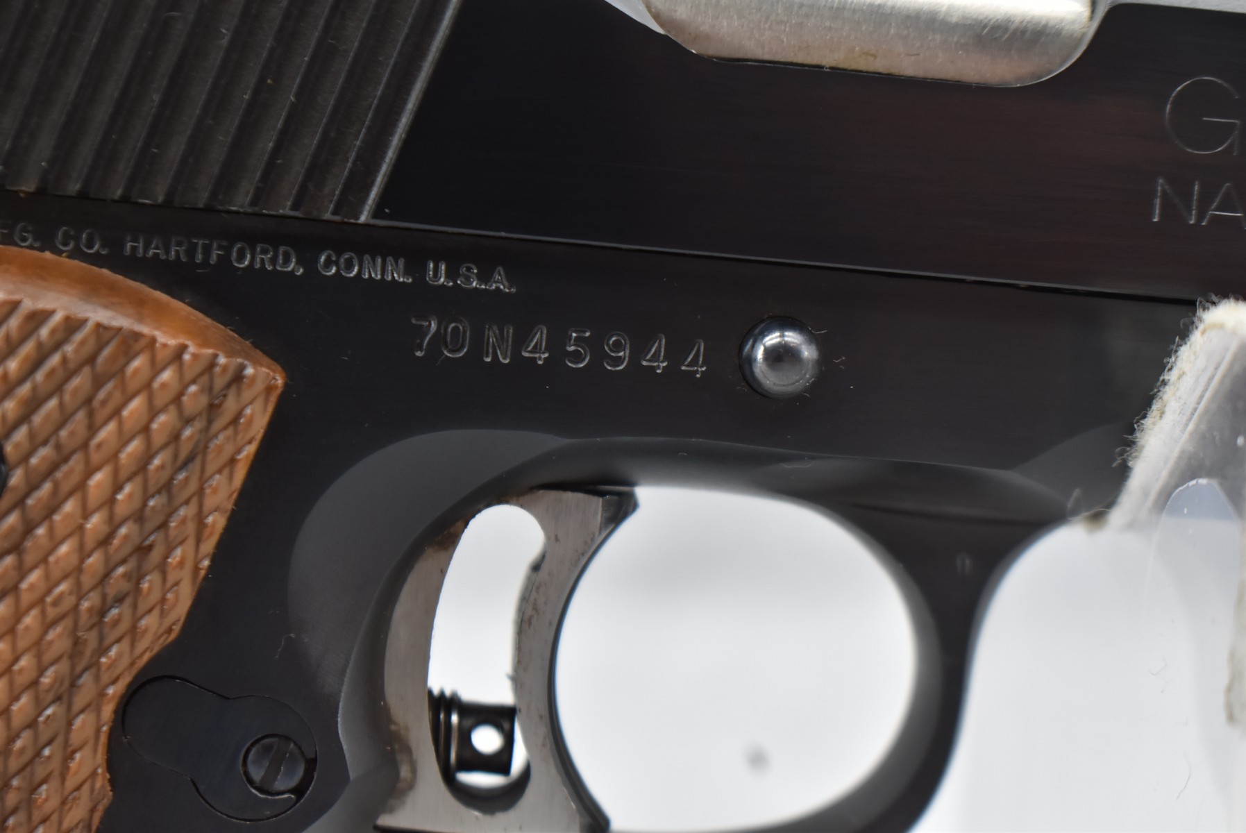 26R. Colt – Mod. MKIV/Series 70 Gold Cup National Match – 45 Auto Cal. Semi-Auto Pistol – w/5” Barrel w/Front Blade & Rear Eliason Adj. Square Notch Sights – Blued Finish – w/Checkered Wood Factory Grips w/Gold Colt Medallion – w/Adj. Trigger – w/Target Hammer – w/Factory Colt Magazine – Mfg. 1977