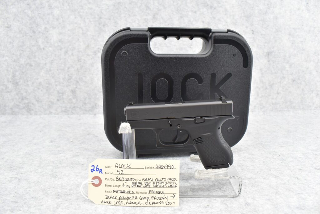 26R. Glock – Mod. 42 – 380 Auto Cal. Semi-Auto Pistol – w/3” Barrel w/White Dot Front & Rear White Outline Notch Sights – Matte Blued Finish – w/Factory Black Polymer Grip – w/Factory Hard Case, Manual, Cleaning Rod & 2 Factory Mags