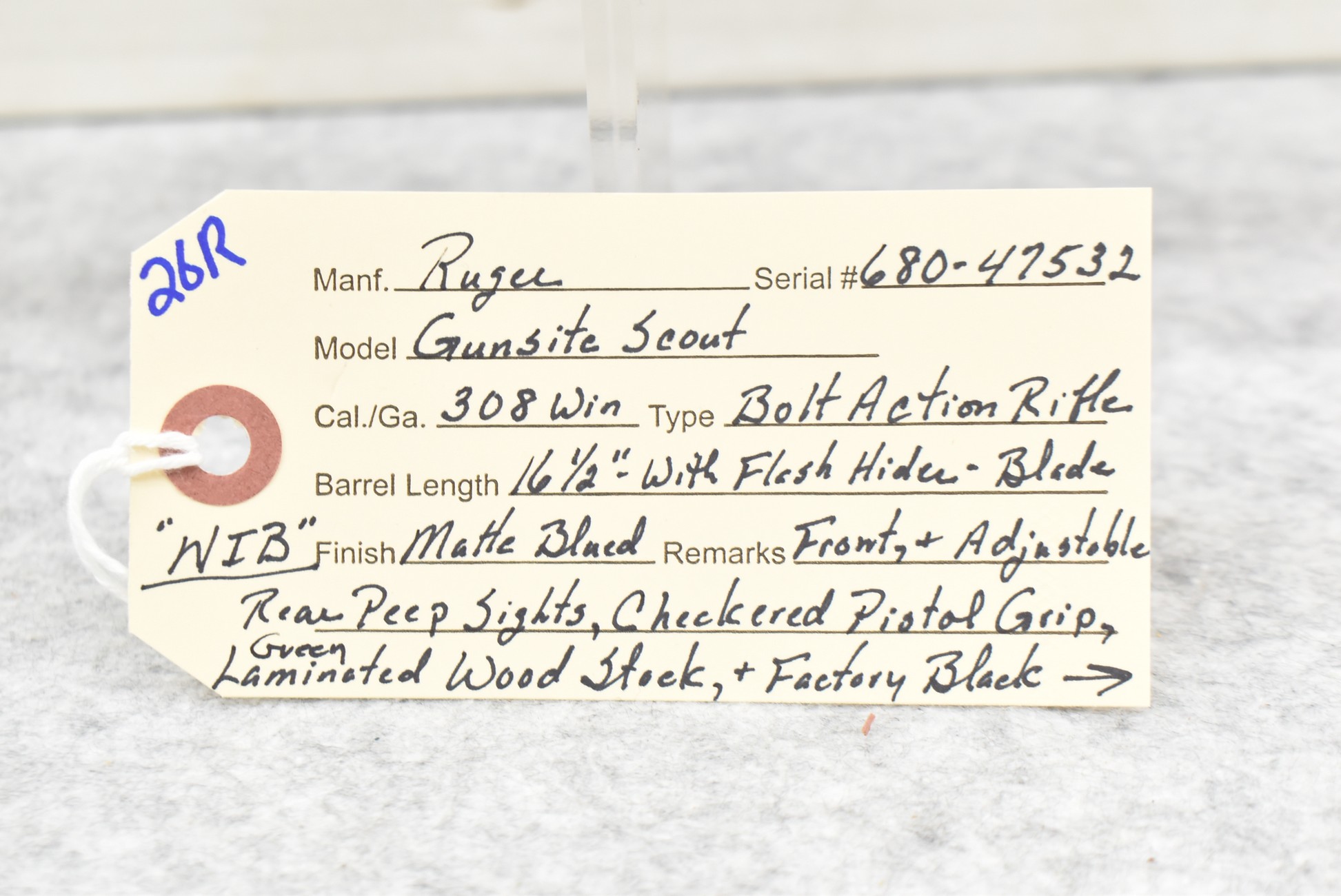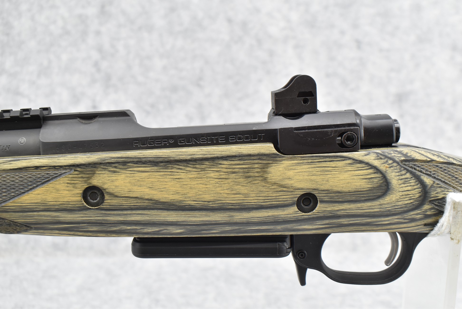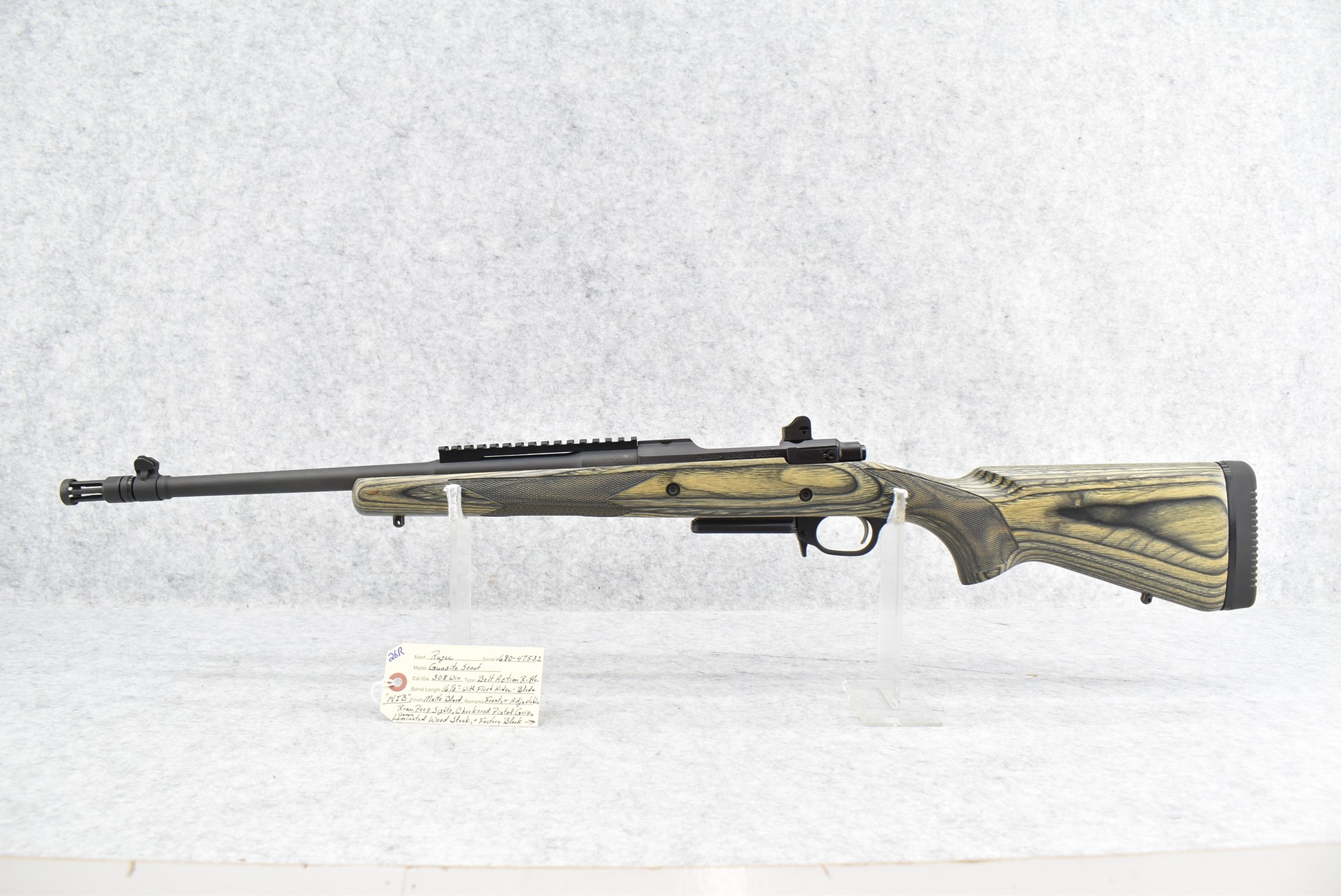 26R. Ruger – Mod. Gunsite Scout – 308 Win. Cal. Bolt Action Rifle – w/16½” Barrel w/Flash Hider, Blade Front Sight, and Adjustable Rear Peep Sight – Matte Blued Finish – w/Checkered Pistol Grip Green Laminated Wood Stock w/Factory Black Rubber Butt Pad – New in Factory Box w/2 Factory Detachable Magazines, Scope Rings, Manual, and Accessories