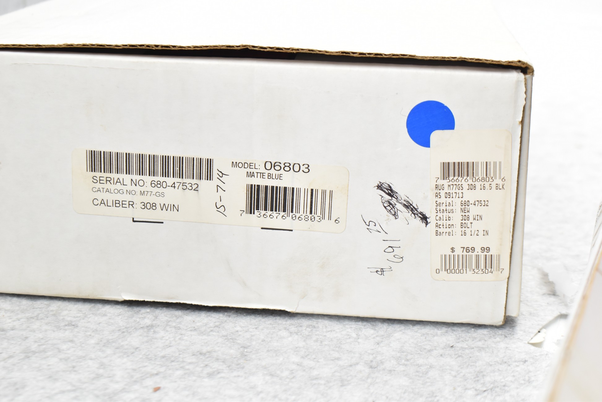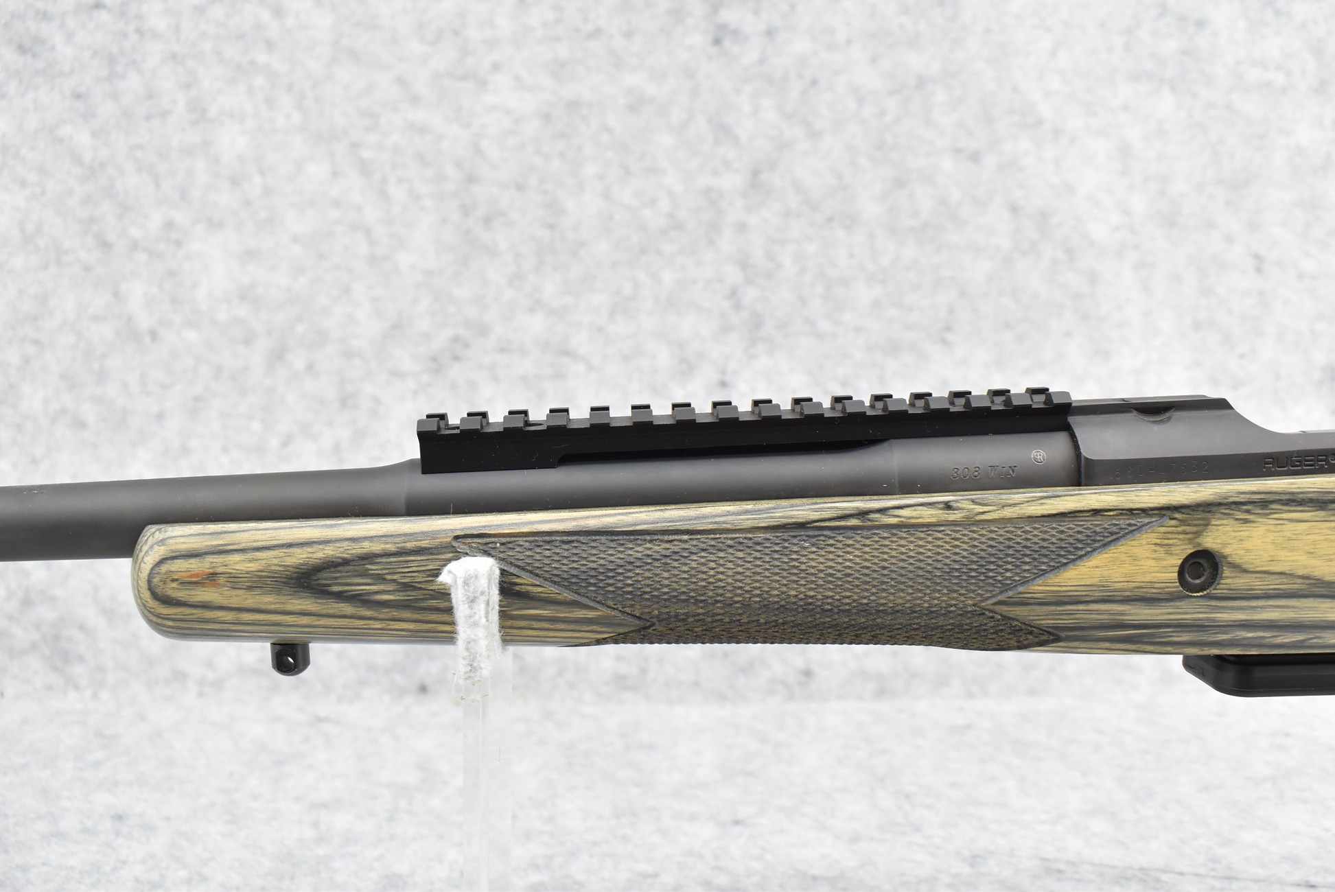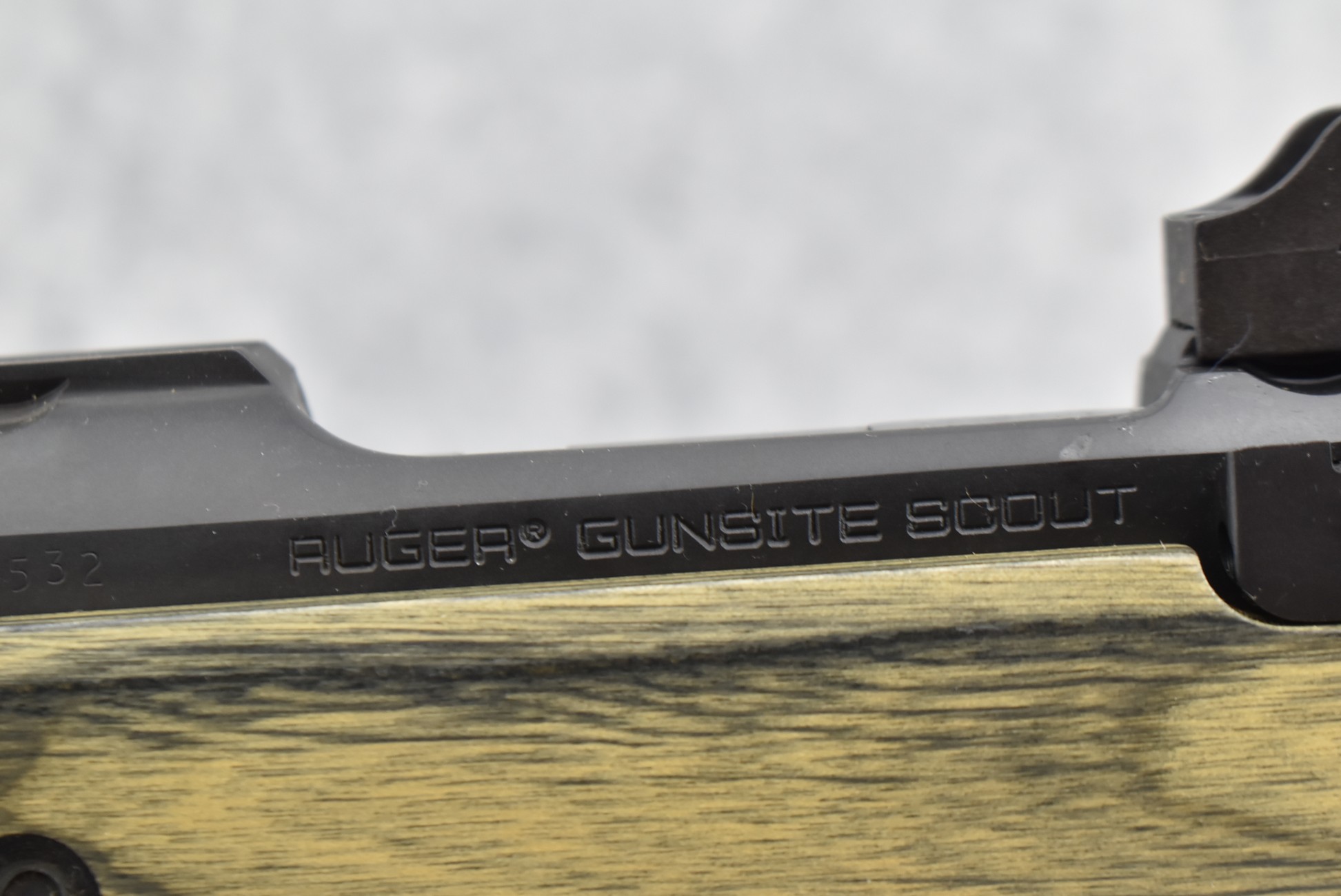 26R. Ruger – Mod. Gunsite Scout – 308 Win. Cal. Bolt Action Rifle – w/16½” Barrel w/Flash Hider, Blade Front Sight, and Adjustable Rear Peep Sight – Matte Blued Finish – w/Checkered Pistol Grip Green Laminated Wood Stock w/Factory Black Rubber Butt Pad – New in Factory Box w/2 Factory Detachable Magazines, Scope Rings, Manual, and Accessories