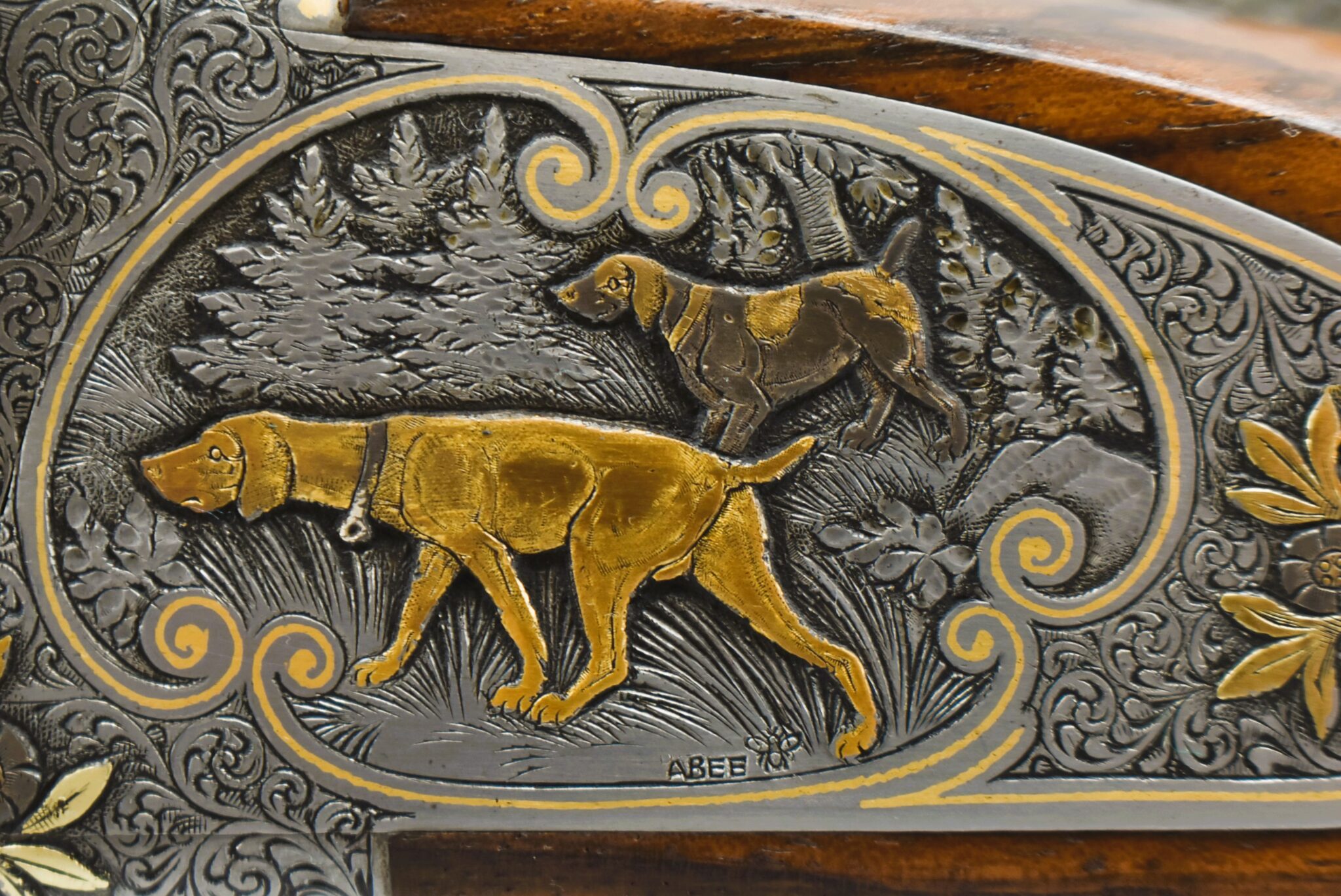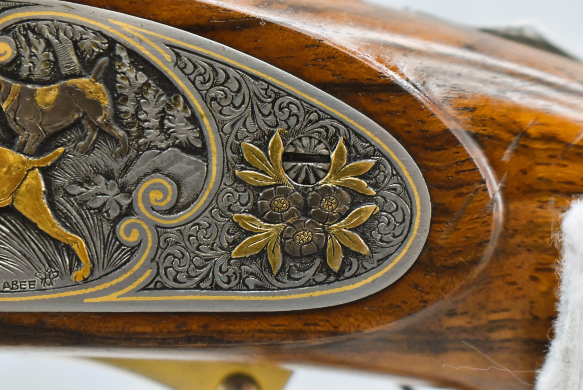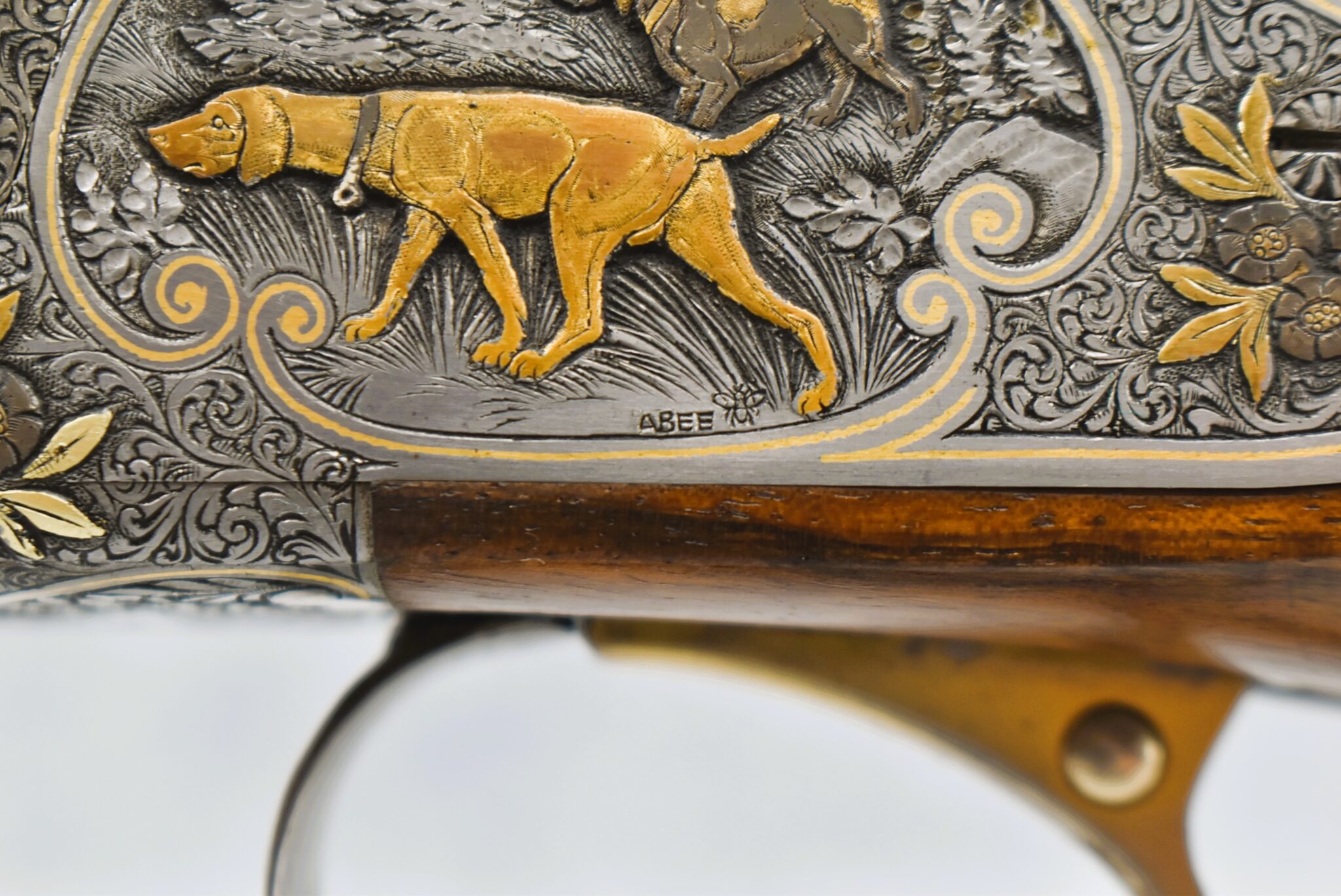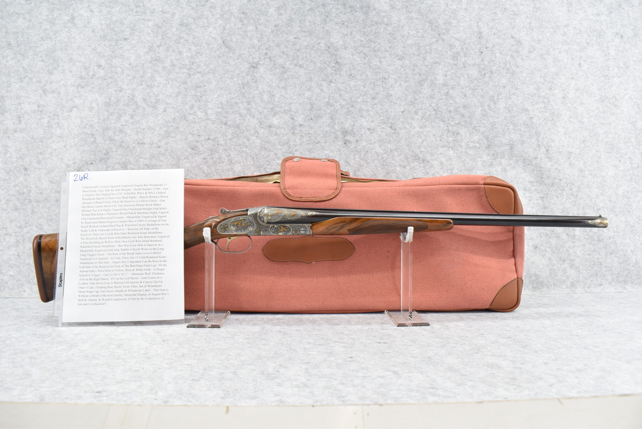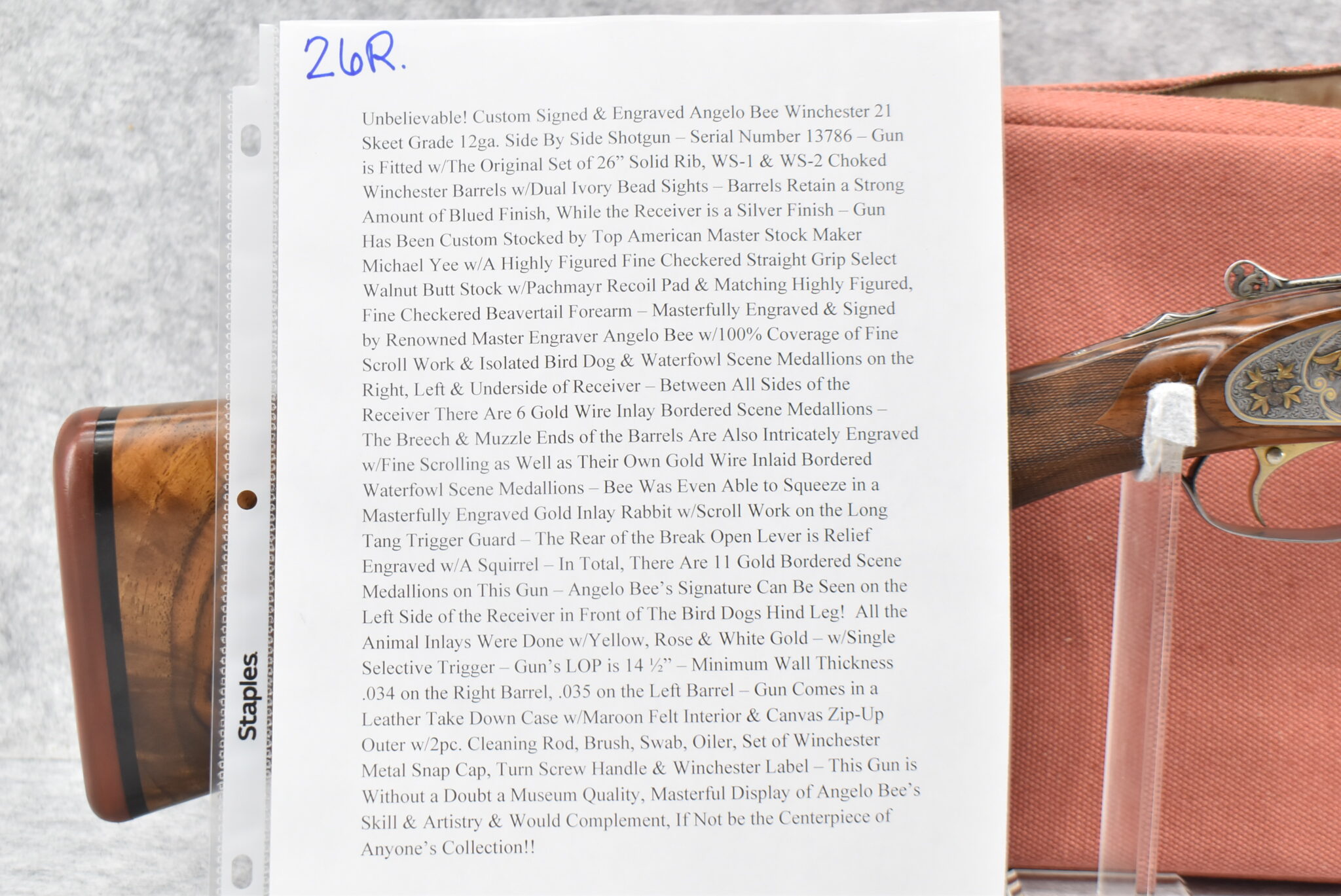 26R. Unbelievable! Custom Signed & Engraved Angelo Bee Winchester 21 Skeet Grade 12ga. Side By Side Shotgun – Serial Number 13786 – Gun is Fitted w/The Original Set of 26” Solid Rib, WS-1 & WS-2 Choked Winchester Barrels w/Dual Ivory Bead Sights – Barrels Retain a Strong Amount of Blued Finish, While the Receiver is a Silver Finish – Gun Has Been Custom Stocked by Top American Master Stock Maker Michael Yee w/A Highly Figured Fine Checkered Straight Grip Select Walnut Butt Stock w/Pachmayr Recoil Pad & Matching Highly Figured, Fine Checkered Beavertail Forearm – Masterfully Engraved & Signed by Renowned Master Engraver Angelo Bee w/100% Coverage of Fine Scroll Work & Isolated Bird Dog & Waterfowl Scene Medallions on the Right, Left & Underside of Receiver – Between All Sides of the Receiver There Are 6 Gold Wire Inlay Bordered Scene Medallions – The Breech & Muzzle Ends of the Barrels Are Also Intricately Engraved w/Fine Scrolling as Well as Their Own Gold Wire Inlaid Bordered Waterfowl Scene Medallions – Bee Was Even Able to Squeeze in a Masterfully Engraved Gold Inlay Rabbit w/Scroll Work on the Long Tang Trigger Guard – The Rear of the Break Open Lever is Relief Engraved w/A Squirrel – In Total, There Are 11 Gold Bordered Scene Medallions on This Gun – Angelo Bee’s Signature Can Be Seen on the Left Side of the Receiver in Front of The Bird Dogs Hind Leg! All the Animal Inlays Were Done w/Yellow, Rose & White Gold – w/Single Selective Trigger – Gun’s LOP is 14 ½” – Minimum Wall Thickness .034 on the Right Barrel, .035 on the Left Barrel – Gun Comes in a Leather Take Down Case w/Maroon Felt Interior & Canvas Zip-Up Outer w/2pc. Cleaning Rod, Brush, Swab, Oiler, Set of Winchester Metal Snap Cap, Turn Screw Handle & Winchester Label – This Gun is Without a Doubt a Museum Quality, Masterful Display of Angelo Bee’s Skill & Artistry & Would Complement, If Not be the Centerpiece of Anyone’s Collection!!