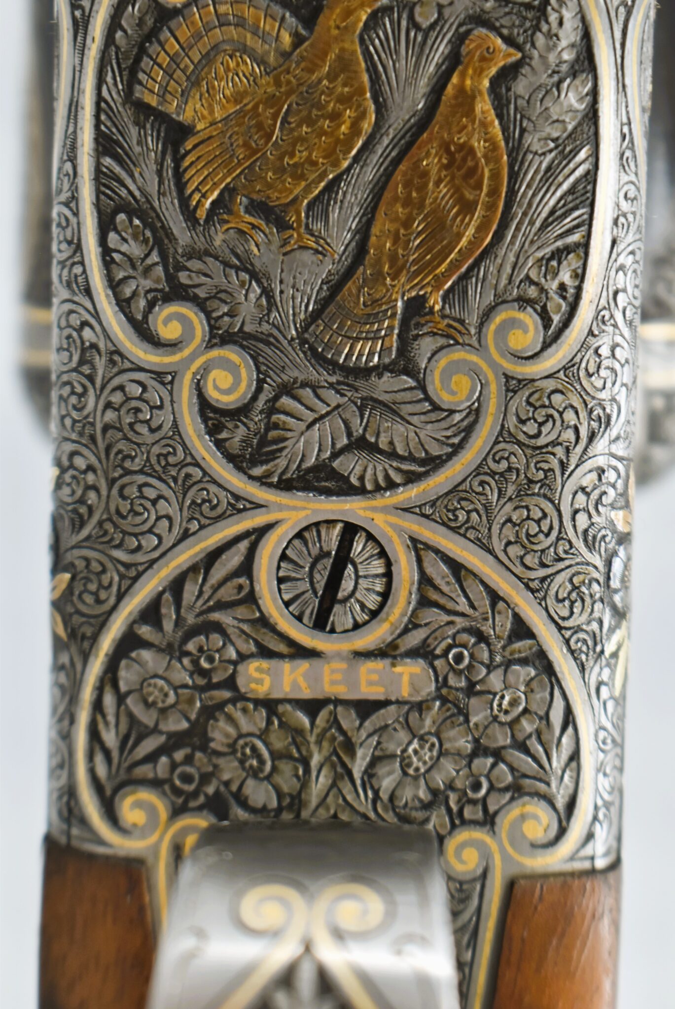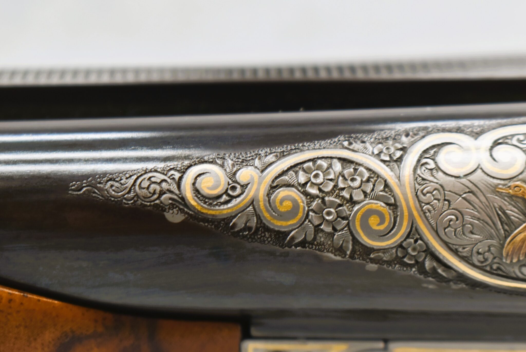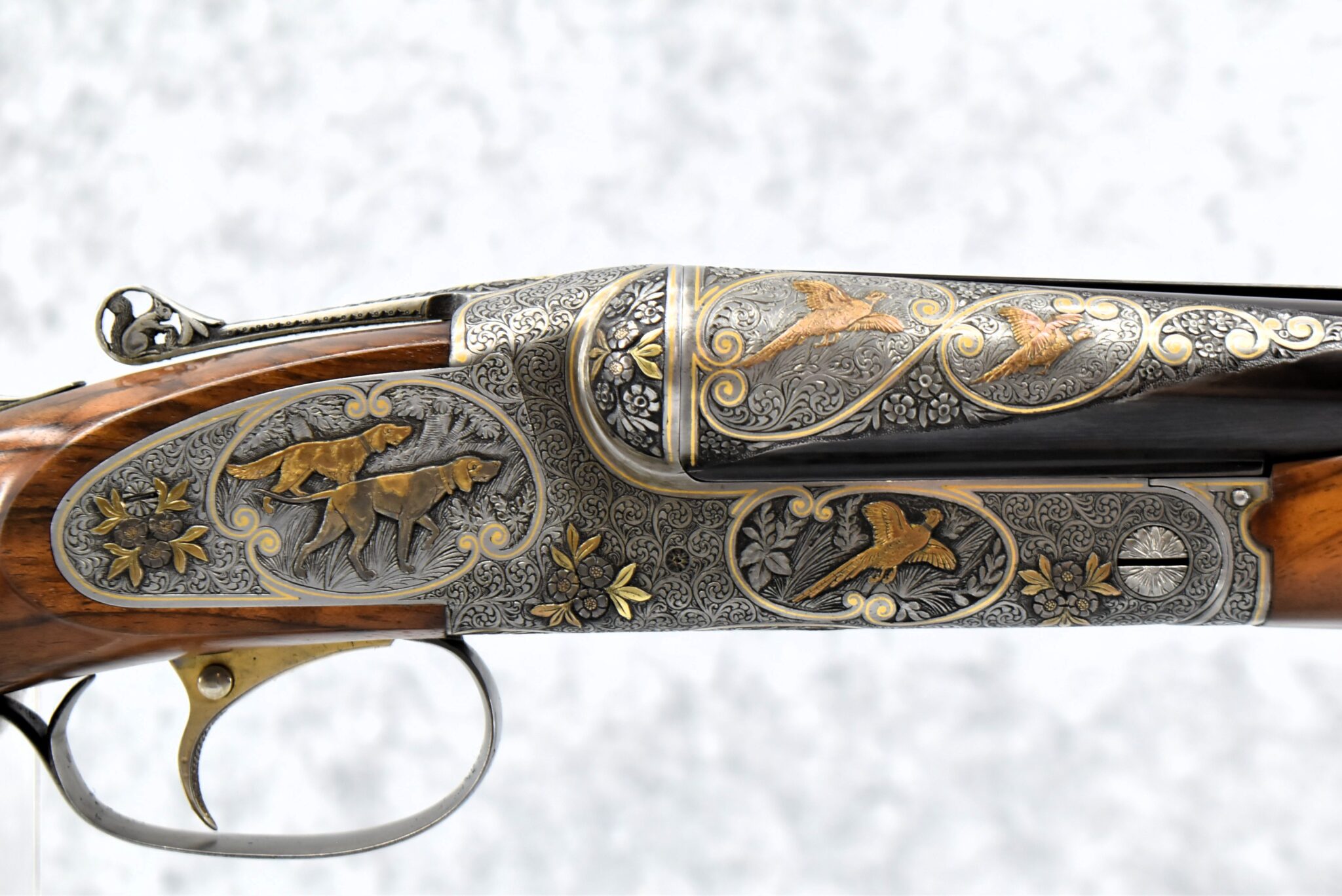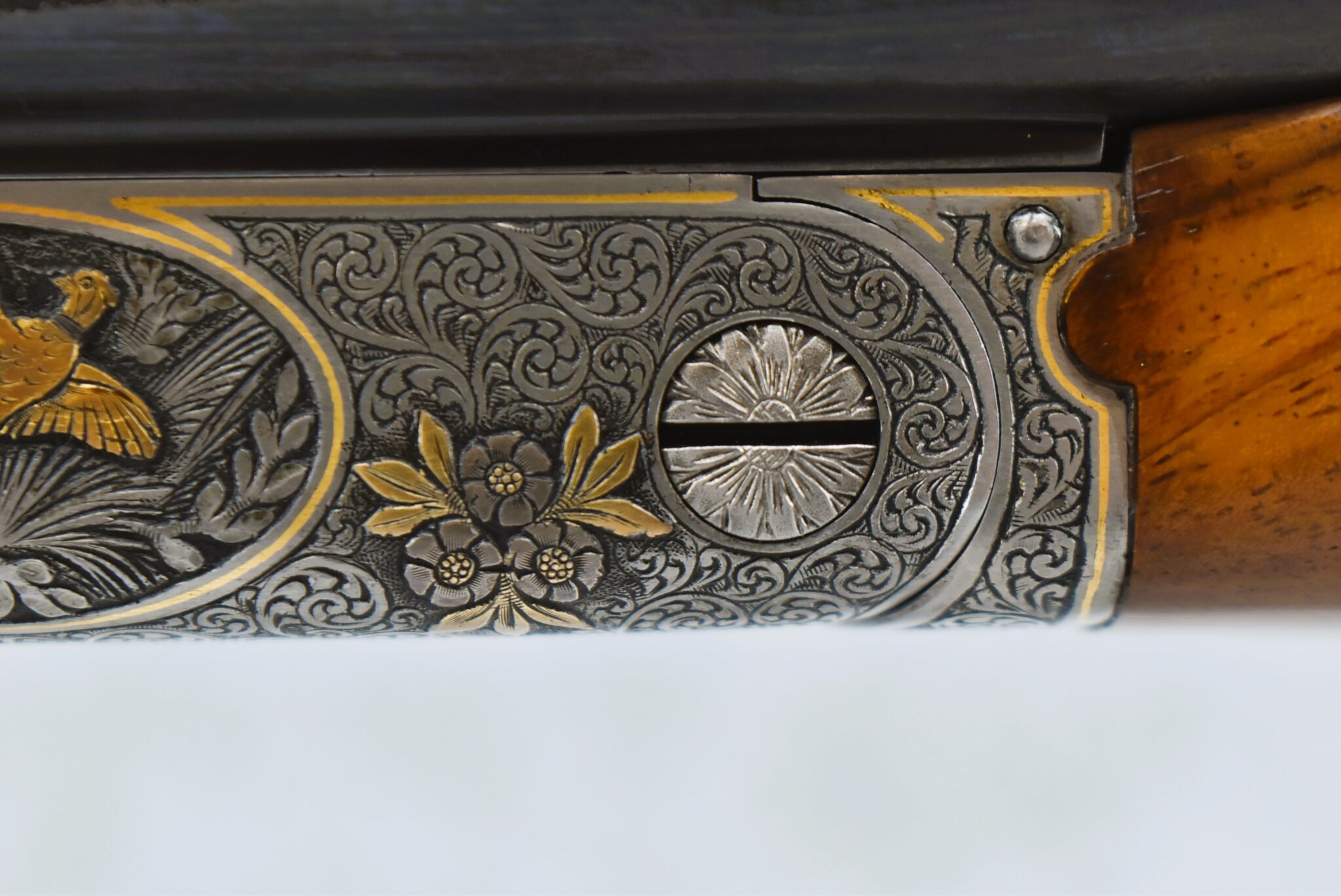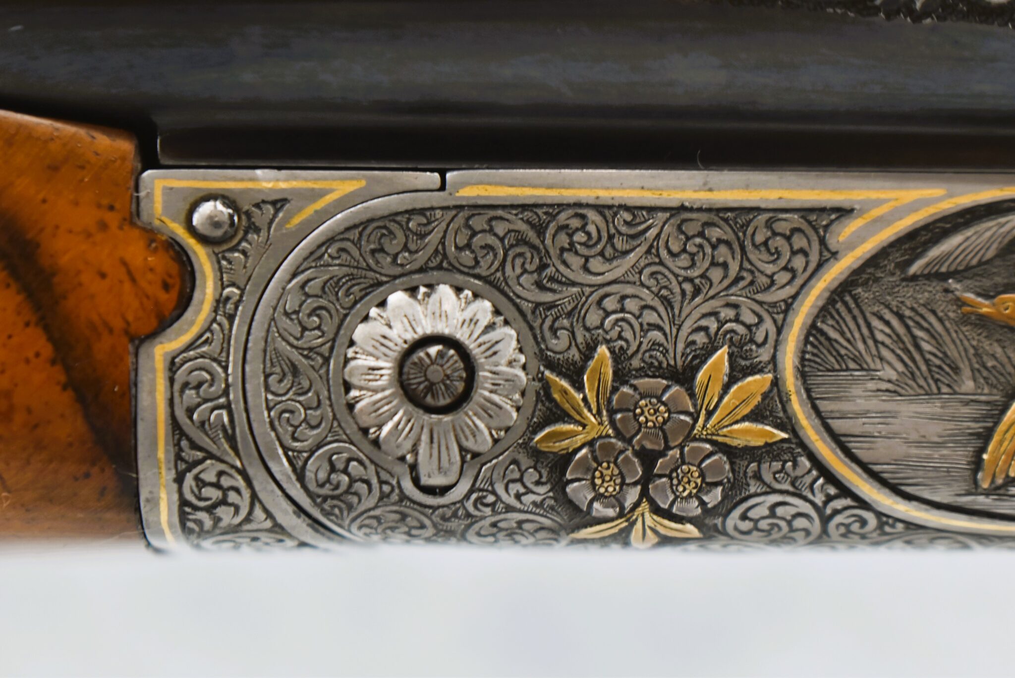 26R. Unbelievable! Custom Signed & Engraved Angelo Bee Winchester 21 Skeet Grade 12ga. Side By Side Shotgun – Serial Number 13786 – Gun is Fitted w/The Original Set of 26” Solid Rib, WS-1 & WS-2 Choked Winchester Barrels w/Dual Ivory Bead Sights – Barrels Retain a Strong Amount of Blued Finish, While the Receiver is a Silver Finish – Gun Has Been Custom Stocked by Top American Master Stock Maker Michael Yee w/A Highly Figured Fine Checkered Straight Grip Select Walnut Butt Stock w/Pachmayr Recoil Pad & Matching Highly Figured, Fine Checkered Beavertail Forearm – Masterfully Engraved & Signed by Renowned Master Engraver Angelo Bee w/100% Coverage of Fine Scroll Work & Isolated Bird Dog & Waterfowl Scene Medallions on the Right, Left & Underside of Receiver – Between All Sides of the Receiver There Are 6 Gold Wire Inlay Bordered Scene Medallions – The Breech & Muzzle Ends of the Barrels Are Also Intricately Engraved w/Fine Scrolling as Well as Their Own Gold Wire Inlaid Bordered Waterfowl Scene Medallions – Bee Was Even Able to Squeeze in a Masterfully Engraved Gold Inlay Rabbit w/Scroll Work on the Long Tang Trigger Guard – The Rear of the Break Open Lever is Relief Engraved w/A Squirrel – In Total, There Are 11 Gold Bordered Scene Medallions on This Gun – Angelo Bee’s Signature Can Be Seen on the Left Side of the Receiver in Front of The Bird Dogs Hind Leg! All the Animal Inlays Were Done w/Yellow, Rose & White Gold – w/Single Selective Trigger – Gun’s LOP is 14 ½” – Minimum Wall Thickness .034 on the Right Barrel, .035 on the Left Barrel – Gun Comes in a Leather Take Down Case w/Maroon Felt Interior & Canvas Zip-Up Outer w/2pc. Cleaning Rod, Brush, Swab, Oiler, Set of Winchester Metal Snap Cap, Turn Screw Handle & Winchester Label – This Gun is Without a Doubt a Museum Quality, Masterful Display of Angelo Bee’s Skill & Artistry & Would Complement, If Not be the Centerpiece of Anyone’s Collection!!