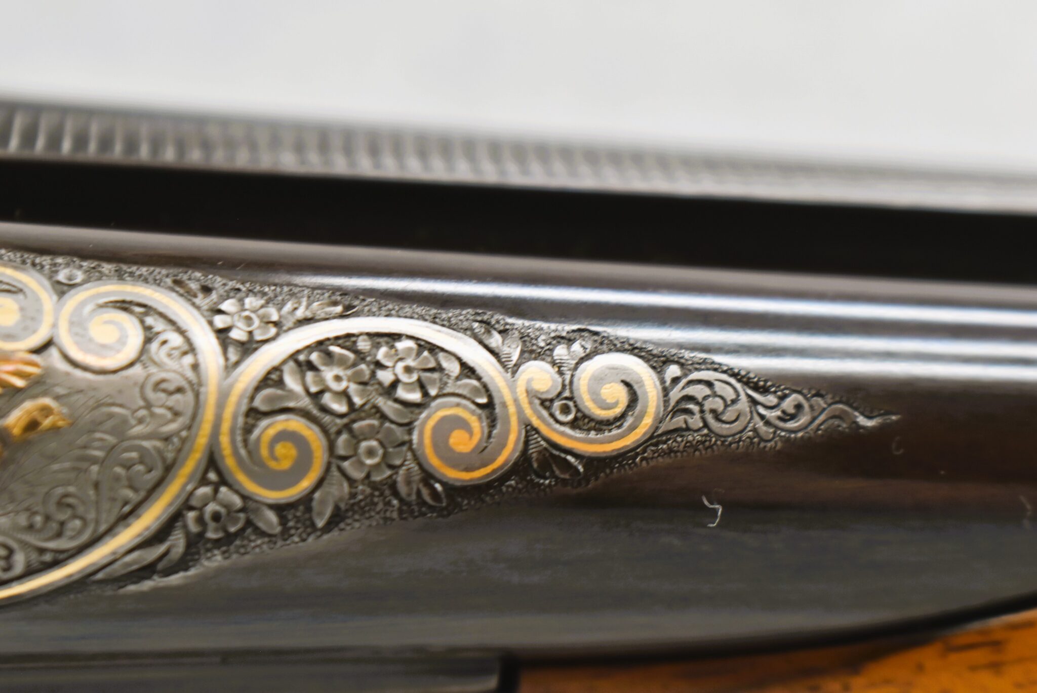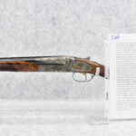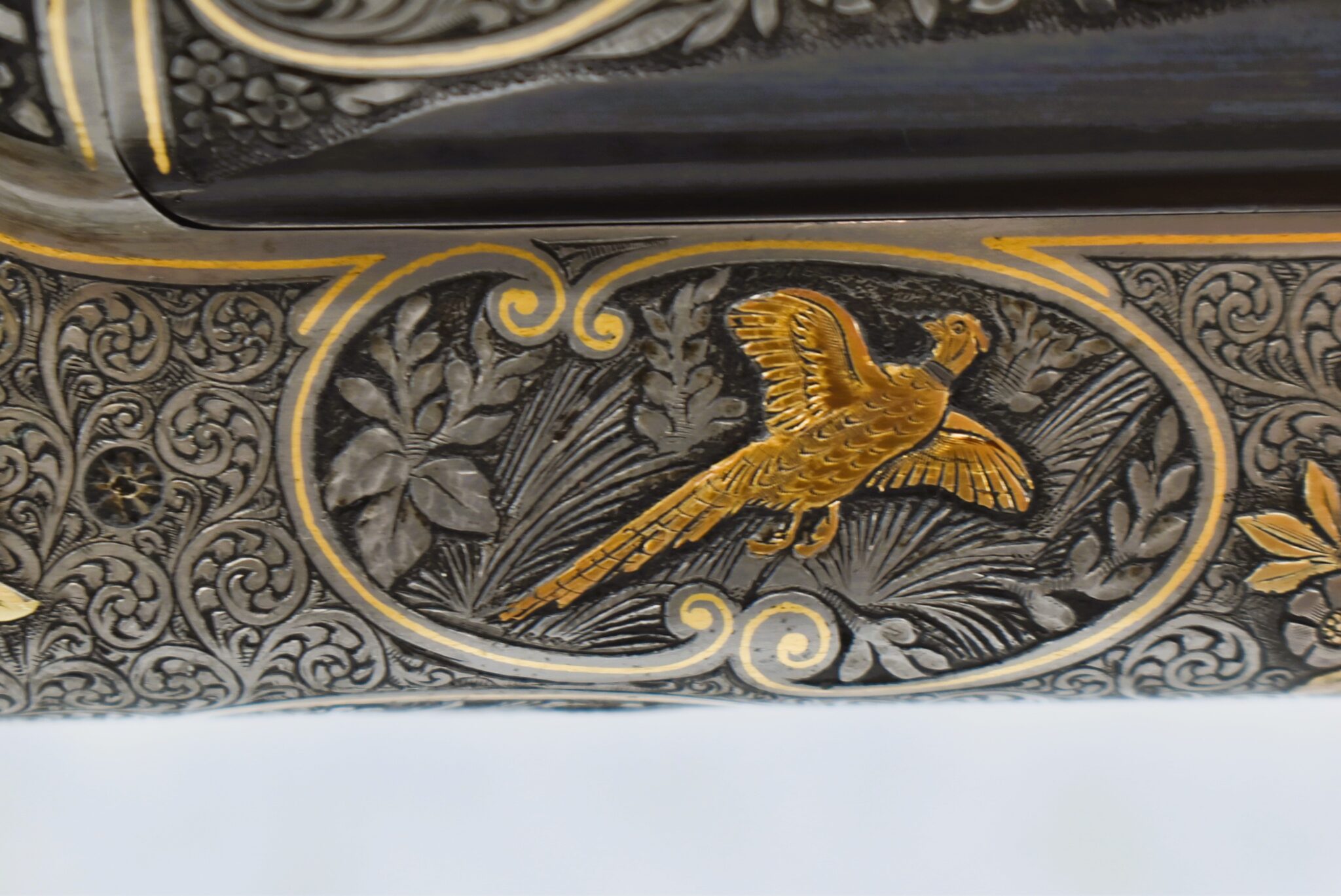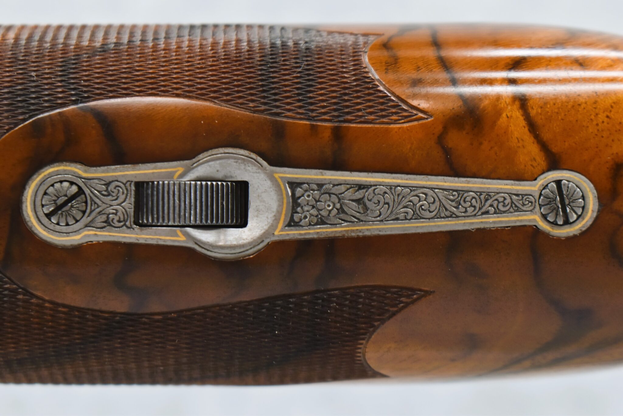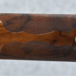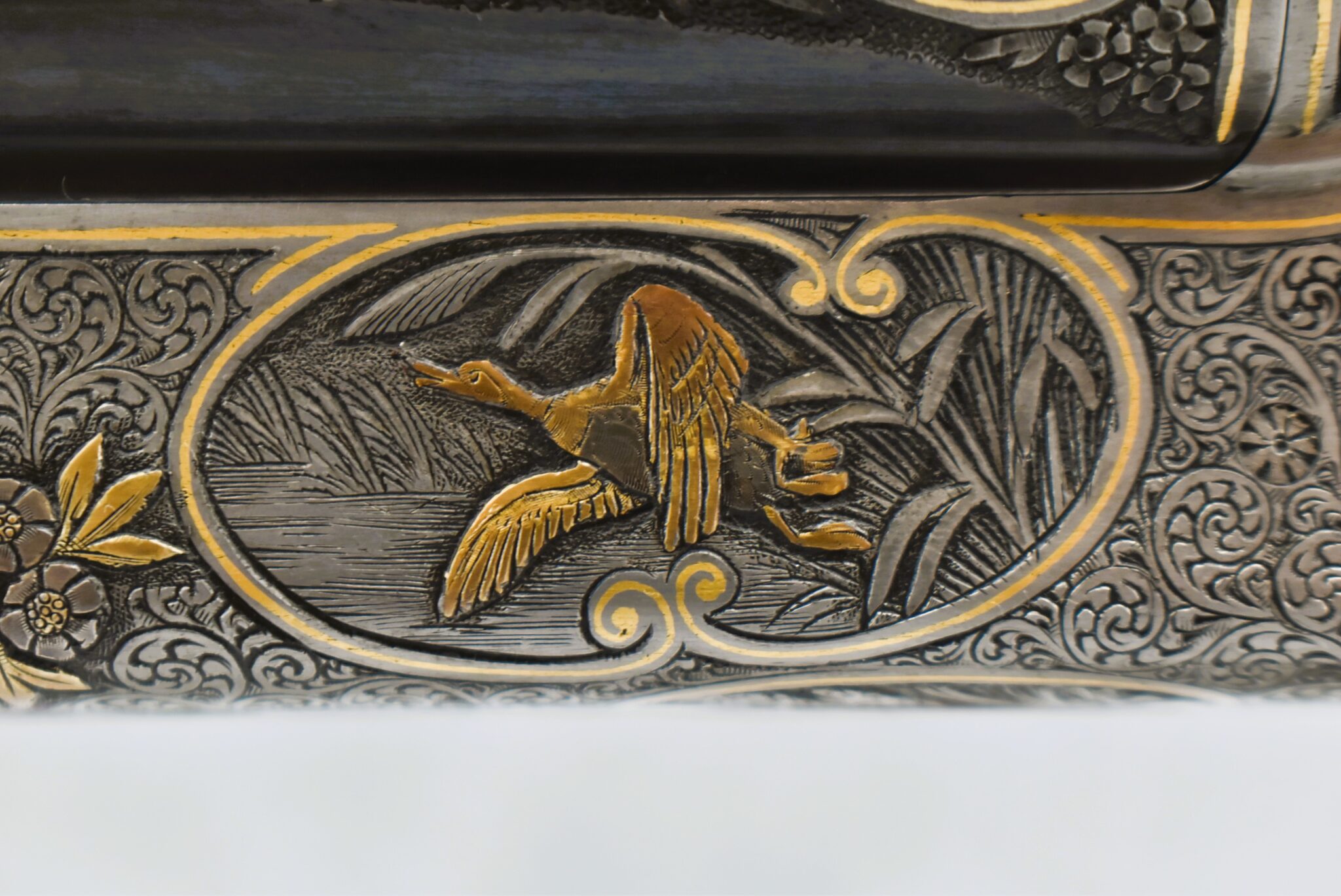 26R. Unbelievable! Custom Signed & Engraved Angelo Bee Winchester 21 Skeet Grade 12ga. Side By Side Shotgun – Serial Number 13786 – Gun is Fitted w/The Original Set of 26” Solid Rib, WS-1 & WS-2 Choked Winchester Barrels w/Dual Ivory Bead Sights – Barrels Retain a Strong Amount of Blued Finish, While the Receiver is a Silver Finish – Gun Has Been Custom Stocked by Top American Master Stock Maker Michael Yee w/A Highly Figured Fine Checkered Straight Grip Select Walnut Butt Stock w/Pachmayr Recoil Pad & Matching Highly Figured, Fine Checkered Beavertail Forearm – Masterfully Engraved & Signed by Renowned Master Engraver Angelo Bee w/100% Coverage of Fine Scroll Work & Isolated Bird Dog & Waterfowl Scene Medallions on the Right, Left & Underside of Receiver – Between All Sides of the Receiver There Are 6 Gold Wire Inlay Bordered Scene Medallions – The Breech & Muzzle Ends of the Barrels Are Also Intricately Engraved w/Fine Scrolling as Well as Their Own Gold Wire Inlaid Bordered Waterfowl Scene Medallions – Bee Was Even Able to Squeeze in a Masterfully Engraved Gold Inlay Rabbit w/Scroll Work on the Long Tang Trigger Guard – The Rear of the Break Open Lever is Relief Engraved w/A Squirrel – In Total, There Are 11 Gold Bordered Scene Medallions on This Gun – Angelo Bee’s Signature Can Be Seen on the Left Side of the Receiver in Front of The Bird Dogs Hind Leg! All the Animal Inlays Were Done w/Yellow, Rose & White Gold – w/Single Selective Trigger – Gun’s LOP is 14 ½” – Minimum Wall Thickness .034 on the Right Barrel, .035 on the Left Barrel – Gun Comes in a Leather Take Down Case w/Maroon Felt Interior & Canvas Zip-Up Outer w/2pc. Cleaning Rod, Brush, Swab, Oiler, Set of Winchester Metal Snap Cap, Turn Screw Handle & Winchester Label – This Gun is Without a Doubt a Museum Quality, Masterful Display of Angelo Bee’s Skill & Artistry & Would Complement, If Not be the Centerpiece of Anyone’s Collection!!