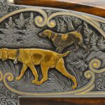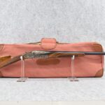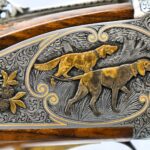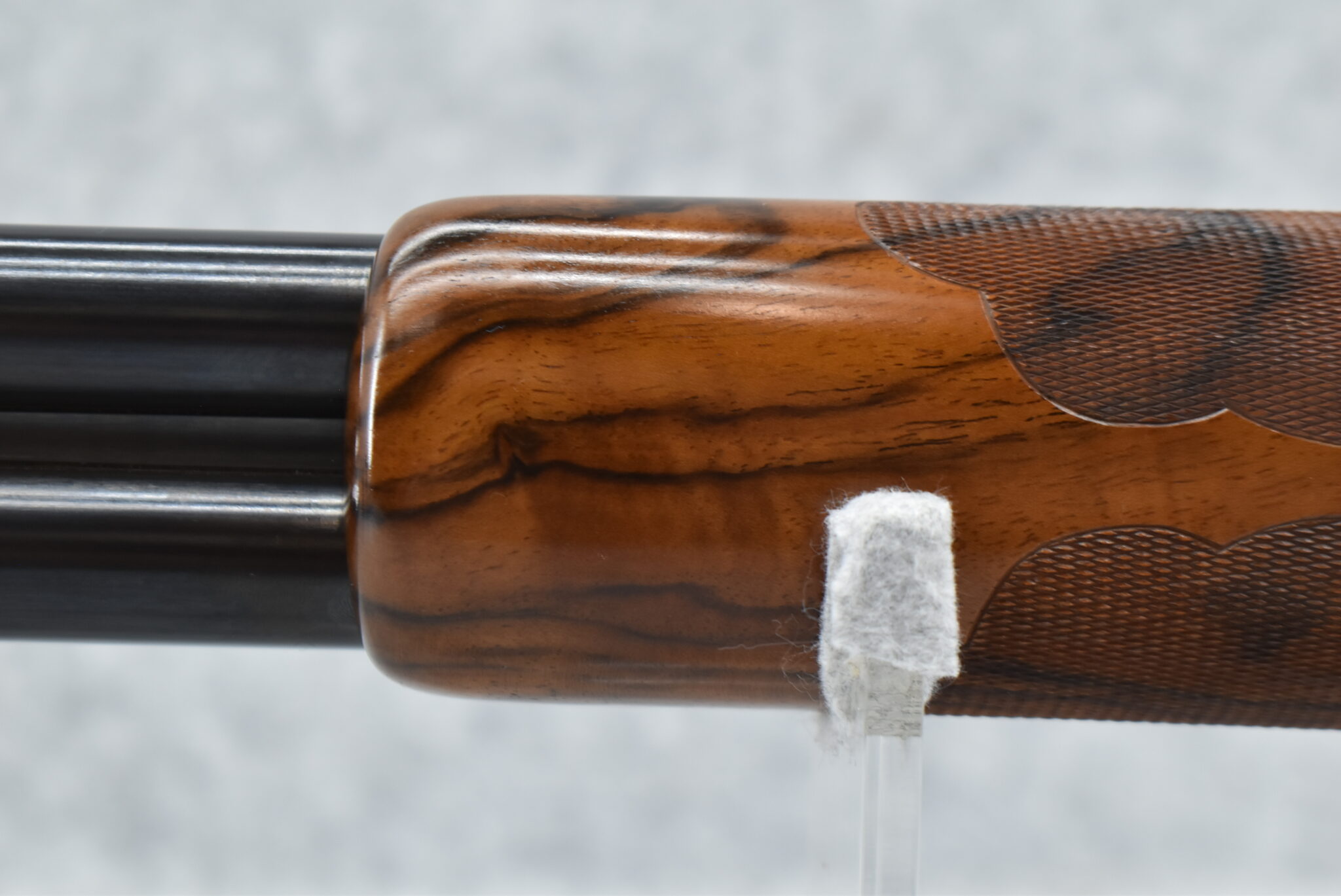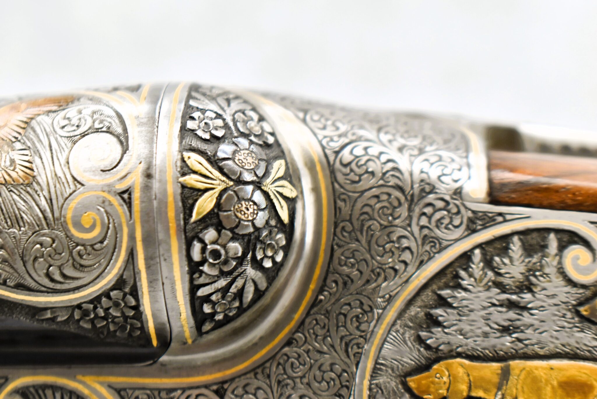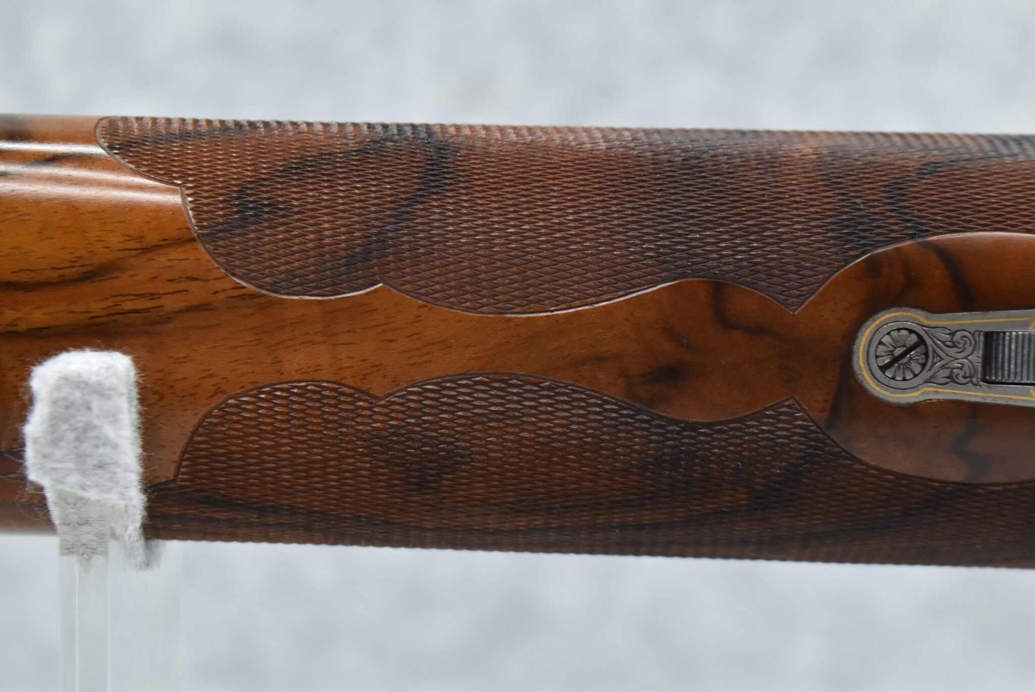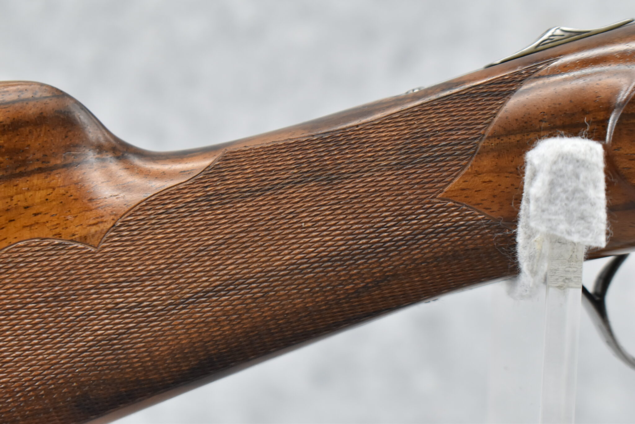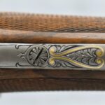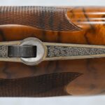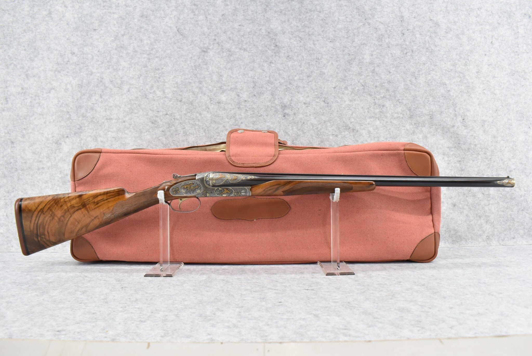 26R. Unbelievable! Custom Signed & Engraved Angelo Bee Winchester 21 Skeet Grade 12ga. Side By Side Shotgun – Serial Number 13786 – Gun is Fitted w/The Original Set of 26” Solid Rib, WS-1 & WS-2 Choked Winchester Barrels w/Dual Ivory Bead Sights – Barrels Retain a Strong Amount of Blued Finish, While the Receiver is a Silver Finish – Gun Has Been Custom Stocked by Top American Master Stock Maker Michael Yee w/A Highly Figured Fine Checkered Straight Grip Select Walnut Butt Stock w/Pachmayr Recoil Pad & Matching Highly Figured, Fine Checkered Beavertail Forearm – Masterfully Engraved & Signed by Renowned Master Engraver Angelo Bee w/100% Coverage of Fine Scroll Work & Isolated Bird Dog & Waterfowl Scene Medallions on the Right, Left & Underside of Receiver – Between All Sides of the Receiver There Are 6 Gold Wire Inlay Bordered Scene Medallions – The Breech & Muzzle Ends of the Barrels Are Also Intricately Engraved w/Fine Scrolling as Well as Their Own Gold Wire Inlaid Bordered Waterfowl Scene Medallions – Bee Was Even Able to Squeeze in a Masterfully Engraved Gold Inlay Rabbit w/Scroll Work on the Long Tang Trigger Guard – The Rear of the Break Open Lever is Relief Engraved w/A Squirrel – In Total, There Are 11 Gold Bordered Scene Medallions on This Gun – Angelo Bee’s Signature Can Be Seen on the Left Side of the Receiver in Front of The Bird Dogs Hind Leg! All the Animal Inlays Were Done w/Yellow, Rose & White Gold – w/Single Selective Trigger – Gun’s LOP is 14 ½” – Minimum Wall Thickness .034 on the Right Barrel, .035 on the Left Barrel – Gun Comes in a Leather Take Down Case w/Maroon Felt Interior & Canvas Zip-Up Outer w/2pc. Cleaning Rod, Brush, Swab, Oiler, Set of Winchester Metal Snap Cap, Turn Screw Handle & Winchester Label – This Gun is Without a Doubt a Museum Quality, Masterful Display of Angelo Bee’s Skill & Artistry & Would Complement, If Not be the Centerpiece of Anyone’s Collection!!