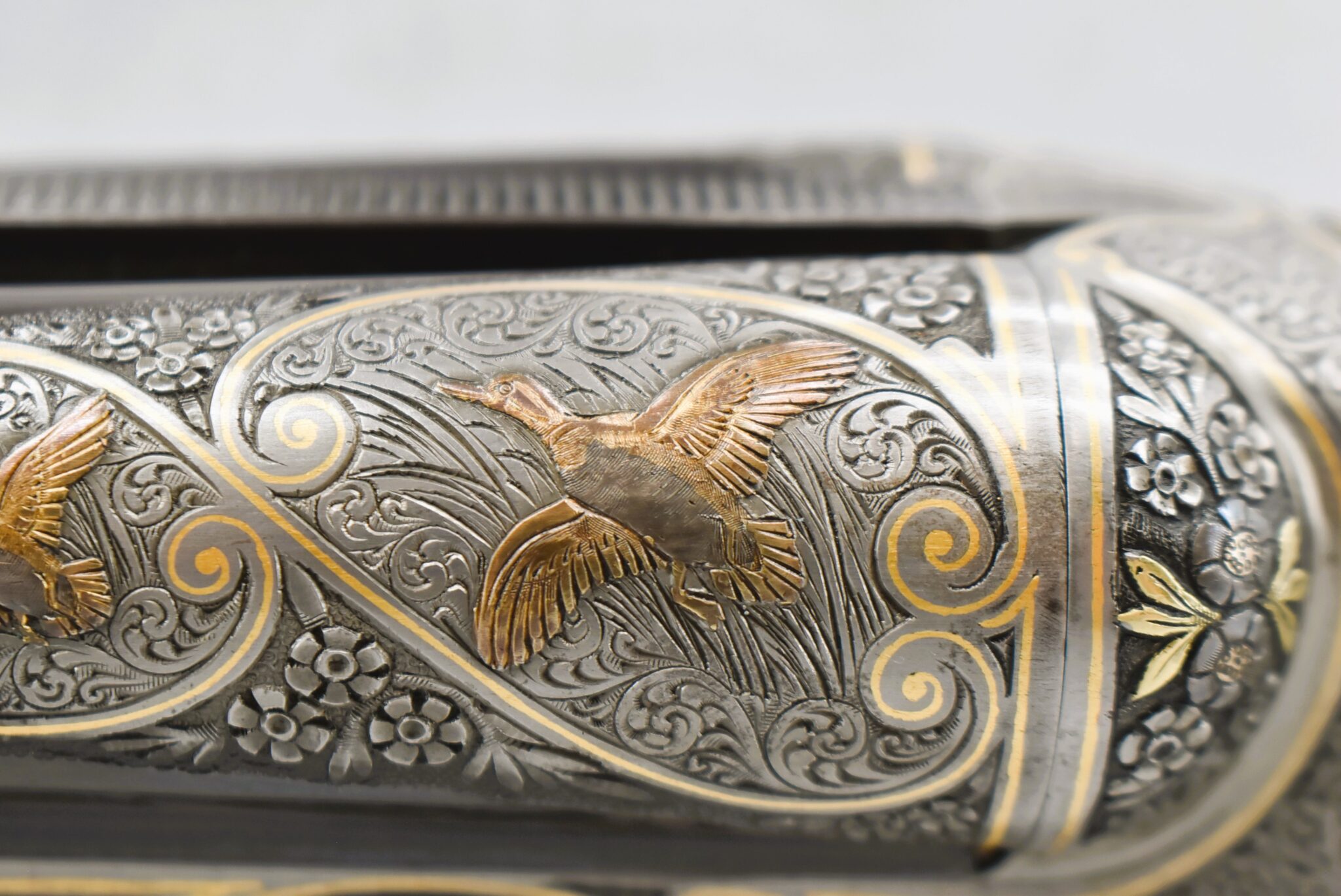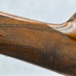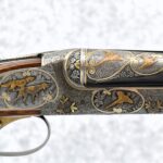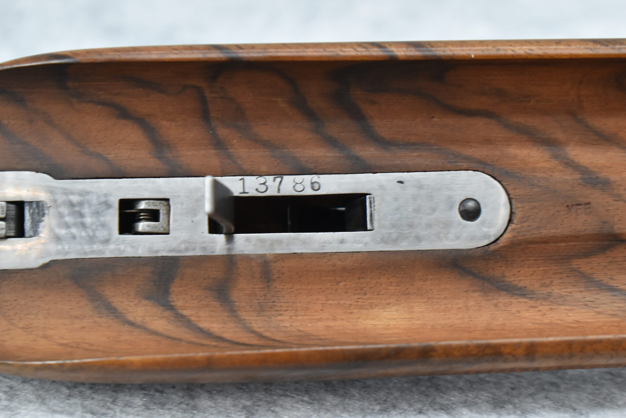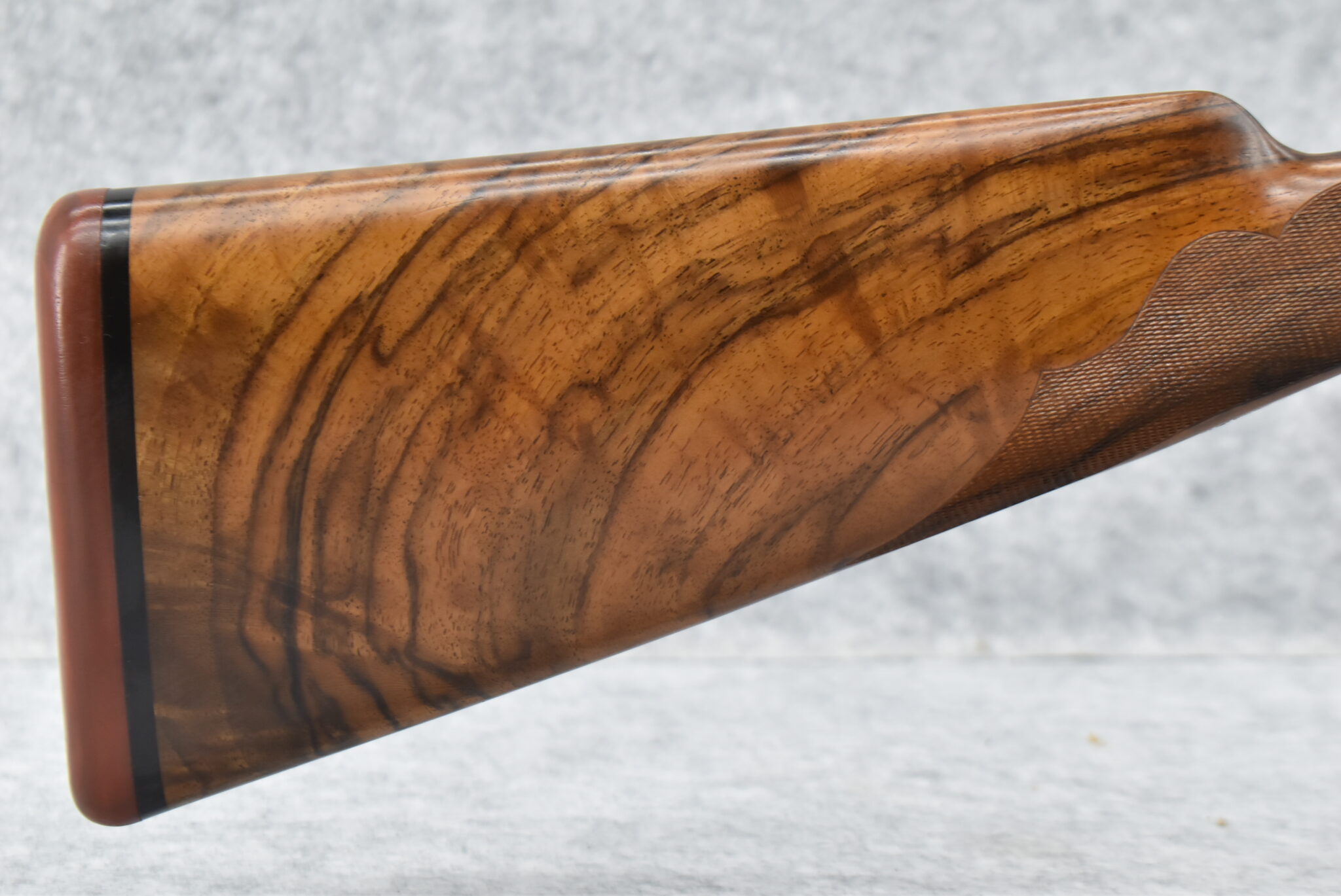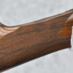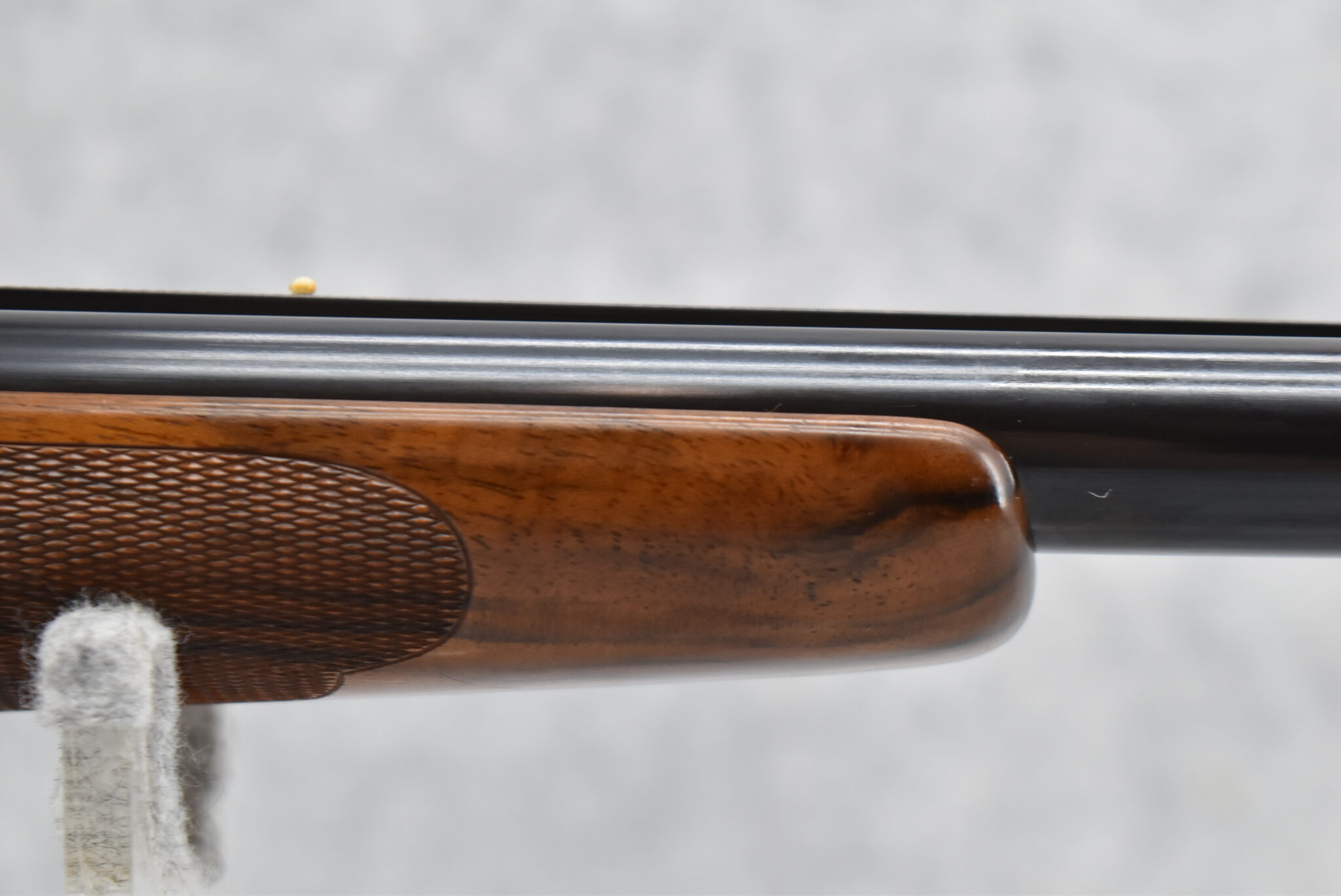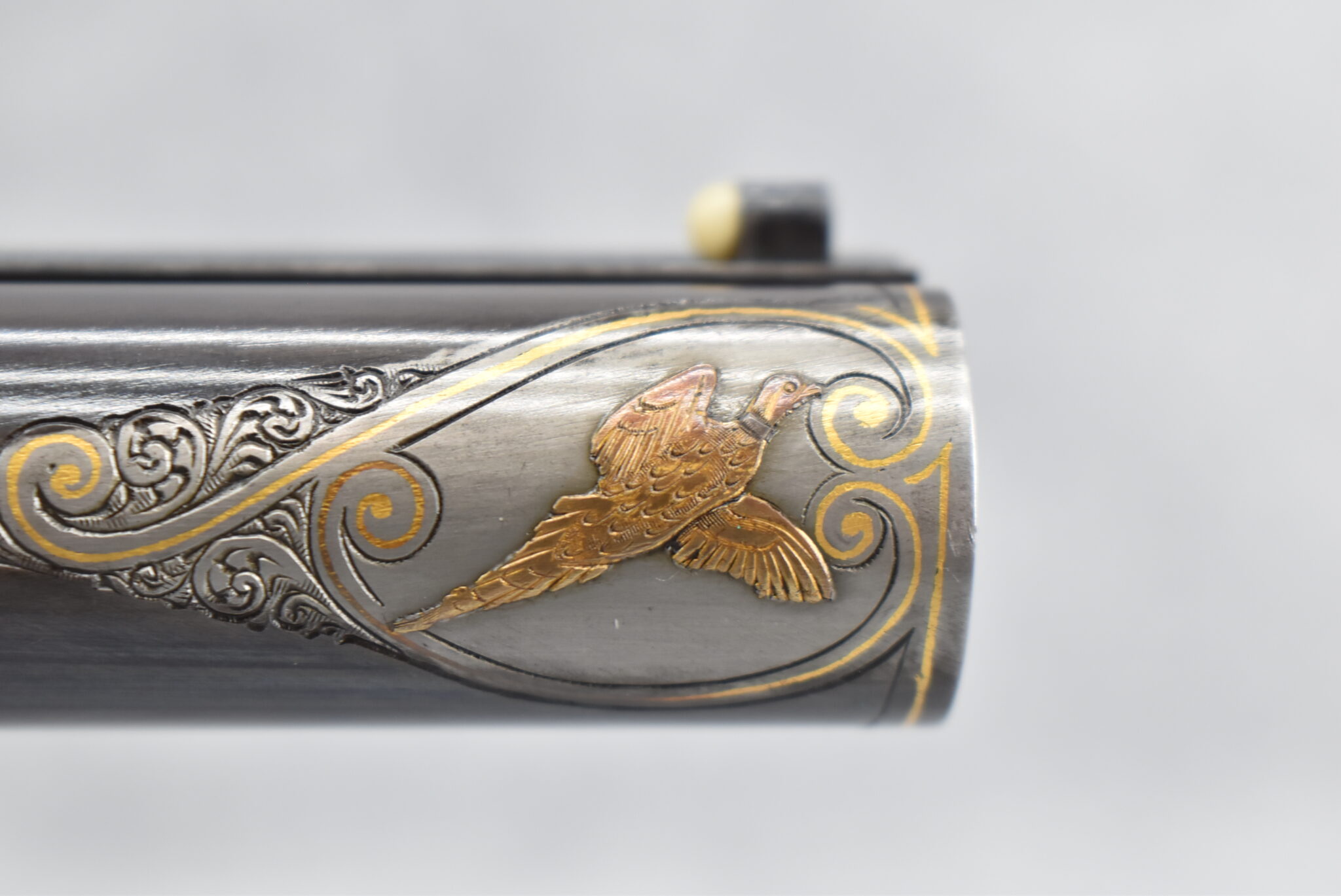26R. Unbelievable! Custom Signed & Engraved Angelo Bee Winchester 21 Skeet Grade 12ga. Side By Side Shotgun – Serial Number 13786 – Gun is Fitted w/The Original Set of 26” Solid Rib, WS-1 & WS-2 Choked Winchester Barrels w/Dual Ivory Bead Sights – Barrels Retain a Strong Amount of Blued Finish, While the Receiver is a Silver Finish – Gun Has Been Custom Stocked by Top American Master Stock Maker Michael Yee w/A Highly Figured Fine Checkered Straight Grip Select Walnut Butt Stock w/Pachmayr Recoil Pad & Matching Highly Figured, Fine Checkered Beavertail Forearm – Masterfully Engraved & Signed by Renowned Master Engraver Angelo Bee w/100% Coverage of Fine Scroll Work & Isolated Bird Dog & Waterfowl Scene Medallions on the Right, Left & Underside of Receiver – Between All Sides of the Receiver There Are 6 Gold Wire Inlay Bordered Scene Medallions – The Breech & Muzzle Ends of the Barrels Are Also Intricately Engraved w/Fine Scrolling as Well as Their Own Gold Wire Inlaid Bordered Waterfowl Scene Medallions – Bee Was Even Able to Squeeze in a Masterfully Engraved Gold Inlay Rabbit w/Scroll Work on the Long Tang Trigger Guard – The Rear of the Break Open Lever is Relief Engraved w/A Squirrel – In Total, There Are 11 Gold Bordered Scene Medallions on This Gun – Angelo Bee’s Signature Can Be Seen on the Left Side of the Receiver in Front of The Bird Dogs Hind Leg! All the Animal Inlays Were Done w/Yellow, Rose & White Gold – w/Single Selective Trigger – Gun’s LOP is 14 ½” – Minimum Wall Thickness .034 on the Right Barrel, .035 on the Left Barrel – Gun Comes in a Leather Take Down Case w/Maroon Felt Interior & Canvas Zip-Up Outer w/2pc. Cleaning Rod, Brush, Swab, Oiler, Set of Winchester Metal Snap Cap, Turn Screw Handle & Winchester Label – This Gun is Without a Doubt a Museum Quality, Masterful Display of Angelo Bee’s Skill & Artistry & Would Complement, If Not be the Centerpiece of Anyone’s Collection!!