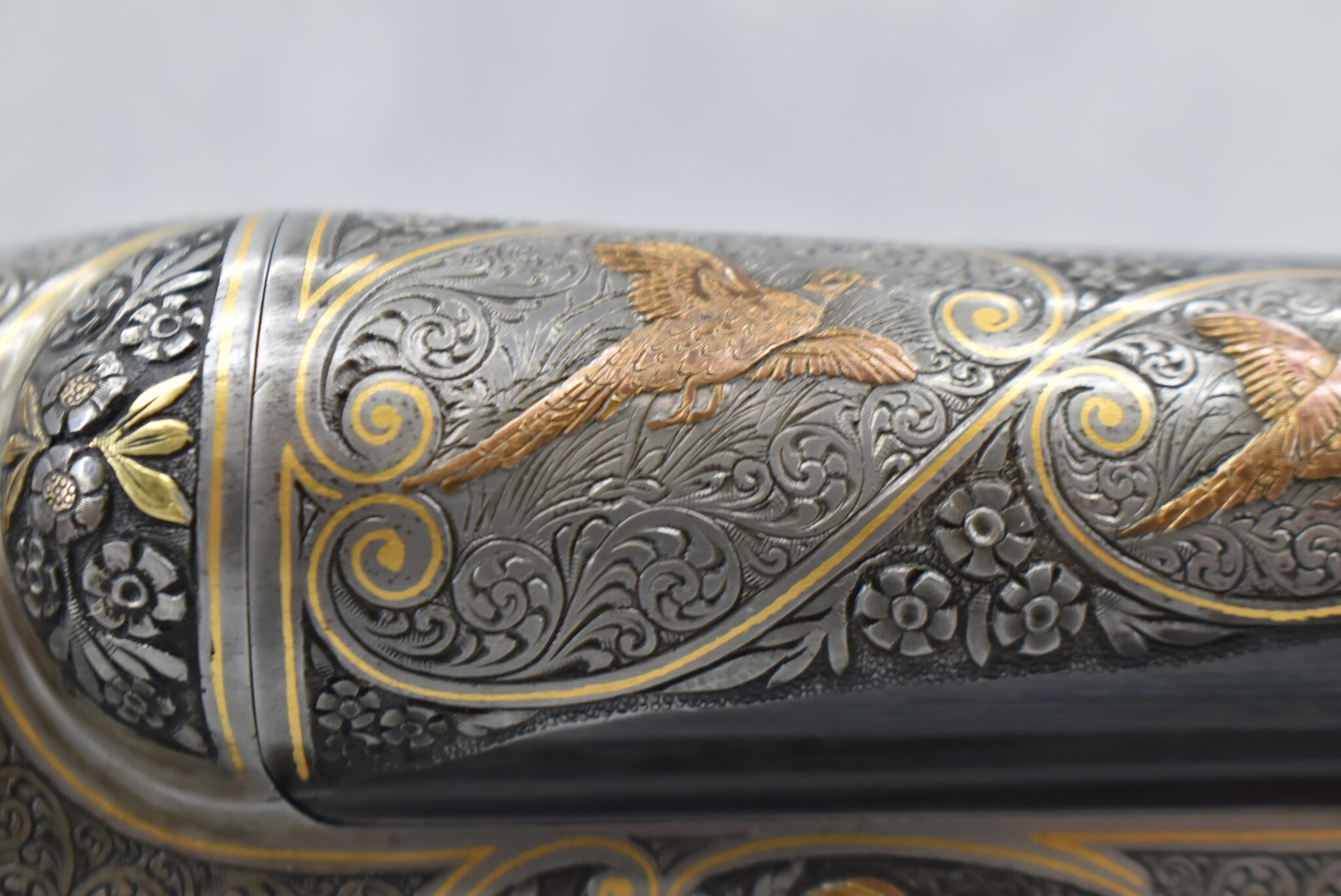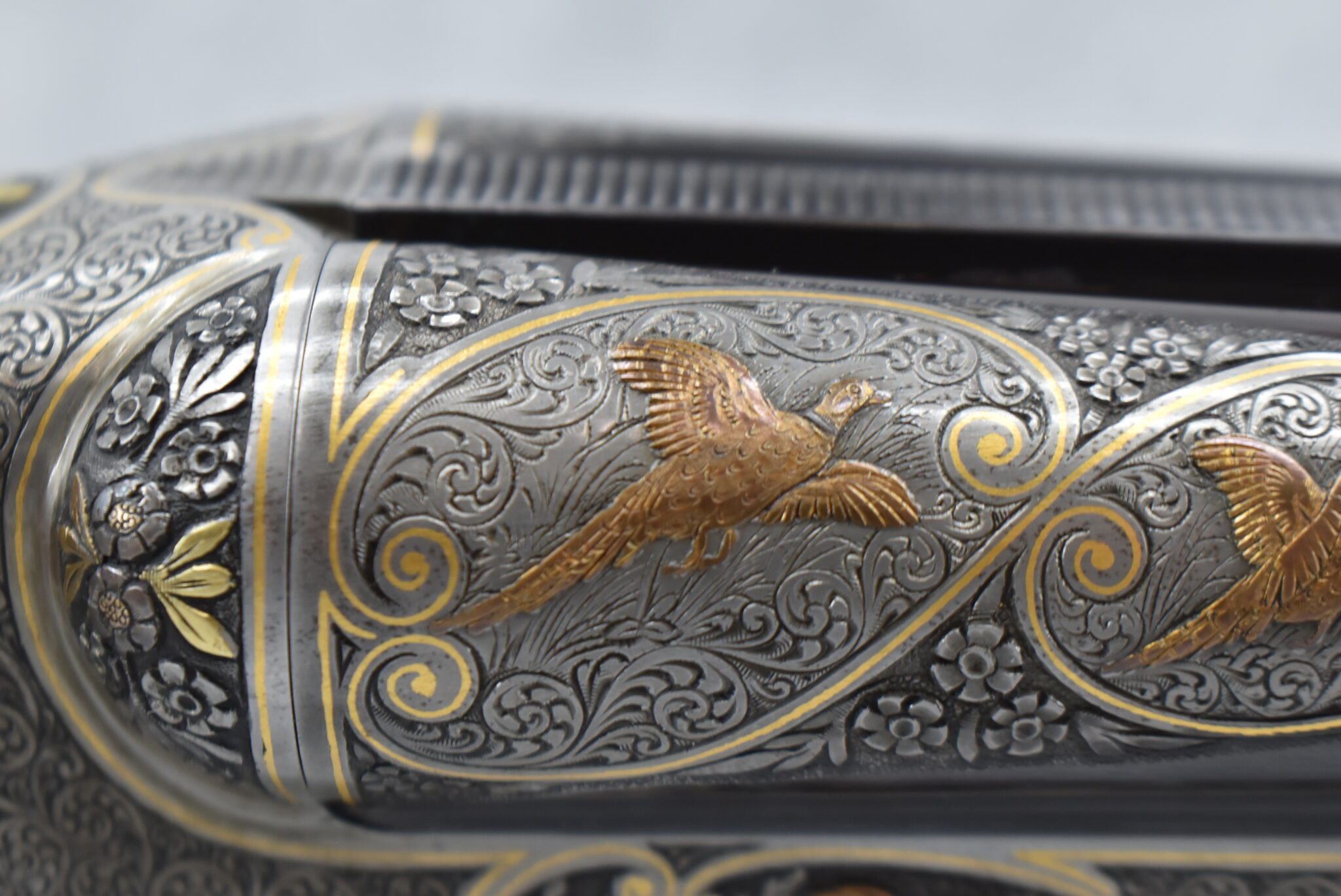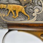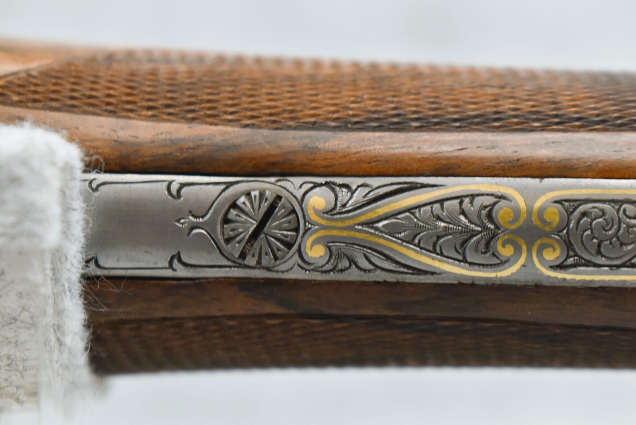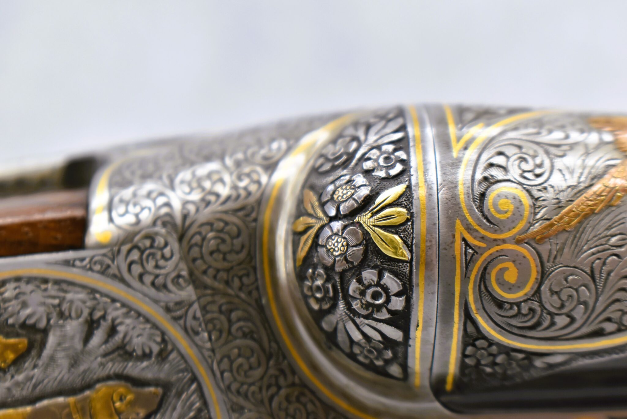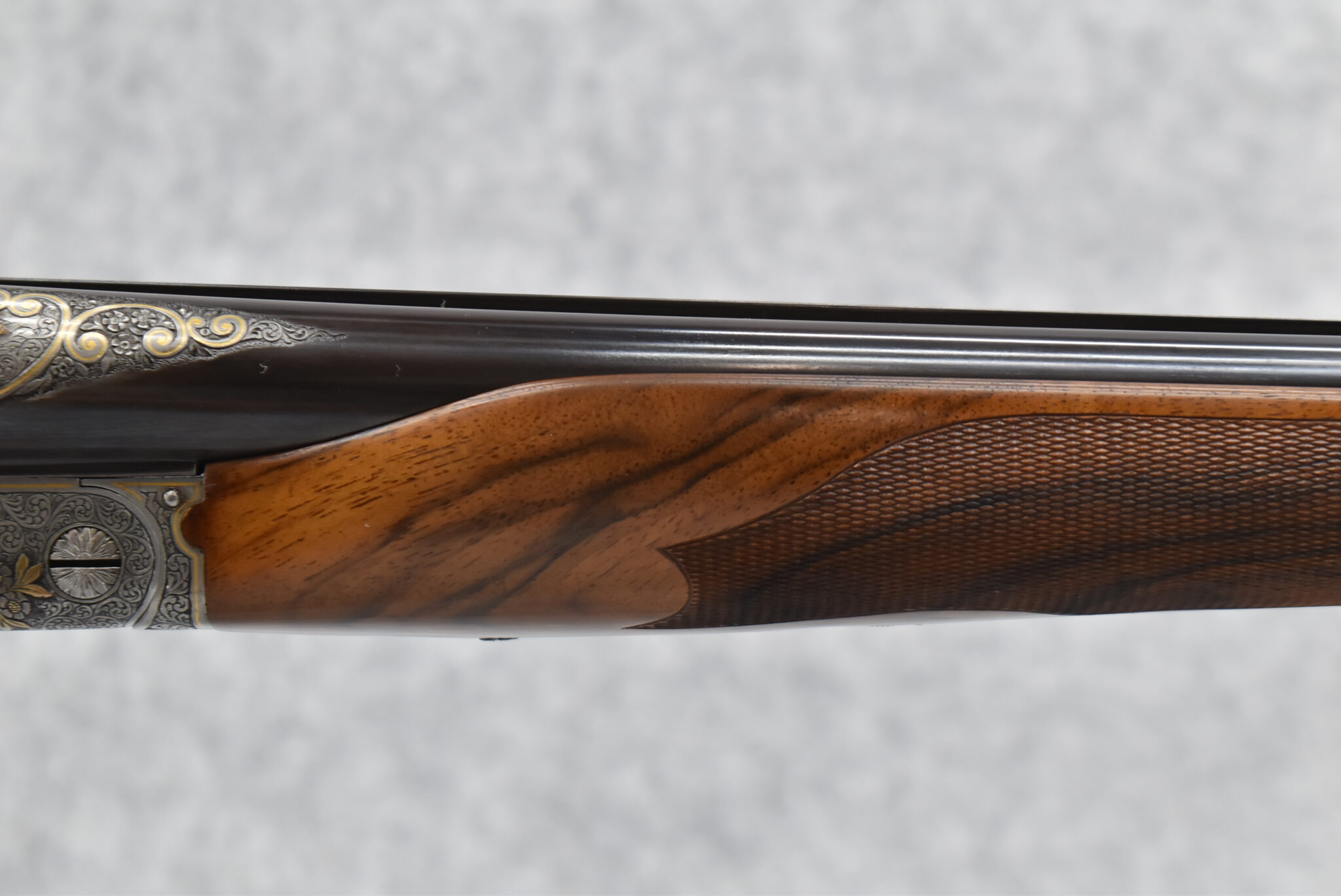 26R. Unbelievable! Custom Signed & Engraved Angelo Bee Winchester 21 Skeet Grade 12ga. Side By Side Shotgun – Serial Number 13786 – Gun is Fitted w/The Original Set of 26” Solid Rib, WS-1 & WS-2 Choked Winchester Barrels w/Dual Ivory Bead Sights – Barrels Retain a Strong Amount of Blued Finish, While the Receiver is a Silver Finish – Gun Has Been Custom Stocked by Top American Master Stock Maker Michael Yee w/A Highly Figured Fine Checkered Straight Grip Select Walnut Butt Stock w/Pachmayr Recoil Pad & Matching Highly Figured, Fine Checkered Beavertail Forearm – Masterfully Engraved & Signed by Renowned Master Engraver Angelo Bee w/100% Coverage of Fine Scroll Work & Isolated Bird Dog & Waterfowl Scene Medallions on the Right, Left & Underside of Receiver – Between All Sides of the Receiver There Are 6 Gold Wire Inlay Bordered Scene Medallions – The Breech & Muzzle Ends of the Barrels Are Also Intricately Engraved w/Fine Scrolling as Well as Their Own Gold Wire Inlaid Bordered Waterfowl Scene Medallions – Bee Was Even Able to Squeeze in a Masterfully Engraved Gold Inlay Rabbit w/Scroll Work on the Long Tang Trigger Guard – The Rear of the Break Open Lever is Relief Engraved w/A Squirrel – In Total, There Are 11 Gold Bordered Scene Medallions on This Gun – Angelo Bee’s Signature Can Be Seen on the Left Side of the Receiver in Front of The Bird Dogs Hind Leg! All the Animal Inlays Were Done w/Yellow, Rose & White Gold – w/Single Selective Trigger – Gun’s LOP is 14 ½” – Minimum Wall Thickness .034 on the Right Barrel, .035 on the Left Barrel – Gun Comes in a Leather Take Down Case w/Maroon Felt Interior & Canvas Zip-Up Outer w/2pc. Cleaning Rod, Brush, Swab, Oiler, Set of Winchester Metal Snap Cap, Turn Screw Handle & Winchester Label – This Gun is Without a Doubt a Museum Quality, Masterful Display of Angelo Bee’s Skill & Artistry & Would Complement, If Not be the Centerpiece of Anyone’s Collection!!