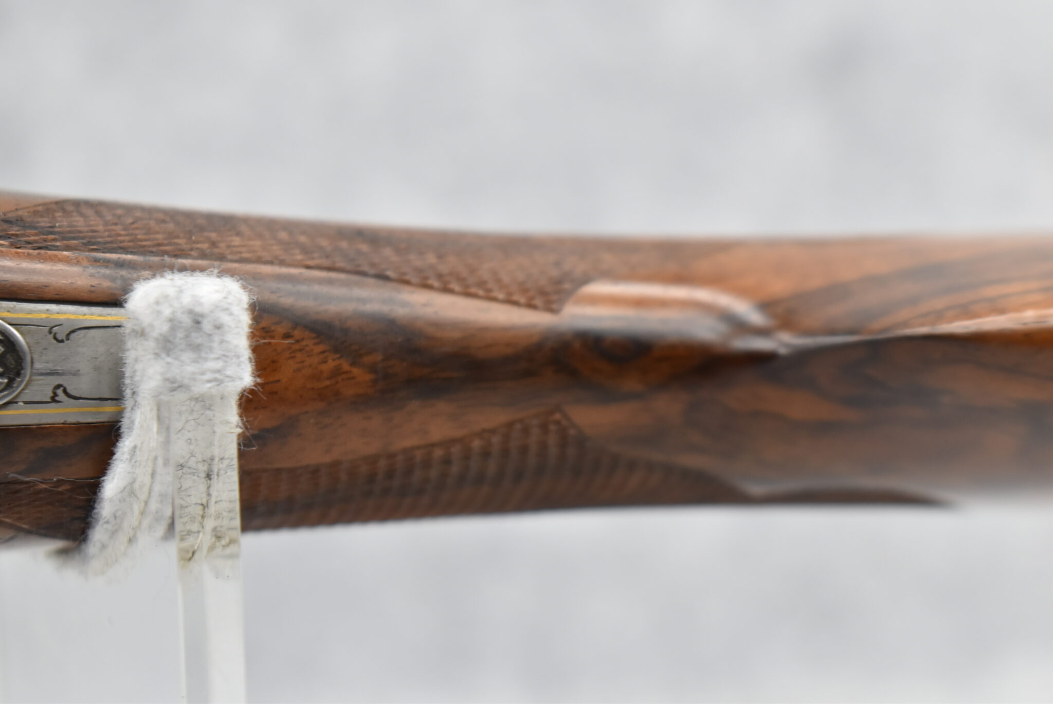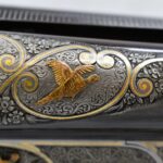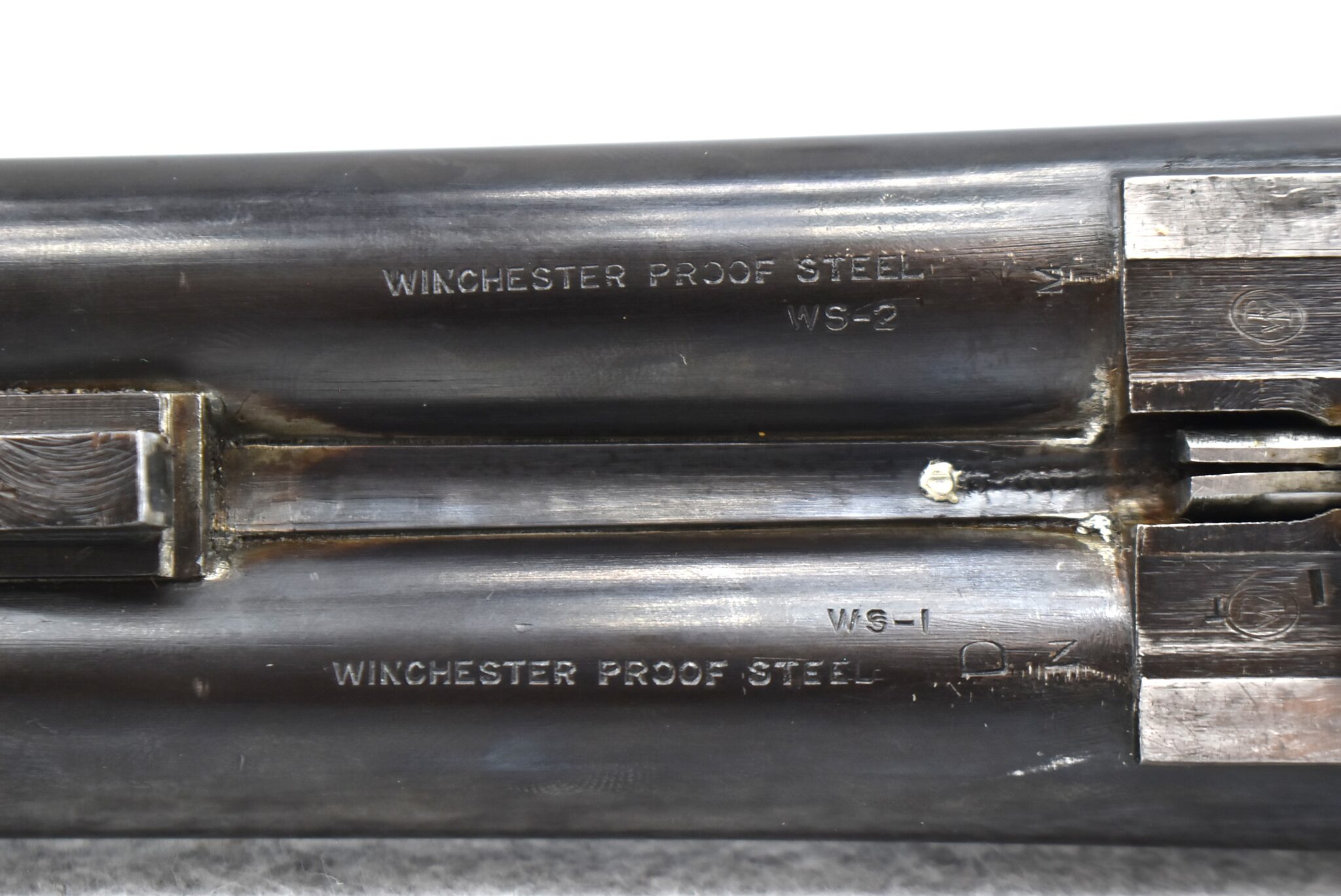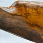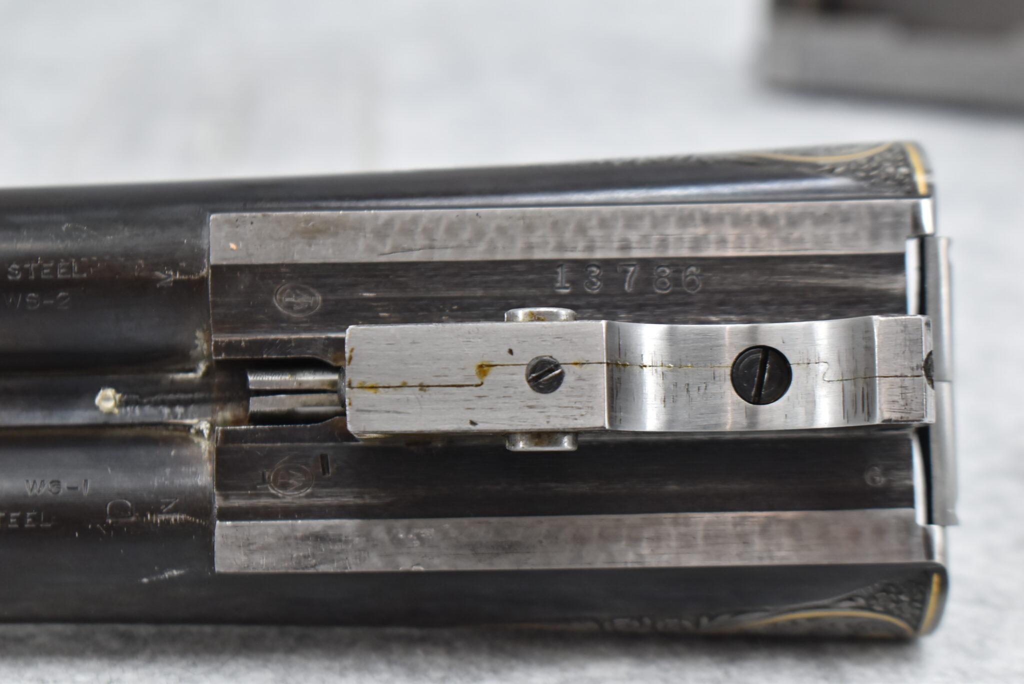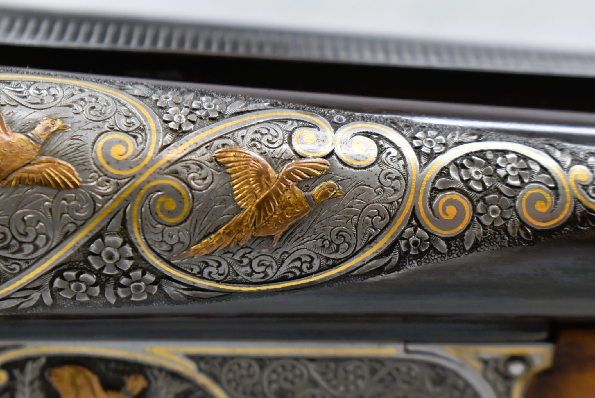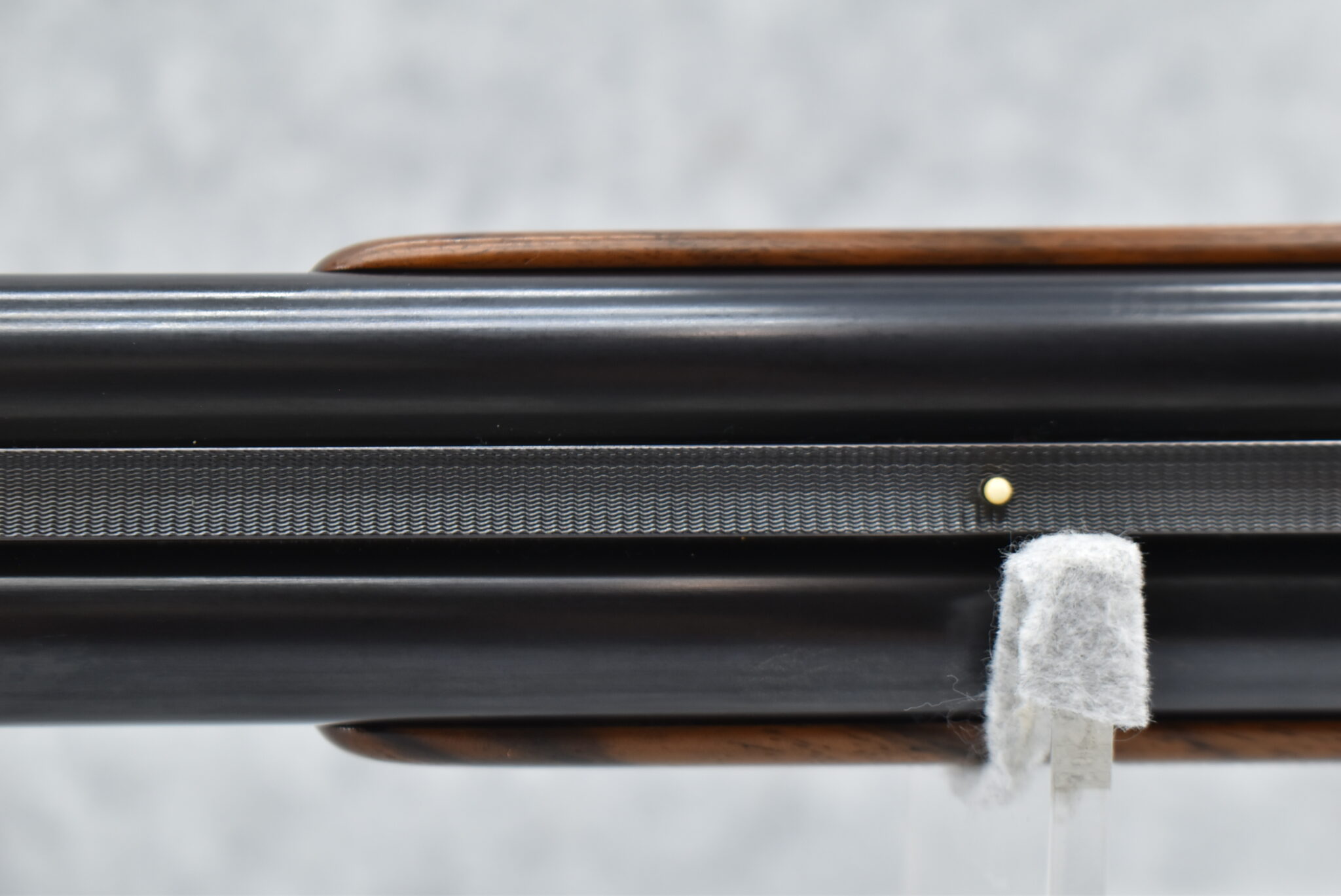 26R. Unbelievable! Custom Signed & Engraved Angelo Bee Winchester 21 Skeet Grade 12ga. Side By Side Shotgun – Serial Number 13786 – Gun is Fitted w/The Original Set of 26” Solid Rib, WS-1 & WS-2 Choked Winchester Barrels w/Dual Ivory Bead Sights – Barrels Retain a Strong Amount of Blued Finish, While the Receiver is a Silver Finish – Gun Has Been Custom Stocked by Top American Master Stock Maker Michael Yee w/A Highly Figured Fine Checkered Straight Grip Select Walnut Butt Stock w/Pachmayr Recoil Pad & Matching Highly Figured, Fine Checkered Beavertail Forearm – Masterfully Engraved & Signed by Renowned Master Engraver Angelo Bee w/100% Coverage of Fine Scroll Work & Isolated Bird Dog & Waterfowl Scene Medallions on the Right, Left & Underside of Receiver – Between All Sides of the Receiver There Are 6 Gold Wire Inlay Bordered Scene Medallions – The Breech & Muzzle Ends of the Barrels Are Also Intricately Engraved w/Fine Scrolling as Well as Their Own Gold Wire Inlaid Bordered Waterfowl Scene Medallions – Bee Was Even Able to Squeeze in a Masterfully Engraved Gold Inlay Rabbit w/Scroll Work on the Long Tang Trigger Guard – The Rear of the Break Open Lever is Relief Engraved w/A Squirrel – In Total, There Are 11 Gold Bordered Scene Medallions on This Gun – Angelo Bee’s Signature Can Be Seen on the Left Side of the Receiver in Front of The Bird Dogs Hind Leg! All the Animal Inlays Were Done w/Yellow, Rose & White Gold – w/Single Selective Trigger – Gun’s LOP is 14 ½” – Minimum Wall Thickness .034 on the Right Barrel, .035 on the Left Barrel – Gun Comes in a Leather Take Down Case w/Maroon Felt Interior & Canvas Zip-Up Outer w/2pc. Cleaning Rod, Brush, Swab, Oiler, Set of Winchester Metal Snap Cap, Turn Screw Handle & Winchester Label – This Gun is Without a Doubt a Museum Quality, Masterful Display of Angelo Bee’s Skill & Artistry & Would Complement, If Not be the Centerpiece of Anyone’s Collection!!
