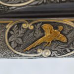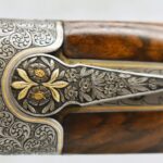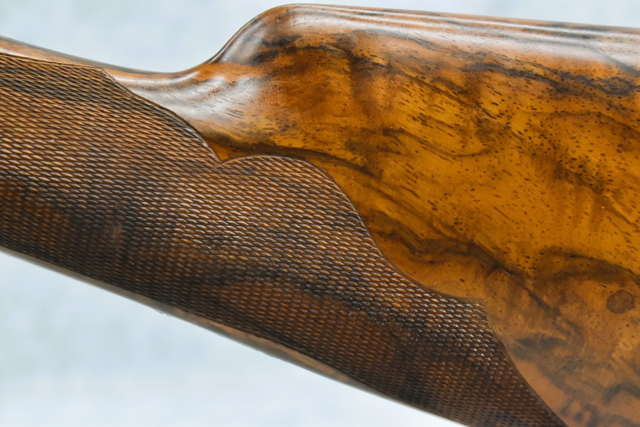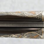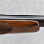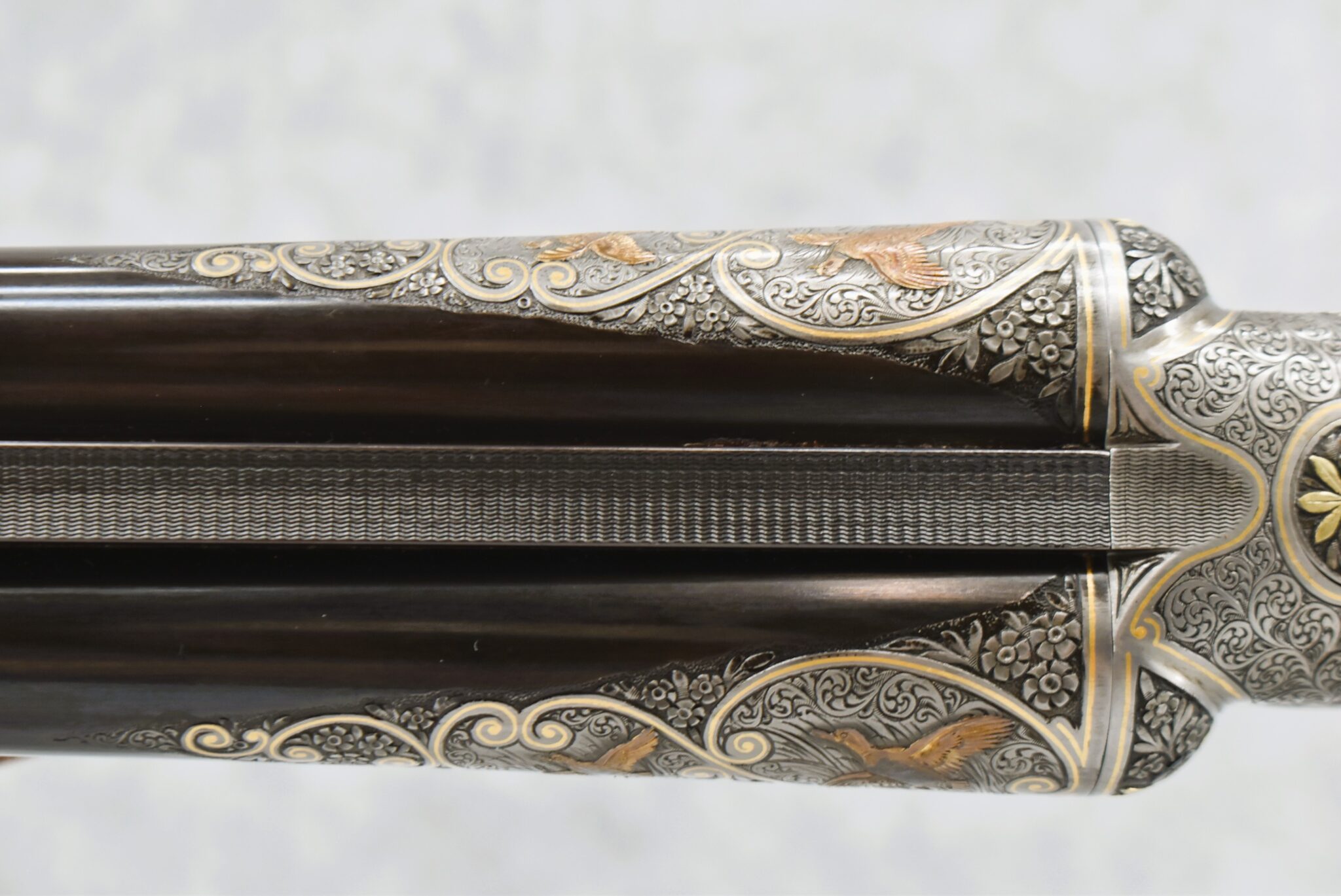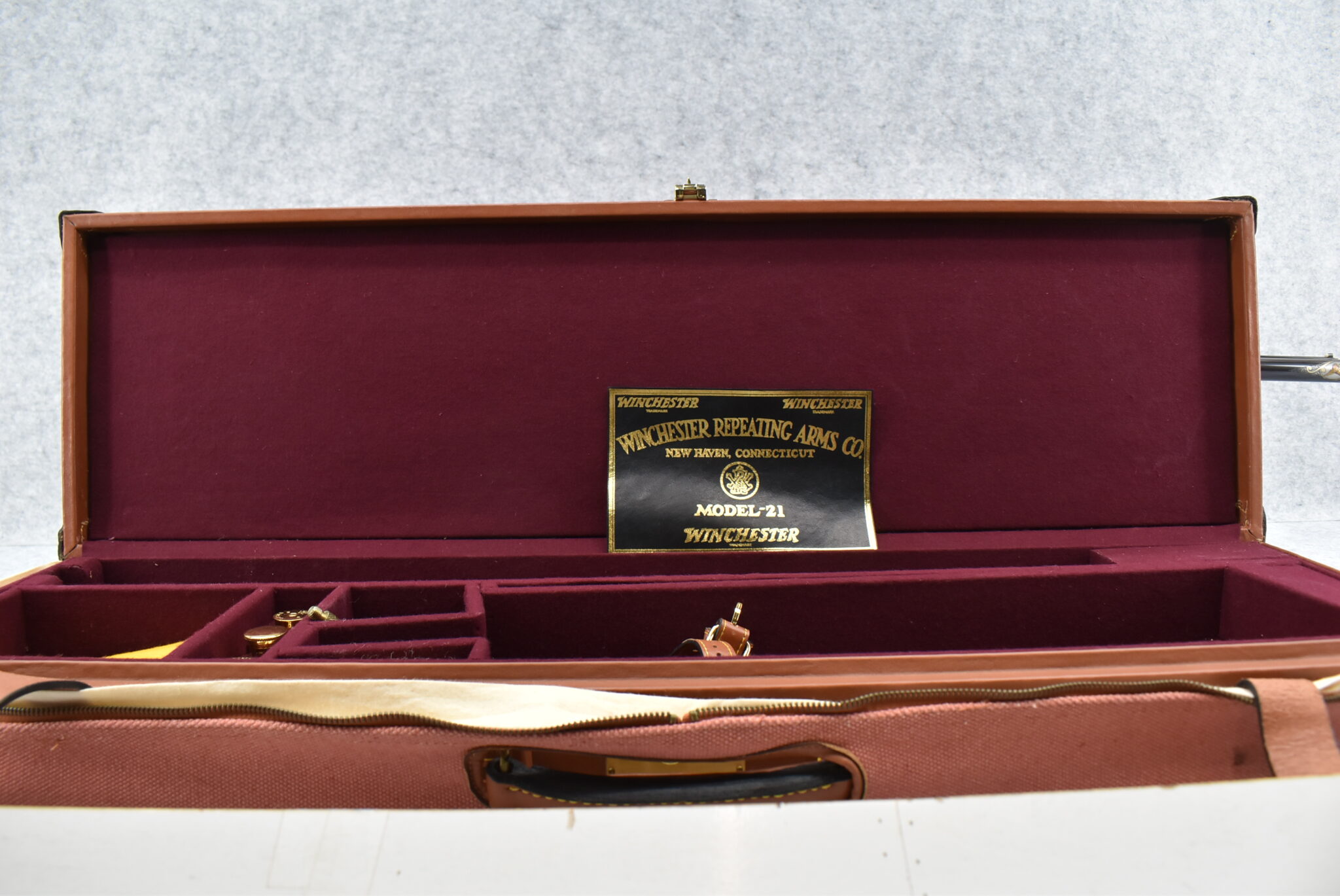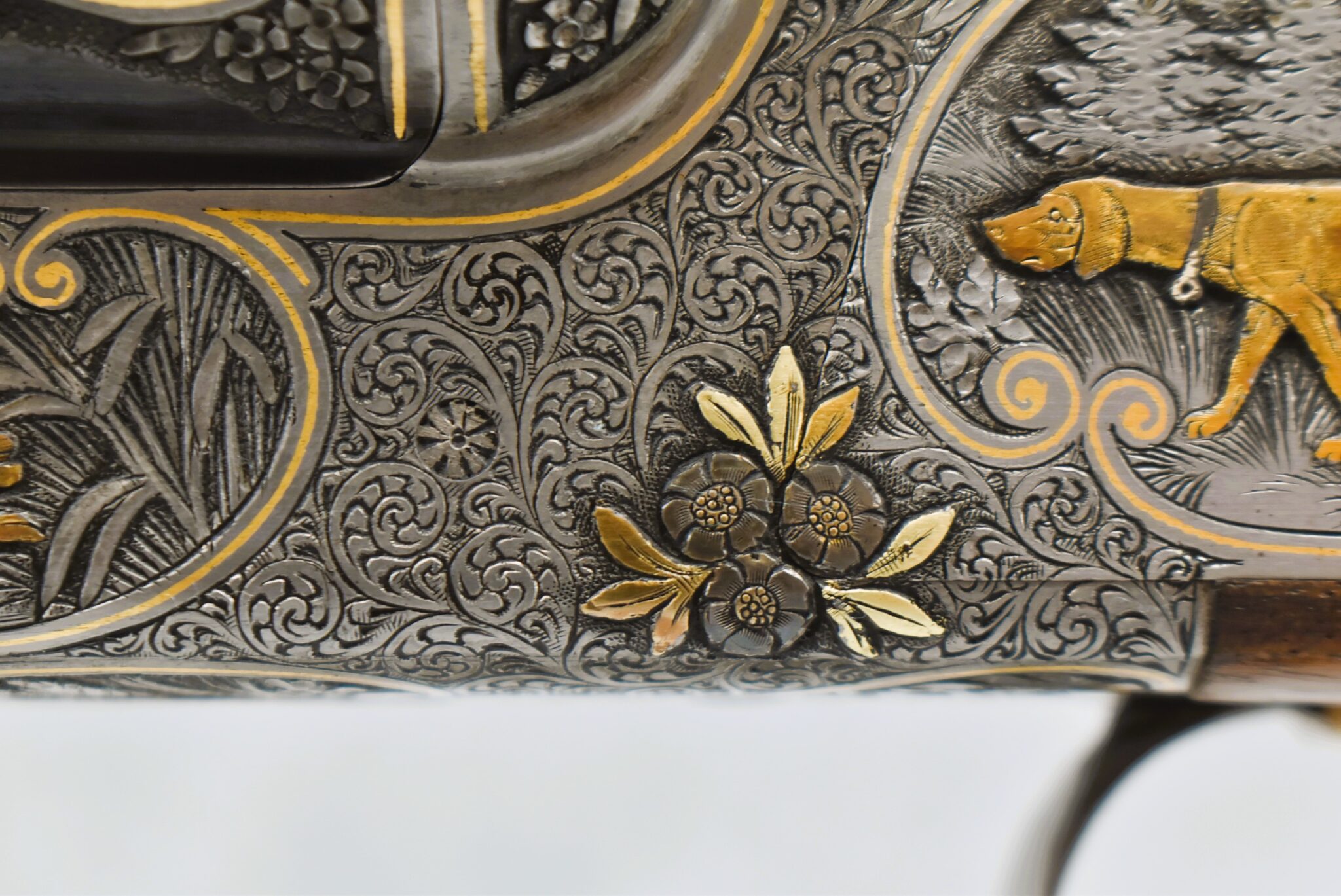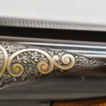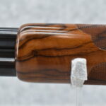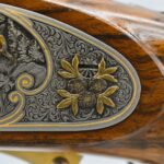 26R. Unbelievable! Custom Signed & Engraved Angelo Bee Winchester 21 Skeet Grade 12ga. Side By Side Shotgun – Serial Number 13786 – Gun is Fitted w/The Original Set of 26” Solid Rib, WS-1 & WS-2 Choked Winchester Barrels w/Dual Ivory Bead Sights – Barrels Retain a Strong Amount of Blued Finish, While the Receiver is a Silver Finish – Gun Has Been Custom Stocked by Top American Master Stock Maker Michael Yee w/A Highly Figured Fine Checkered Straight Grip Select Walnut Butt Stock w/Pachmayr Recoil Pad & Matching Highly Figured, Fine Checkered Beavertail Forearm – Masterfully Engraved & Signed by Renowned Master Engraver Angelo Bee w/100% Coverage of Fine Scroll Work & Isolated Bird Dog & Waterfowl Scene Medallions on the Right, Left & Underside of Receiver – Between All Sides of the Receiver There Are 6 Gold Wire Inlay Bordered Scene Medallions – The Breech & Muzzle Ends of the Barrels Are Also Intricately Engraved w/Fine Scrolling as Well as Their Own Gold Wire Inlaid Bordered Waterfowl Scene Medallions – Bee Was Even Able to Squeeze in a Masterfully Engraved Gold Inlay Rabbit w/Scroll Work on the Long Tang Trigger Guard – The Rear of the Break Open Lever is Relief Engraved w/A Squirrel – In Total, There Are 11 Gold Bordered Scene Medallions on This Gun – Angelo Bee’s Signature Can Be Seen on the Left Side of the Receiver in Front of The Bird Dogs Hind Leg! All the Animal Inlays Were Done w/Yellow, Rose & White Gold – w/Single Selective Trigger – Gun’s LOP is 14 ½” – Minimum Wall Thickness .034 on the Right Barrel, .035 on the Left Barrel – Gun Comes in a Leather Take Down Case w/Maroon Felt Interior & Canvas Zip-Up Outer w/2pc. Cleaning Rod, Brush, Swab, Oiler, Set of Winchester Metal Snap Cap, Turn Screw Handle & Winchester Label – This Gun is Without a Doubt a Museum Quality, Masterful Display of Angelo Bee’s Skill & Artistry & Would Complement, If Not be the Centerpiece of Anyone’s Collection!!