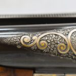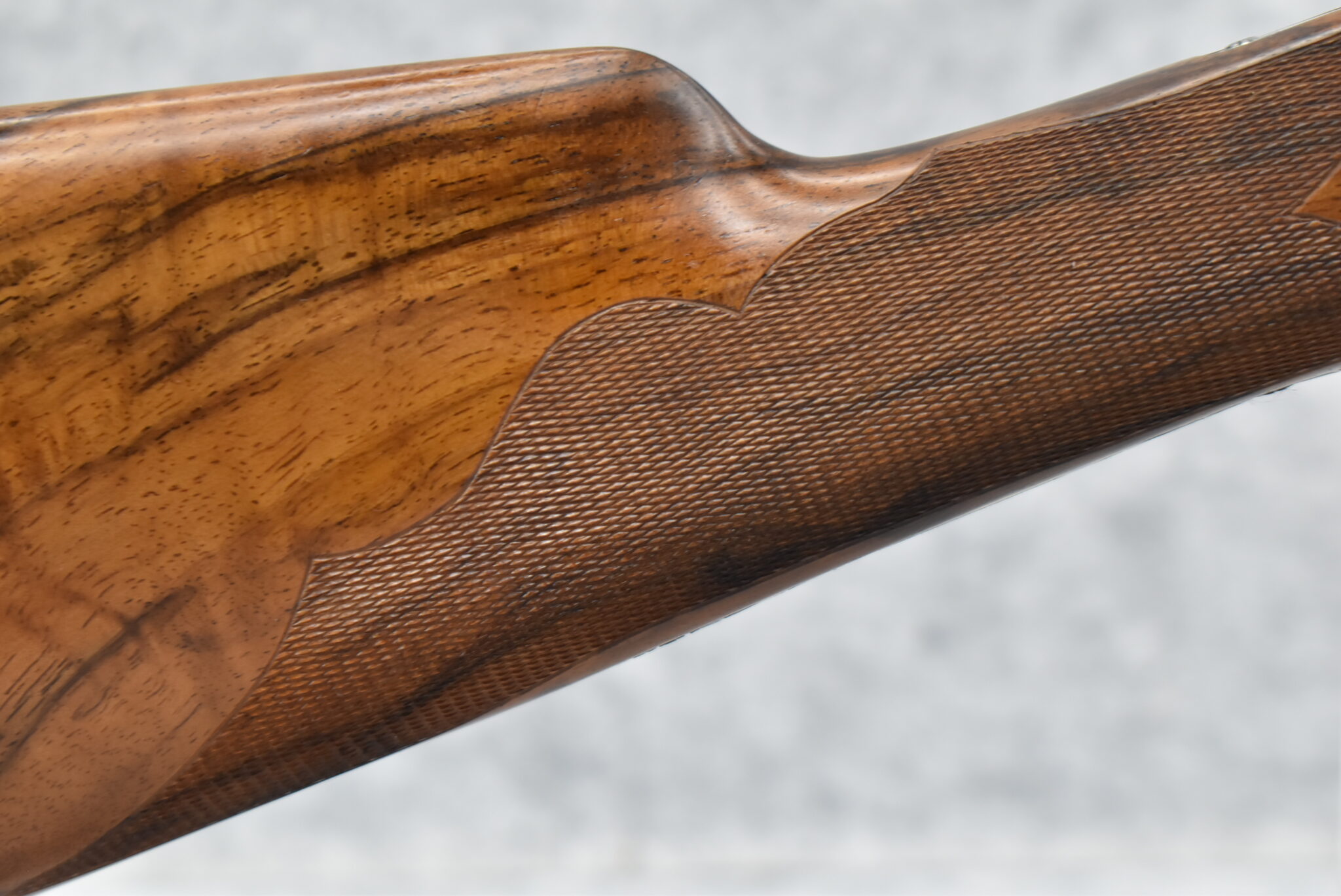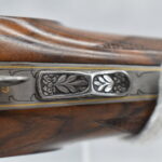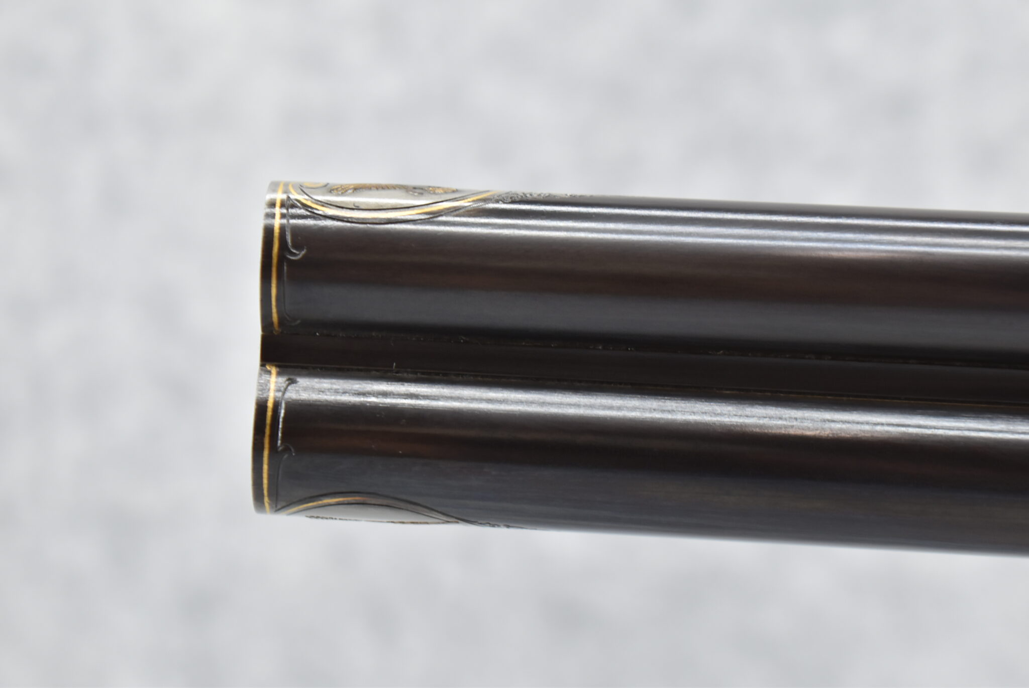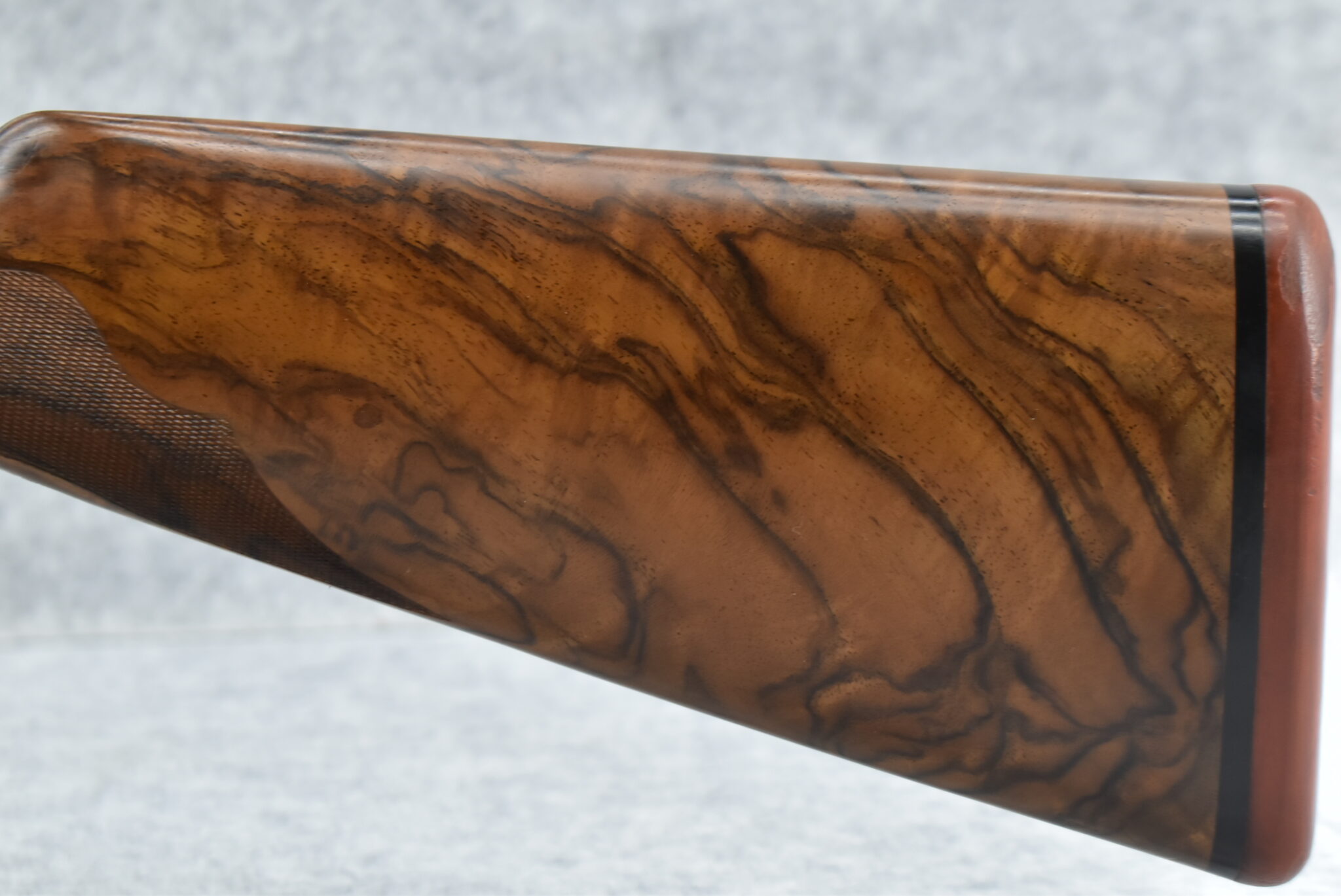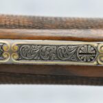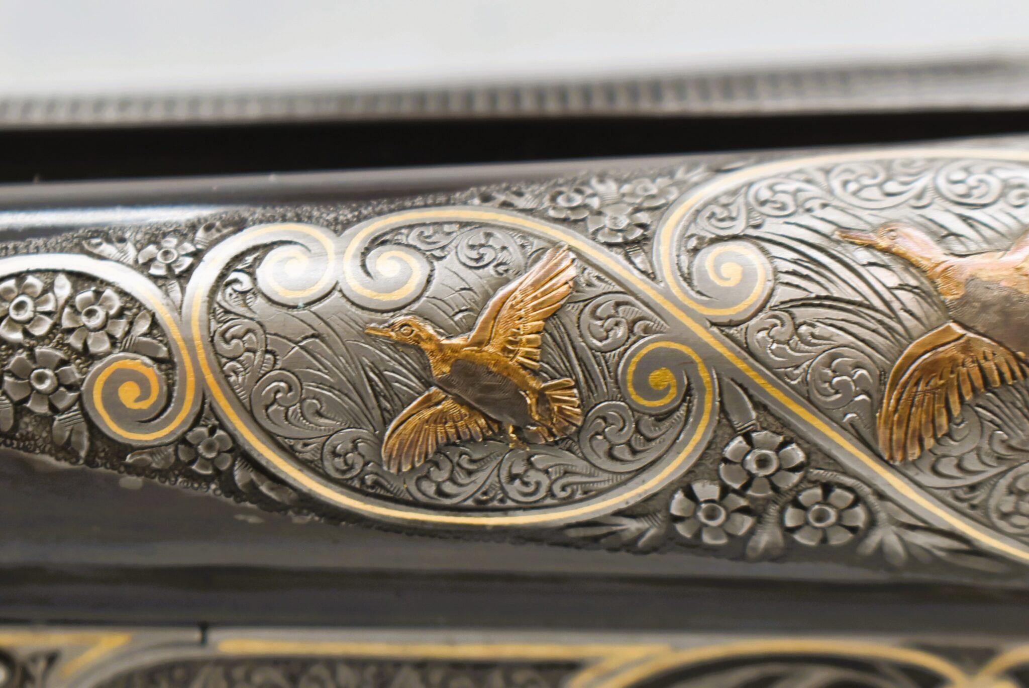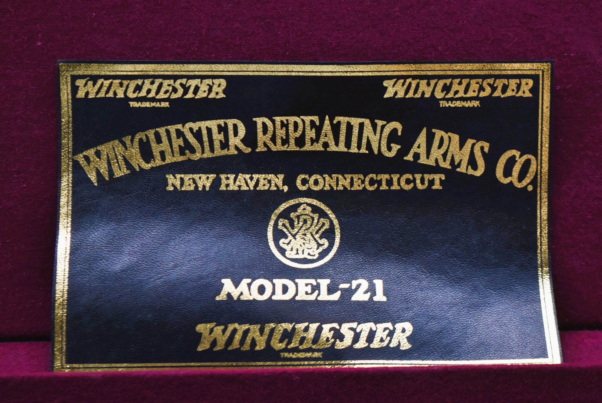 26R. Unbelievable! Custom Signed & Engraved Angelo Bee Winchester 21 Skeet Grade 12ga. Side By Side Shotgun – Serial Number 13786 – Gun is Fitted w/The Original Set of 26” Solid Rib, WS-1 & WS-2 Choked Winchester Barrels w/Dual Ivory Bead Sights – Barrels Retain a Strong Amount of Blued Finish, While the Receiver is a Silver Finish – Gun Has Been Custom Stocked by Top American Master Stock Maker Michael Yee w/A Highly Figured Fine Checkered Straight Grip Select Walnut Butt Stock w/Pachmayr Recoil Pad & Matching Highly Figured, Fine Checkered Beavertail Forearm – Masterfully Engraved & Signed by Renowned Master Engraver Angelo Bee w/100% Coverage of Fine Scroll Work & Isolated Bird Dog & Waterfowl Scene Medallions on the Right, Left & Underside of Receiver – Between All Sides of the Receiver There Are 6 Gold Wire Inlay Bordered Scene Medallions – The Breech & Muzzle Ends of the Barrels Are Also Intricately Engraved w/Fine Scrolling as Well as Their Own Gold Wire Inlaid Bordered Waterfowl Scene Medallions – Bee Was Even Able to Squeeze in a Masterfully Engraved Gold Inlay Rabbit w/Scroll Work on the Long Tang Trigger Guard – The Rear of the Break Open Lever is Relief Engraved w/A Squirrel – In Total, There Are 11 Gold Bordered Scene Medallions on This Gun – Angelo Bee’s Signature Can Be Seen on the Left Side of the Receiver in Front of The Bird Dogs Hind Leg! All the Animal Inlays Were Done w/Yellow, Rose & White Gold – w/Single Selective Trigger – Gun’s LOP is 14 ½” – Minimum Wall Thickness .034 on the Right Barrel, .035 on the Left Barrel – Gun Comes in a Leather Take Down Case w/Maroon Felt Interior & Canvas Zip-Up Outer w/2pc. Cleaning Rod, Brush, Swab, Oiler, Set of Winchester Metal Snap Cap, Turn Screw Handle & Winchester Label – This Gun is Without a Doubt a Museum Quality, Masterful Display of Angelo Bee’s Skill & Artistry & Would Complement, If Not be the Centerpiece of Anyone’s Collection!!
