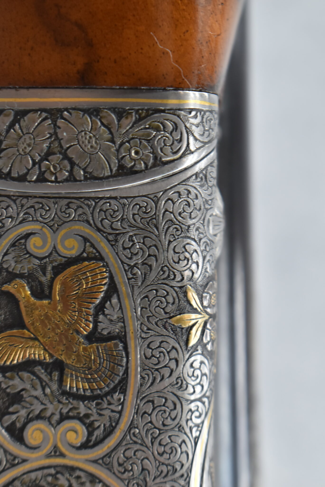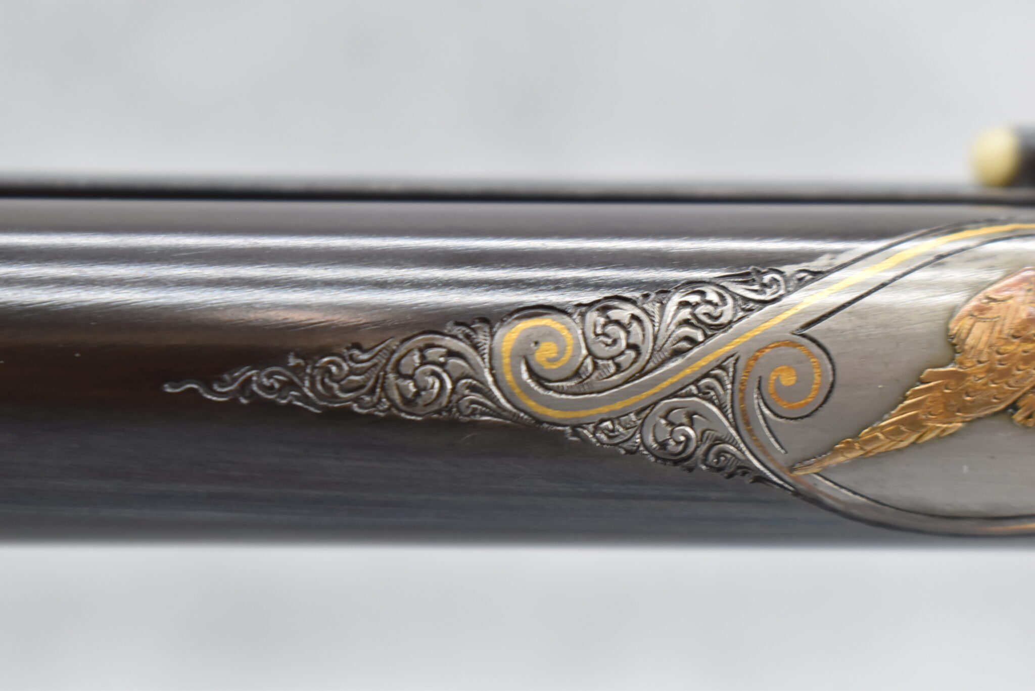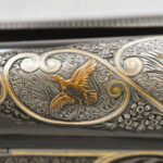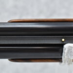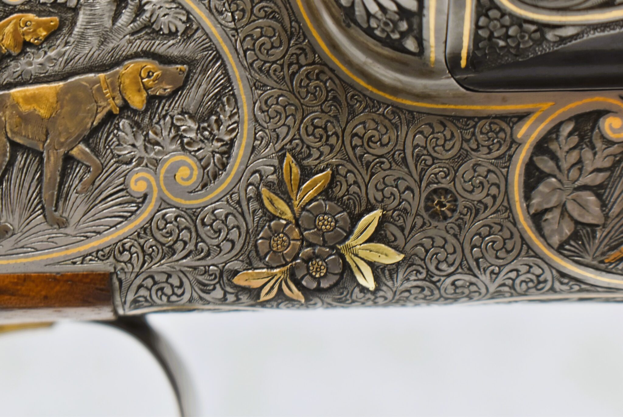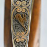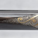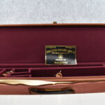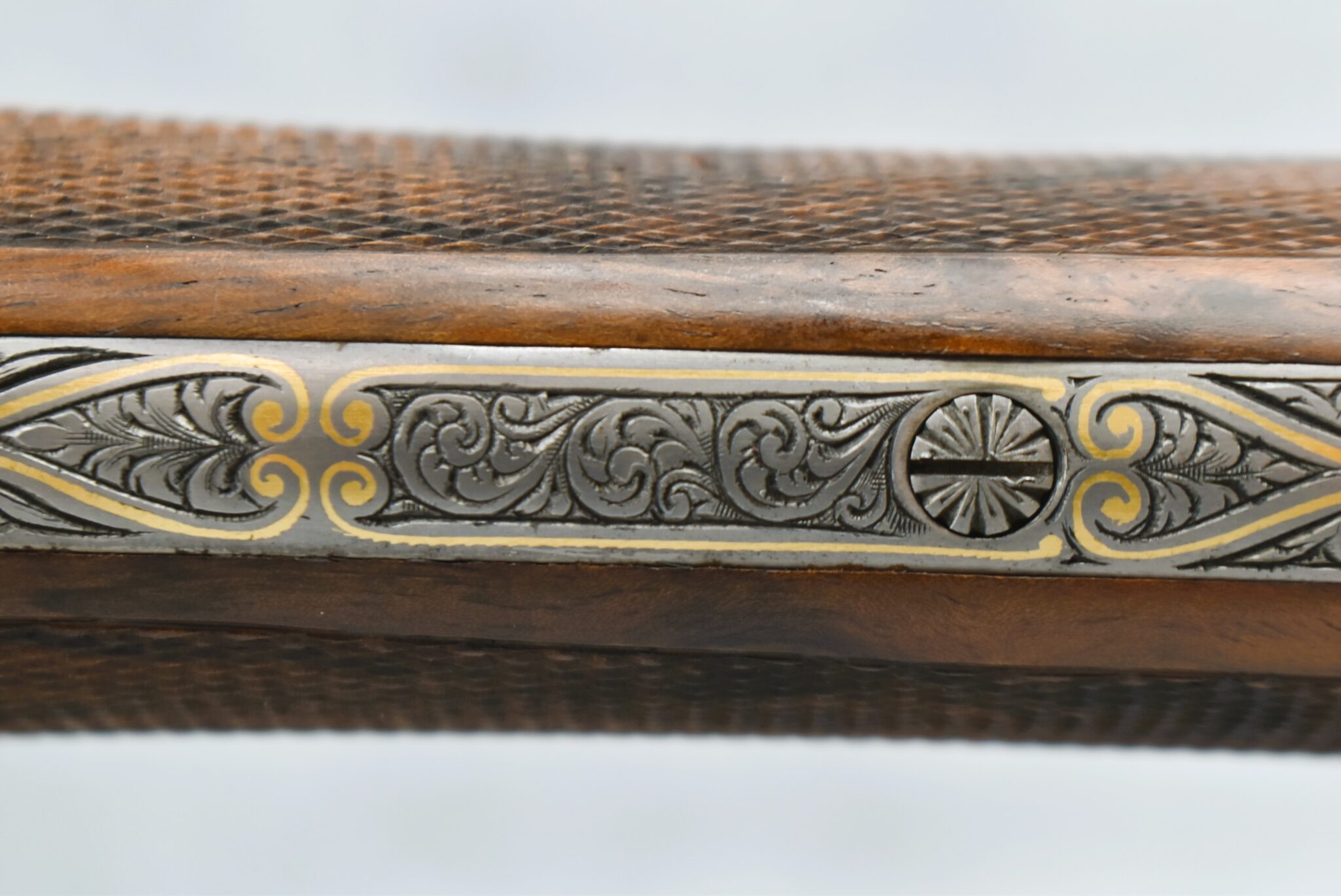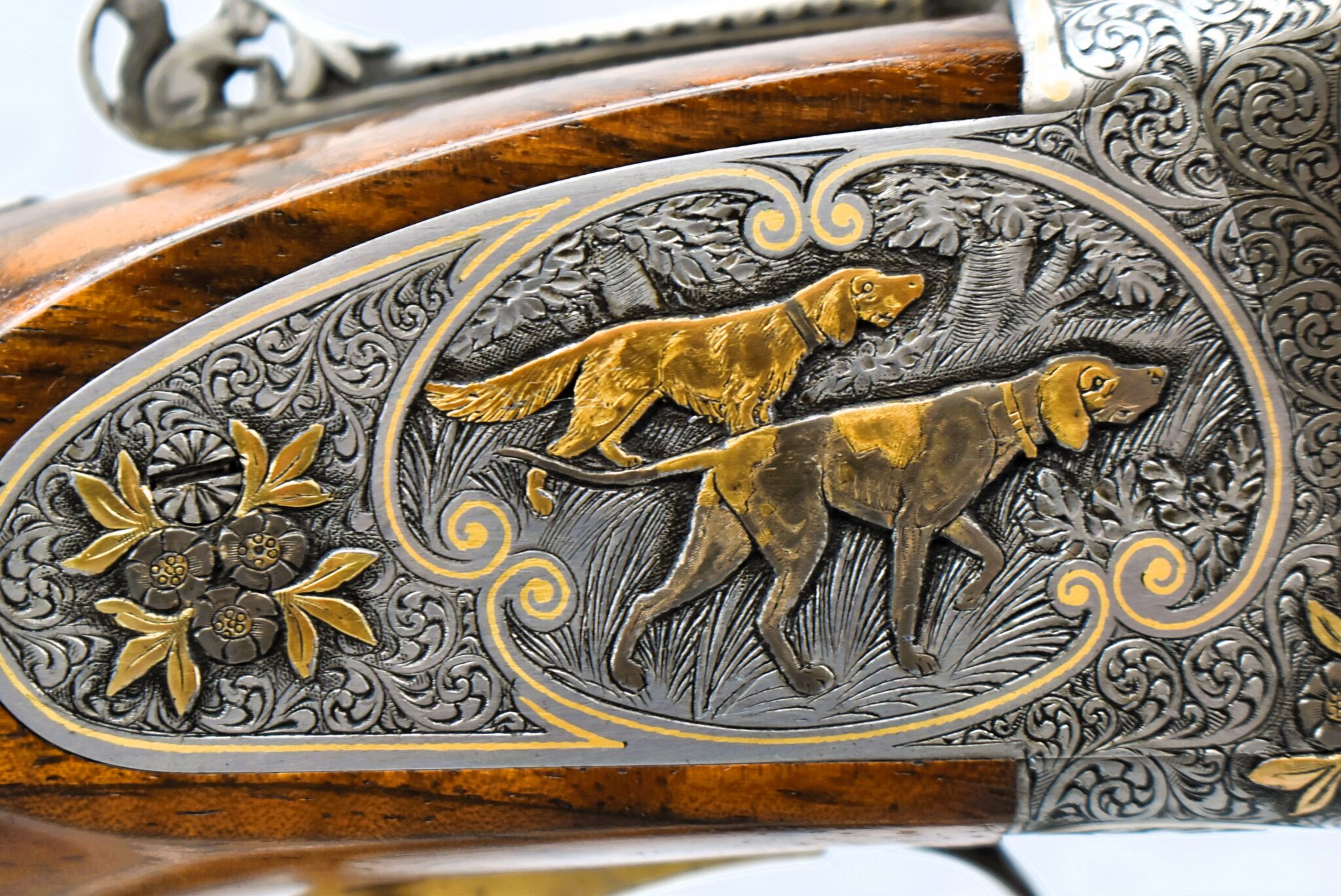 26R. Unbelievable! Custom Signed & Engraved Angelo Bee Winchester 21 Skeet Grade 12ga. Side By Side Shotgun – Serial Number 13786 – Gun is Fitted w/The Original Set of 26” Solid Rib, WS-1 & WS-2 Choked Winchester Barrels w/Dual Ivory Bead Sights – Barrels Retain a Strong Amount of Blued Finish, While the Receiver is a Silver Finish – Gun Has Been Custom Stocked by Top American Master Stock Maker Michael Yee w/A Highly Figured Fine Checkered Straight Grip Select Walnut Butt Stock w/Pachmayr Recoil Pad & Matching Highly Figured, Fine Checkered Beavertail Forearm – Masterfully Engraved & Signed by Renowned Master Engraver Angelo Bee w/100% Coverage of Fine Scroll Work & Isolated Bird Dog & Waterfowl Scene Medallions on the Right, Left & Underside of Receiver – Between All Sides of the Receiver There Are 6 Gold Wire Inlay Bordered Scene Medallions – The Breech & Muzzle Ends of the Barrels Are Also Intricately Engraved w/Fine Scrolling as Well as Their Own Gold Wire Inlaid Bordered Waterfowl Scene Medallions – Bee Was Even Able to Squeeze in a Masterfully Engraved Gold Inlay Rabbit w/Scroll Work on the Long Tang Trigger Guard – The Rear of the Break Open Lever is Relief Engraved w/A Squirrel – In Total, There Are 11 Gold Bordered Scene Medallions on This Gun – Angelo Bee’s Signature Can Be Seen on the Left Side of the Receiver in Front of The Bird Dogs Hind Leg! All the Animal Inlays Were Done w/Yellow, Rose & White Gold – w/Single Selective Trigger – Gun’s LOP is 14 ½” – Minimum Wall Thickness .034 on the Right Barrel, .035 on the Left Barrel – Gun Comes in a Leather Take Down Case w/Maroon Felt Interior & Canvas Zip-Up Outer w/2pc. Cleaning Rod, Brush, Swab, Oiler, Set of Winchester Metal Snap Cap, Turn Screw Handle & Winchester Label – This Gun is Without a Doubt a Museum Quality, Masterful Display of Angelo Bee’s Skill & Artistry & Would Complement, If Not be the Centerpiece of Anyone’s Collection!!