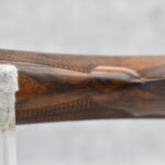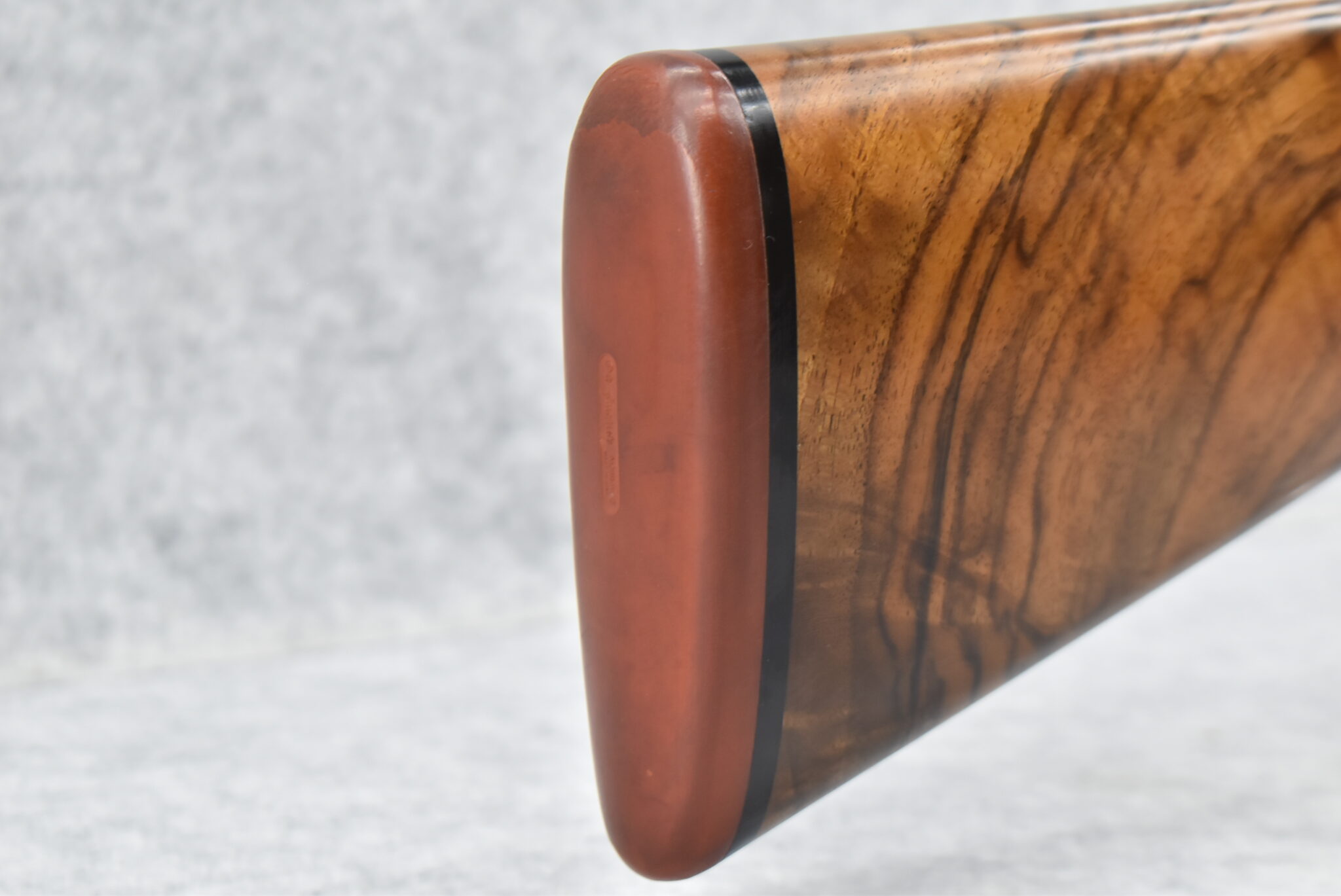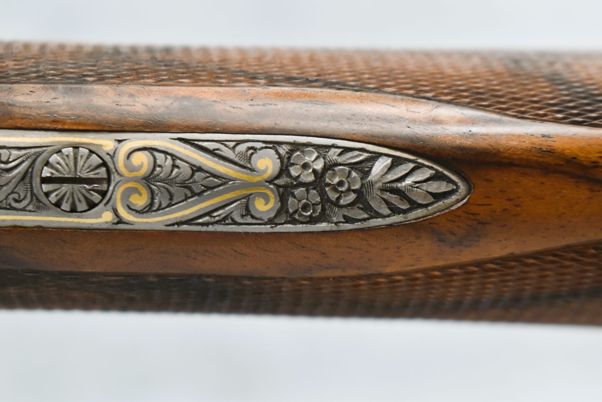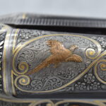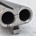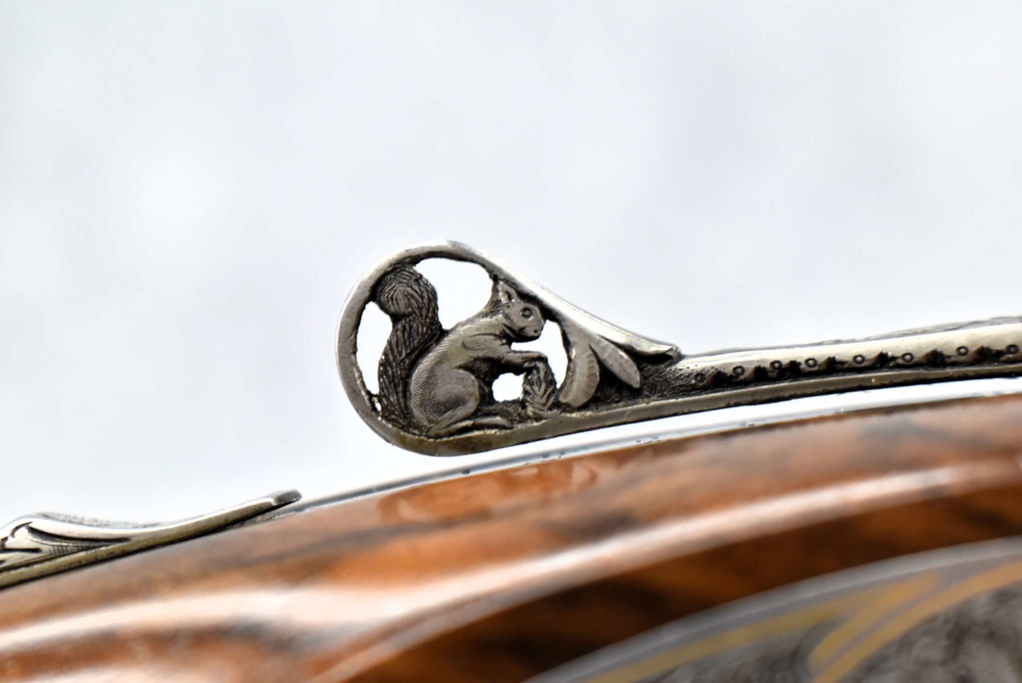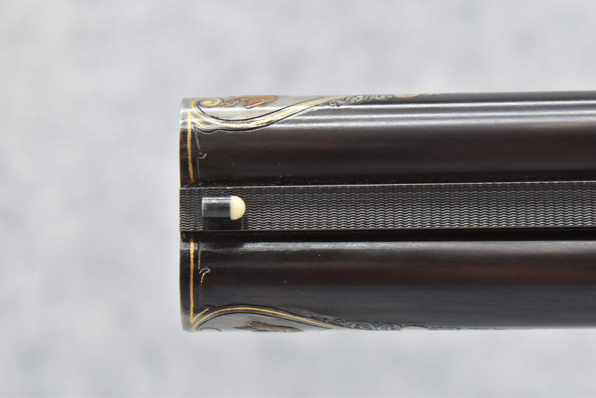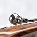 26R. Unbelievable! Custom Signed & Engraved Angelo Bee Winchester 21 Skeet Grade 12ga. Side By Side Shotgun – Serial Number 13786 – Gun is Fitted w/The Original Set of 26” Solid Rib, WS-1 & WS-2 Choked Winchester Barrels w/Dual Ivory Bead Sights – Barrels Retain a Strong Amount of Blued Finish, While the Receiver is a Silver Finish – Gun Has Been Custom Stocked by Top American Master Stock Maker Michael Yee w/A Highly Figured Fine Checkered Straight Grip Select Walnut Butt Stock w/Pachmayr Recoil Pad & Matching Highly Figured, Fine Checkered Beavertail Forearm – Masterfully Engraved & Signed by Renowned Master Engraver Angelo Bee w/100% Coverage of Fine Scroll Work & Isolated Bird Dog & Waterfowl Scene Medallions on the Right, Left & Underside of Receiver – Between All Sides of the Receiver There Are 6 Gold Wire Inlay Bordered Scene Medallions – The Breech & Muzzle Ends of the Barrels Are Also Intricately Engraved w/Fine Scrolling as Well as Their Own Gold Wire Inlaid Bordered Waterfowl Scene Medallions – Bee Was Even Able to Squeeze in a Masterfully Engraved Gold Inlay Rabbit w/Scroll Work on the Long Tang Trigger Guard – The Rear of the Break Open Lever is Relief Engraved w/A Squirrel – In Total, There Are 11 Gold Bordered Scene Medallions on This Gun – Angelo Bee’s Signature Can Be Seen on the Left Side of the Receiver in Front of The Bird Dogs Hind Leg! All the Animal Inlays Were Done w/Yellow, Rose & White Gold – w/Single Selective Trigger – Gun’s LOP is 14 ½” – Minimum Wall Thickness .034 on the Right Barrel, .035 on the Left Barrel – Gun Comes in a Leather Take Down Case w/Maroon Felt Interior & Canvas Zip-Up Outer w/2pc. Cleaning Rod, Brush, Swab, Oiler, Set of Winchester Metal Snap Cap, Turn Screw Handle & Winchester Label – This Gun is Without a Doubt a Museum Quality, Masterful Display of Angelo Bee’s Skill & Artistry & Would Complement, If Not be the Centerpiece of Anyone’s Collection!!
