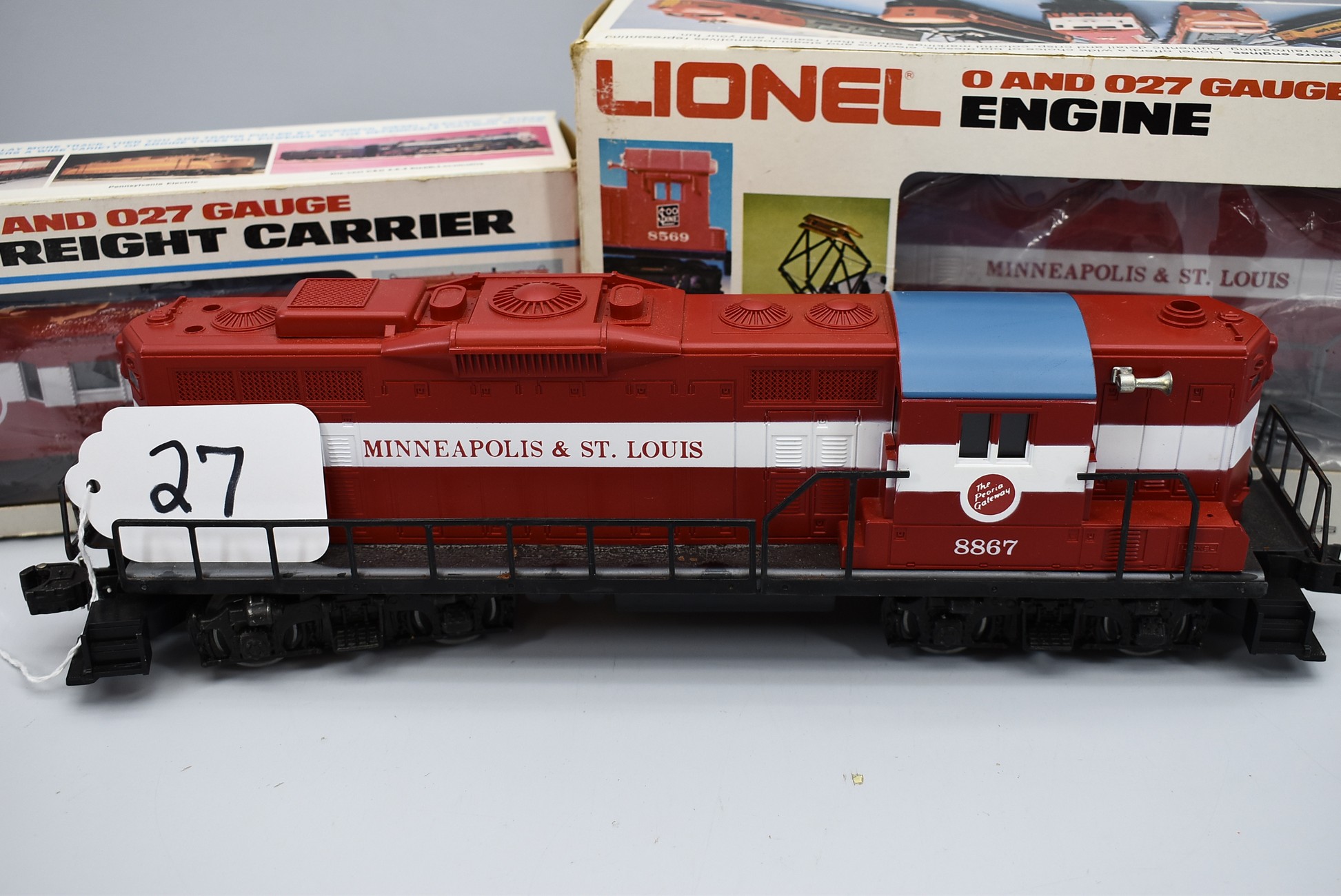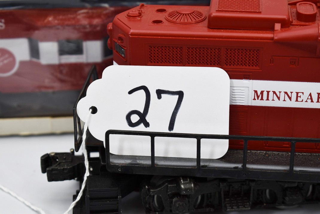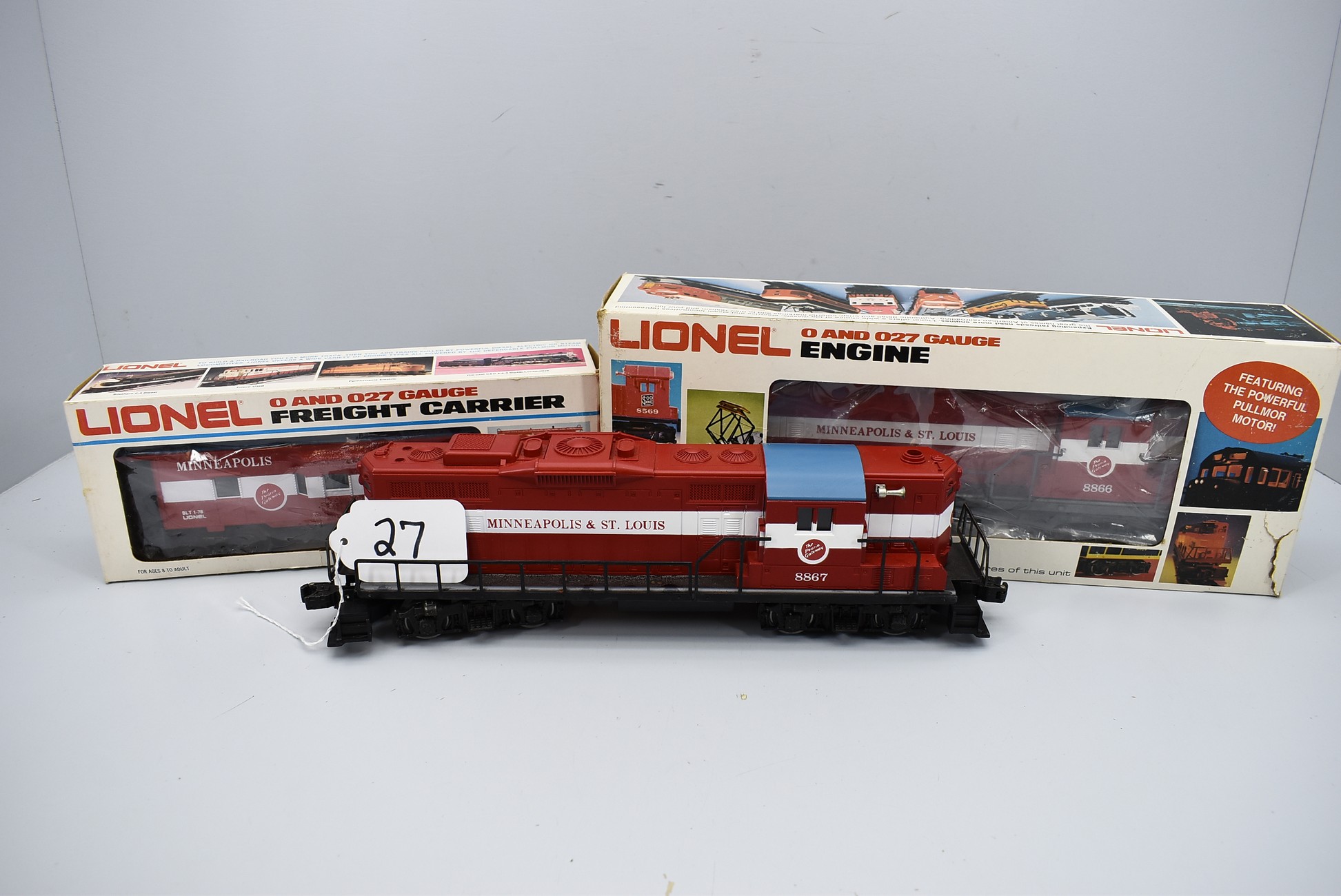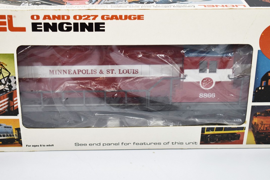 27. Lot of 3 Lionel O-Gauge – Including Minneapolis & St. Louis Bay Window Caboose 6-9271, Minneapolis & St. Louis Engine 8867, and Minneapolis & St. Louis GP-9 6-8866 – (2) w/Boxes