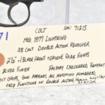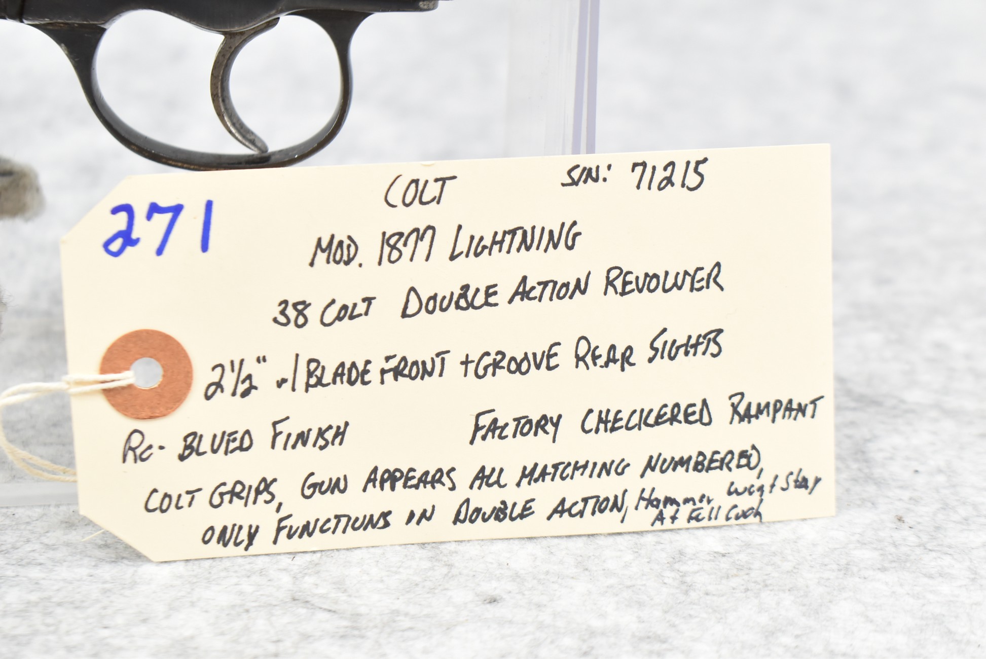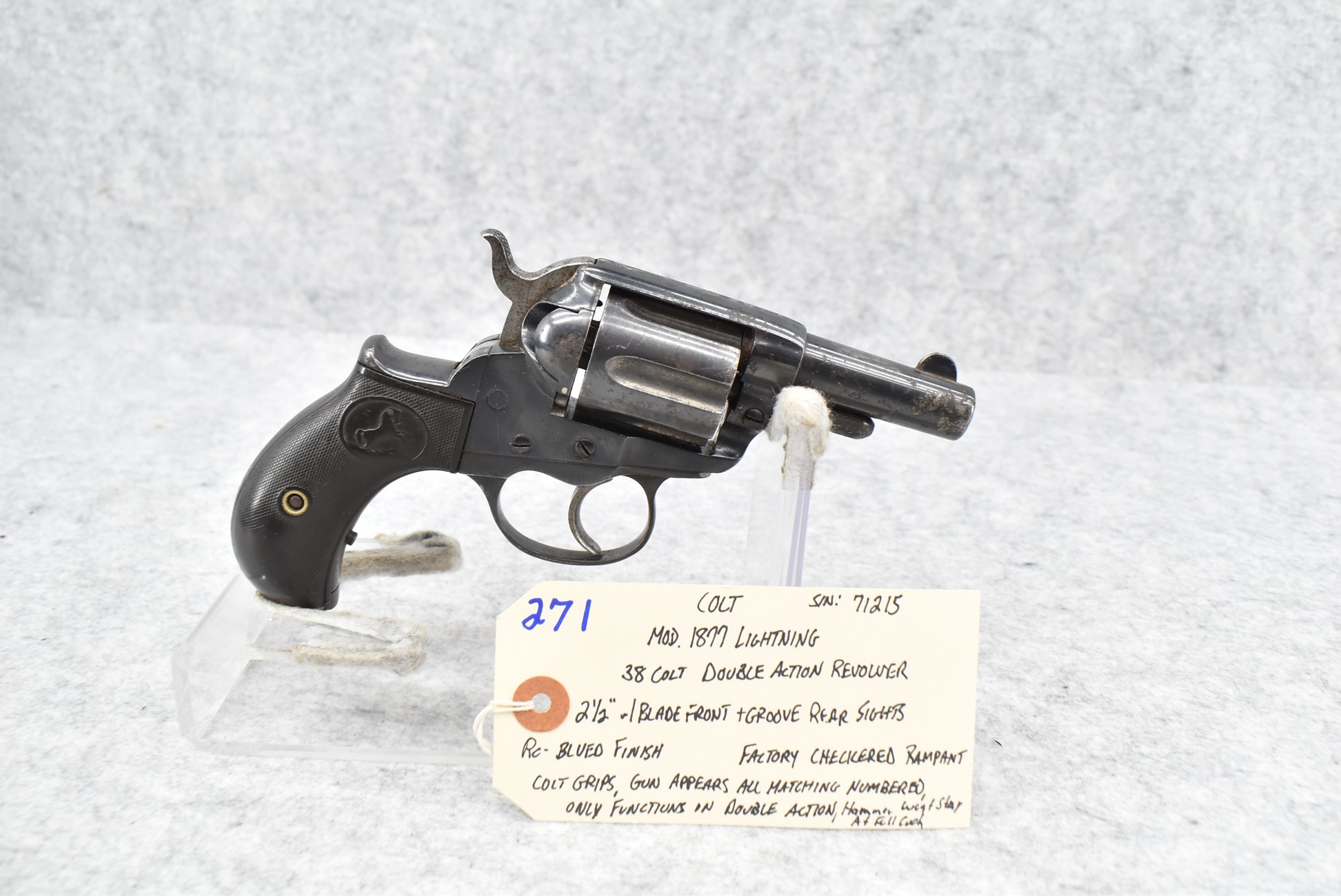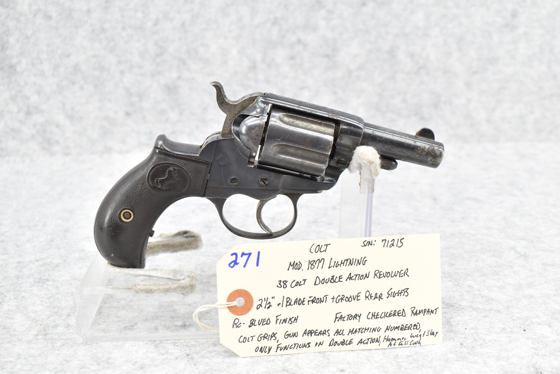 271. Colt – Mod. 1877 Lightning – 38 Colt Cal. Double Action Revolver – w/2 ½” Barrel w/Blade Front & Groove Rear Sights – Re-Blued Finish – w/Factory Checkered Rampant Colt Grips – Gun Appears All Matching Numbered – Note: Only Functions in Double Action, Hammer Won’t Stay at Full Cock