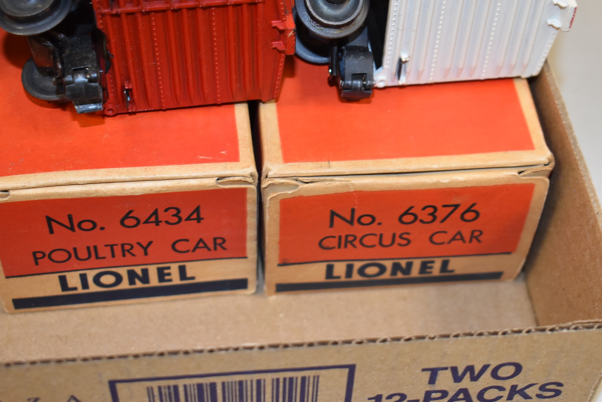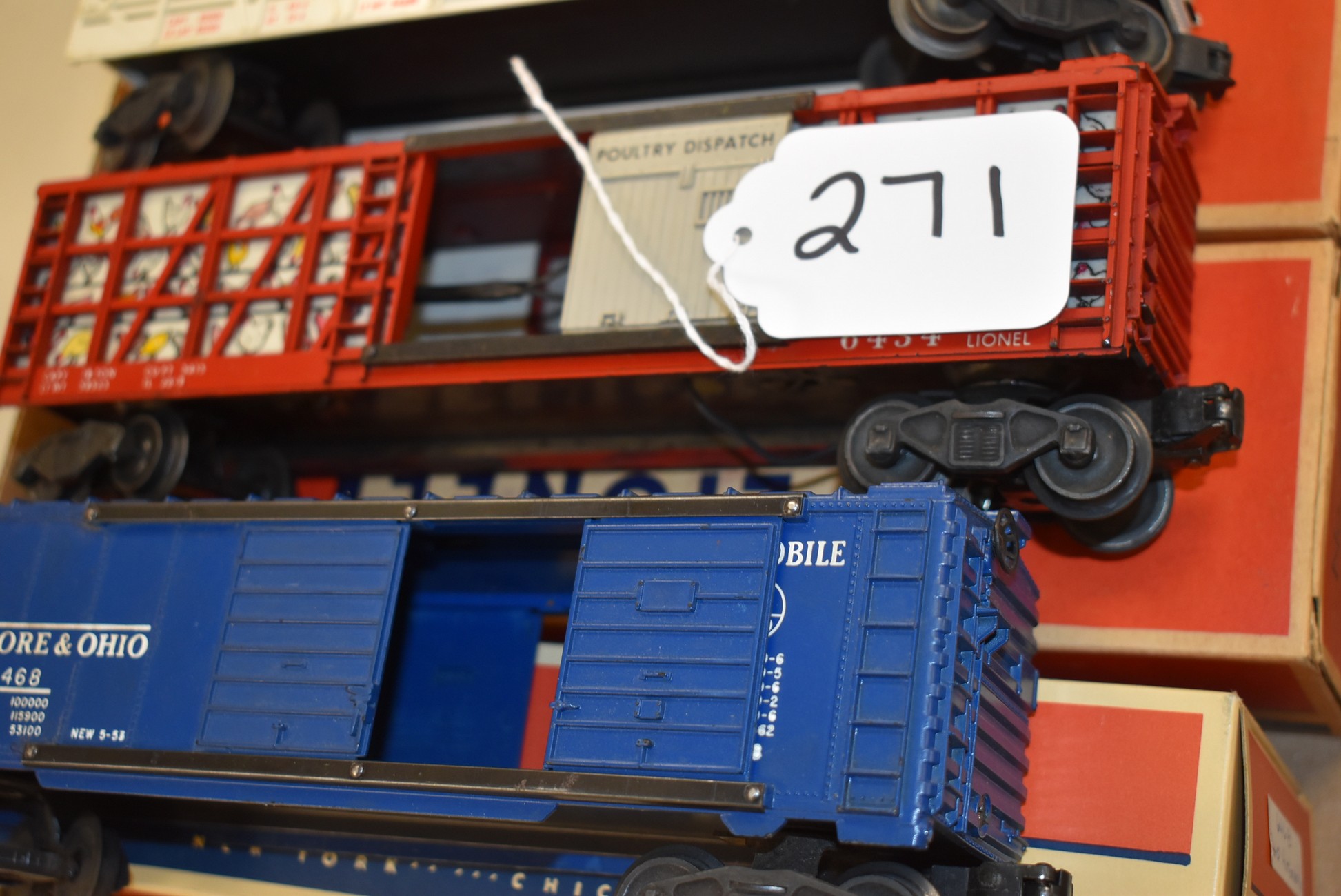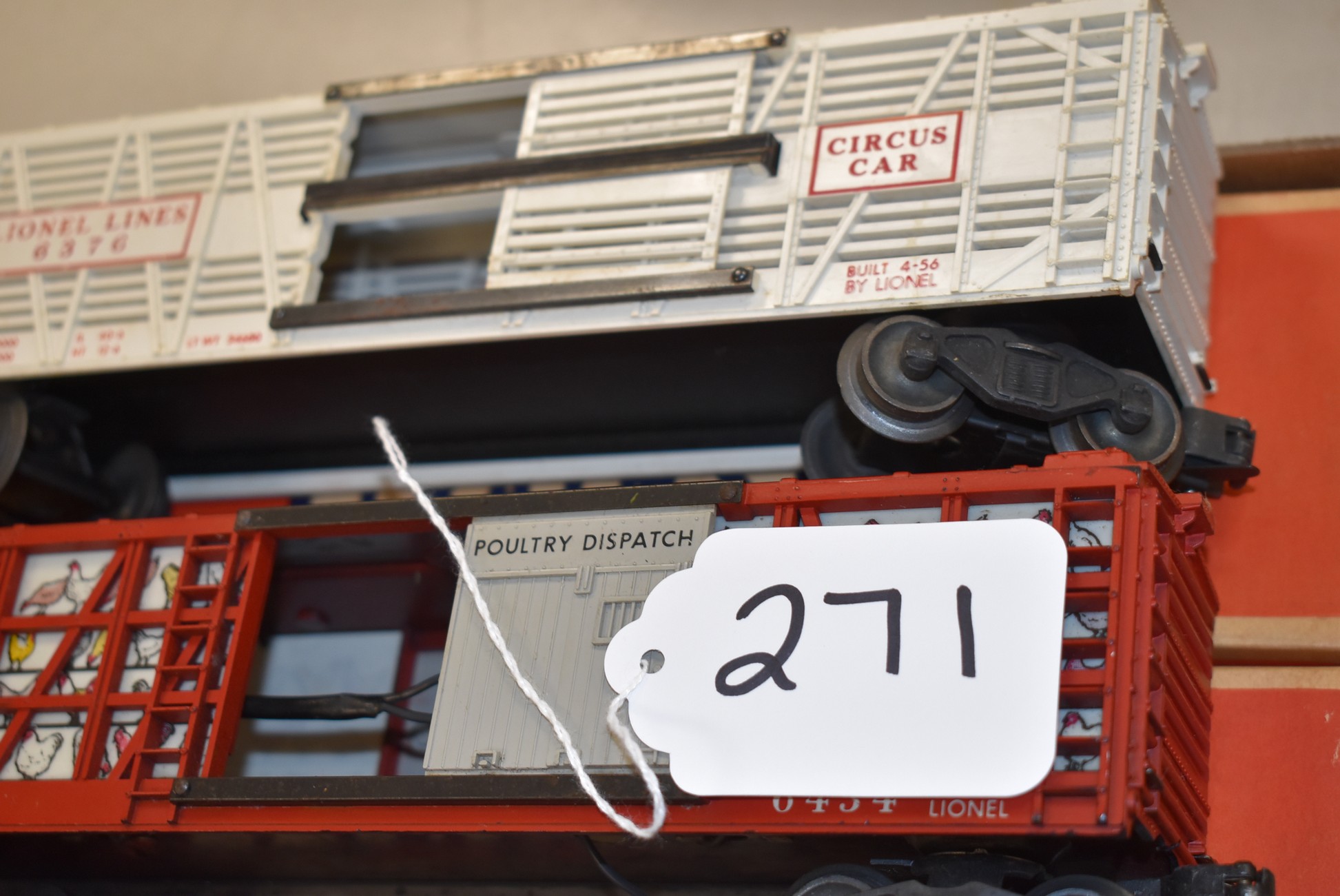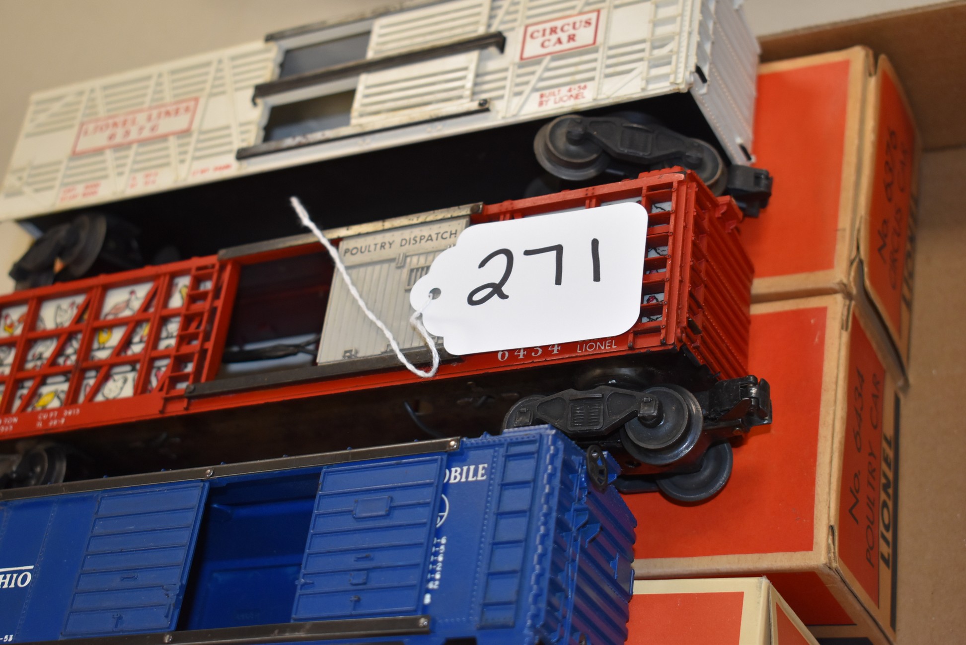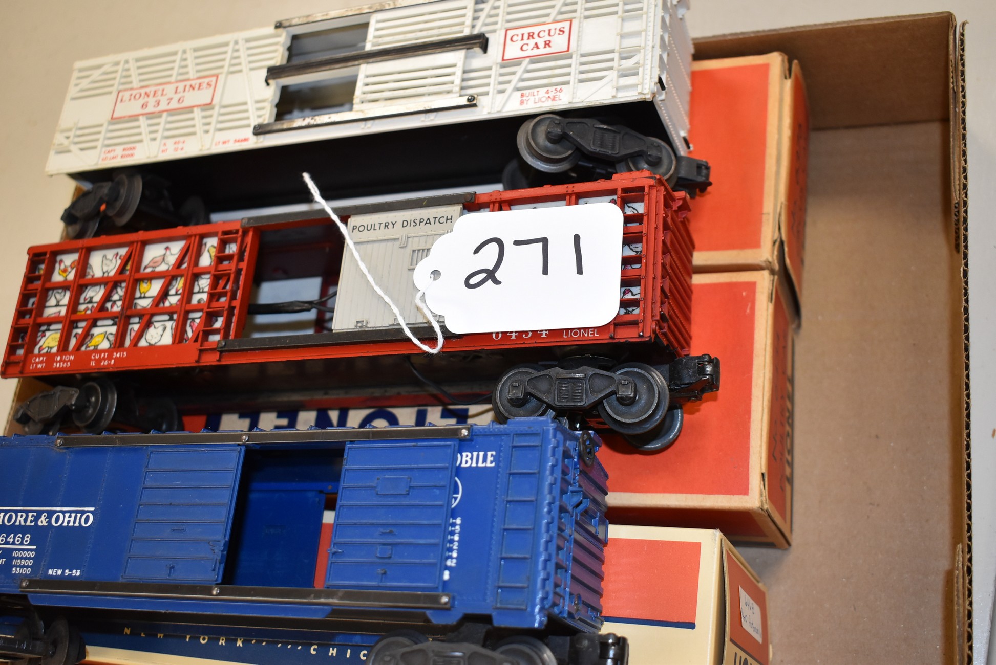 271.        Lot of 3 Lionel Train Cars – Including B&O Automobile 6468, Poultry Car No. 6434, and Circus Car No. 6376 – All w/Boxes