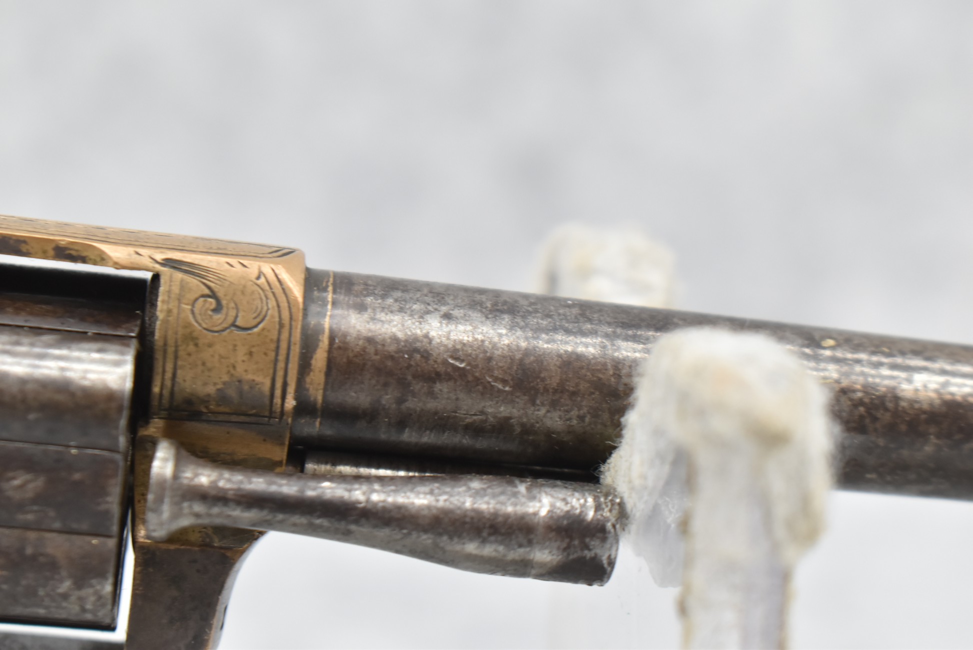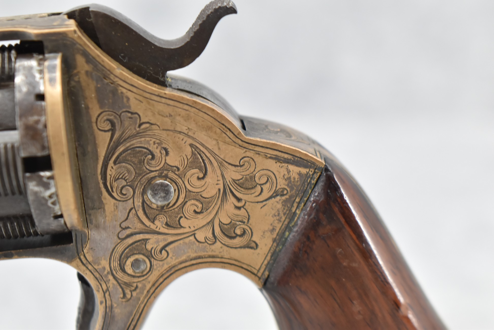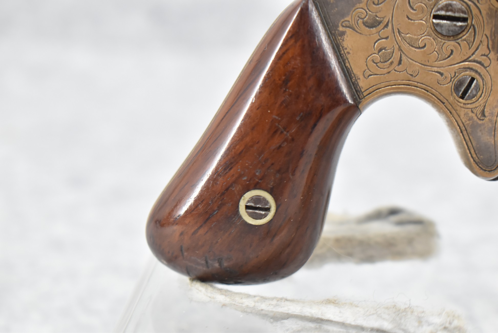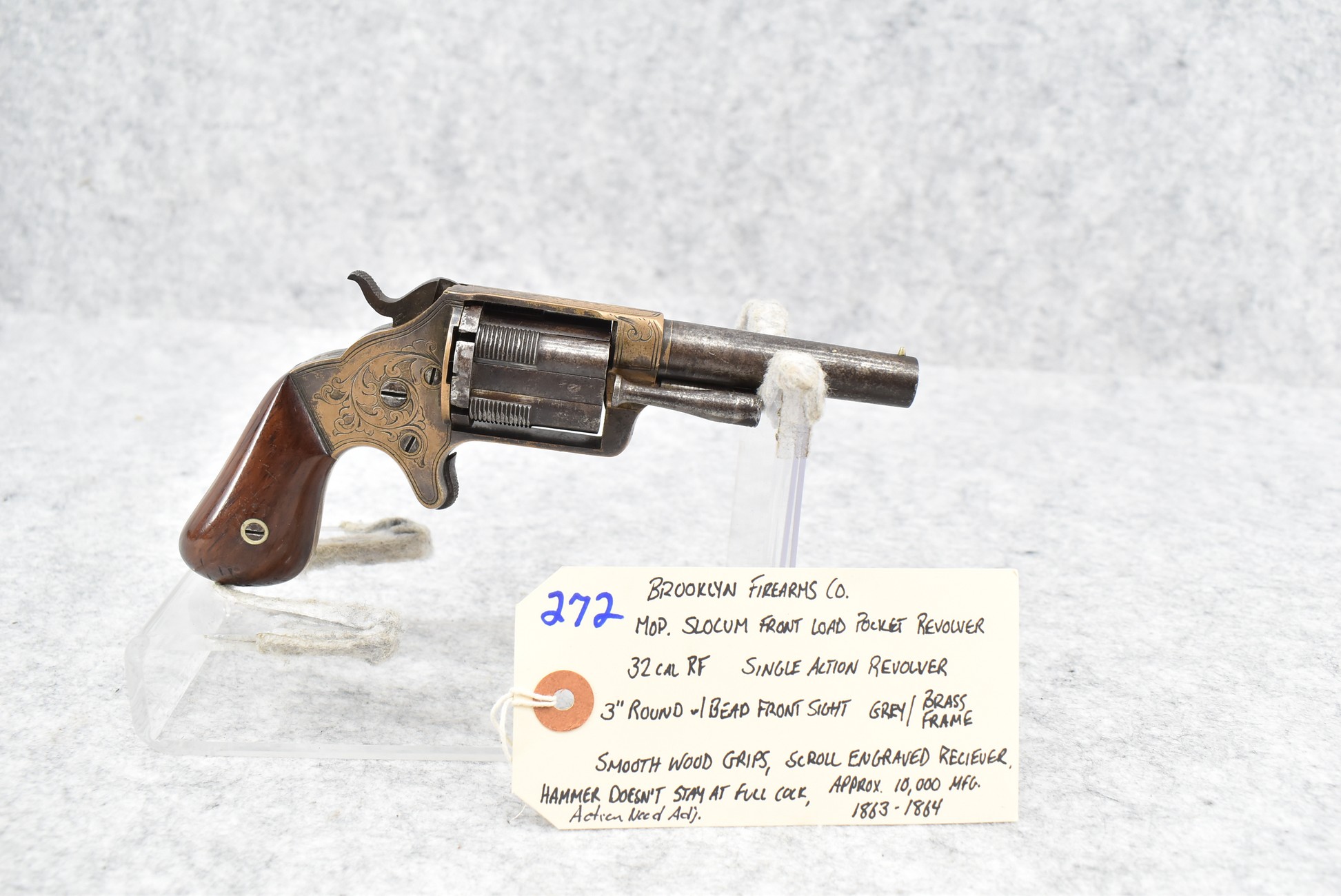 272. Brooklyn Firearms Co. – Mod. Slocum Front Load Pocket Revolver – 32 Cal. RF Single Action Revolver – w/3” Round Barrel w/Bead Front Sight – Gray Finish w/Brass Frame – w/Scroll Engraved Receiver – w/Smooth Wood Grips – Approx. 10,000 Mfg. Between 1863-1864 – Note: Hammer Doesn’t Stay at Full Cock, Action Needs Adjustment