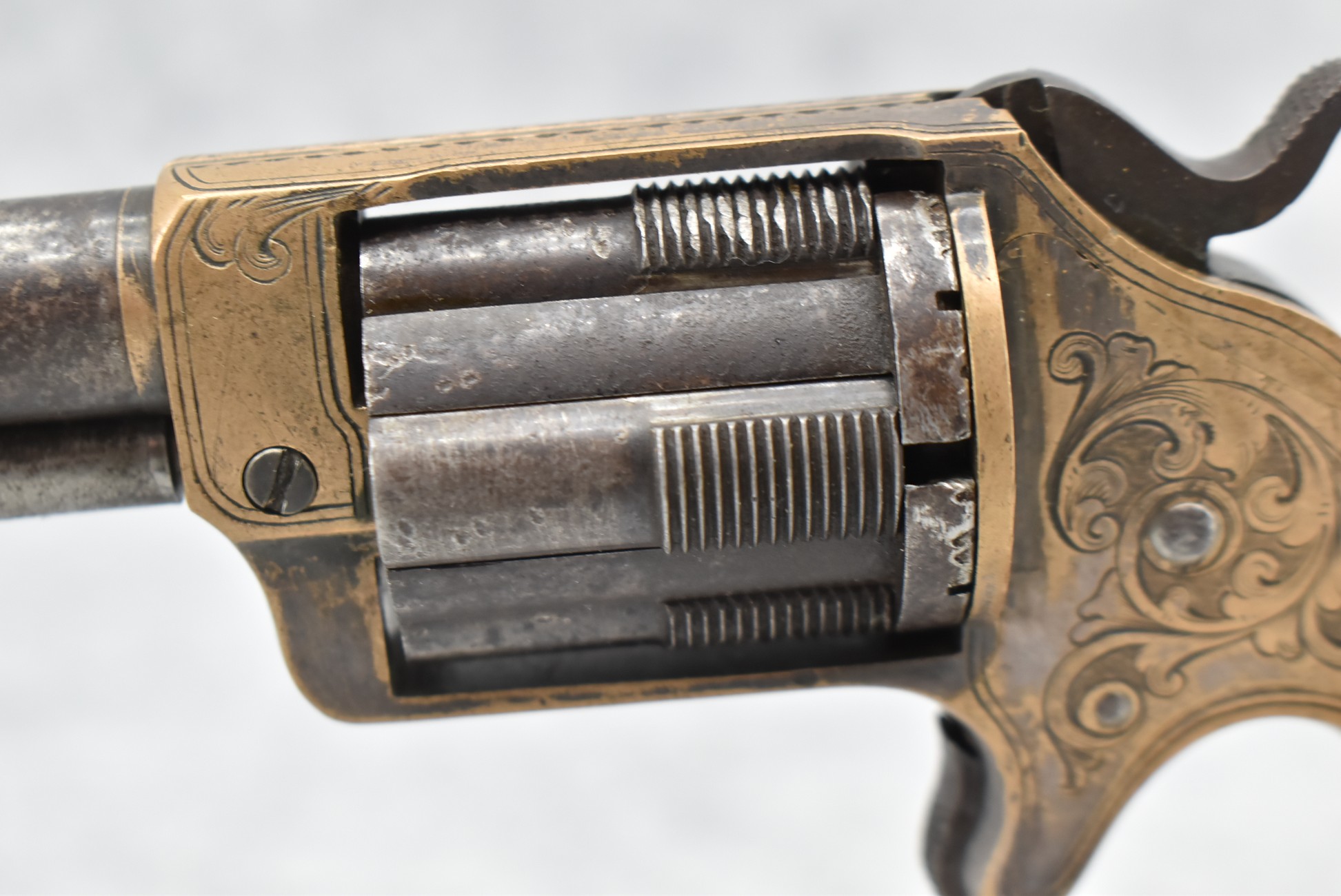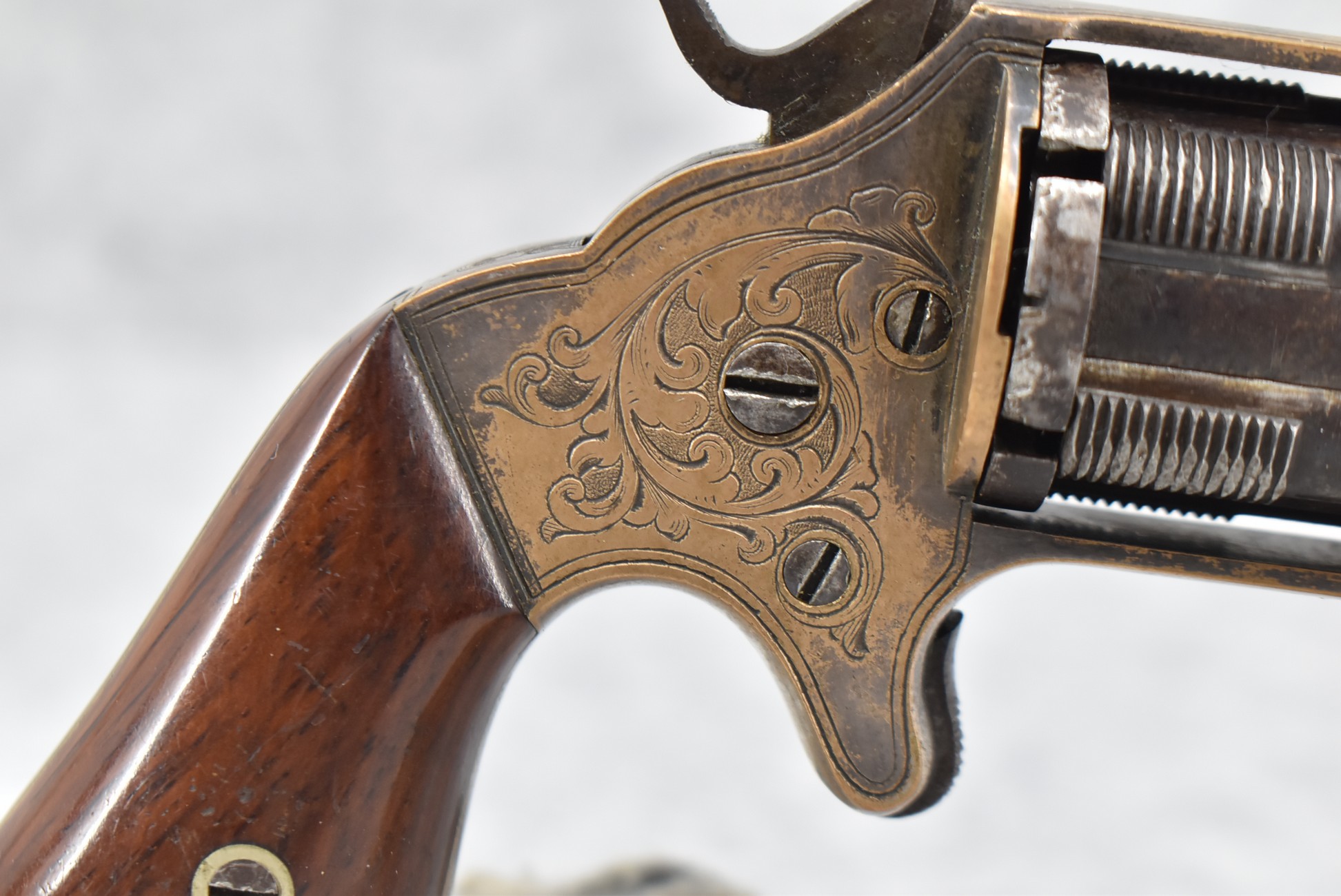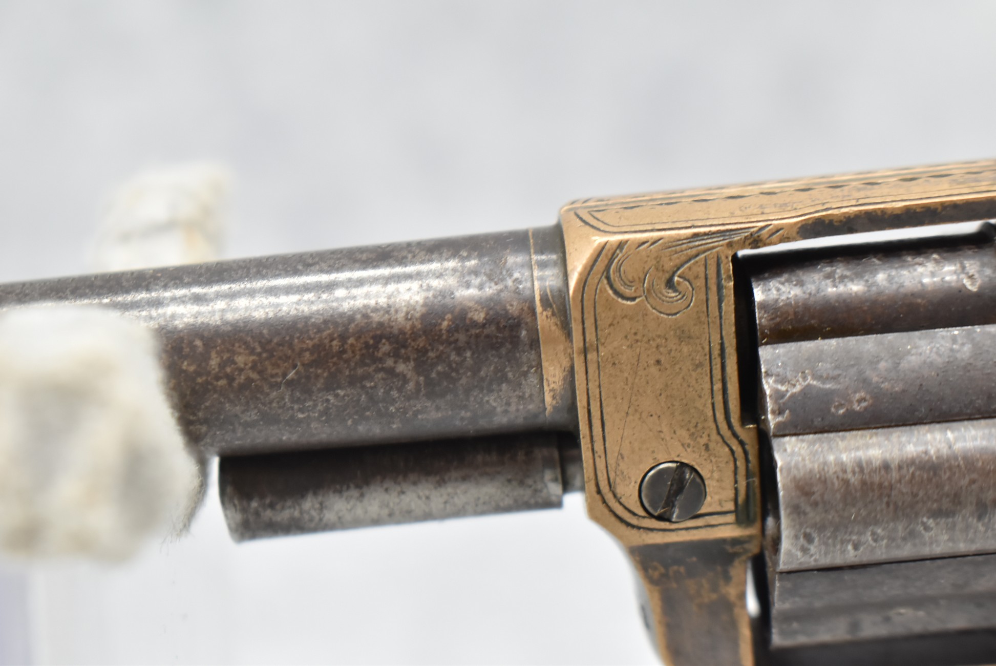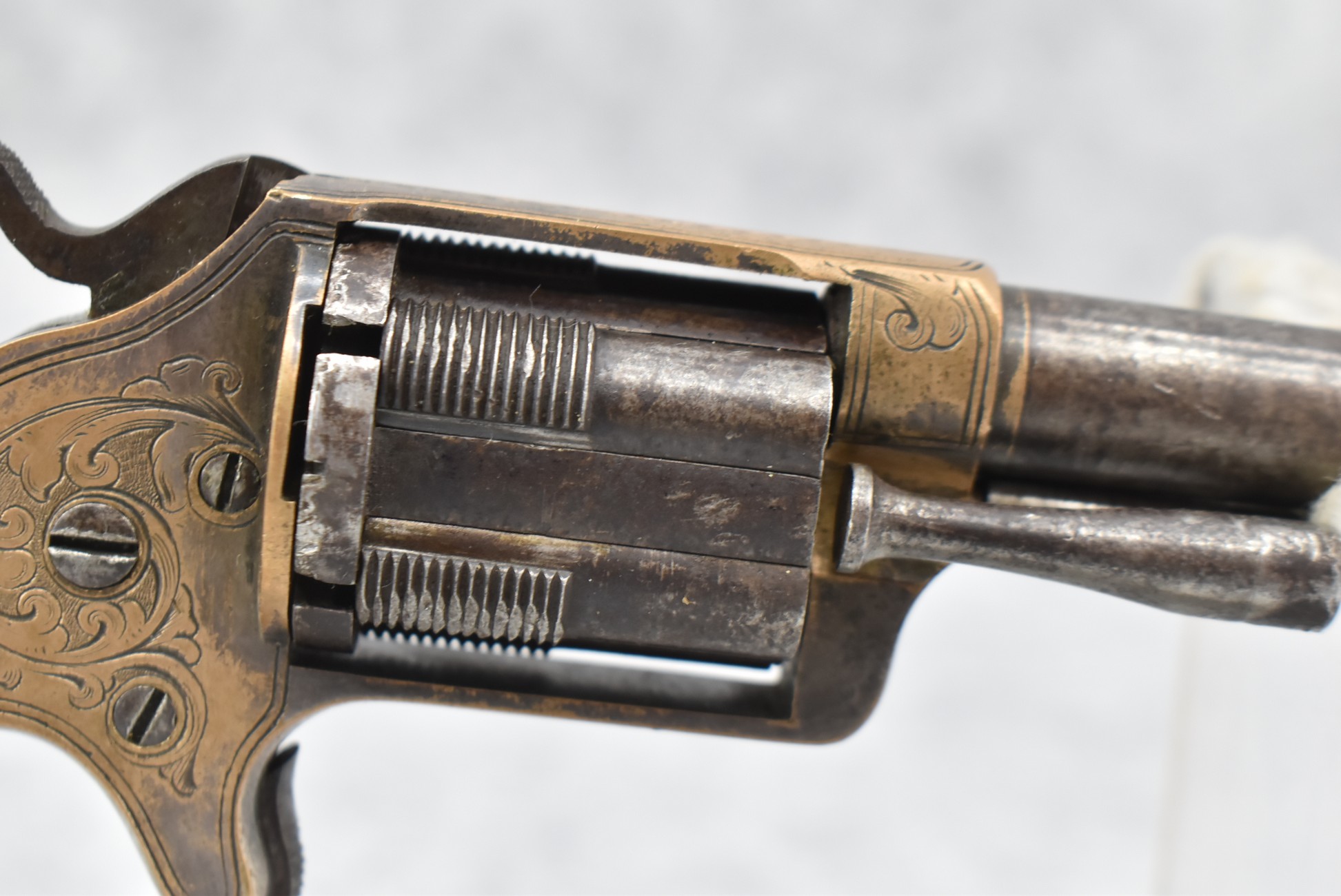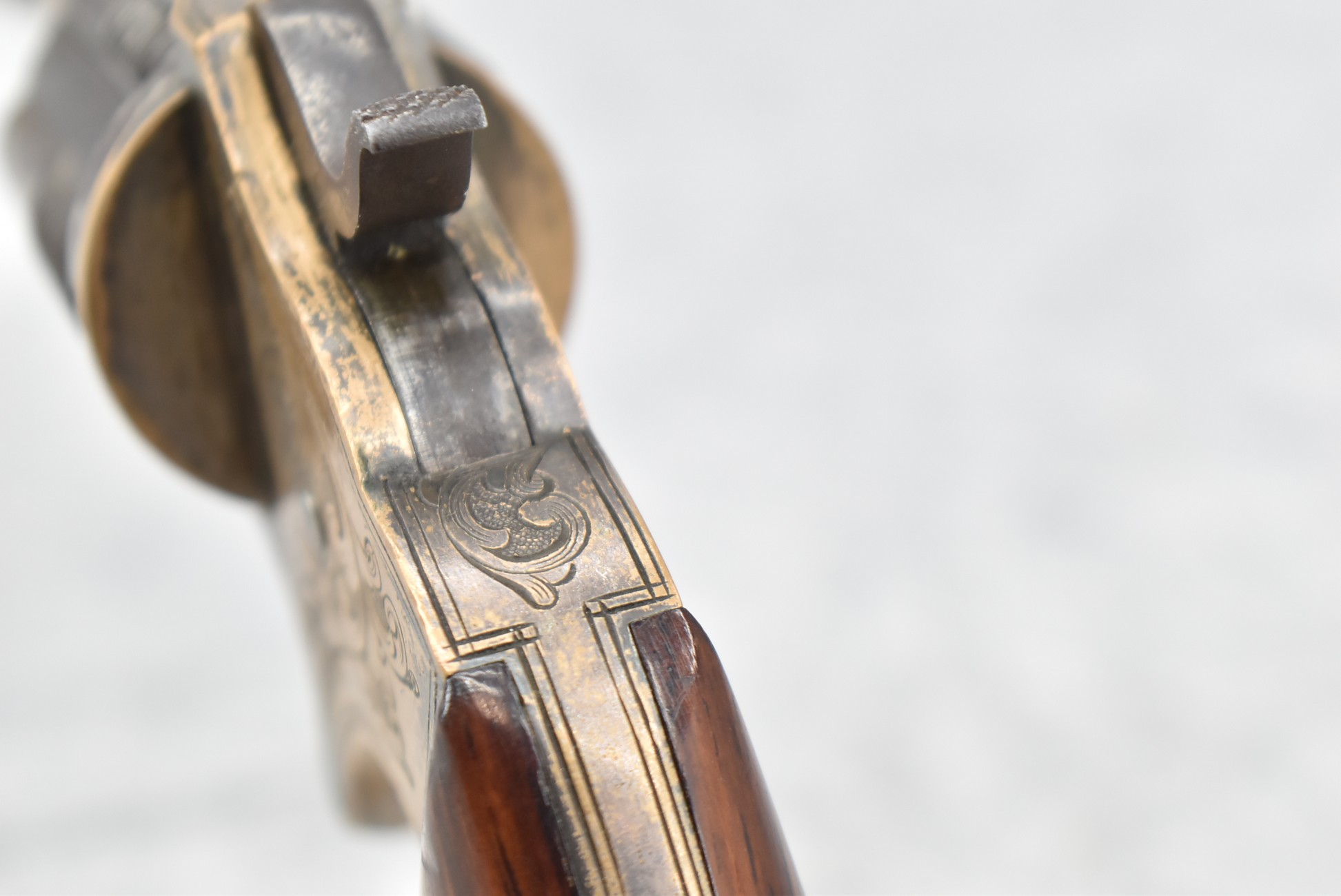 272. Brooklyn Firearms Co. – Mod. Slocum Front Load Pocket Revolver – 32 Cal. RF Single Action Revolver – w/3” Round Barrel w/Bead Front Sight – Gray Finish w/Brass Frame – w/Scroll Engraved Receiver – w/Smooth Wood Grips – Approx. 10,000 Mfg. Between 1863-1864 – Note: Hammer Doesn’t Stay at Full Cock, Action Needs Adjustment