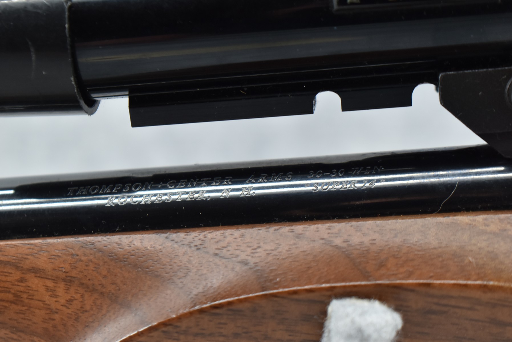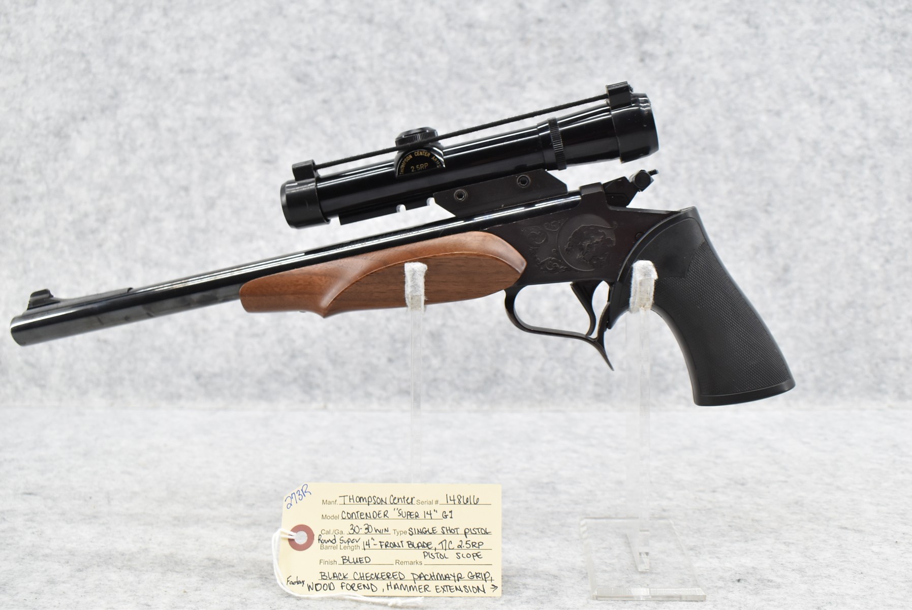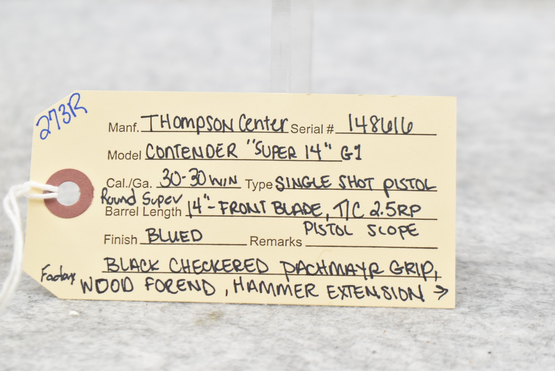 273R. Thompson Center – Mod. Contender “Super 14” (G1) – 30-30 Win. Cal. Single Shot Pistol – w/Round Super 14” Barrel w/Front Blade Sight – Blued Finish – w/Black Checkered Pachmayr Pistol Grip – w/Factory Wood Forend – w/Hammer Extension – w/Thompson Center 2.5RP Pistol Scope