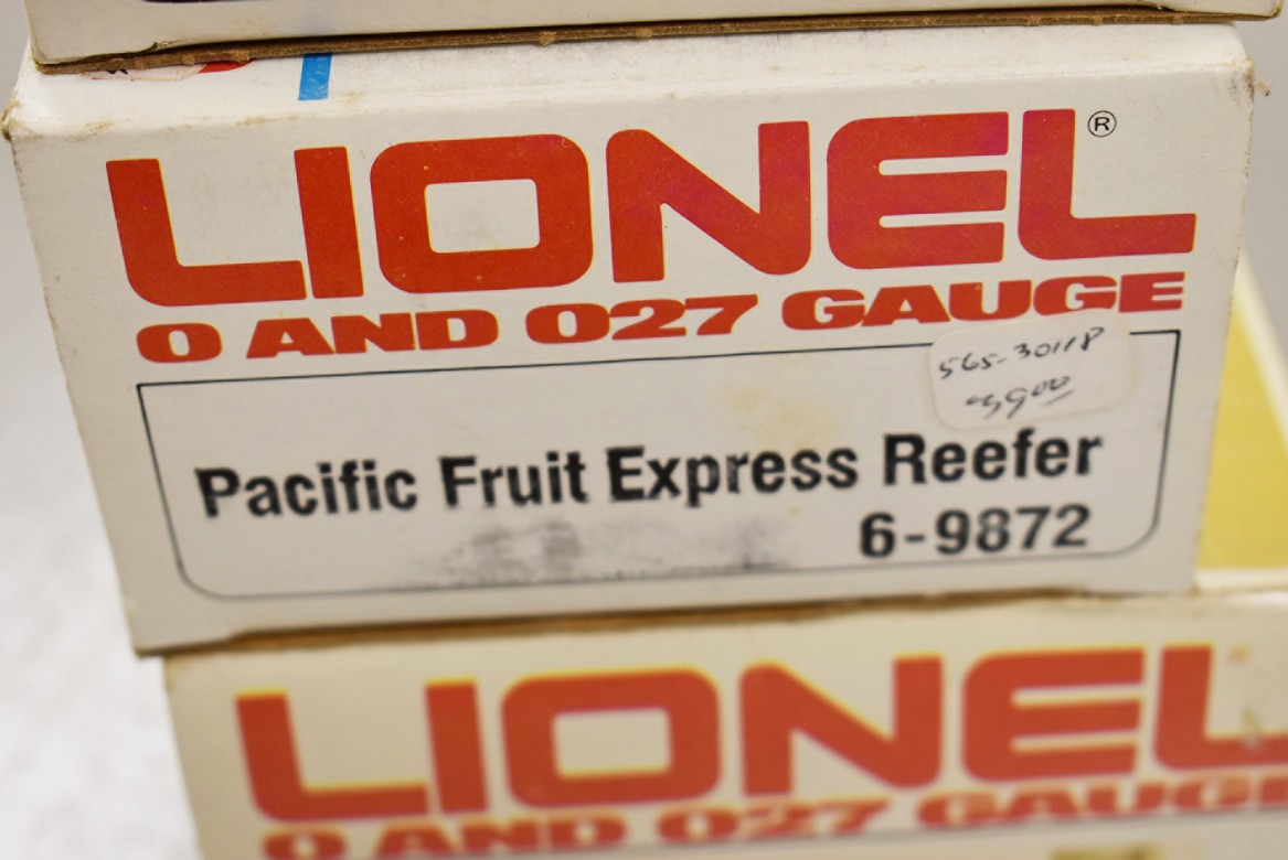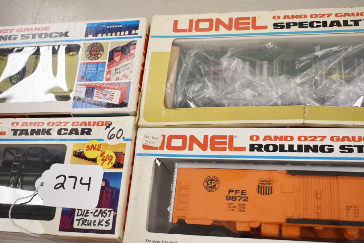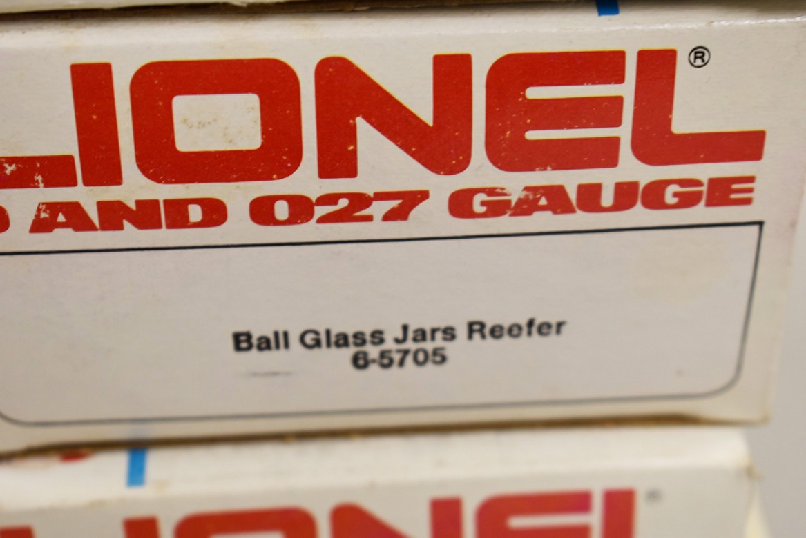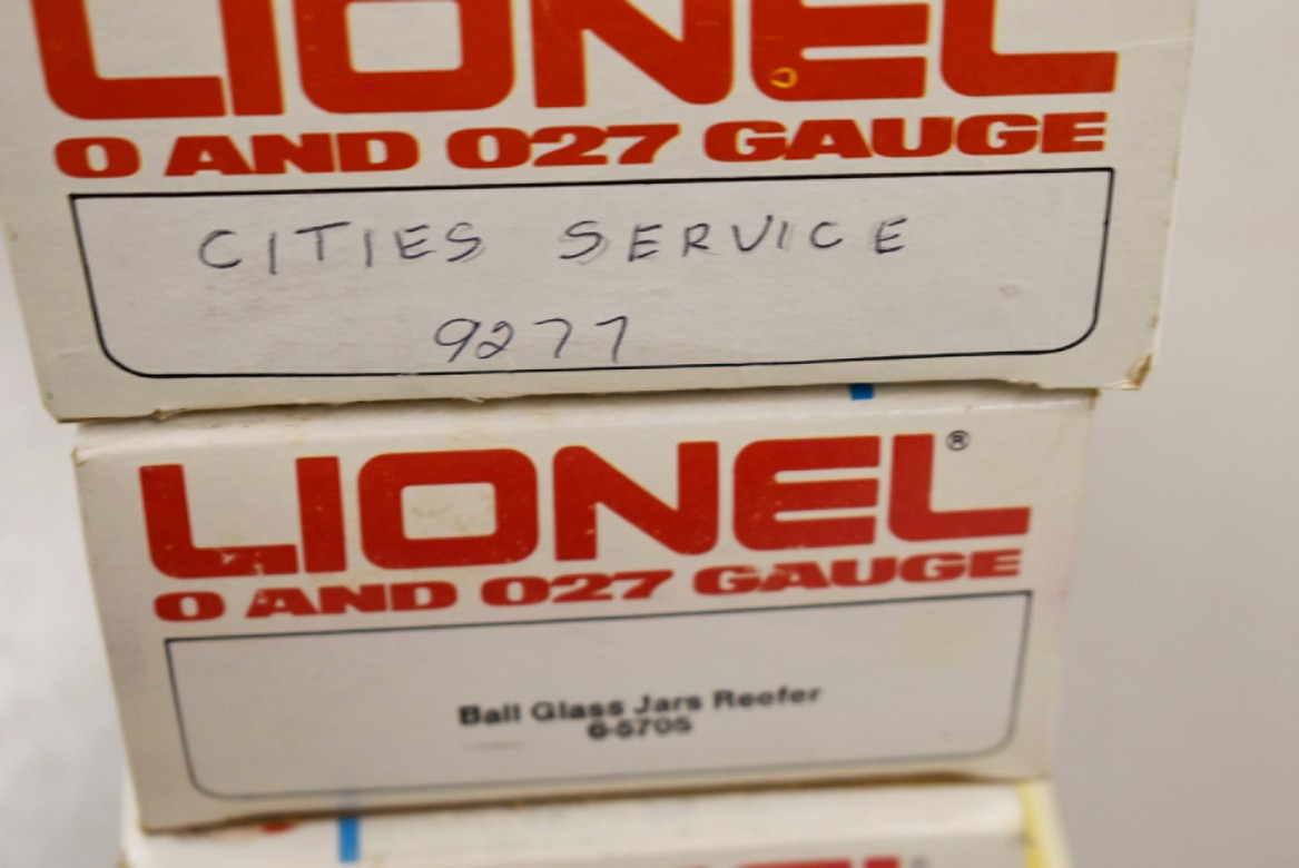 274. Lot of 4 Lionel Train Cars – Including Cities Service 9277, Ball Glass Jars Reefer 6-5705, Pacific Fruit Express Reefer 6-9872, and Aquarium Car 6-9308 – All w/Boxes