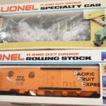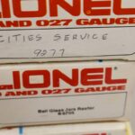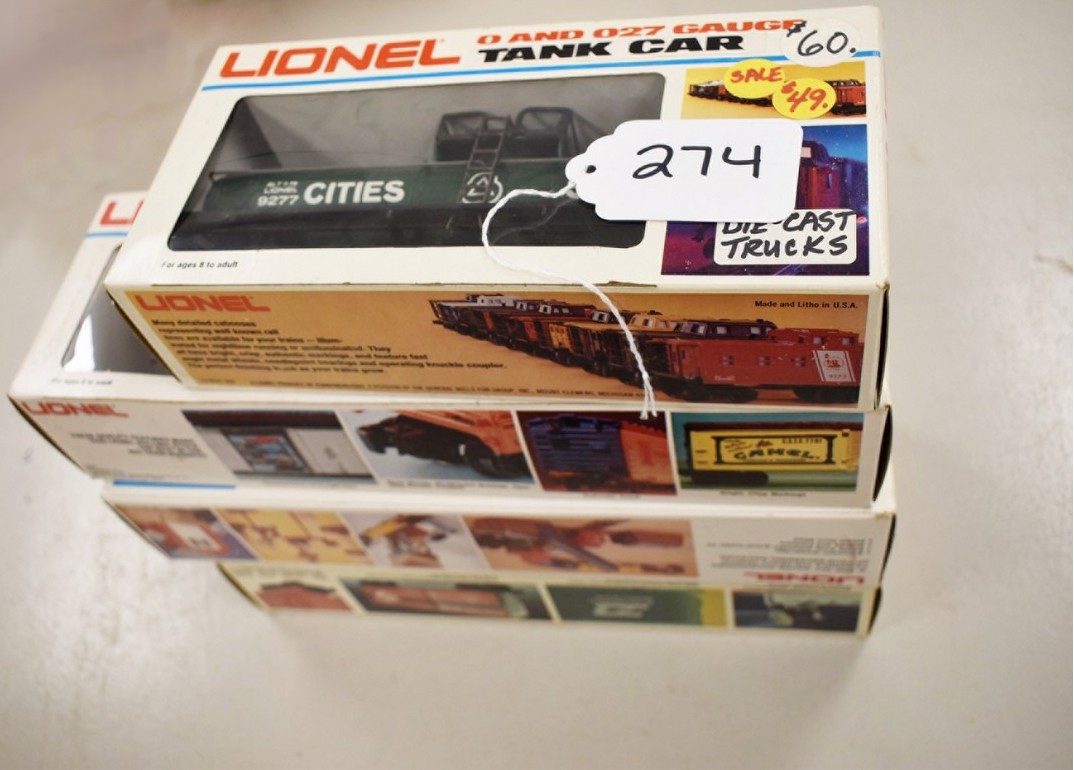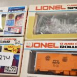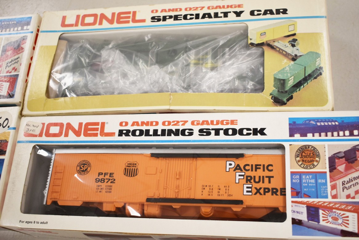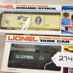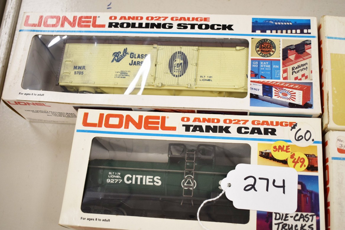 274. Lot of 4 Lionel Train Cars – Including Cities Service 9277, Ball Glass Jars Reefer 6-5705, Pacific Fruit Express Reefer 6-9872, and Aquarium Car 6-9308 – All w/Boxes