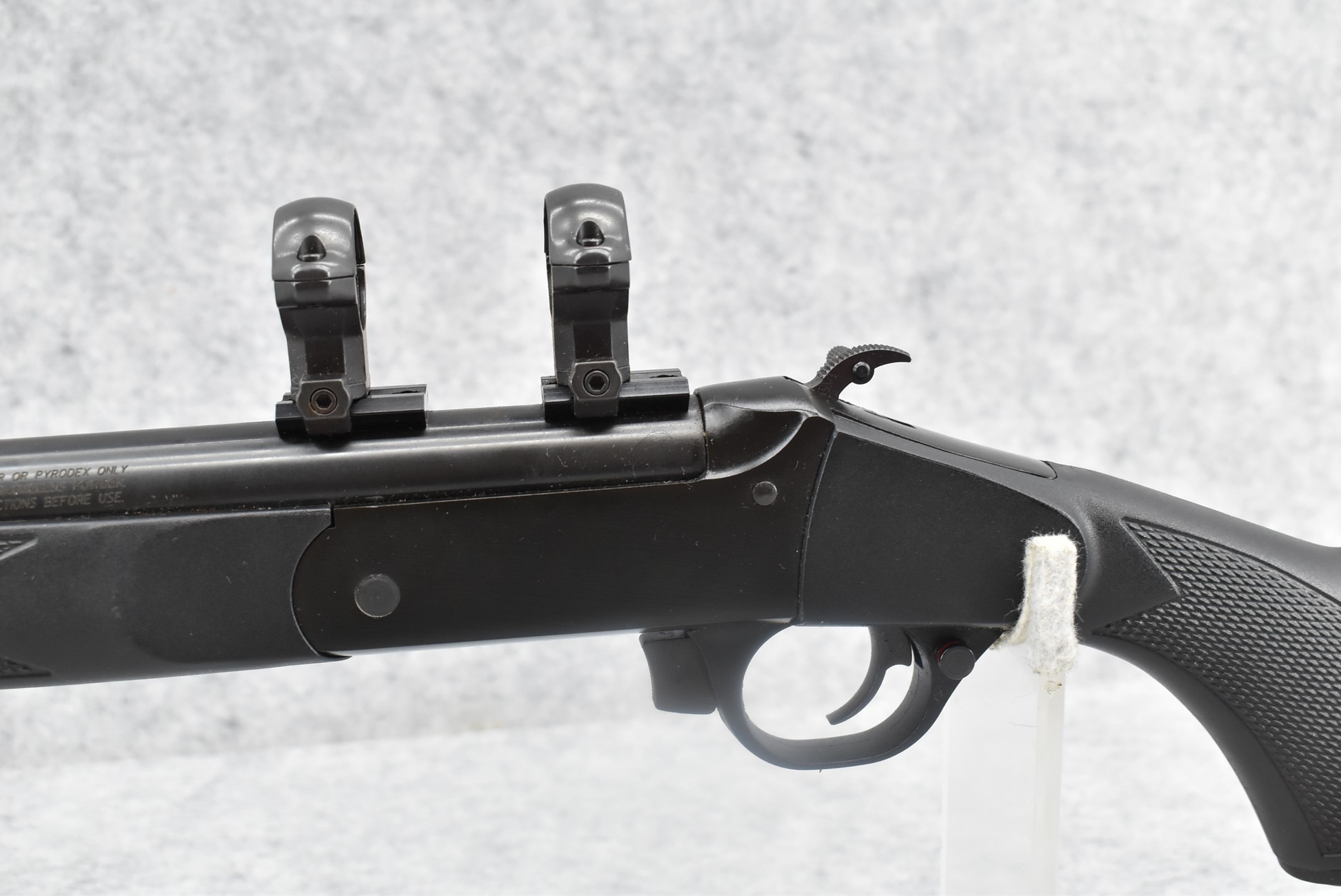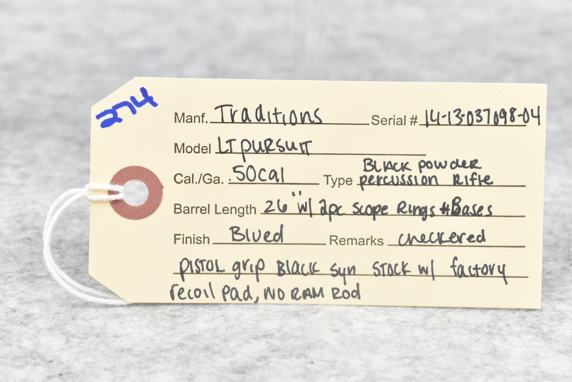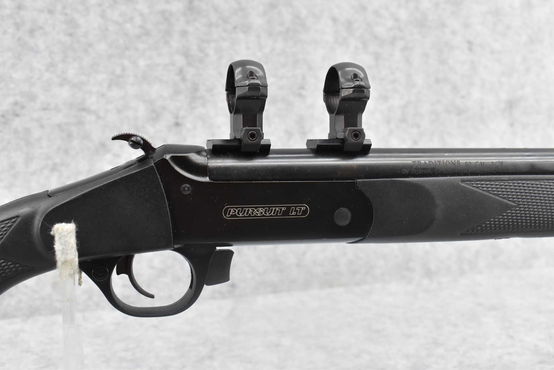274. Traditions – Mod. LT Pursuit – 50 Cal. Black Powder Inline Rifle – w/26” Barrel – Blued Finish – w/Checkered Pistol Grip Black Synthetic Stock w/Factory Recoil Pad – No Ram Rod – w/2pc. Scope Rings & Bases