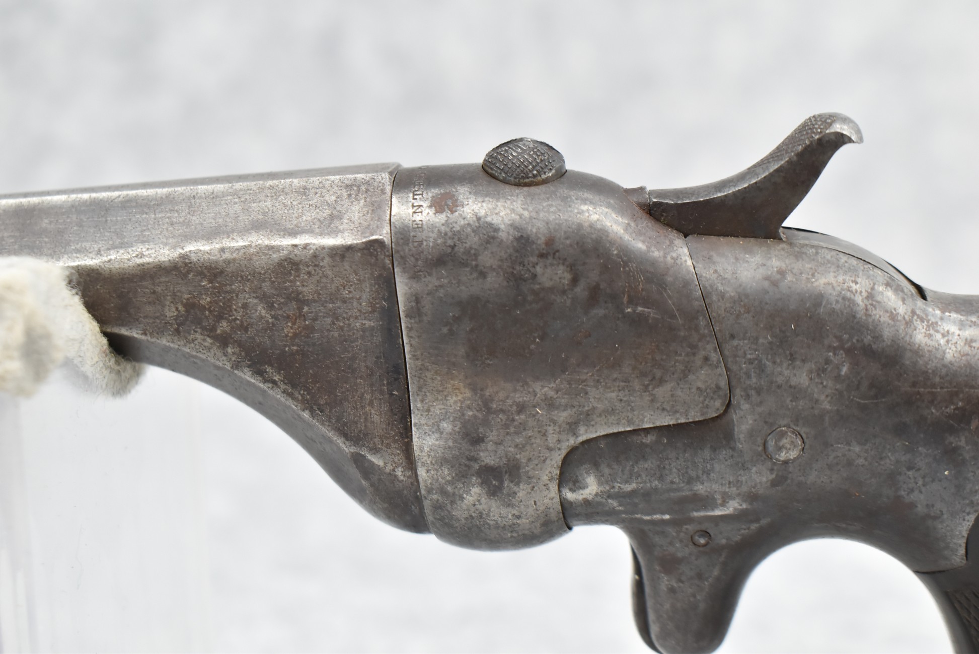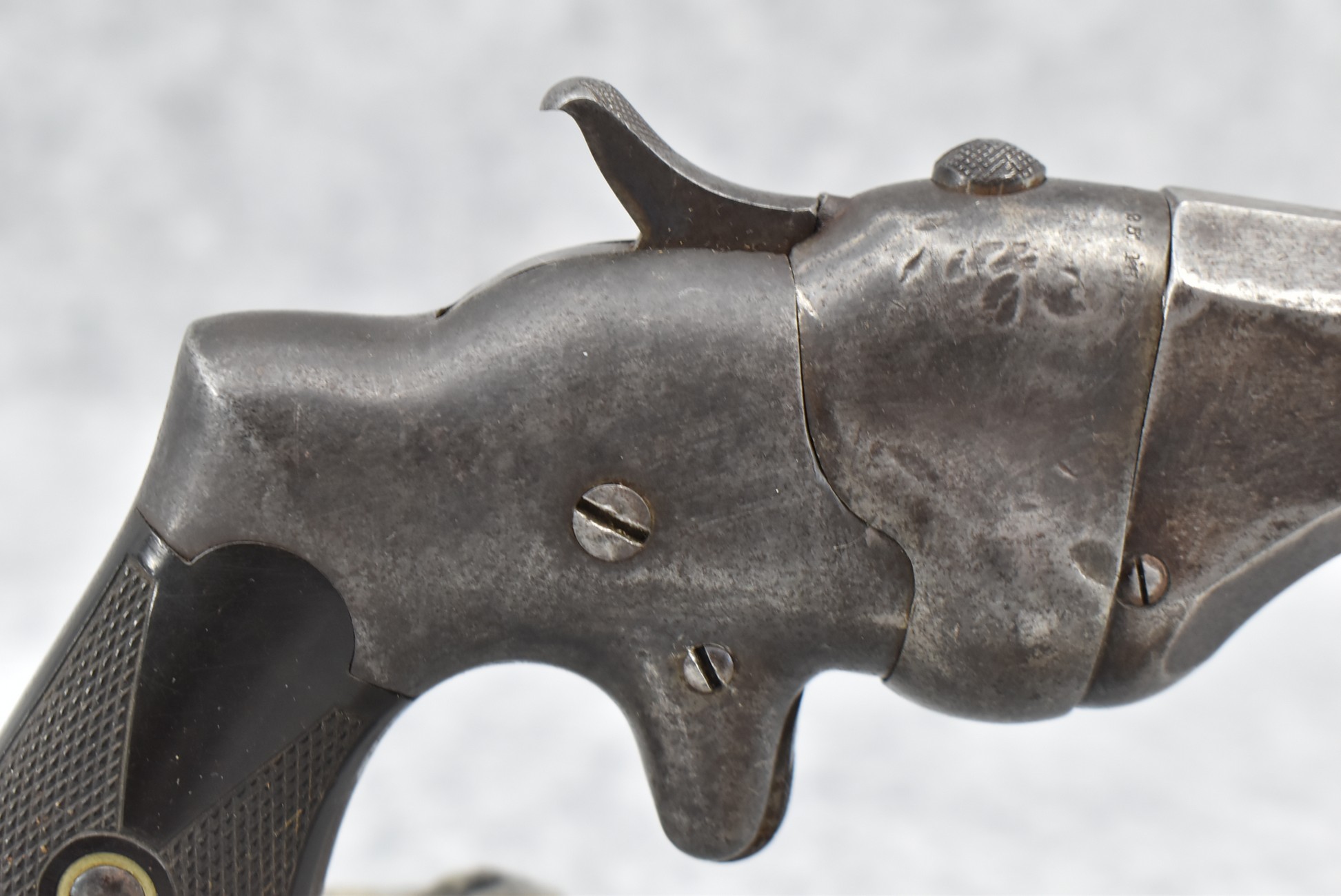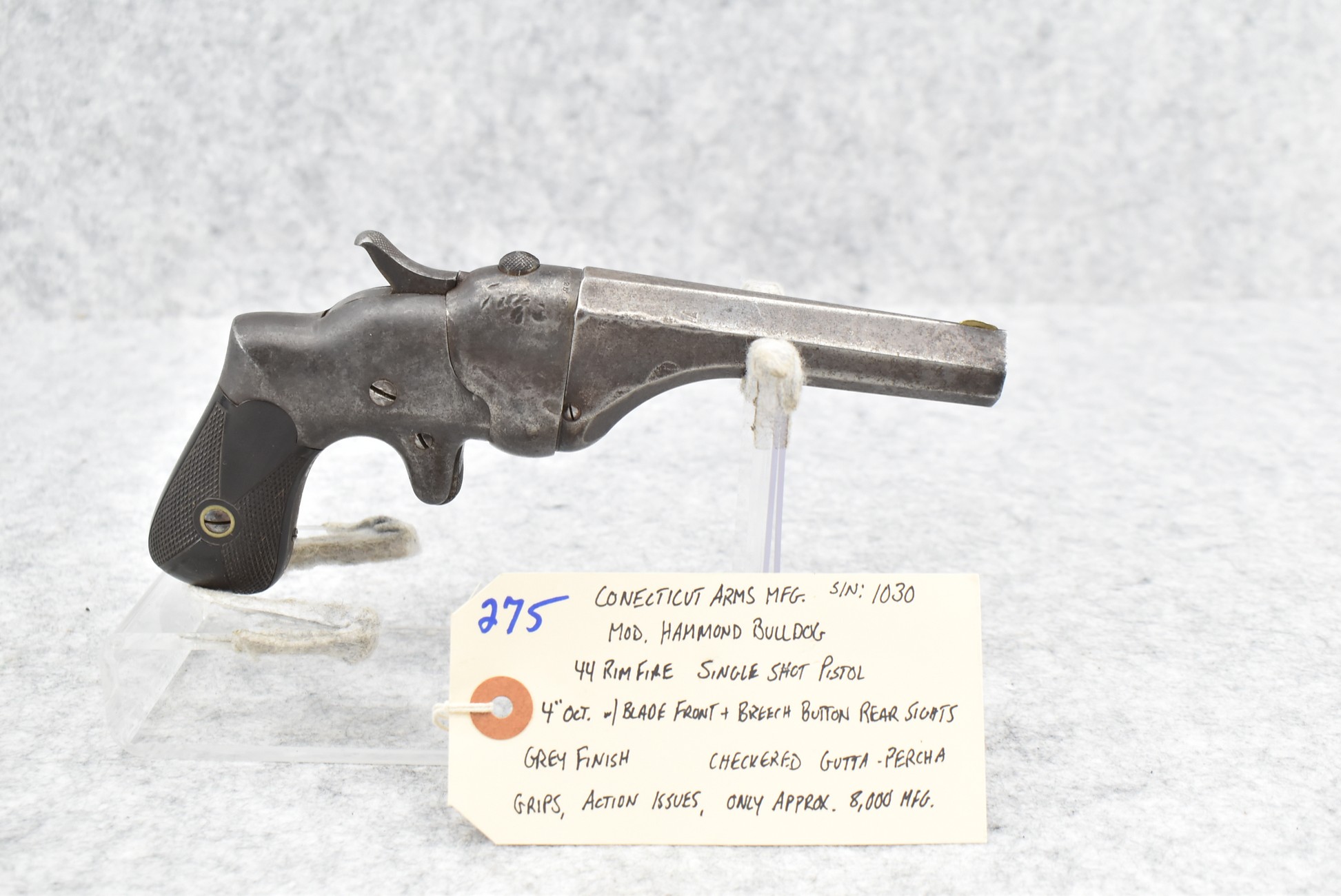 275. Connecticut Arms Mfg. – Mod. Hammond Bull Dog – 44 Cal. RF Single Shot Pistol – w/4” Octagon Barrel w/Blade Front & Rear Sights – Gray Finish – w/Checkered Gutta Percha Grips – Only Approx. 8,000 Mfg. – Note: Action Issues