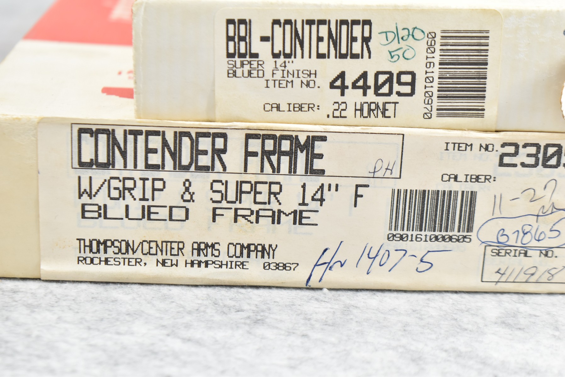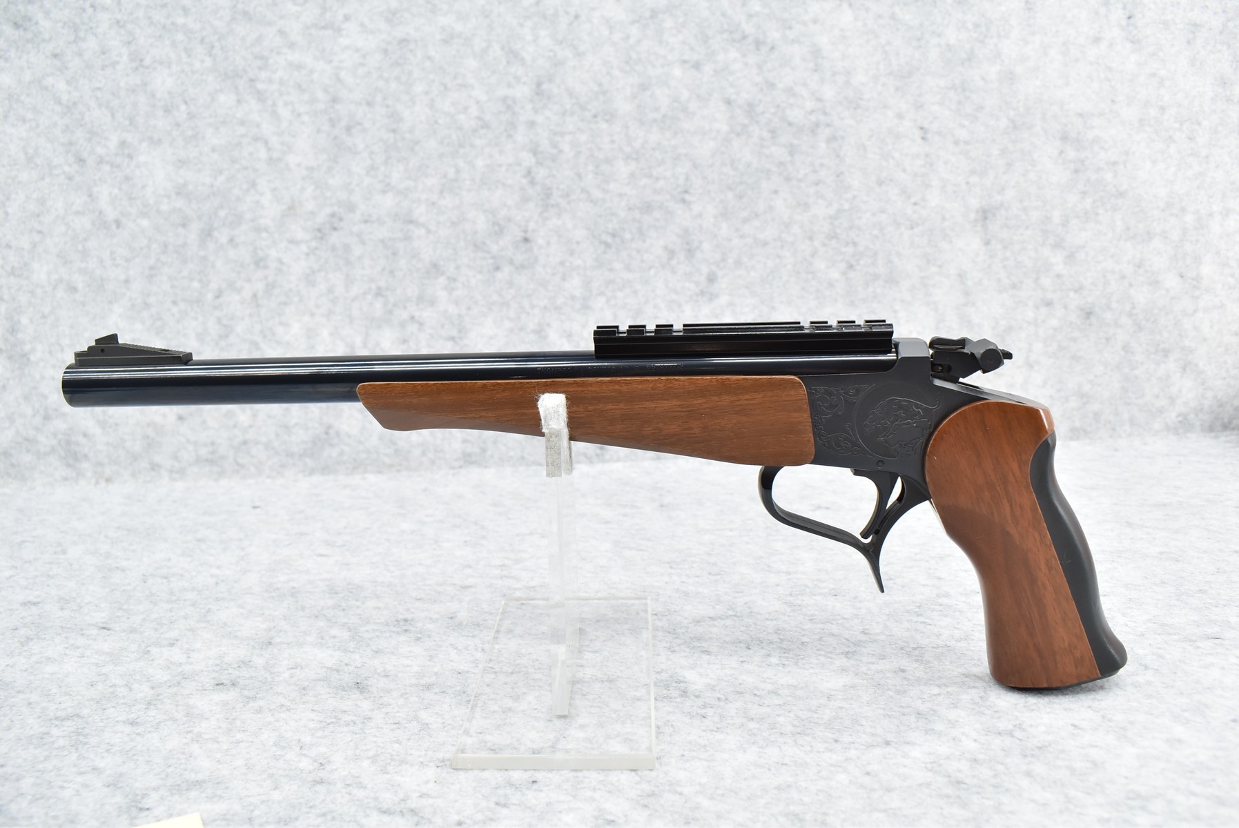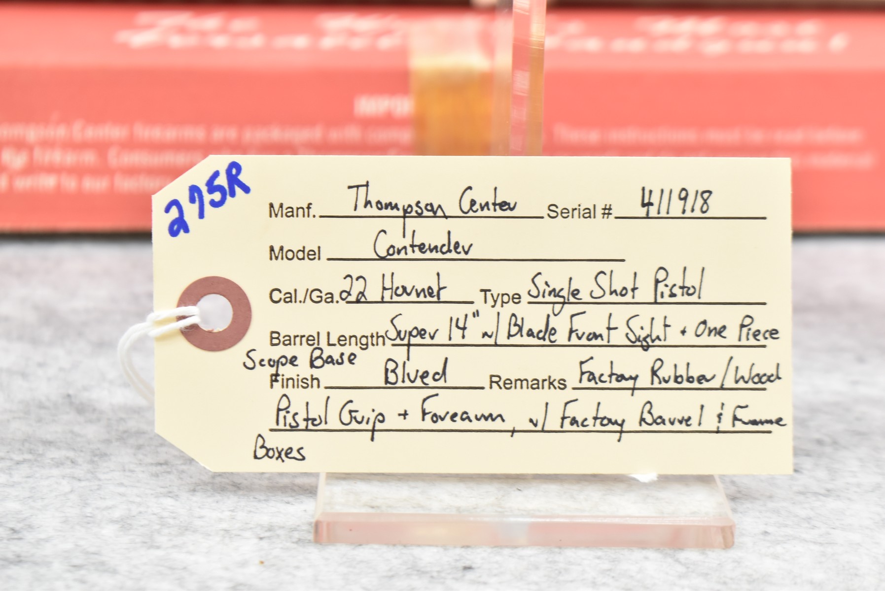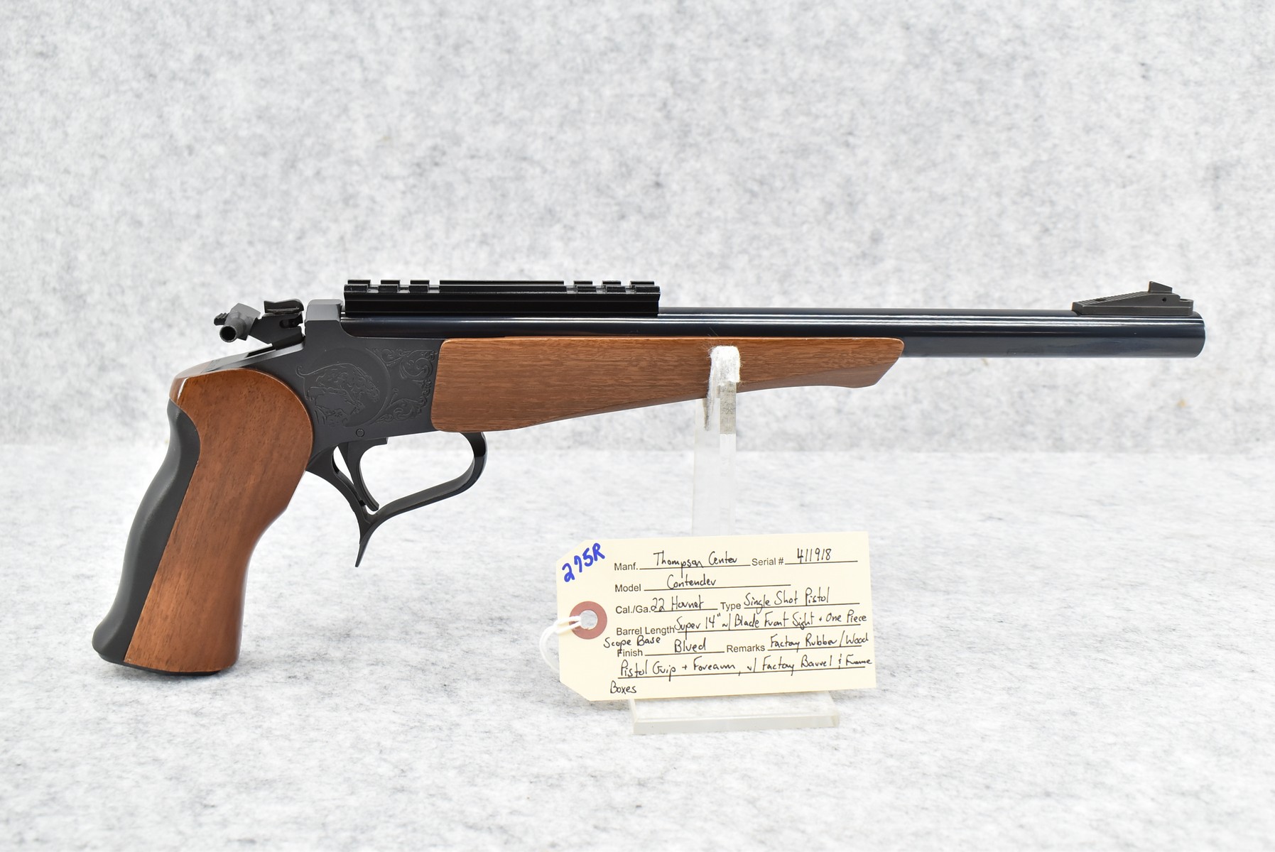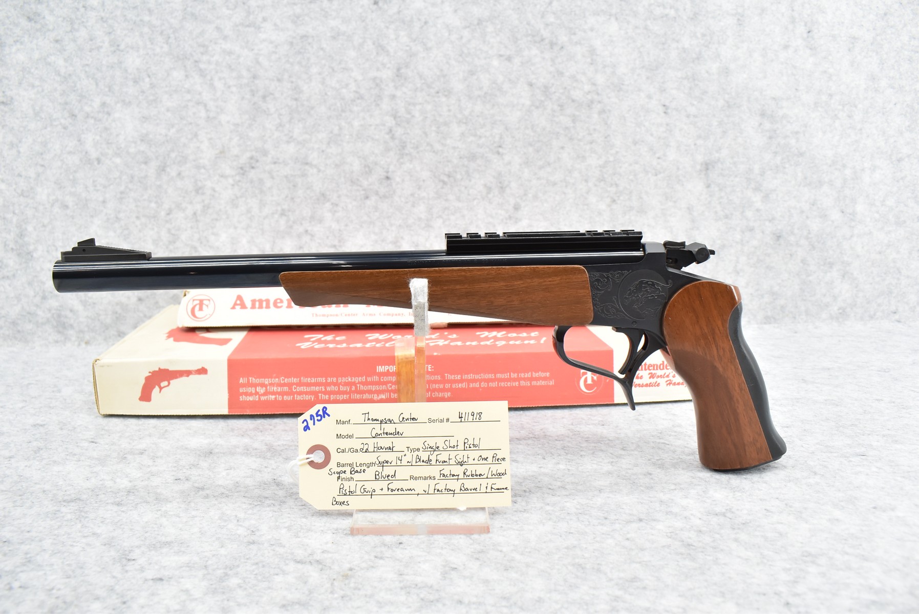 275R. Thompson Center – Mod. Contender – 22 Hornet Cal. Single Shot Pistol – w/Super 14” Barrel w/Blade Front Sight – Blued Finish – w/Factory Rubber/Wood Pistol Grip & Forearm – w/1pc. Scope Base – w/Factory Barrel & Frame Boxes