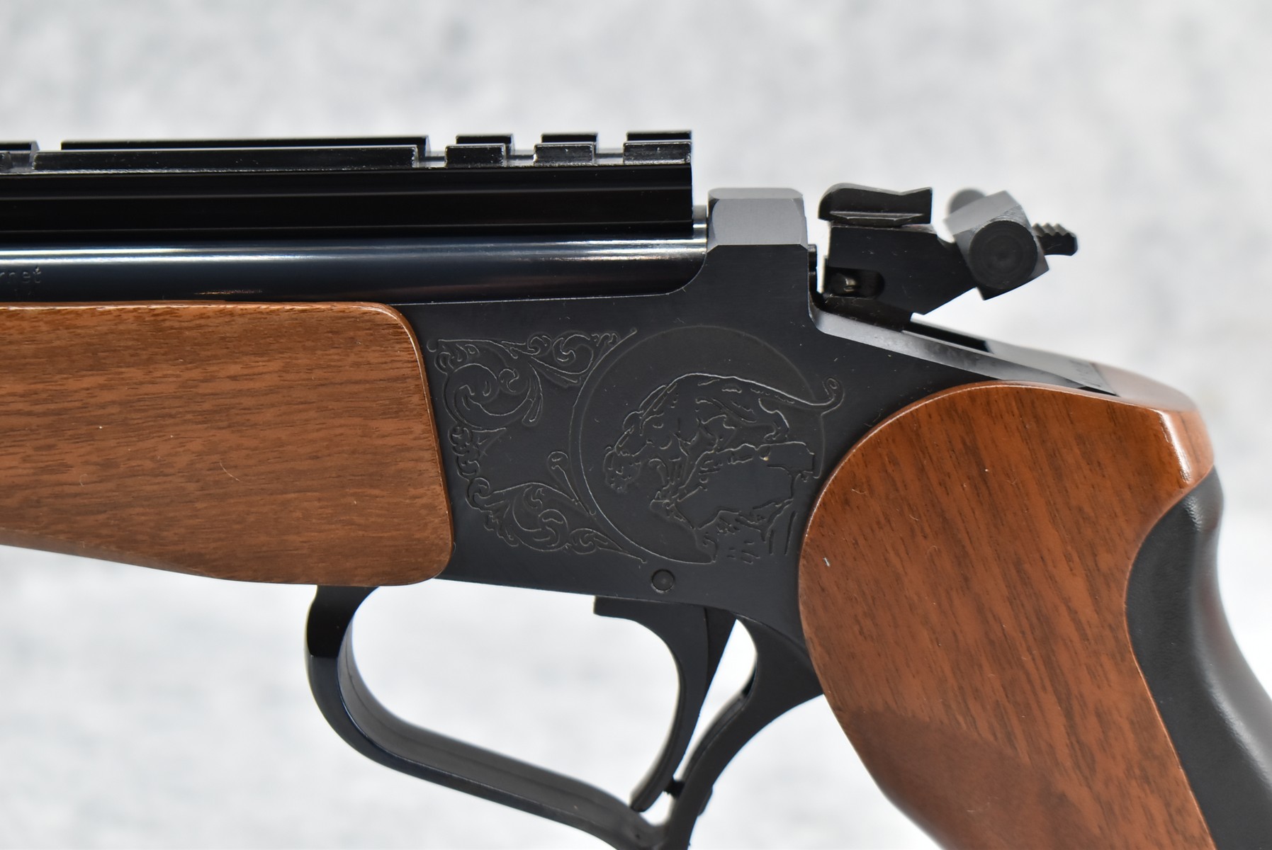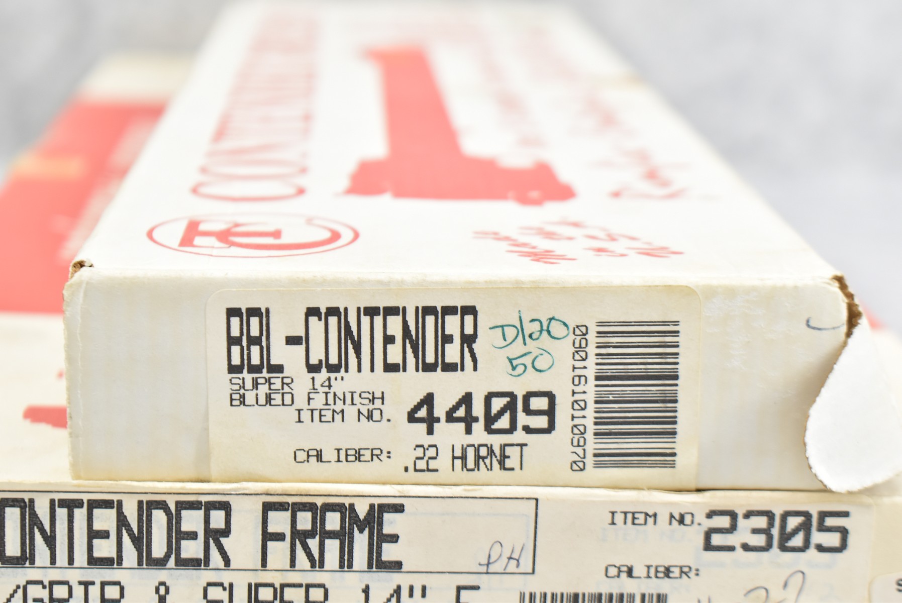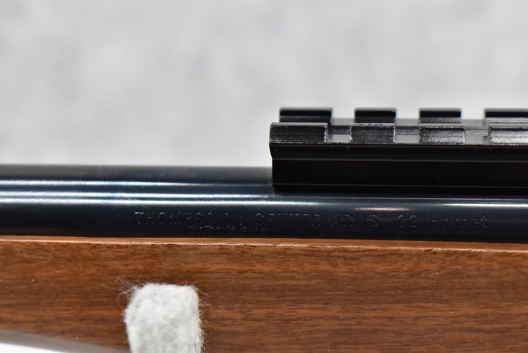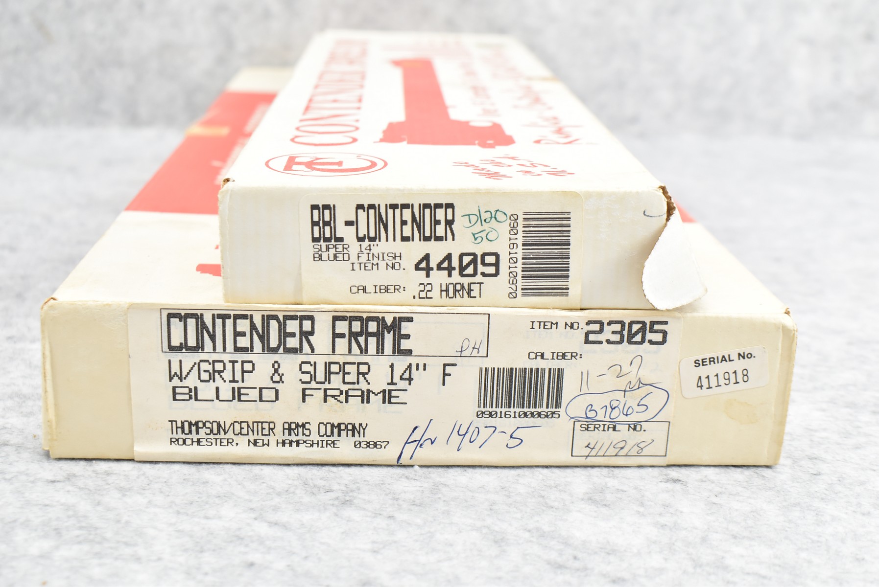 275R. Thompson Center – Mod. Contender – 22 Hornet Cal. Single Shot Pistol – w/Super 14” Barrel w/Blade Front Sight – Blued Finish – w/Factory Rubber/Wood Pistol Grip & Forearm – w/1pc. Scope Base – w/Factory Barrel & Frame Boxes