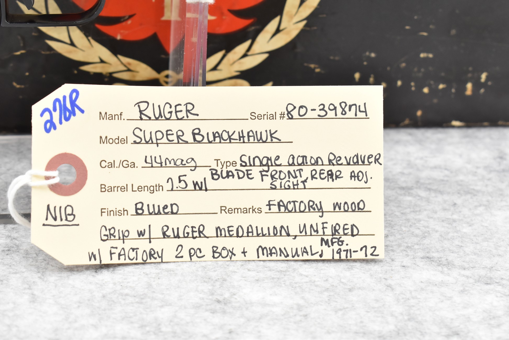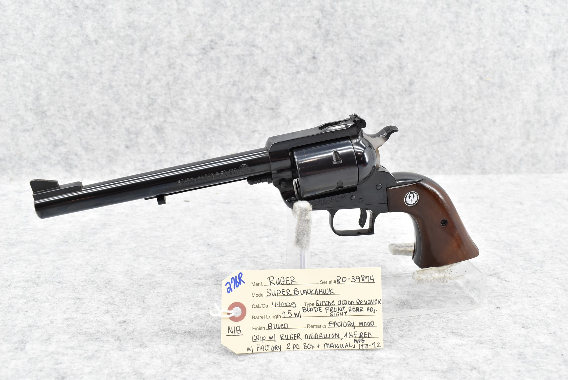 276R. Ruger – Mod. Super Blackhawk – 44 Mag. Cal. Single Action Revolver – w/7.5” Barrel w/Blade Front & Rear Adj. Sights – Blued Finish – w/Factory Wood Grip w/Ruger Medallion – New w/Factory 2pc. Box & Manual – Mfg. Between 1971-72