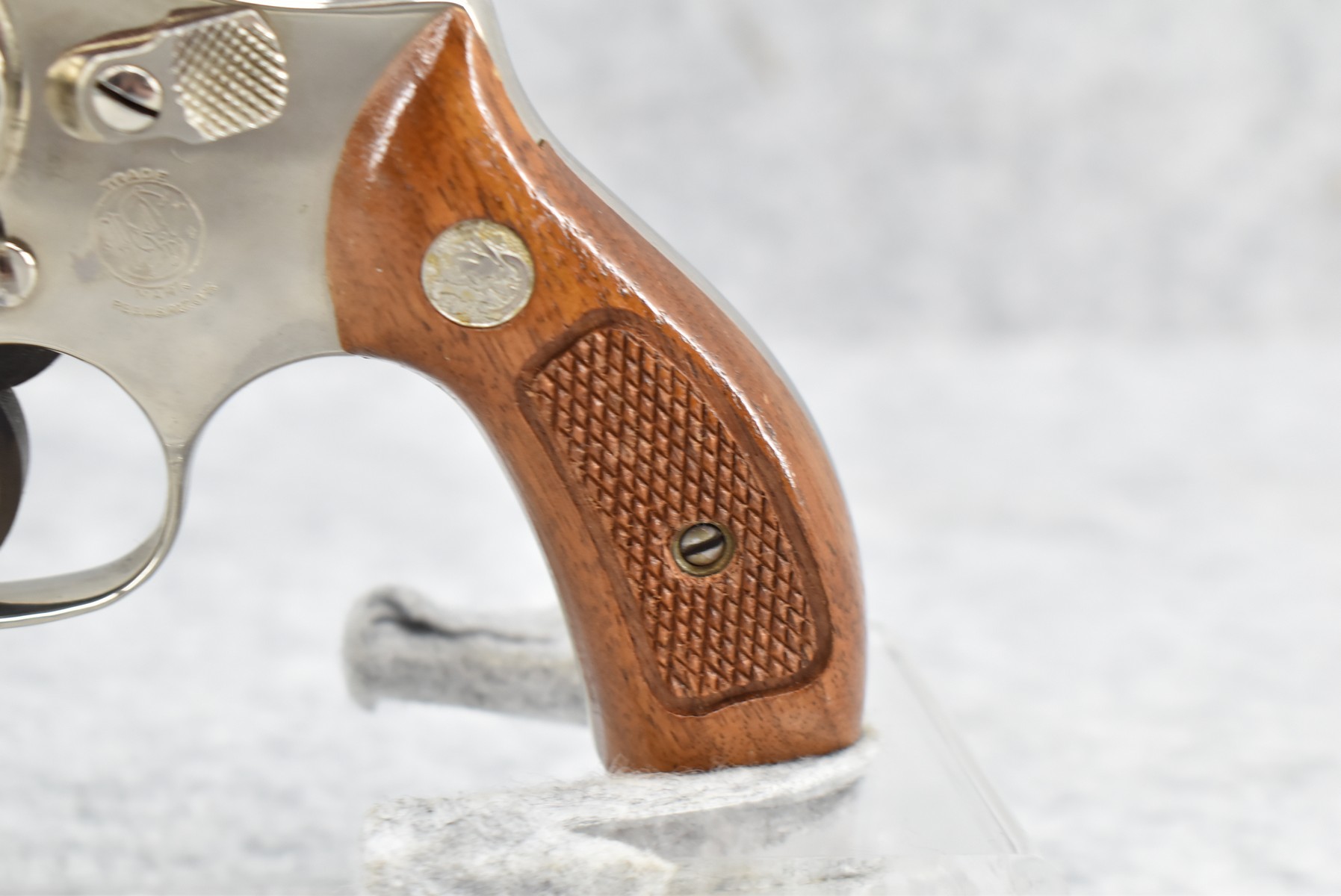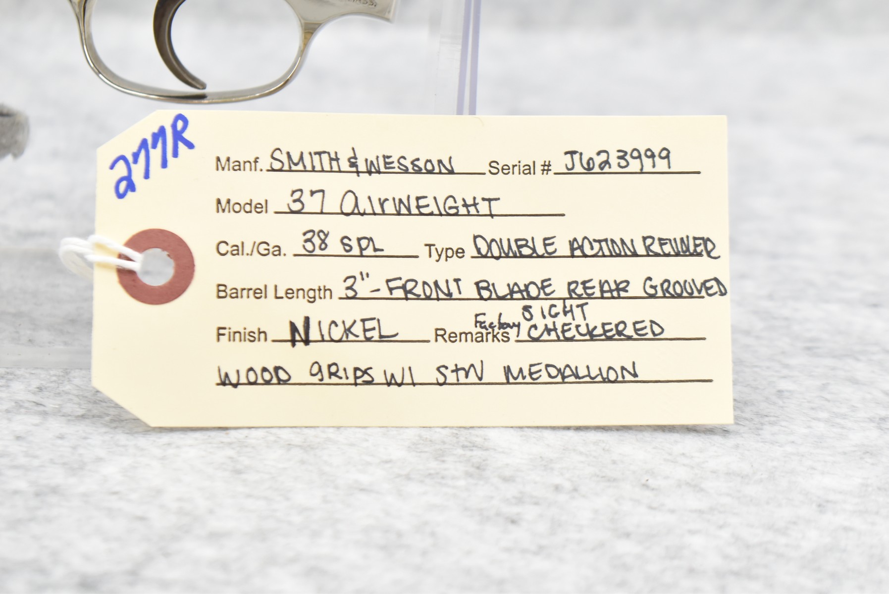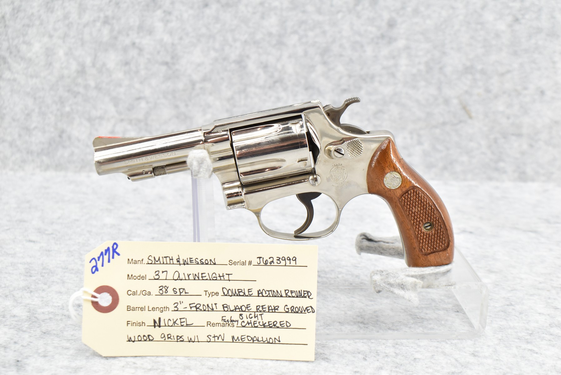 277R. Smith & Wesson – Mod. 37 Airweight – 38 Spl. Cal. Double Action Revolver – w/3” Barrel w/Front Blade & Rear Grooved Sights – Nickel Finish – w/Factory Checkered Grips w/S&W Medallion