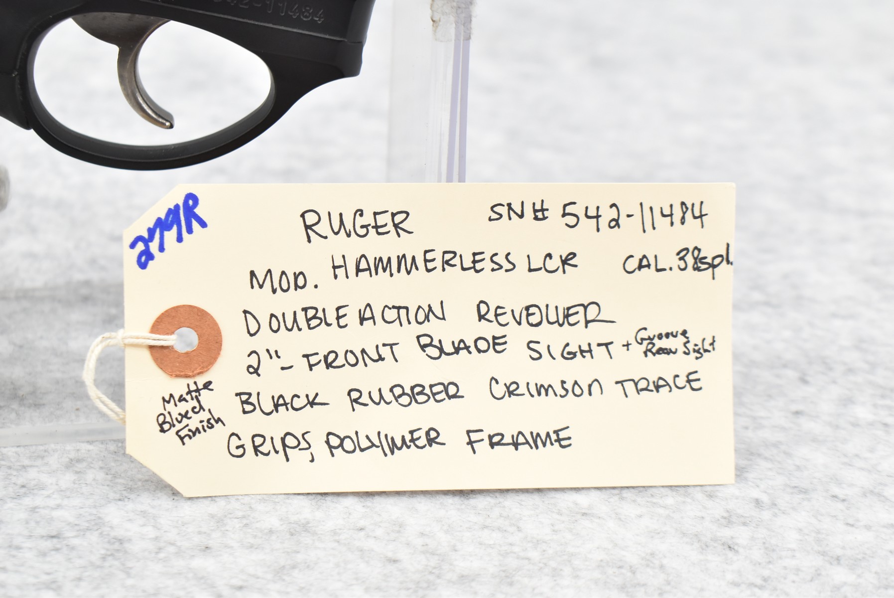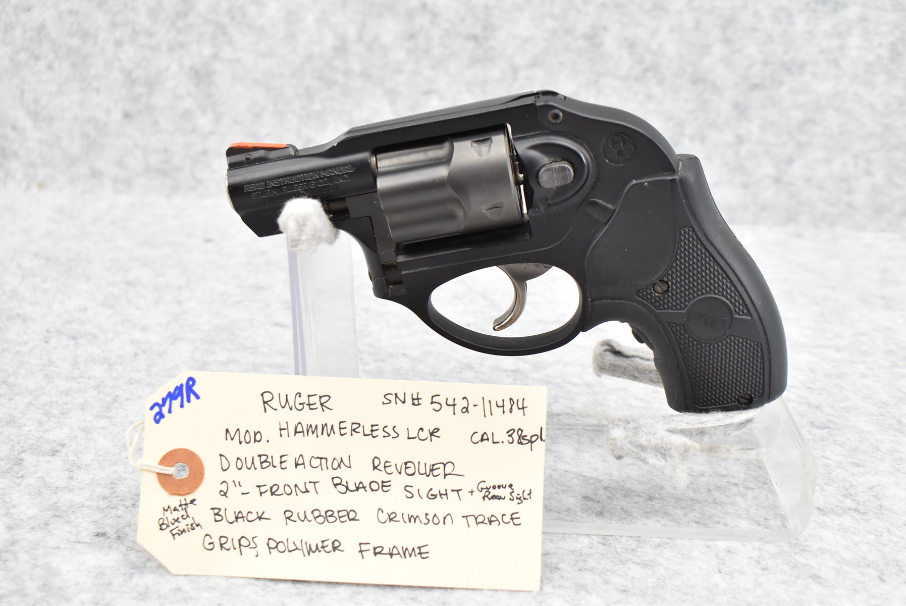 279R. Ruger – Mod. Hammerless LCR – 38 Spl. Cal. Double Action Revolver – w/2” Barrel w/Front Blade & Groove Rear Sights – Matte Blued Finish – Polymer Frame – w/Black Rubber Crimson Trace Laser Grips