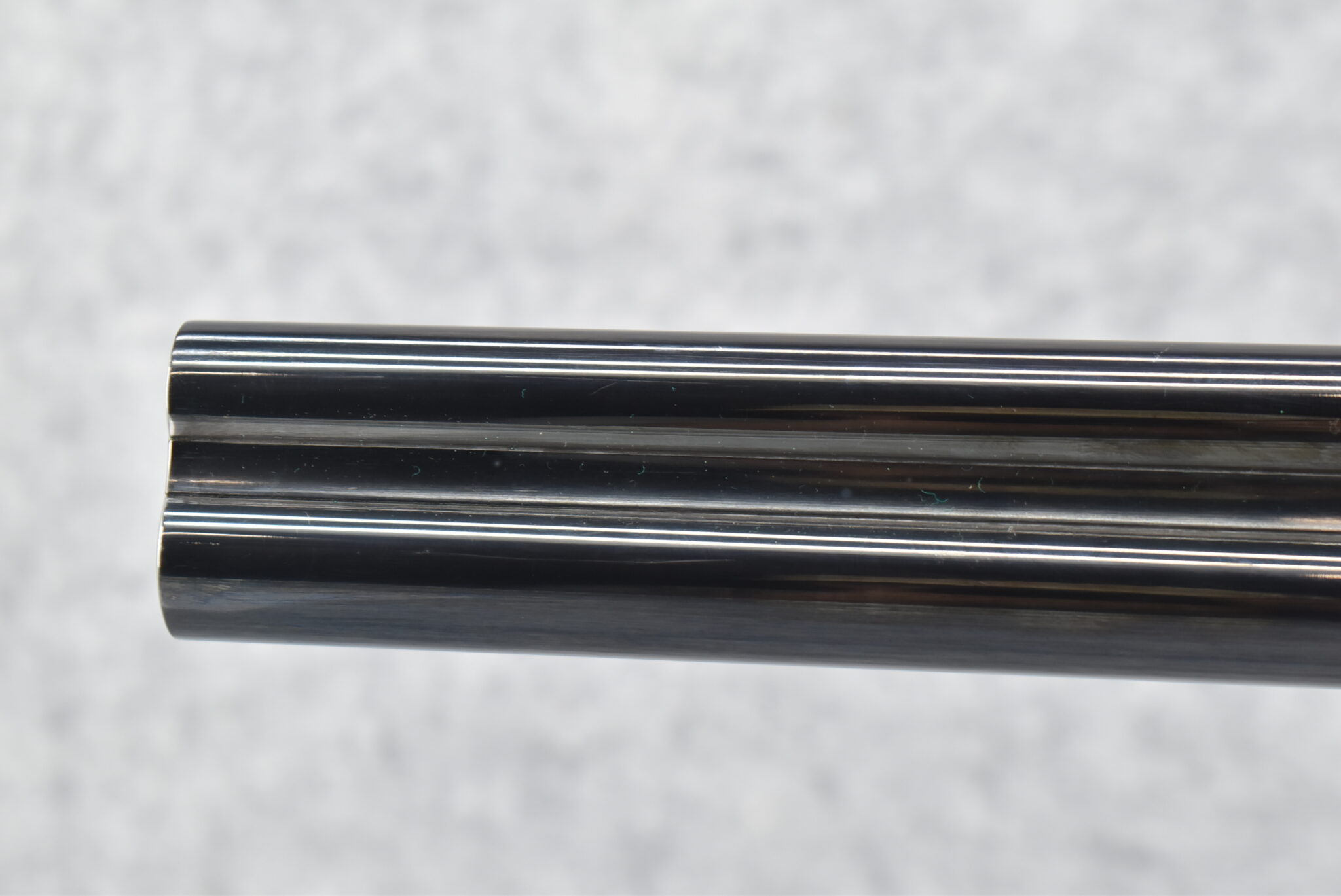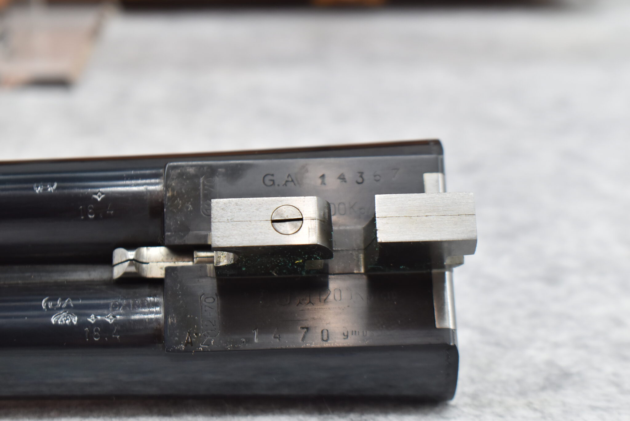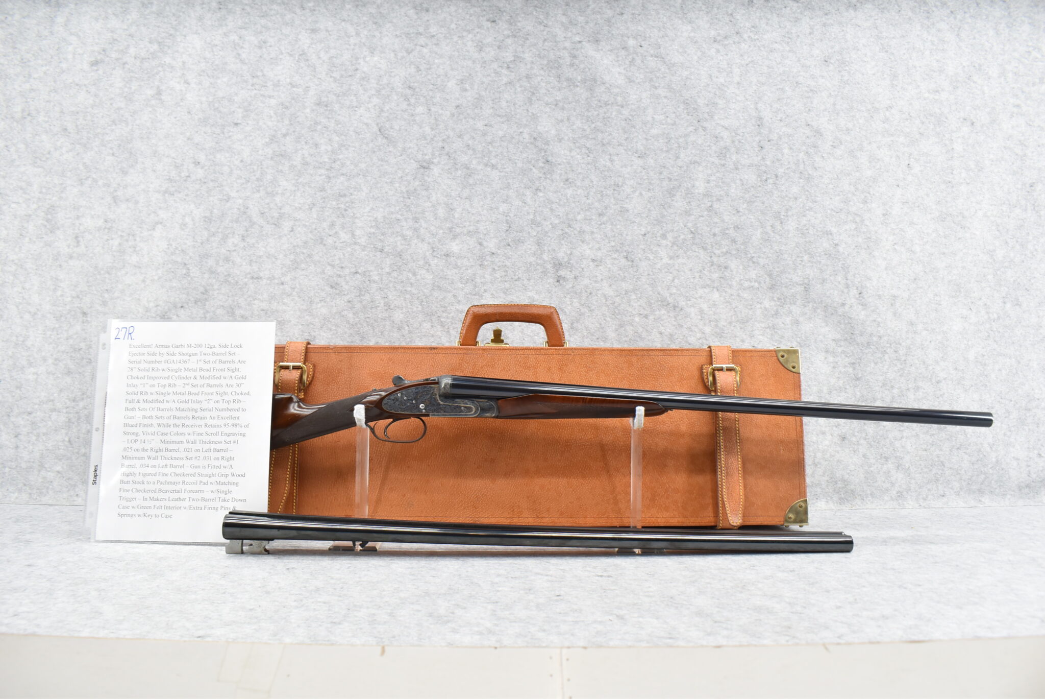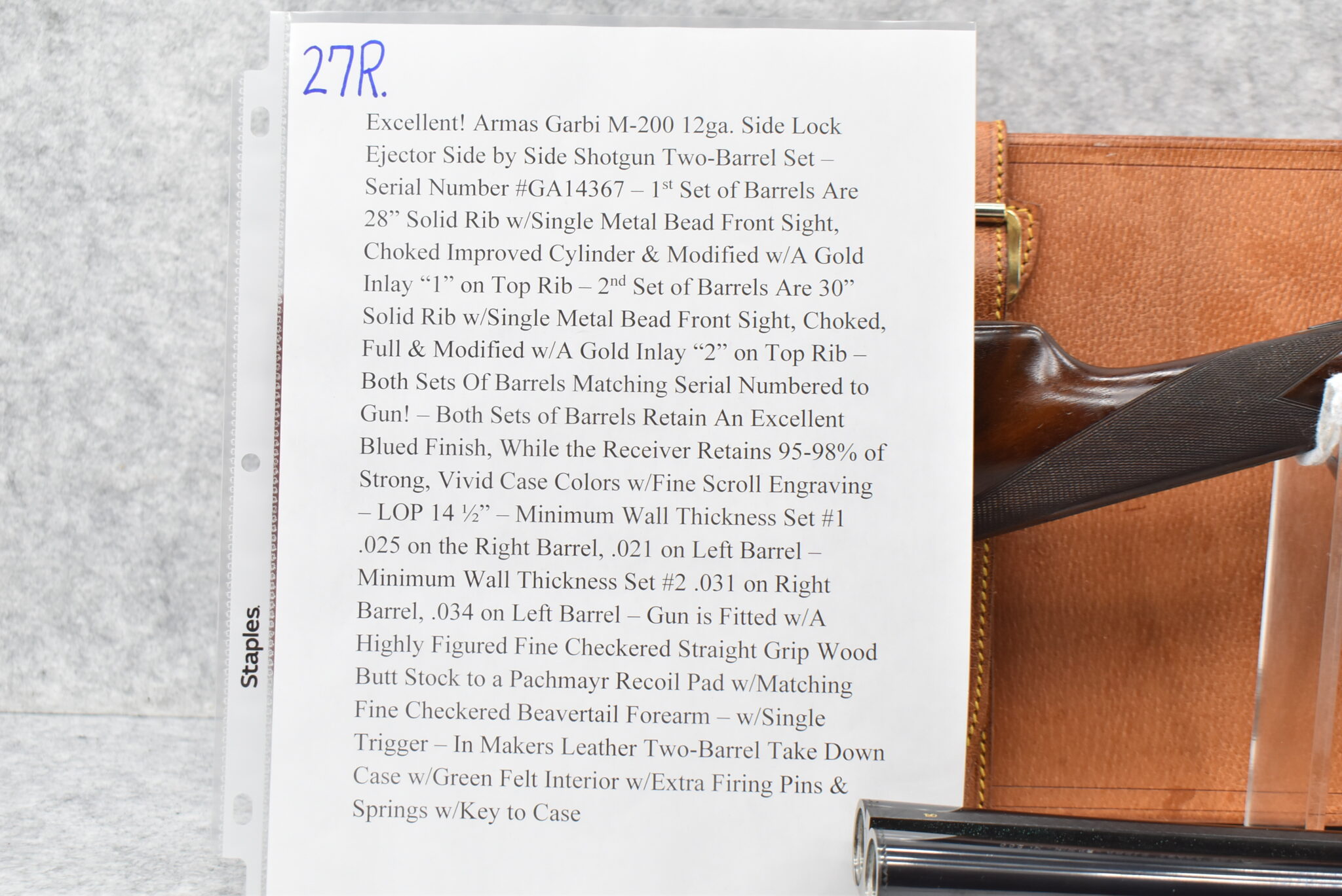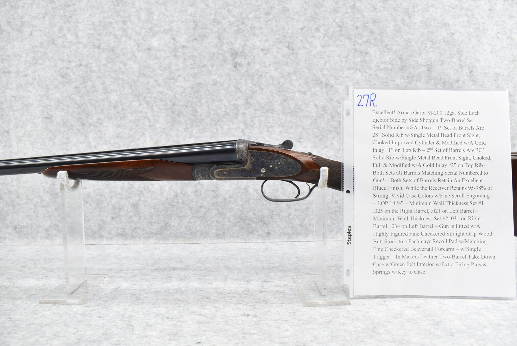 27R. Excellent! Armas Garbi M-200 12ga. Side Lock Ejector Side by Side Shotgun Two-Barrel Set – Serial Number #GA14367 – 1st Set of Barrels Are 28” Solid Rib w/Single Metal Bead Front Sight, Choked Improved Cylinder & Modified w/A Gold Inlay “1” on Top Rib – 2nd Set of Barrels Are 30” Solid Rib w/Single Metal Bead Front Sight, Choked, Full & Modified w/A Gold Inlay “2” on Top Rib – Both Sets Of Barrels Matching Serial Numbered to Gun! – Both Sets of Barrels Retain An Excellent Blued Finish, While the Receiver Retains 95-98% of Strong, Vivid Case Colors w/Fine Scroll Engraving – LOP 14 ½” – Minimum Wall Thickness Set #1 .025 on the Right Barrel, .021 on Left Barrel – Minimum Wall Thickness Set #2 .031 on Right Barrel, .034 on Left Barrel – Gun is Fitted w/A Highly Figured Fine Checkered Straight Grip Wood Butt Stock to a Pachmayr Recoil Pad w/Matching Fine Checkered Beavertail Forearm – w/Single Trigger – In Makers Leather Two-Barrel Take Down Case w/Green Felt Interior w/Extra Firing Pins & Springs w/Key to Case
