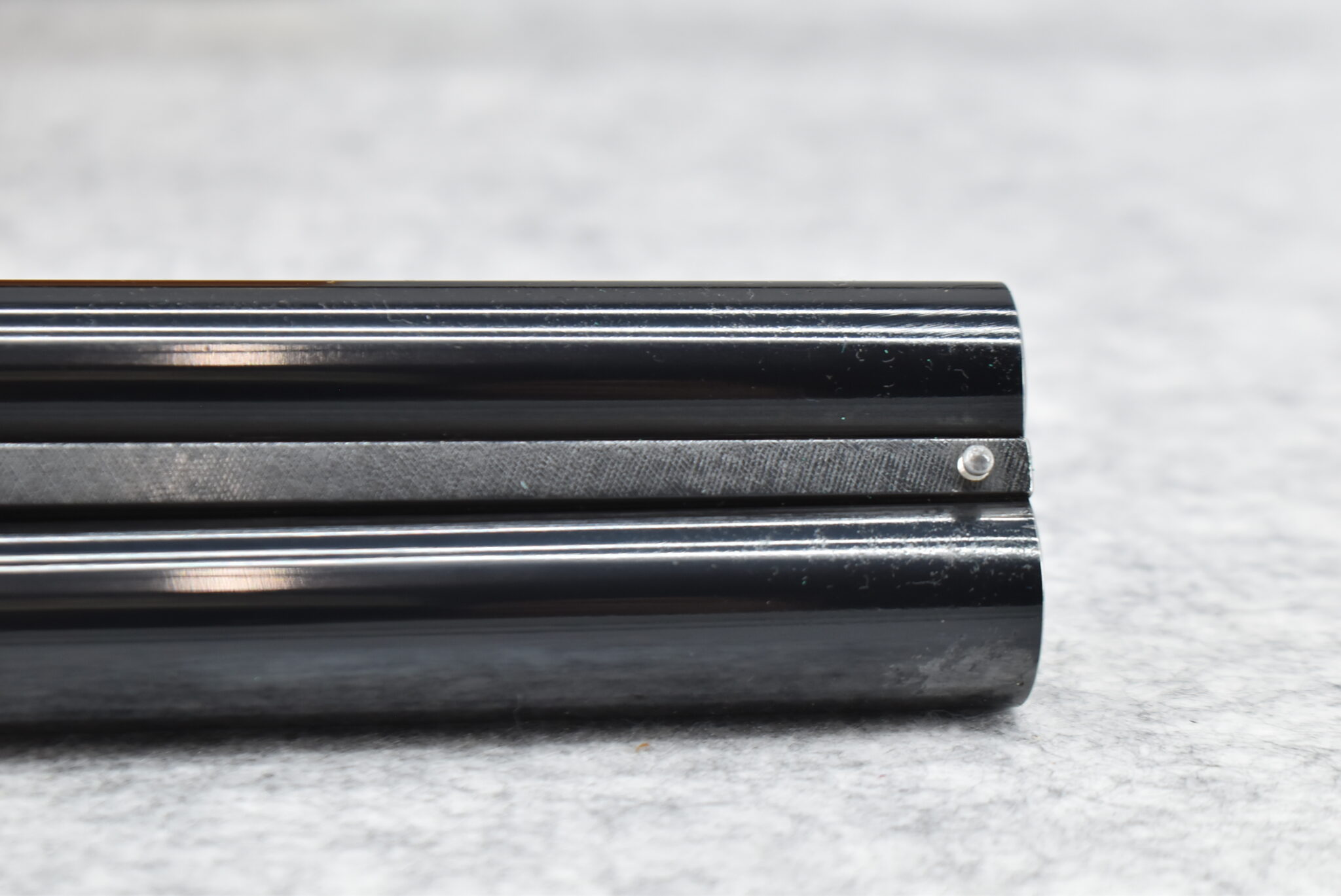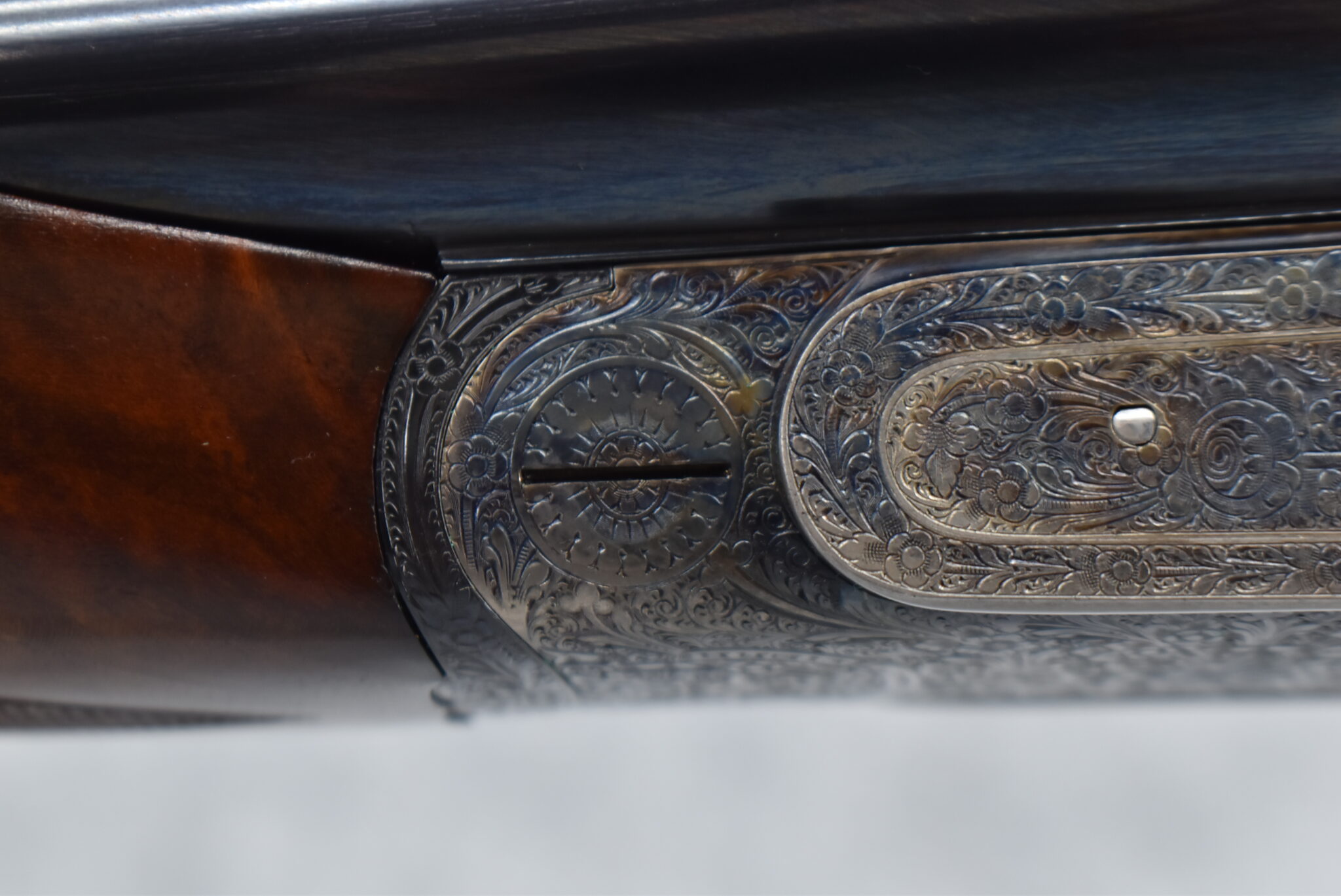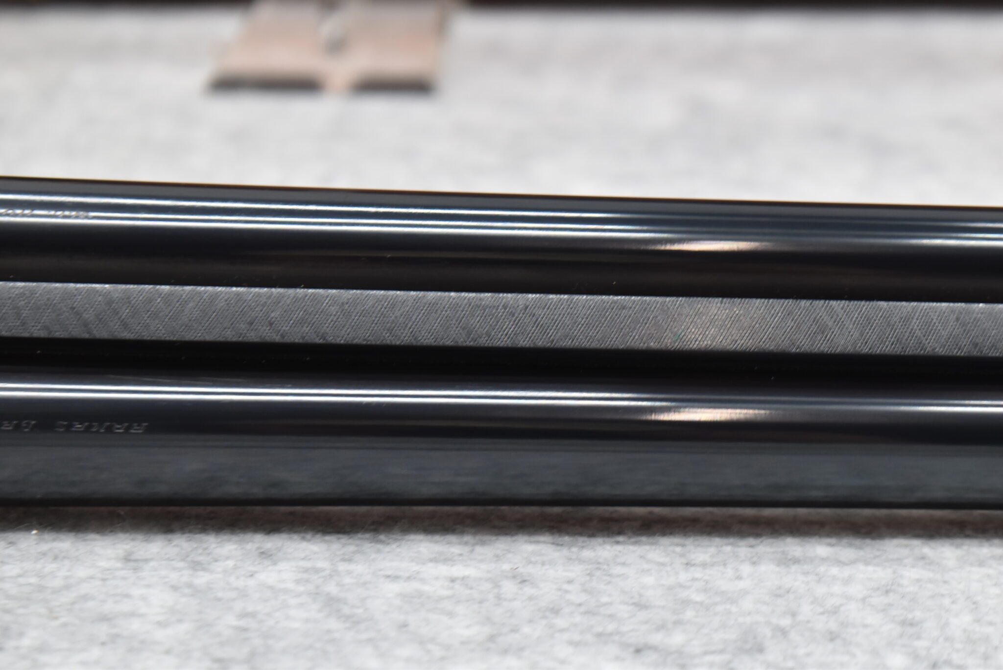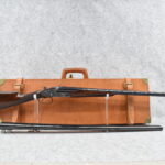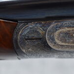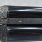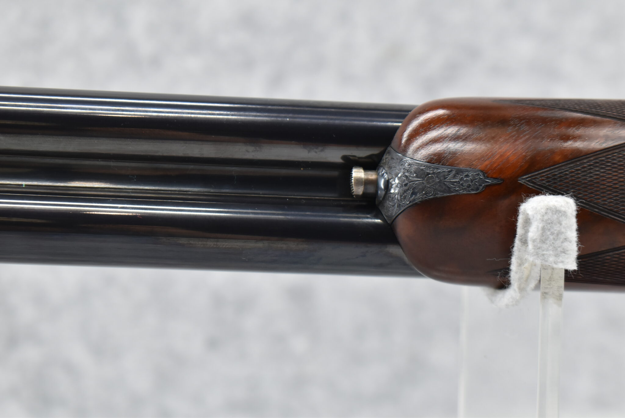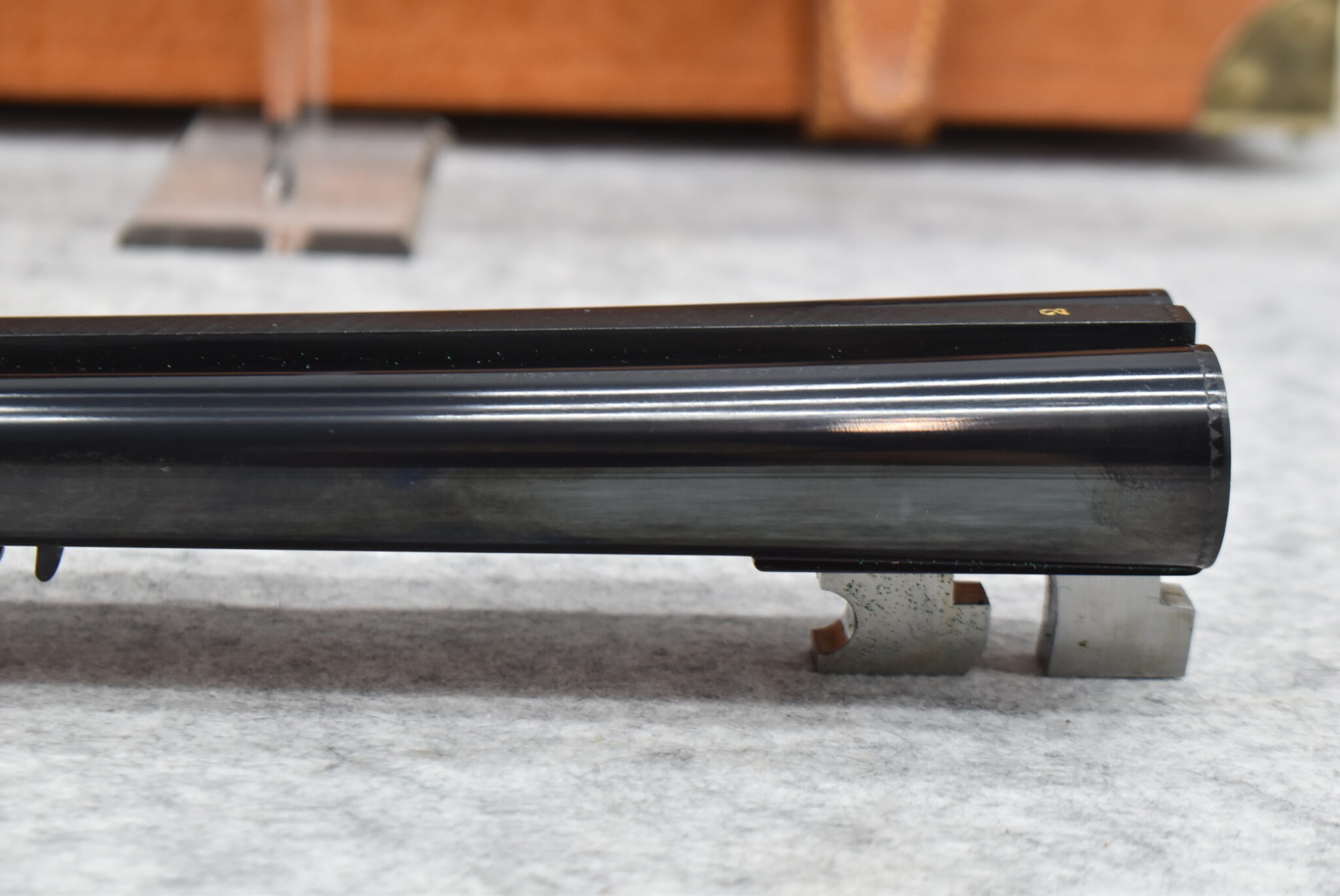 27R. Excellent! Armas Garbi M-200 12ga. Side Lock Ejector Side by Side Shotgun Two-Barrel Set – Serial Number #GA14367 – 1st Set of Barrels Are 28” Solid Rib w/Single Metal Bead Front Sight, Choked Improved Cylinder & Modified w/A Gold Inlay “1” on Top Rib – 2nd Set of Barrels Are 30” Solid Rib w/Single Metal Bead Front Sight, Choked, Full & Modified w/A Gold Inlay “2” on Top Rib – Both Sets Of Barrels Matching Serial Numbered to Gun! – Both Sets of Barrels Retain An Excellent Blued Finish, While the Receiver Retains 95-98% of Strong, Vivid Case Colors w/Fine Scroll Engraving – LOP 14 ½” – Minimum Wall Thickness Set #1 .025 on the Right Barrel, .021 on Left Barrel – Minimum Wall Thickness Set #2 .031 on Right Barrel, .034 on Left Barrel – Gun is Fitted w/A Highly Figured Fine Checkered Straight Grip Wood Butt Stock to a Pachmayr Recoil Pad w/Matching Fine Checkered Beavertail Forearm – w/Single Trigger – In Makers Leather Two-Barrel Take Down Case w/Green Felt Interior w/Extra Firing Pins & Springs w/Key to Case
