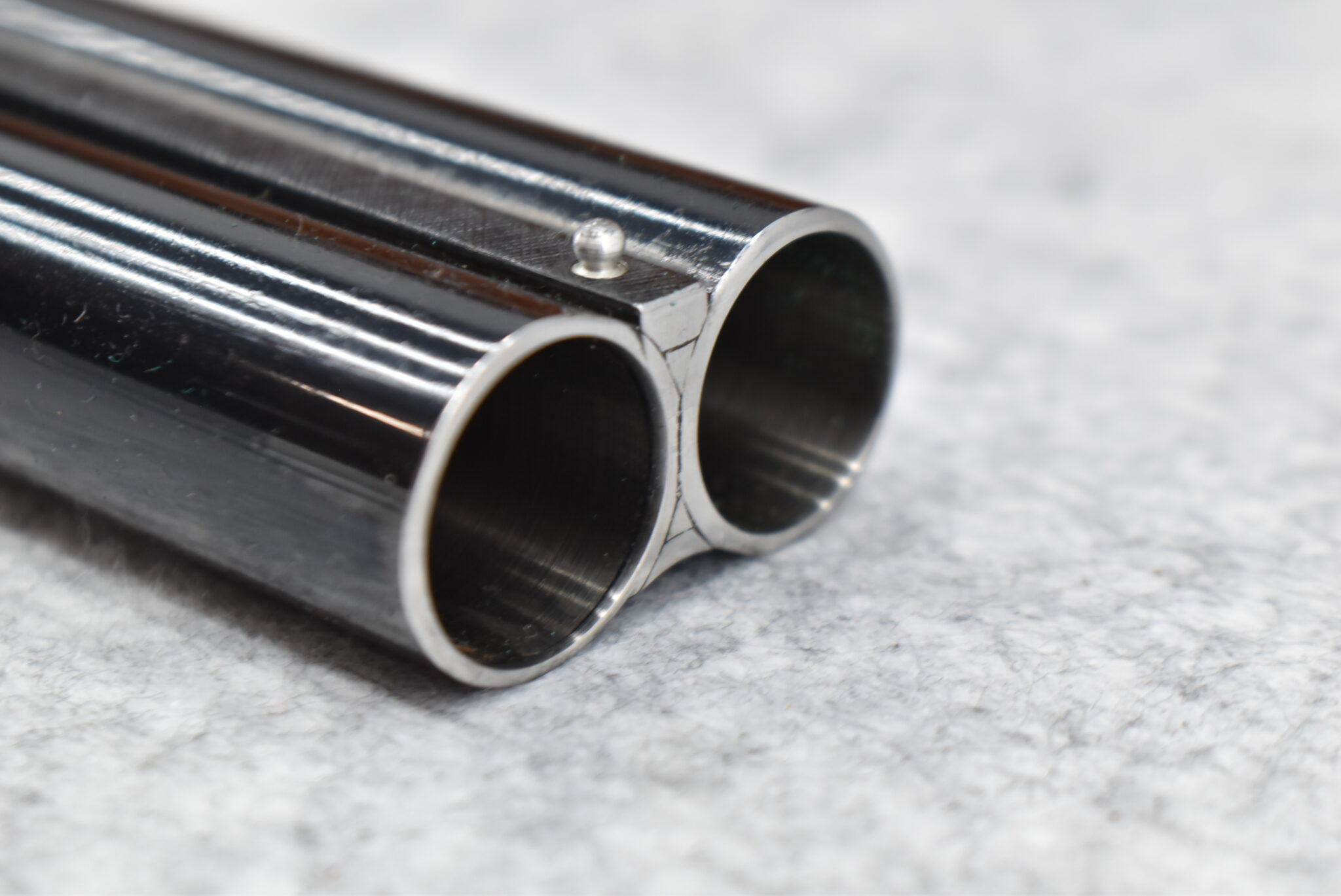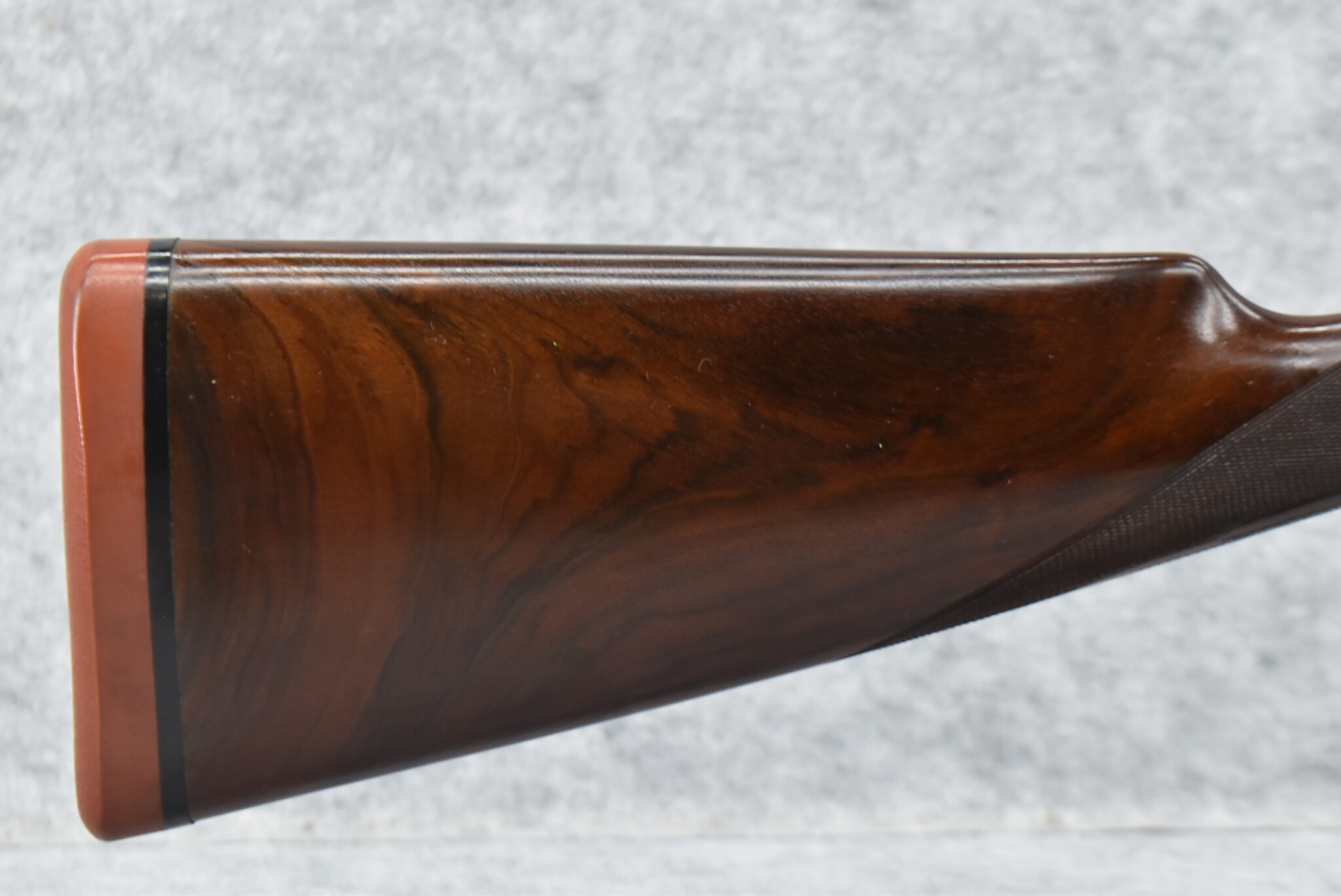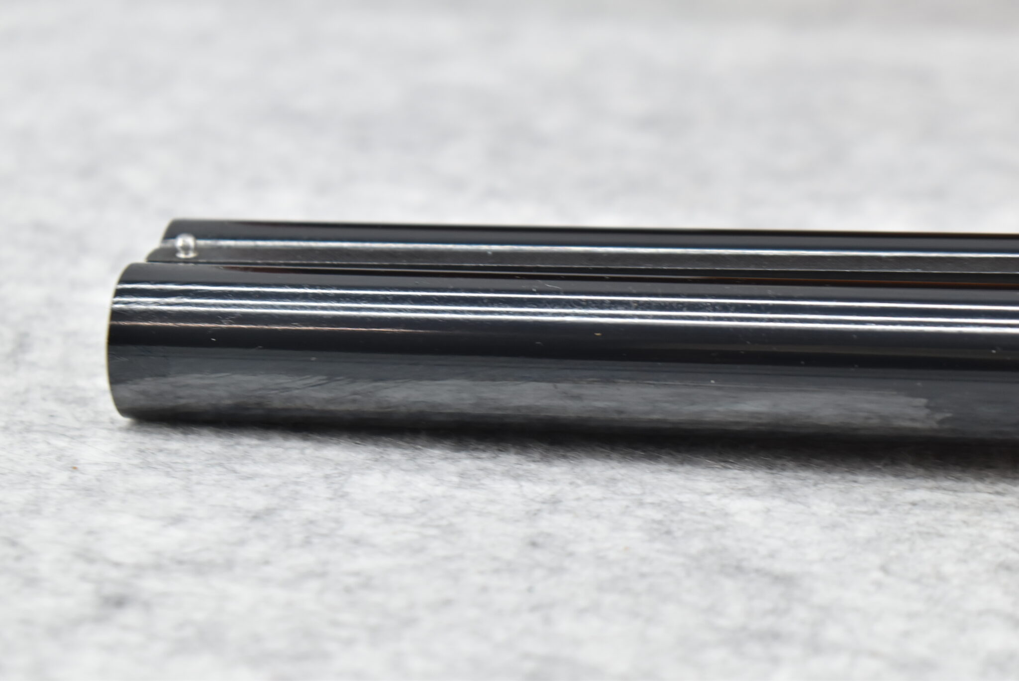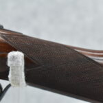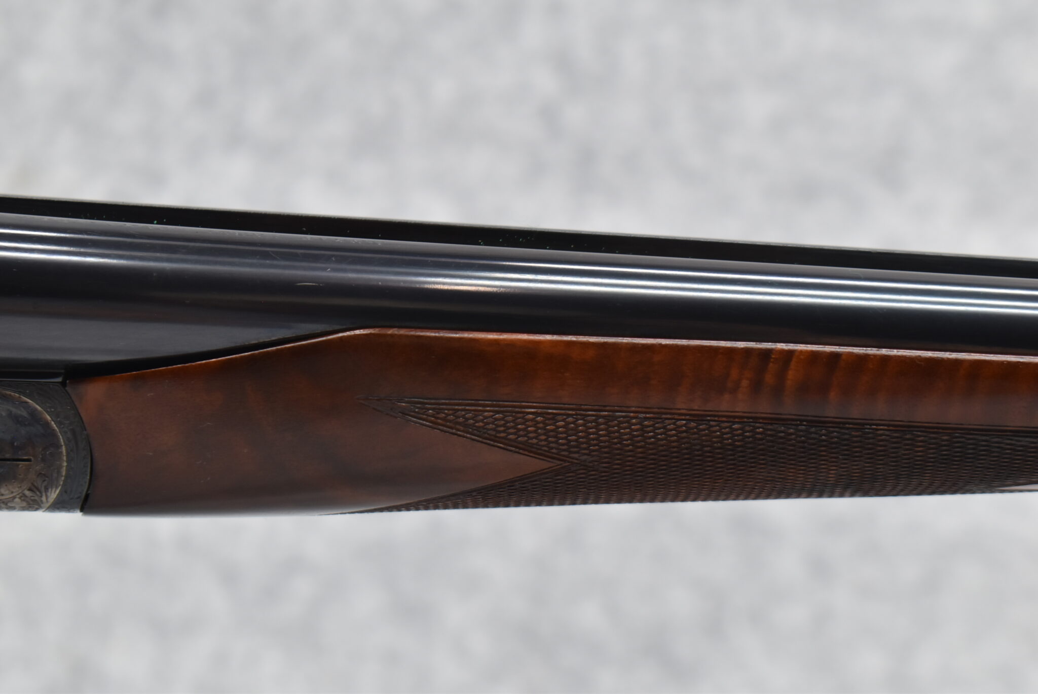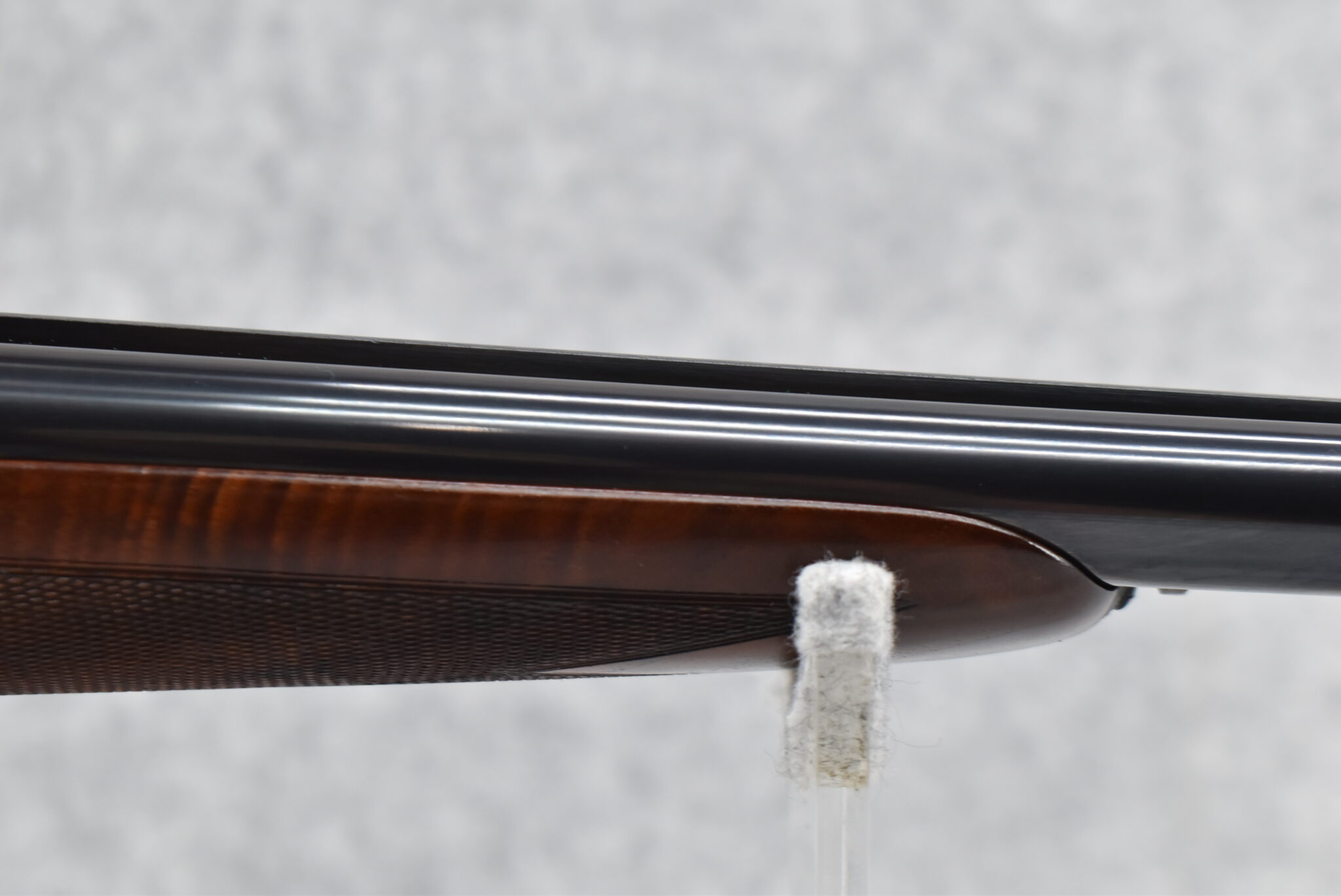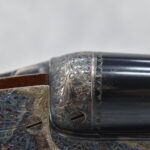 27R. Excellent! Armas Garbi M-200 12ga. Side Lock Ejector Side by Side Shotgun Two-Barrel Set – Serial Number #GA14367 – 1st Set of Barrels Are 28” Solid Rib w/Single Metal Bead Front Sight, Choked Improved Cylinder & Modified w/A Gold Inlay “1” on Top Rib – 2nd Set of Barrels Are 30” Solid Rib w/Single Metal Bead Front Sight, Choked, Full & Modified w/A Gold Inlay “2” on Top Rib – Both Sets Of Barrels Matching Serial Numbered to Gun! – Both Sets of Barrels Retain An Excellent Blued Finish, While the Receiver Retains 95-98% of Strong, Vivid Case Colors w/Fine Scroll Engraving – LOP 14 ½” – Minimum Wall Thickness Set #1 .025 on the Right Barrel, .021 on Left Barrel – Minimum Wall Thickness Set #2 .031 on Right Barrel, .034 on Left Barrel – Gun is Fitted w/A Highly Figured Fine Checkered Straight Grip Wood Butt Stock to a Pachmayr Recoil Pad w/Matching Fine Checkered Beavertail Forearm – w/Single Trigger – In Makers Leather Two-Barrel Take Down Case w/Green Felt Interior w/Extra Firing Pins & Springs w/Key to Case