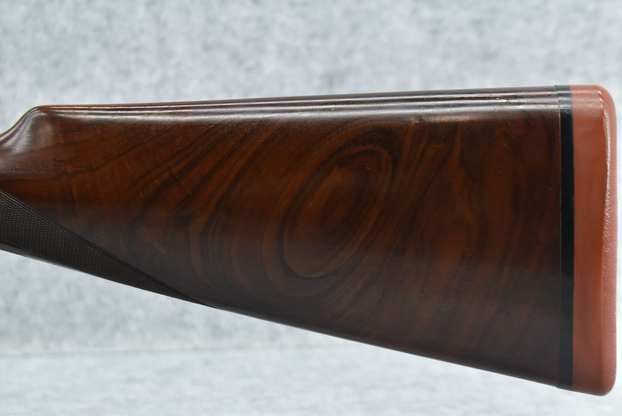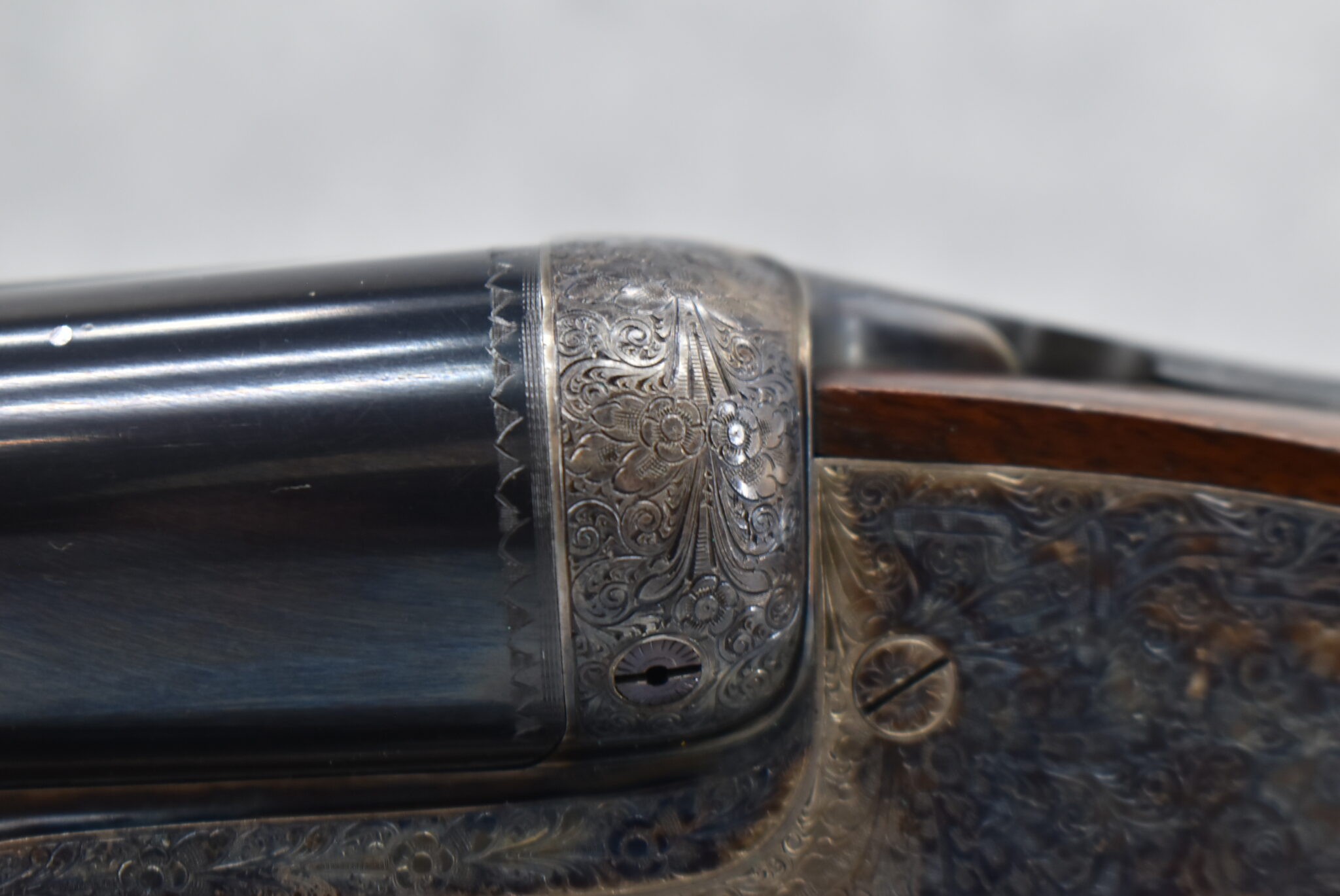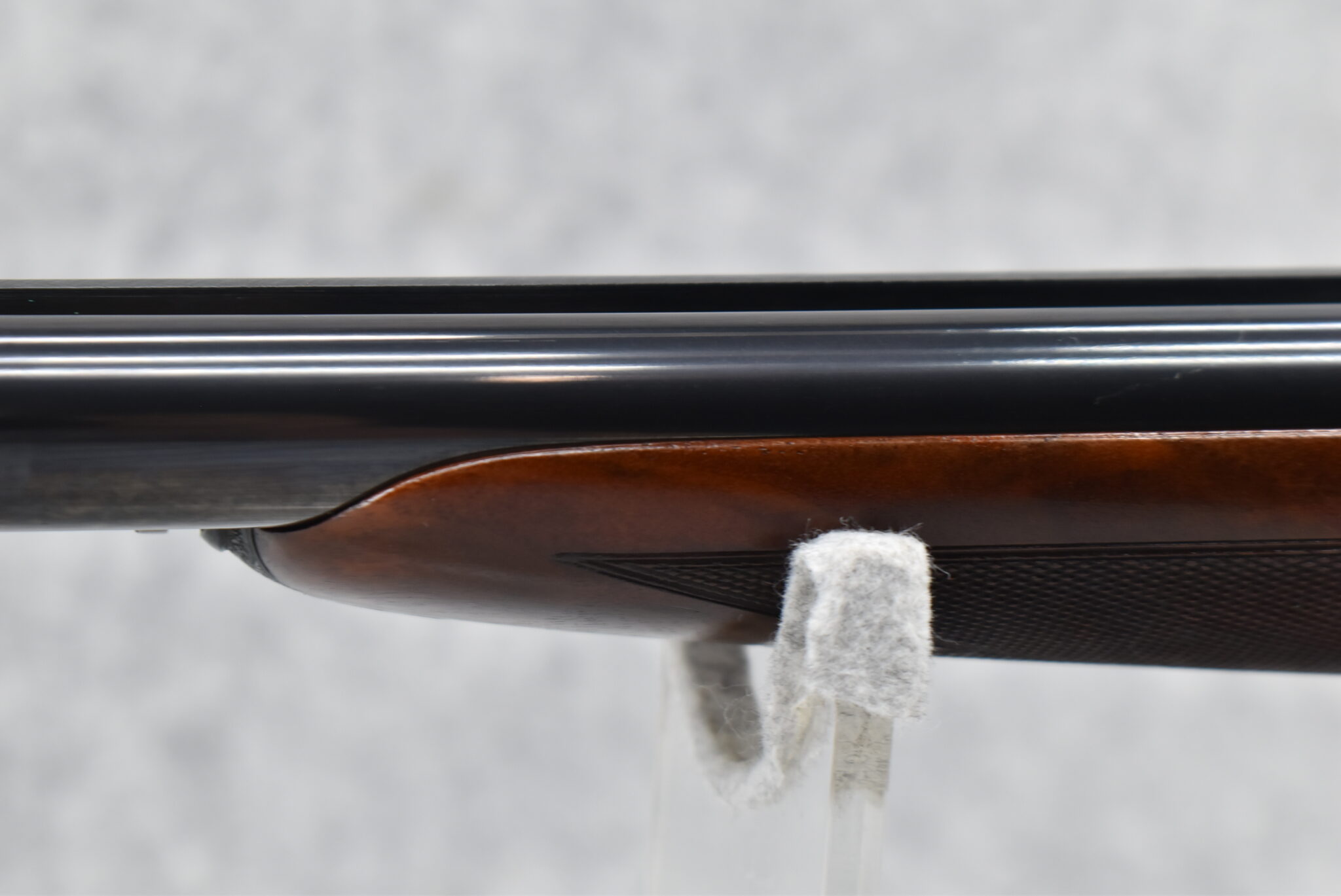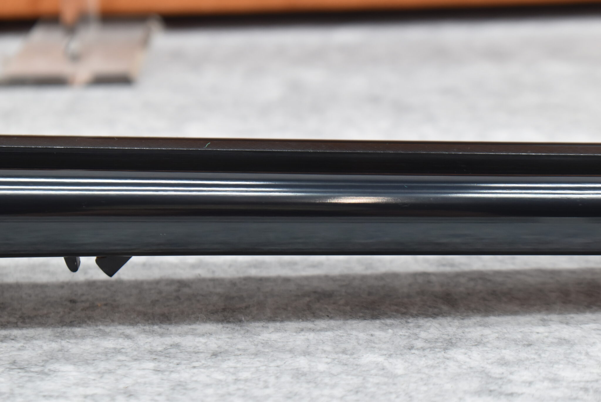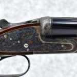 27R. Excellent! Armas Garbi M-200 12ga. Side Lock Ejector Side by Side Shotgun Two-Barrel Set – Serial Number #GA14367 – 1st Set of Barrels Are 28” Solid Rib w/Single Metal Bead Front Sight, Choked Improved Cylinder & Modified w/A Gold Inlay “1” on Top Rib – 2nd Set of Barrels Are 30” Solid Rib w/Single Metal Bead Front Sight, Choked, Full & Modified w/A Gold Inlay “2” on Top Rib – Both Sets Of Barrels Matching Serial Numbered to Gun! – Both Sets of Barrels Retain An Excellent Blued Finish, While the Receiver Retains 95-98% of Strong, Vivid Case Colors w/Fine Scroll Engraving – LOP 14 ½” – Minimum Wall Thickness Set #1 .025 on the Right Barrel, .021 on Left Barrel – Minimum Wall Thickness Set #2 .031 on Right Barrel, .034 on Left Barrel – Gun is Fitted w/A Highly Figured Fine Checkered Straight Grip Wood Butt Stock to a Pachmayr Recoil Pad w/Matching Fine Checkered Beavertail Forearm – w/Single Trigger – In Makers Leather Two-Barrel Take Down Case w/Green Felt Interior w/Extra Firing Pins & Springs w/Key to Case