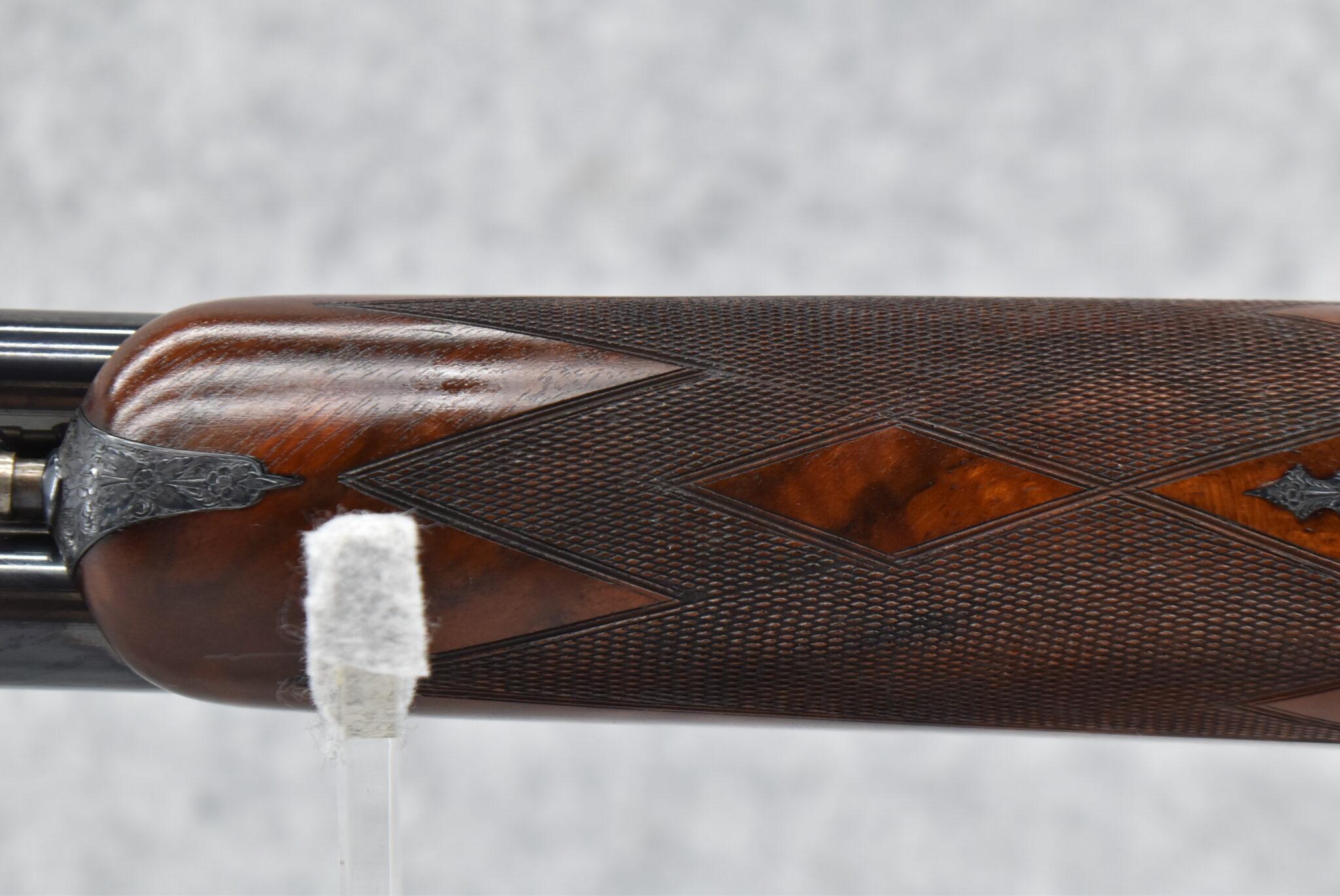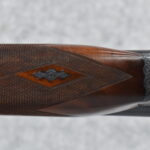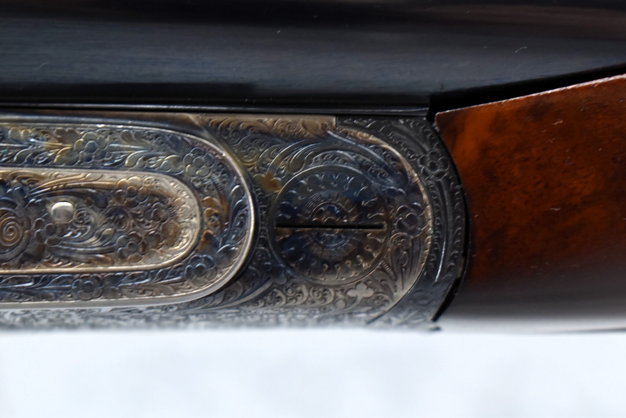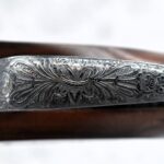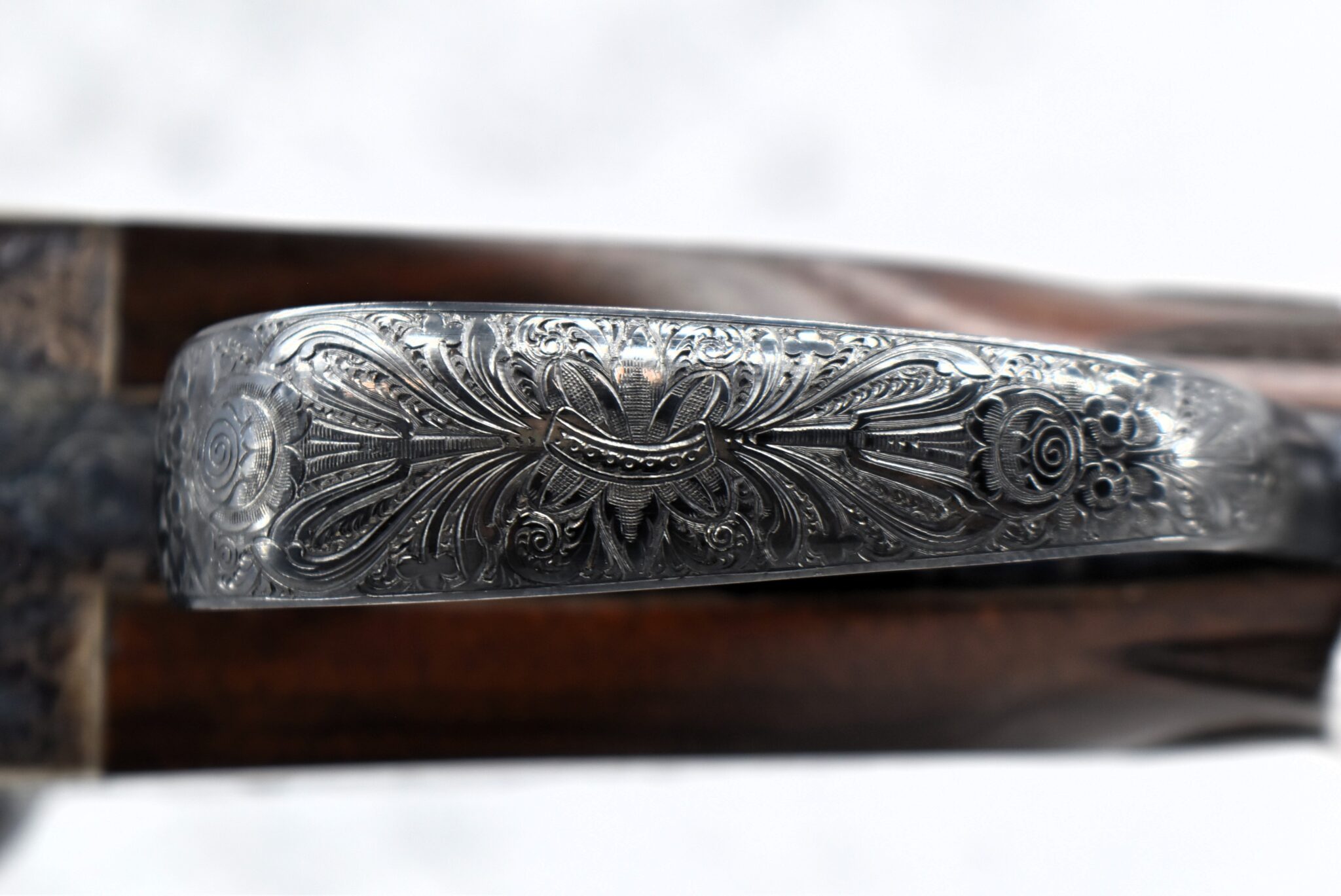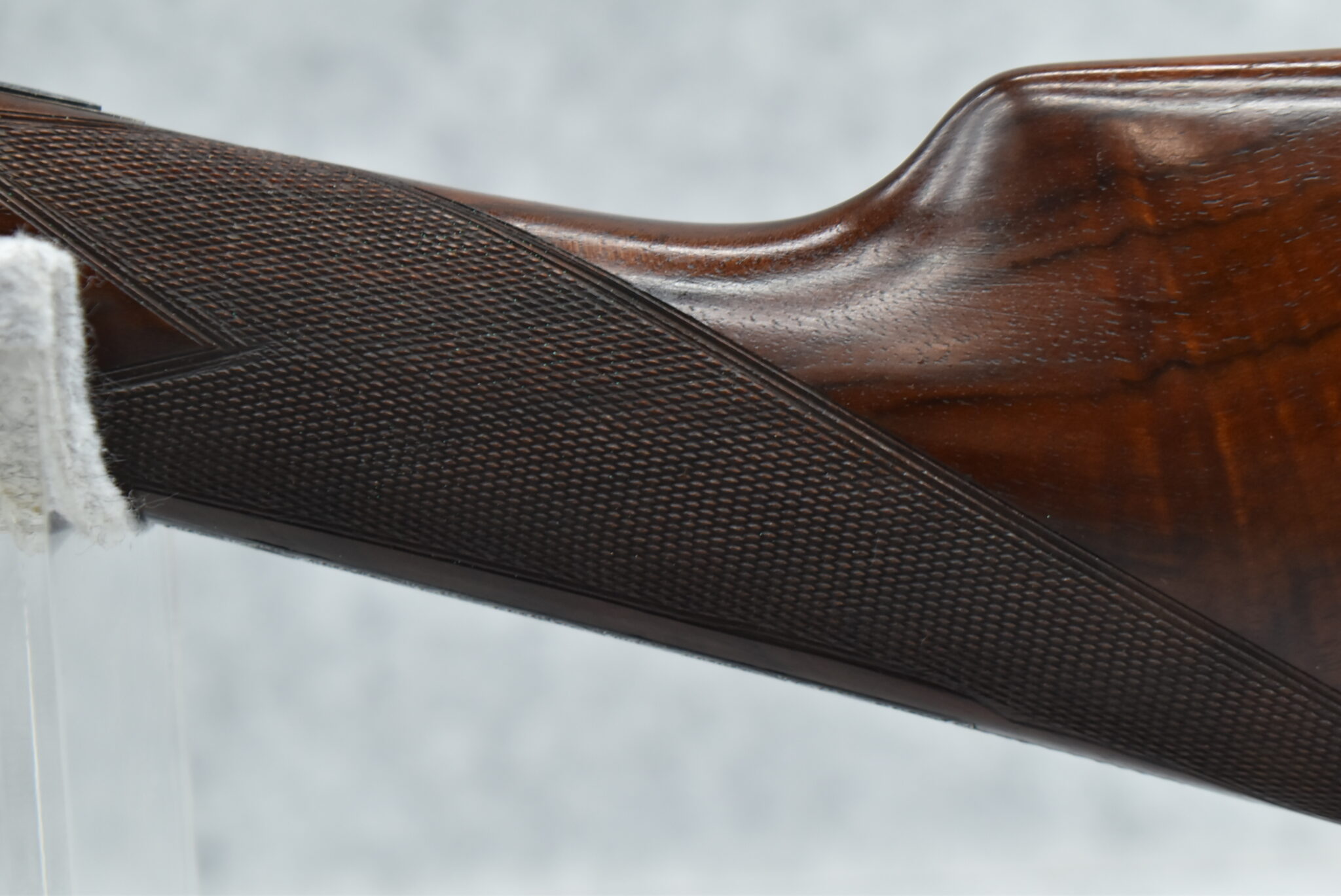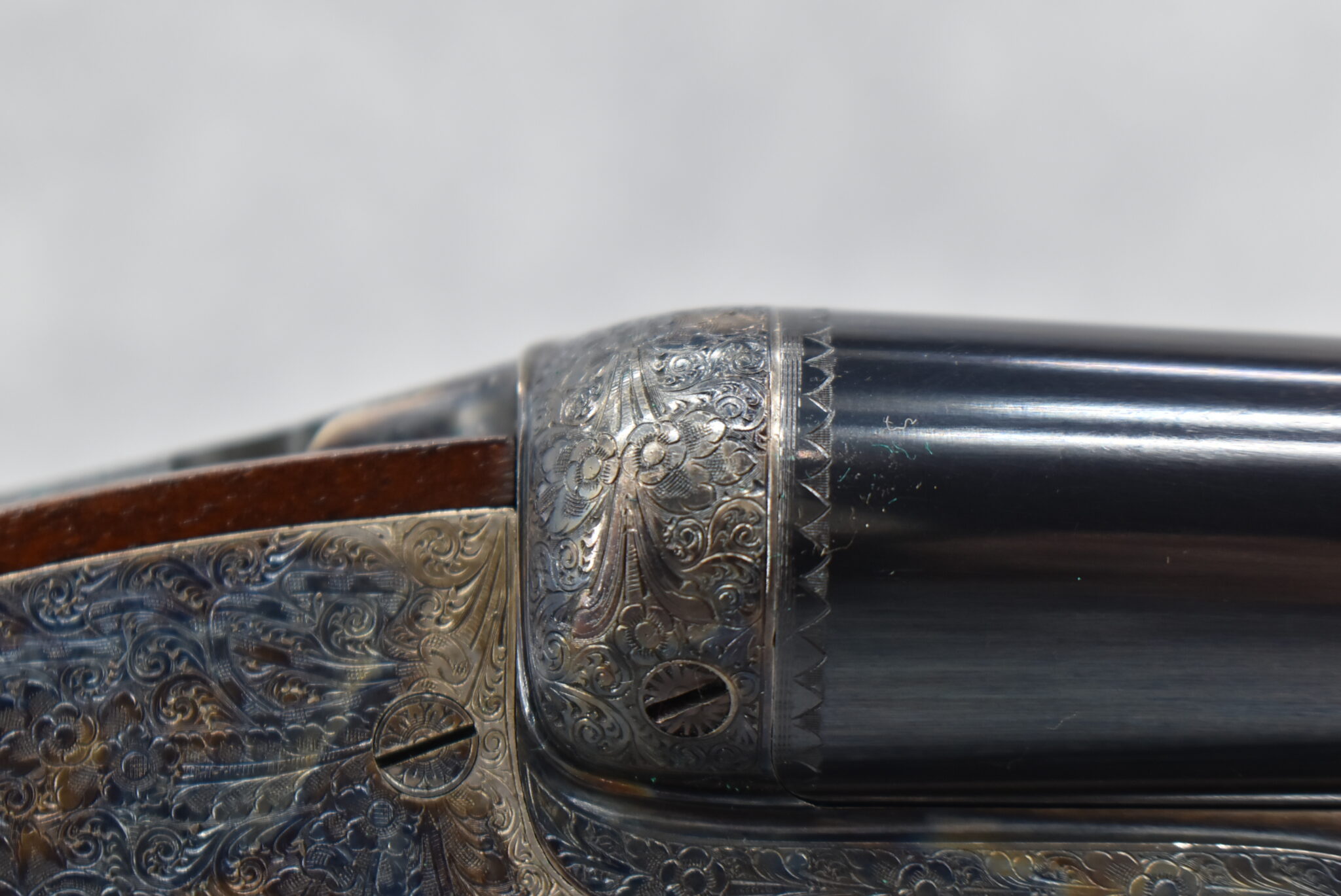 27R. Excellent! Armas Garbi M-200 12ga. Side Lock Ejector Side by Side Shotgun Two-Barrel Set – Serial Number #GA14367 – 1st Set of Barrels Are 28” Solid Rib w/Single Metal Bead Front Sight, Choked Improved Cylinder & Modified w/A Gold Inlay “1” on Top Rib – 2nd Set of Barrels Are 30” Solid Rib w/Single Metal Bead Front Sight, Choked, Full & Modified w/A Gold Inlay “2” on Top Rib – Both Sets Of Barrels Matching Serial Numbered to Gun! – Both Sets of Barrels Retain An Excellent Blued Finish, While the Receiver Retains 95-98% of Strong, Vivid Case Colors w/Fine Scroll Engraving – LOP 14 ½” – Minimum Wall Thickness Set #1 .025 on the Right Barrel, .021 on Left Barrel – Minimum Wall Thickness Set #2 .031 on Right Barrel, .034 on Left Barrel – Gun is Fitted w/A Highly Figured Fine Checkered Straight Grip Wood Butt Stock to a Pachmayr Recoil Pad w/Matching Fine Checkered Beavertail Forearm – w/Single Trigger – In Makers Leather Two-Barrel Take Down Case w/Green Felt Interior w/Extra Firing Pins & Springs w/Key to Case