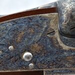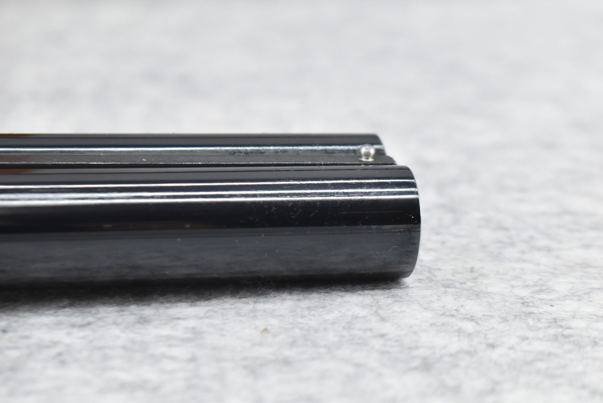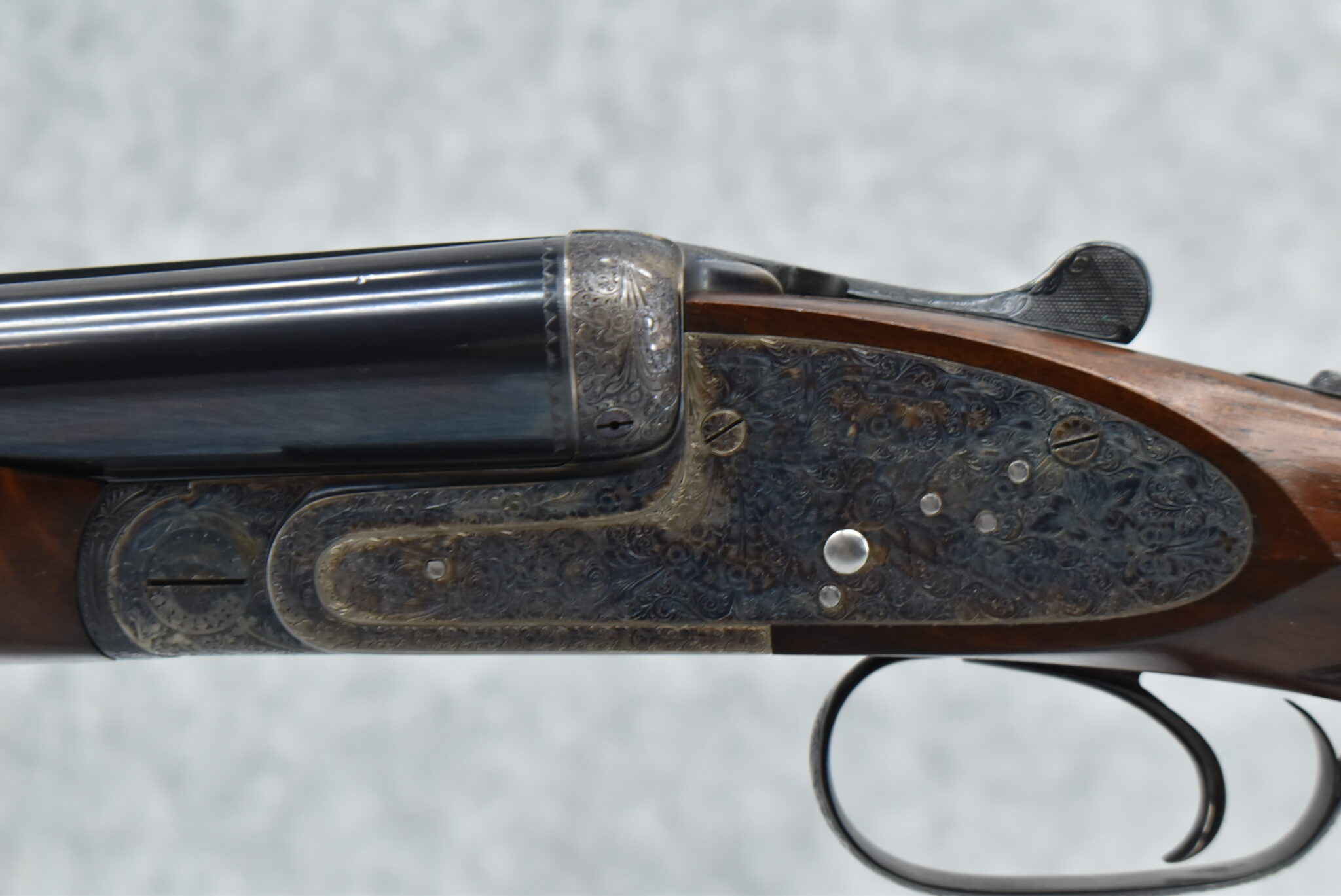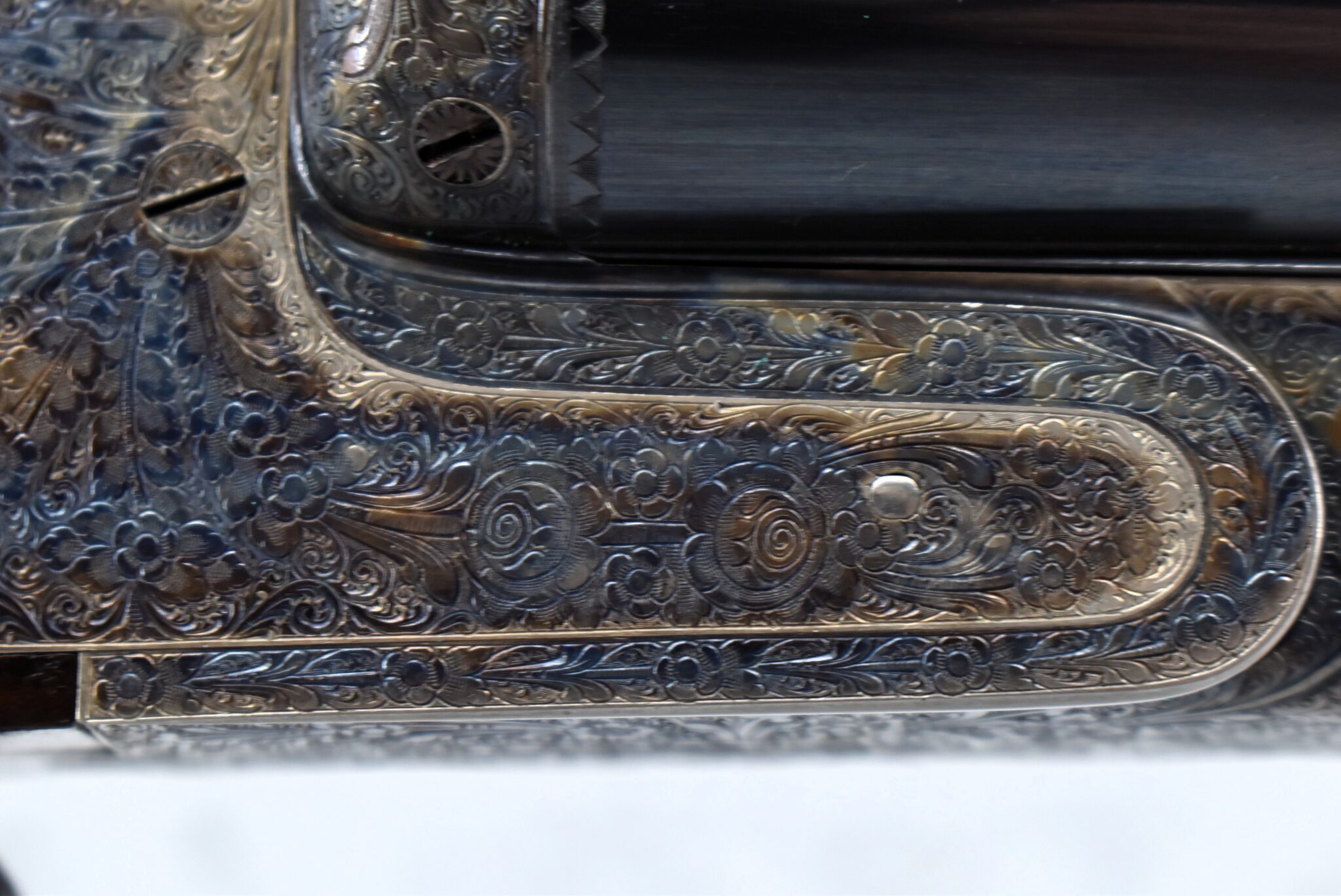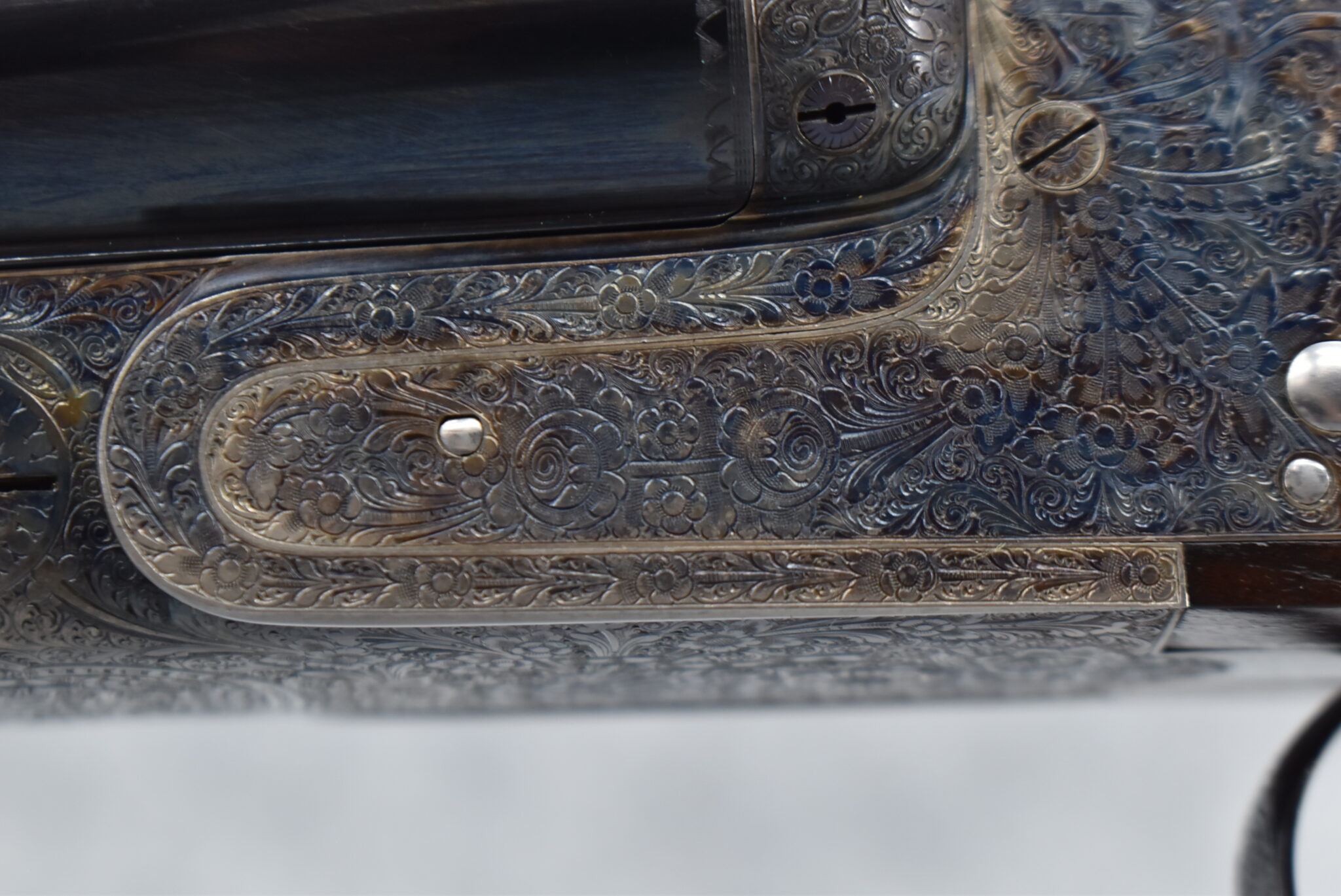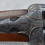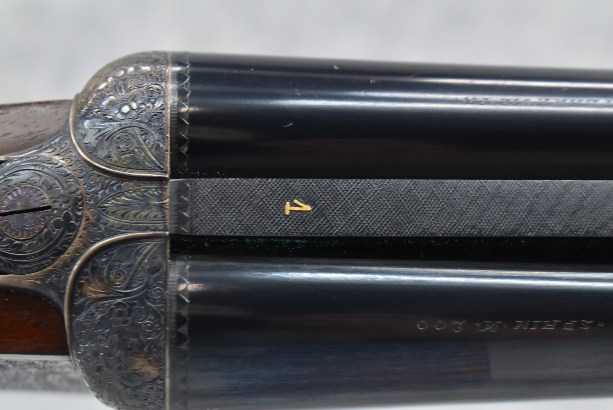 27R. Excellent! Armas Garbi M-200 12ga. Side Lock Ejector Side by Side Shotgun Two-Barrel Set – Serial Number #GA14367 – 1st Set of Barrels Are 28” Solid Rib w/Single Metal Bead Front Sight, Choked Improved Cylinder & Modified w/A Gold Inlay “1” on Top Rib – 2nd Set of Barrels Are 30” Solid Rib w/Single Metal Bead Front Sight, Choked, Full & Modified w/A Gold Inlay “2” on Top Rib – Both Sets Of Barrels Matching Serial Numbered to Gun! – Both Sets of Barrels Retain An Excellent Blued Finish, While the Receiver Retains 95-98% of Strong, Vivid Case Colors w/Fine Scroll Engraving – LOP 14 ½” – Minimum Wall Thickness Set #1 .025 on the Right Barrel, .021 on Left Barrel – Minimum Wall Thickness Set #2 .031 on Right Barrel, .034 on Left Barrel – Gun is Fitted w/A Highly Figured Fine Checkered Straight Grip Wood Butt Stock to a Pachmayr Recoil Pad w/Matching Fine Checkered Beavertail Forearm – w/Single Trigger – In Makers Leather Two-Barrel Take Down Case w/Green Felt Interior w/Extra Firing Pins & Springs w/Key to Case