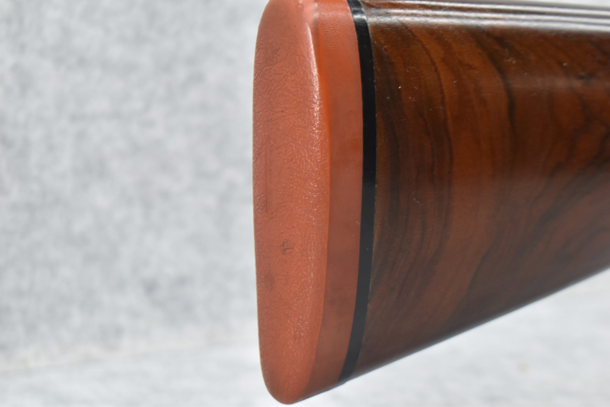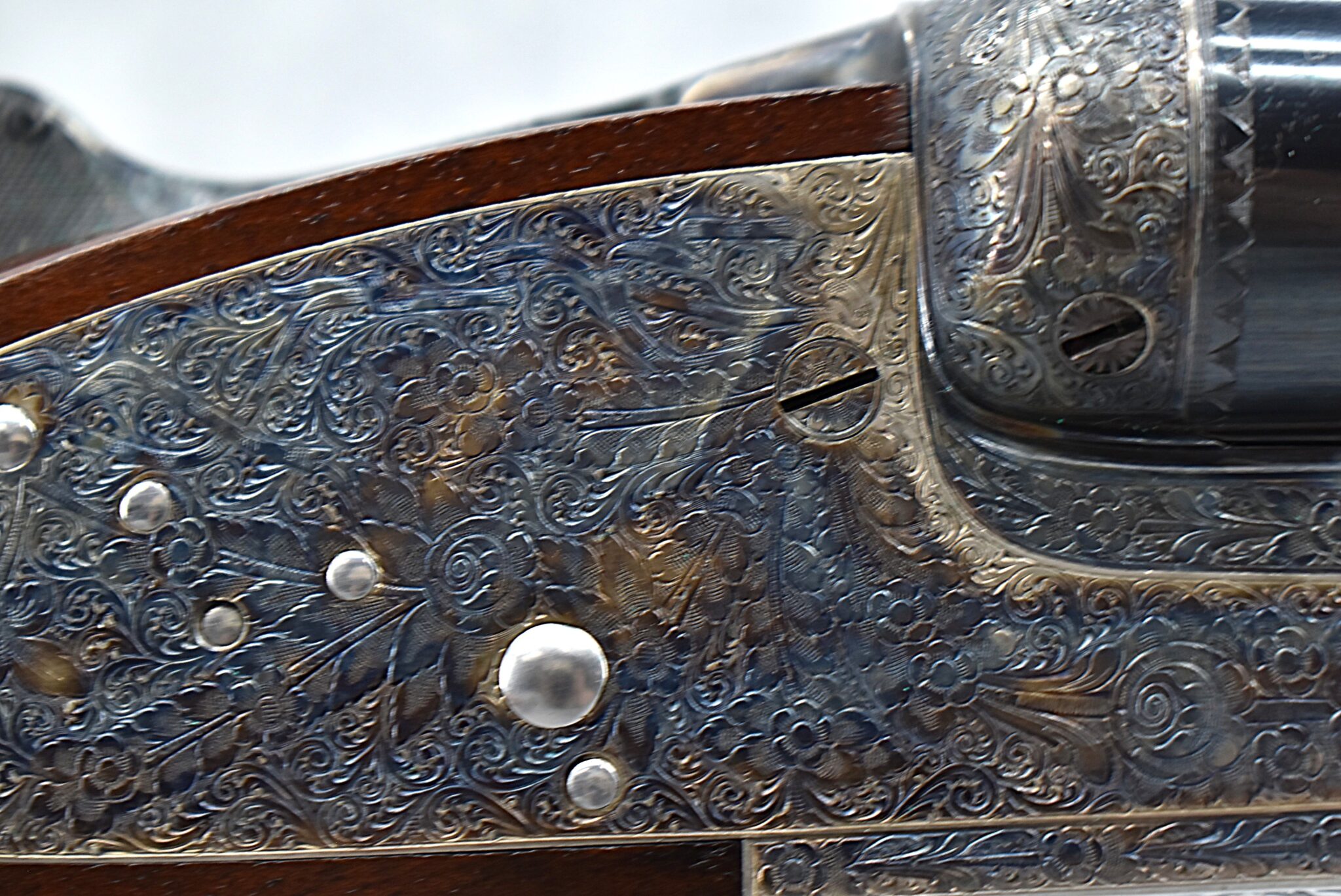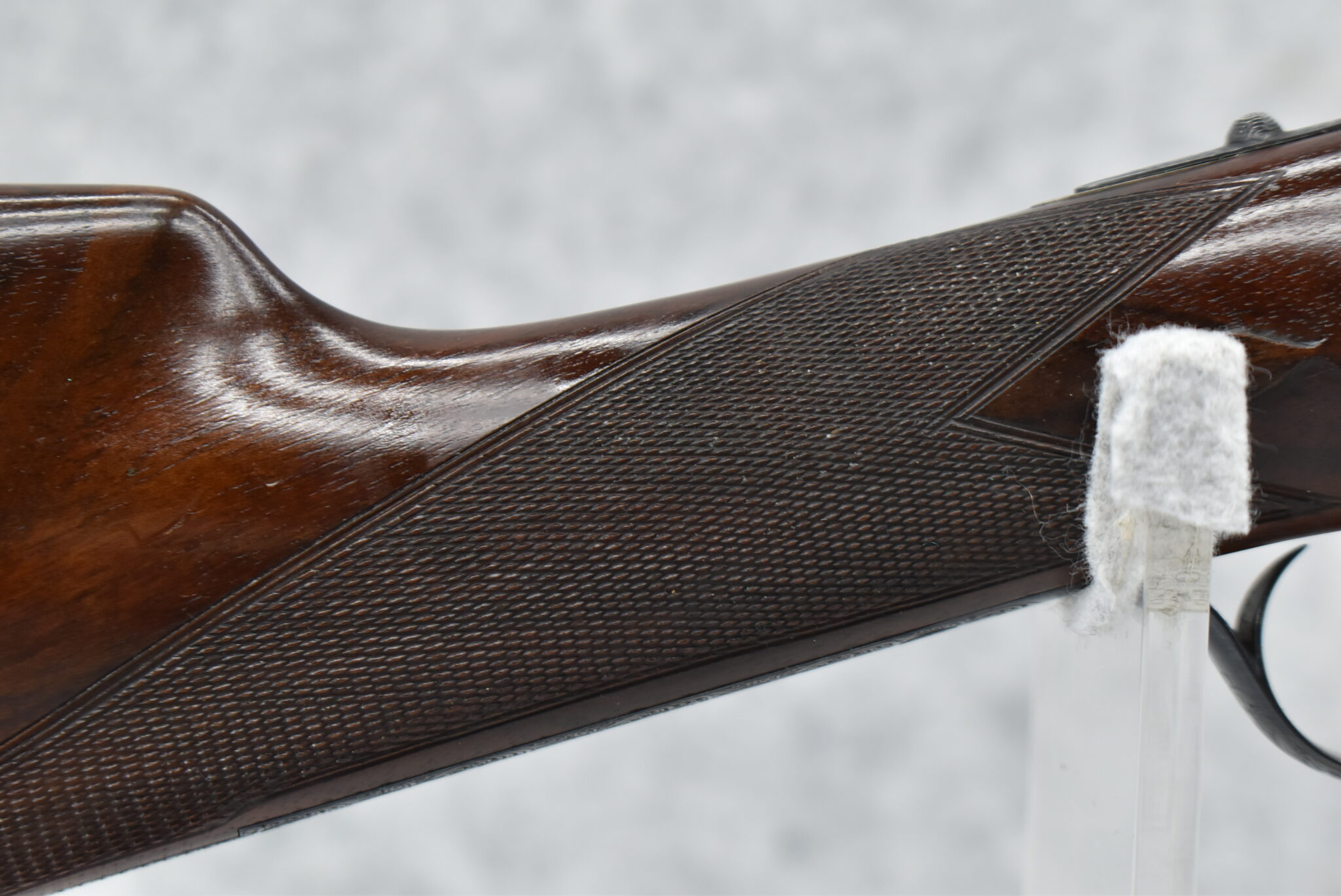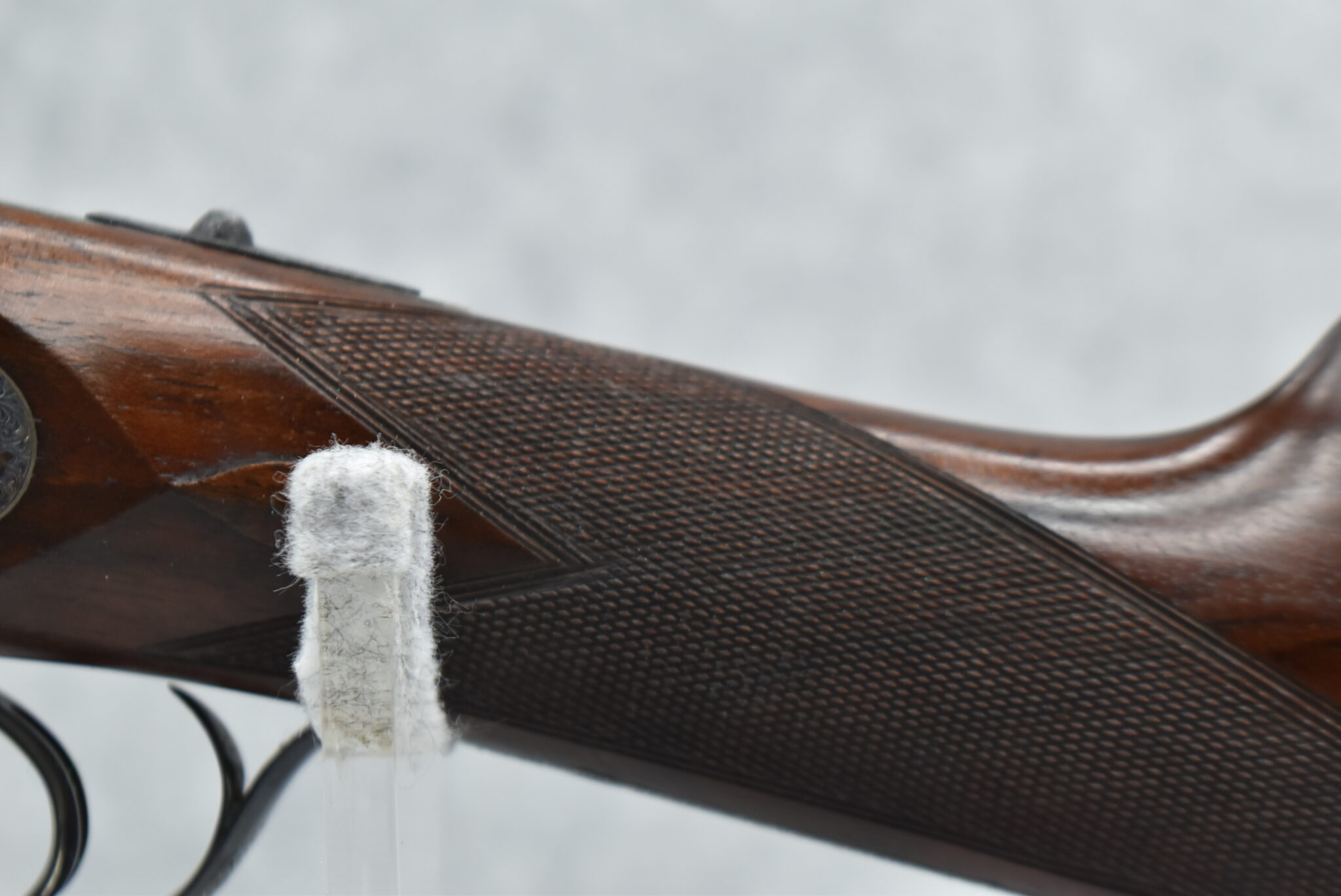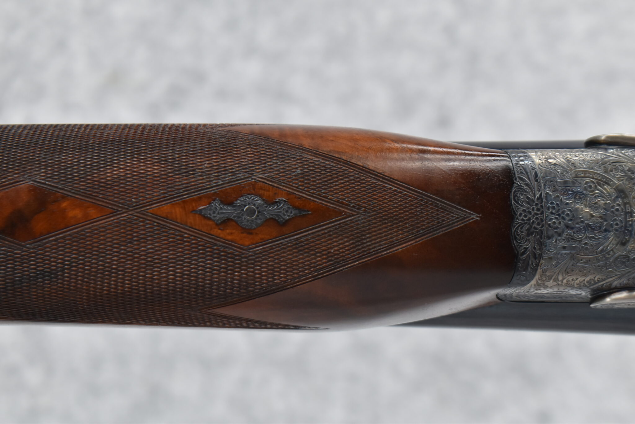 27R. Excellent! Armas Garbi M-200 12ga. Side Lock Ejector Side by Side Shotgun Two-Barrel Set – Serial Number #GA14367 – 1st Set of Barrels Are 28” Solid Rib w/Single Metal Bead Front Sight, Choked Improved Cylinder & Modified w/A Gold Inlay “1” on Top Rib – 2nd Set of Barrels Are 30” Solid Rib w/Single Metal Bead Front Sight, Choked, Full & Modified w/A Gold Inlay “2” on Top Rib – Both Sets Of Barrels Matching Serial Numbered to Gun! – Both Sets of Barrels Retain An Excellent Blued Finish, While the Receiver Retains 95-98% of Strong, Vivid Case Colors w/Fine Scroll Engraving – LOP 14 ½” – Minimum Wall Thickness Set #1 .025 on the Right Barrel, .021 on Left Barrel – Minimum Wall Thickness Set #2 .031 on Right Barrel, .034 on Left Barrel – Gun is Fitted w/A Highly Figured Fine Checkered Straight Grip Wood Butt Stock to a Pachmayr Recoil Pad w/Matching Fine Checkered Beavertail Forearm – w/Single Trigger – In Makers Leather Two-Barrel Take Down Case w/Green Felt Interior w/Extra Firing Pins & Springs w/Key to Case