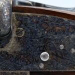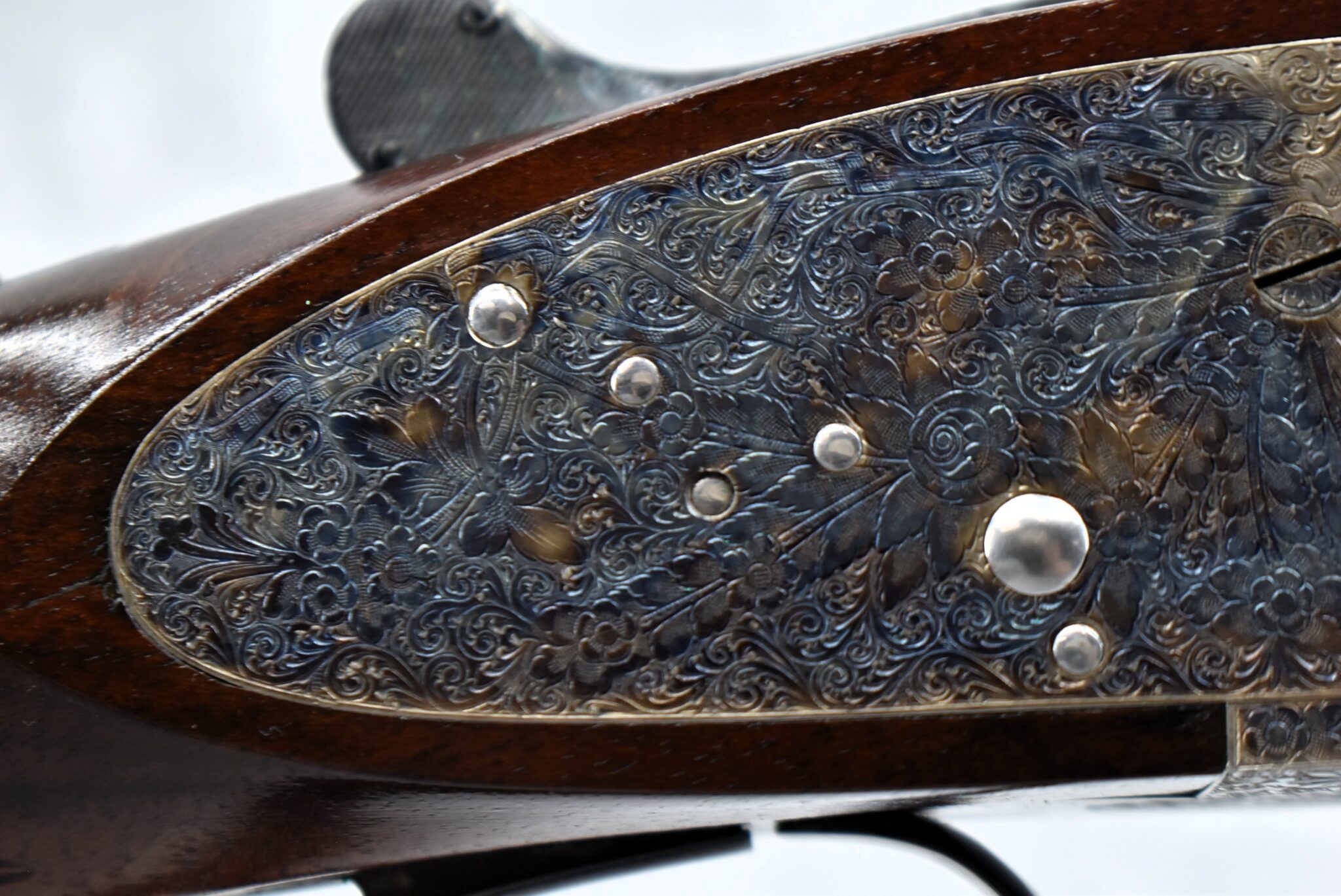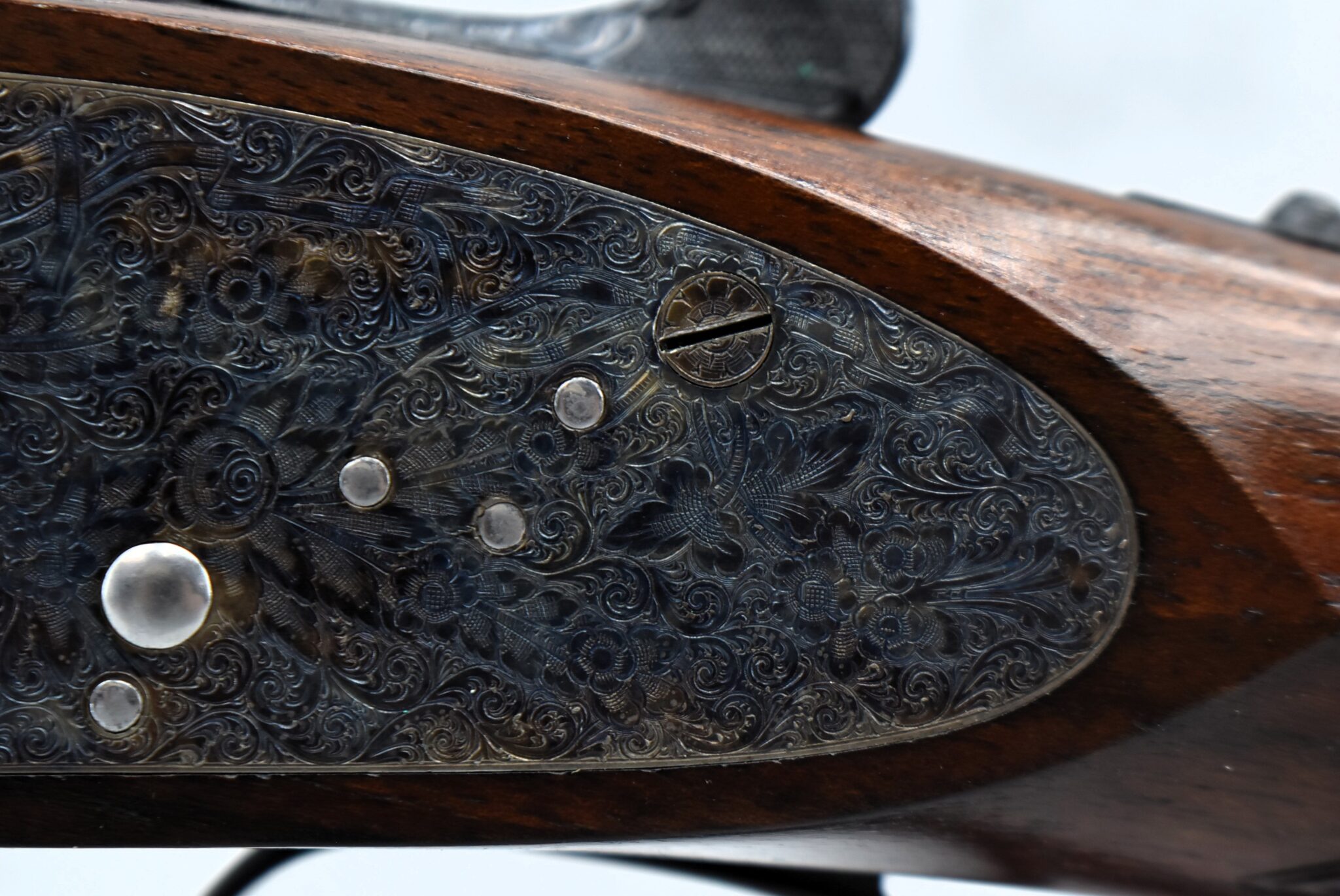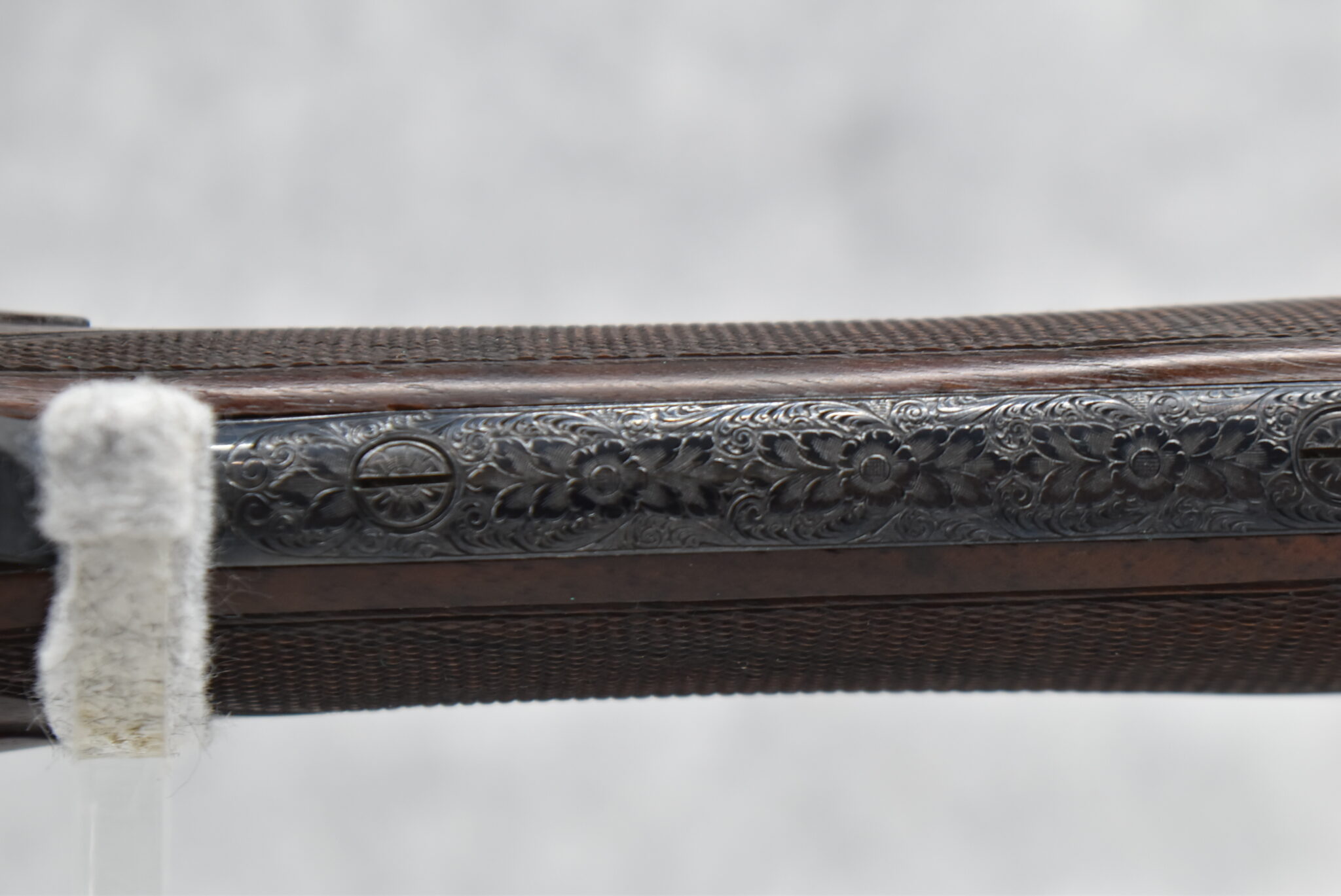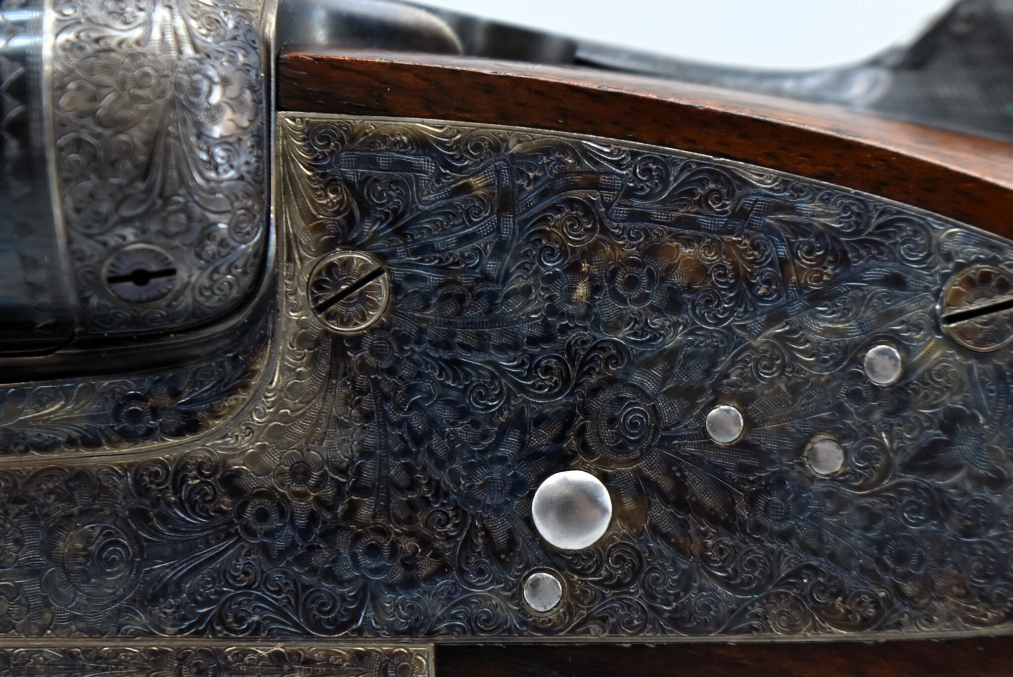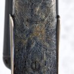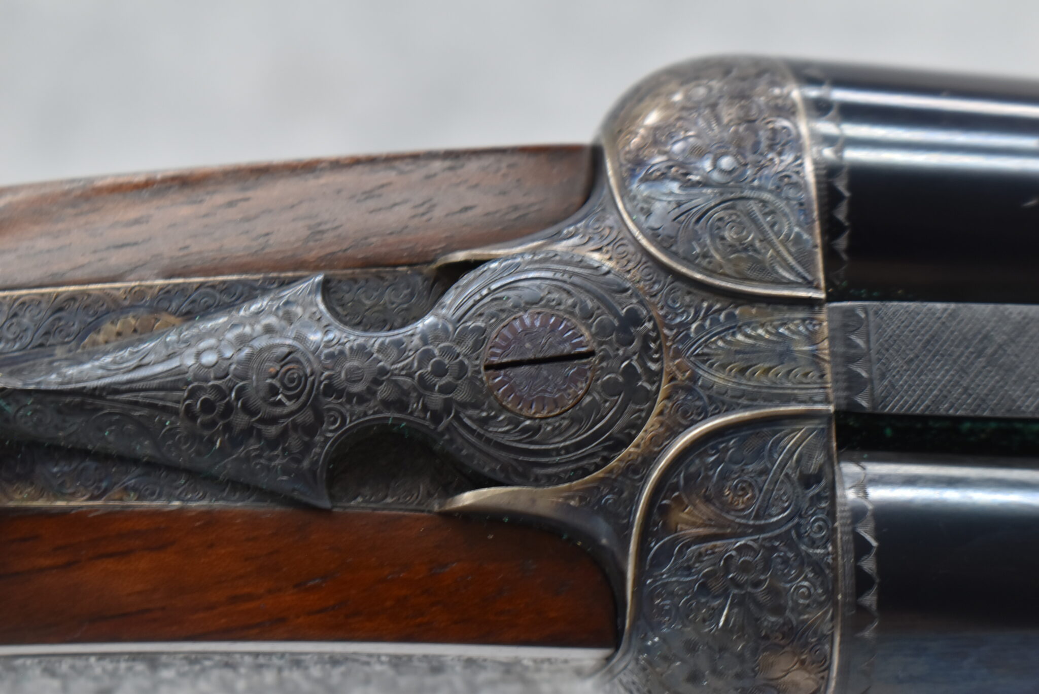 27R. Excellent! Armas Garbi M-200 12ga. Side Lock Ejector Side by Side Shotgun Two-Barrel Set – Serial Number #GA14367 – 1st Set of Barrels Are 28” Solid Rib w/Single Metal Bead Front Sight, Choked Improved Cylinder & Modified w/A Gold Inlay “1” on Top Rib – 2nd Set of Barrels Are 30” Solid Rib w/Single Metal Bead Front Sight, Choked, Full & Modified w/A Gold Inlay “2” on Top Rib – Both Sets Of Barrels Matching Serial Numbered to Gun! – Both Sets of Barrels Retain An Excellent Blued Finish, While the Receiver Retains 95-98% of Strong, Vivid Case Colors w/Fine Scroll Engraving – LOP 14 ½” – Minimum Wall Thickness Set #1 .025 on the Right Barrel, .021 on Left Barrel – Minimum Wall Thickness Set #2 .031 on Right Barrel, .034 on Left Barrel – Gun is Fitted w/A Highly Figured Fine Checkered Straight Grip Wood Butt Stock to a Pachmayr Recoil Pad w/Matching Fine Checkered Beavertail Forearm – w/Single Trigger – In Makers Leather Two-Barrel Take Down Case w/Green Felt Interior w/Extra Firing Pins & Springs w/Key to Case