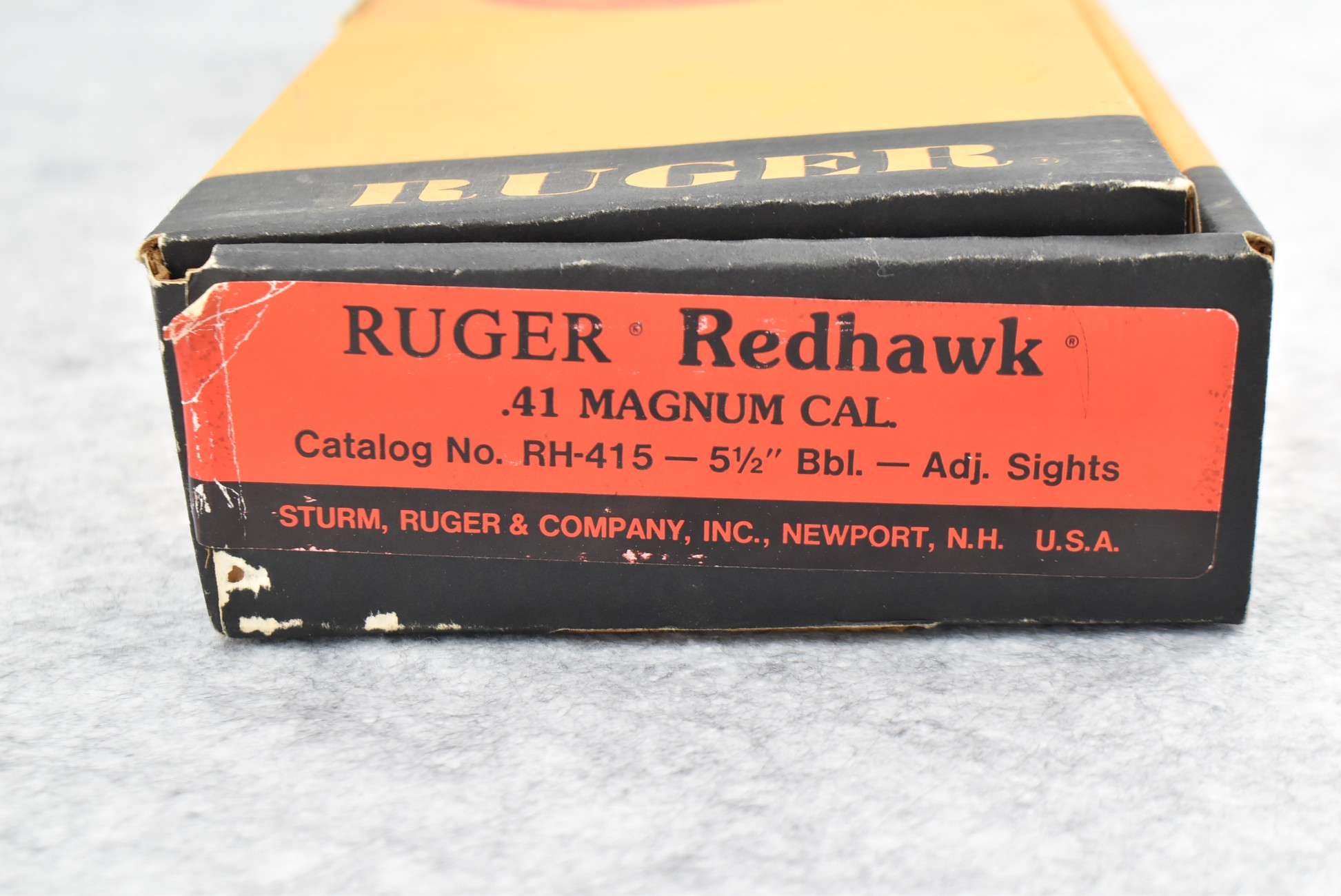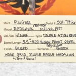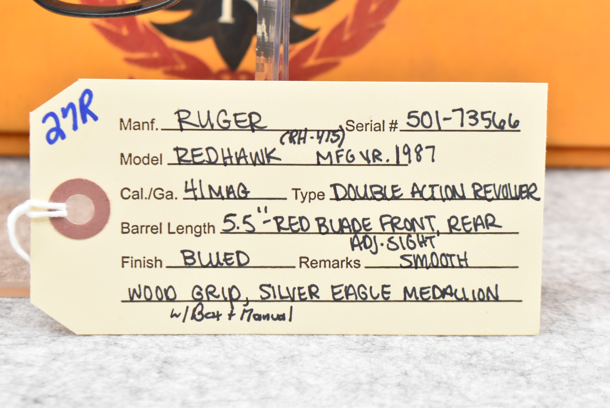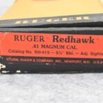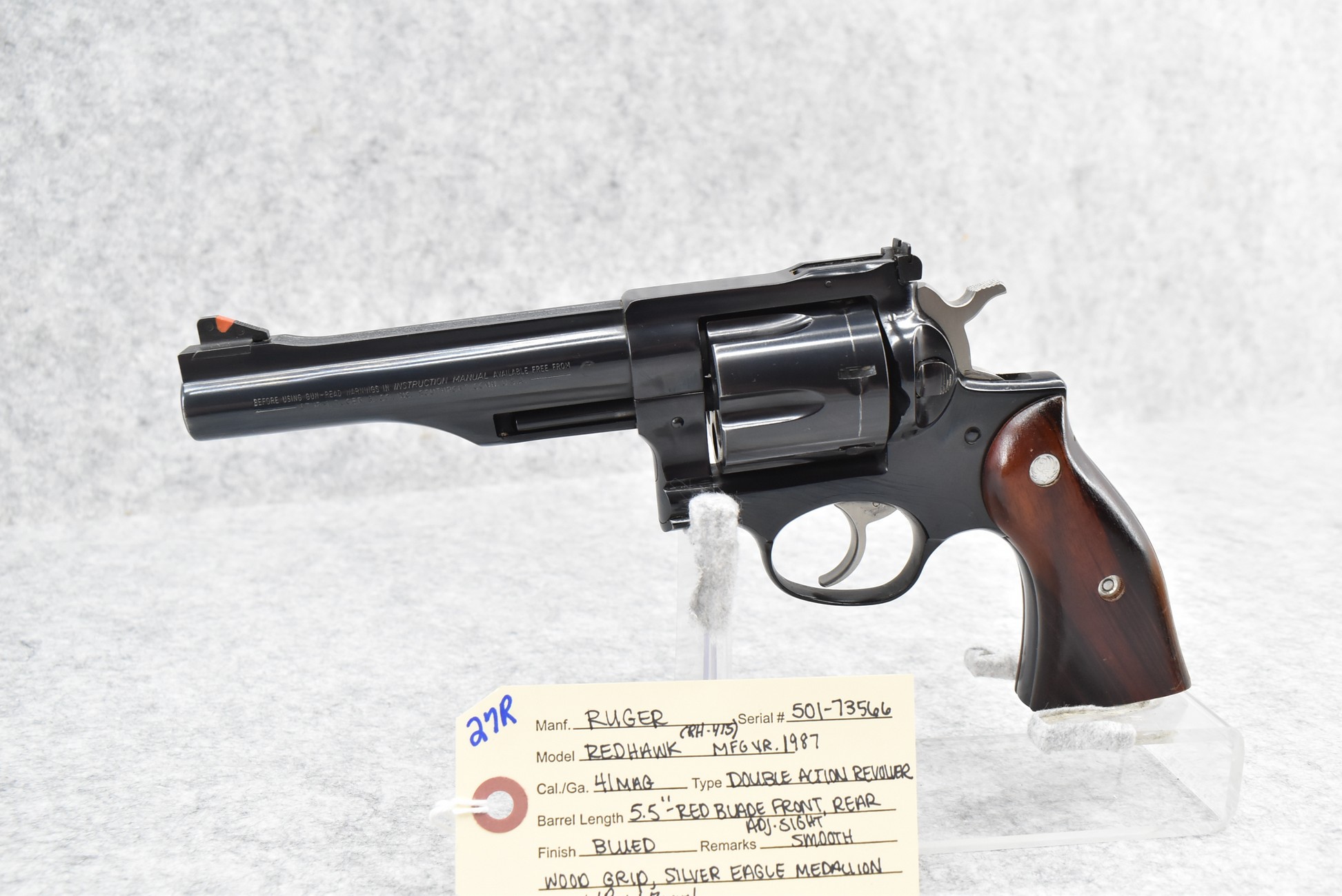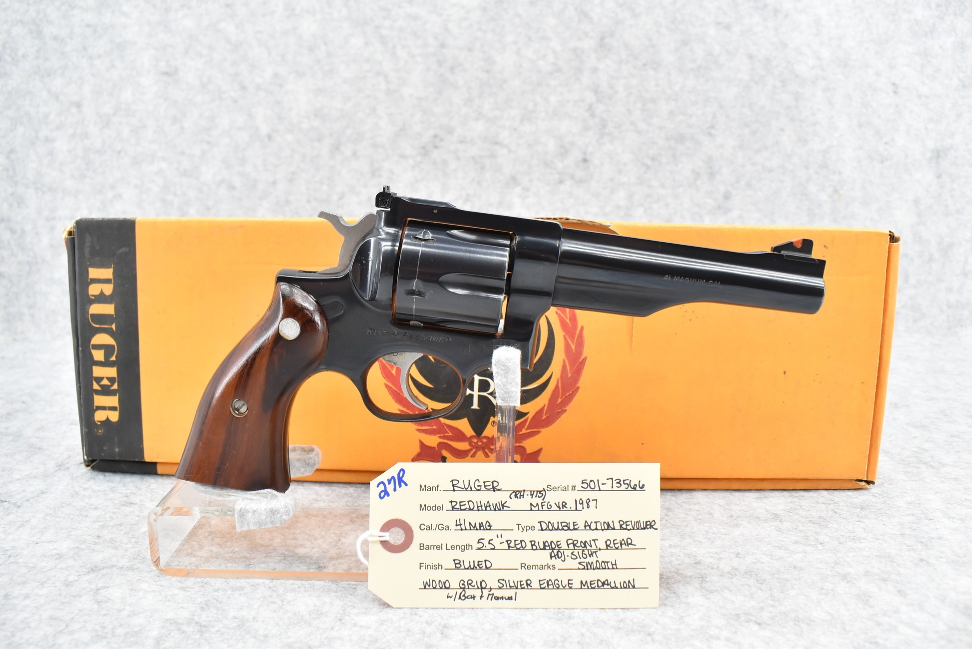 27R.       Ruger – Mod. Redhawk (RH-415) – 41 Mag. Cal. Double Action Revolver – w/5½” Barrel w/Red Blade Front and Adjustable Rear Sights – Blued Finish – w/Smooth Wood Grip w/Ruger Silver Eagle Medallion – Manufactured in 1987 – w/Box and Manual