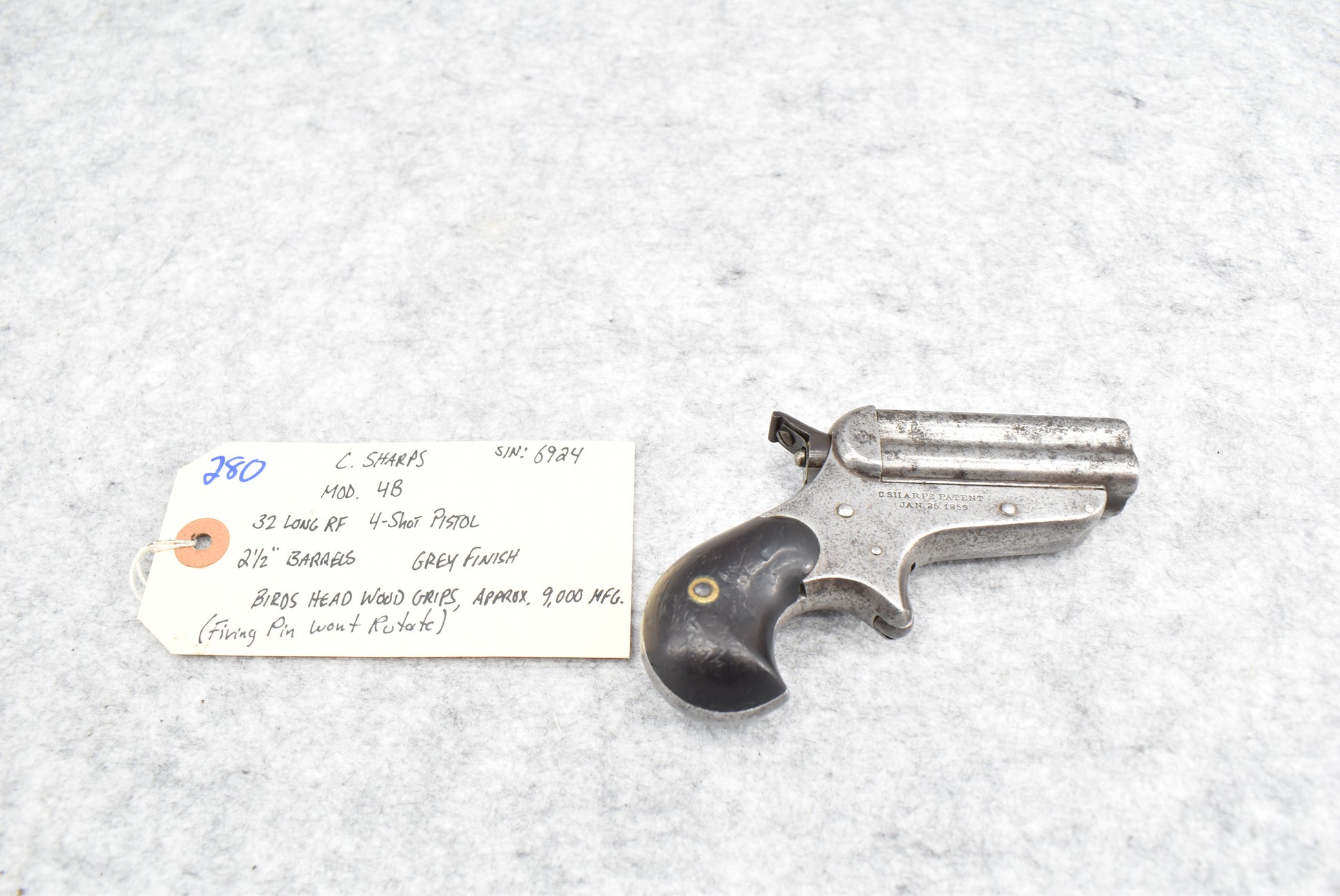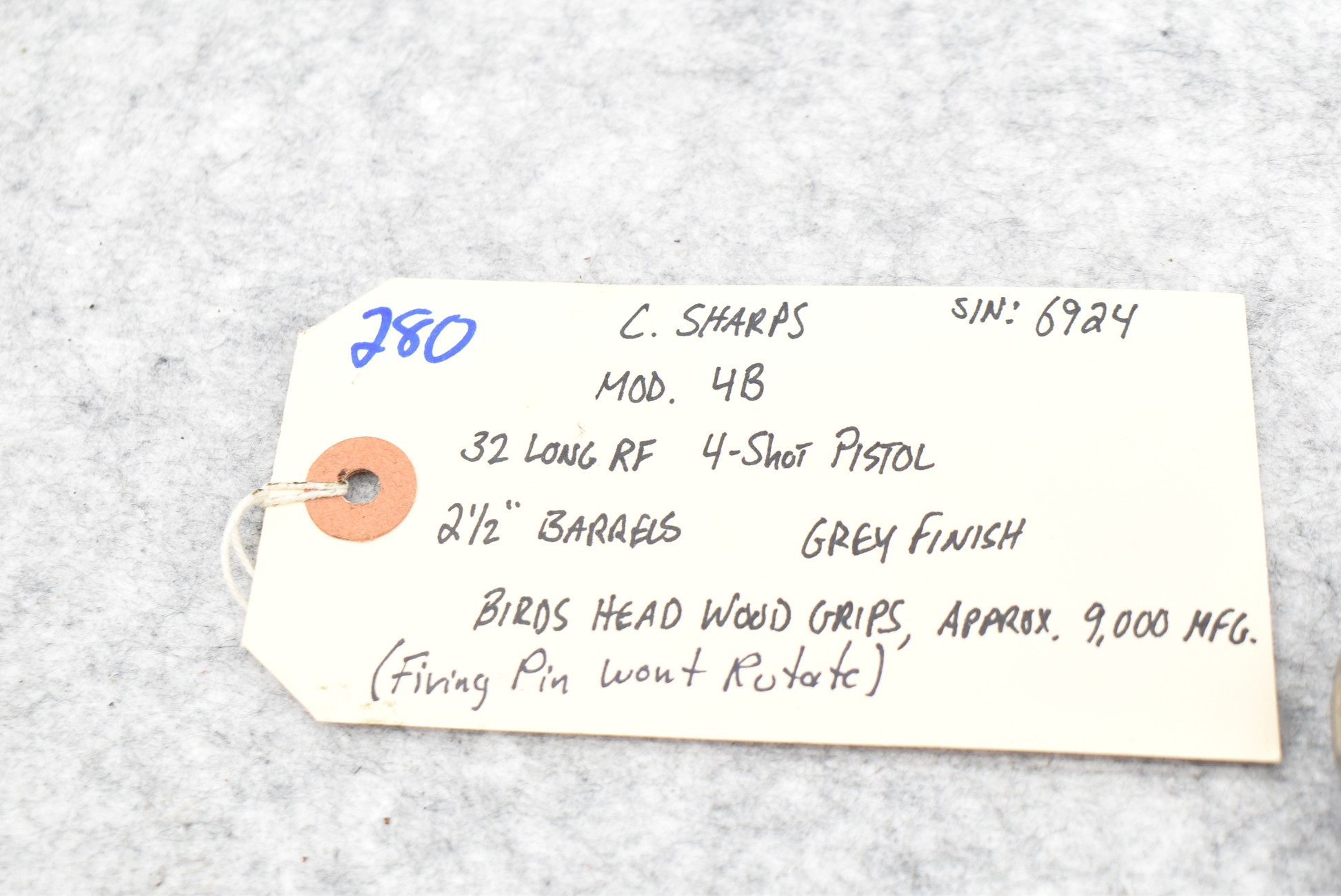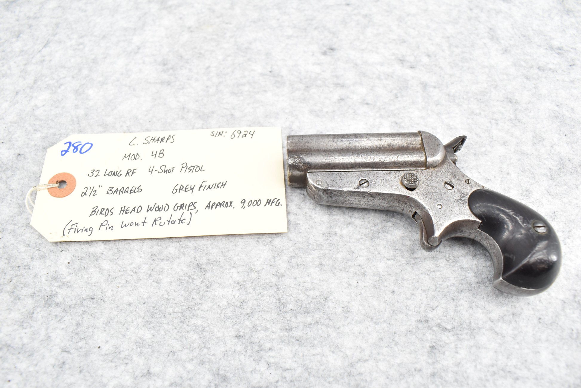 280. C. Sharps – Mod. 4B – 32 Long RF Cal. 4-Shot Pistol – w/2 ½” Barrels – Gray Finish – w/Birds Head Wood Grips – Approx. 9,000 Mfg. – Note: Firing Pin Won’t Rotate