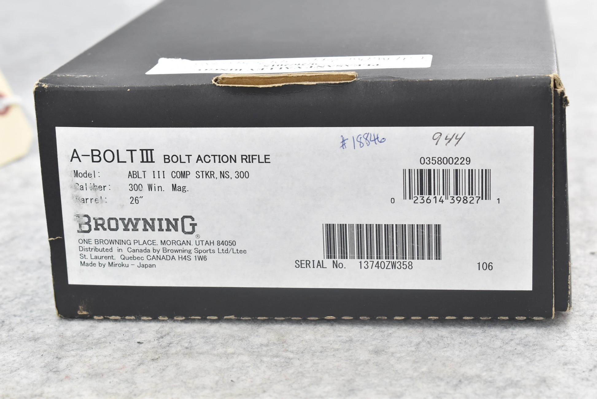 280R. Browning – Mod. A-Bolt III Composite Stalker – 300 Win. Mag. Cal. Bolt Action Rifle – w/26” Barrel – Matte Blued Finish – w/Textured Pistol Grip Black Synthetic Stock w/Factory Recoil Pad – w/Detachable Mag – Unfired w/Factory Box & Manual