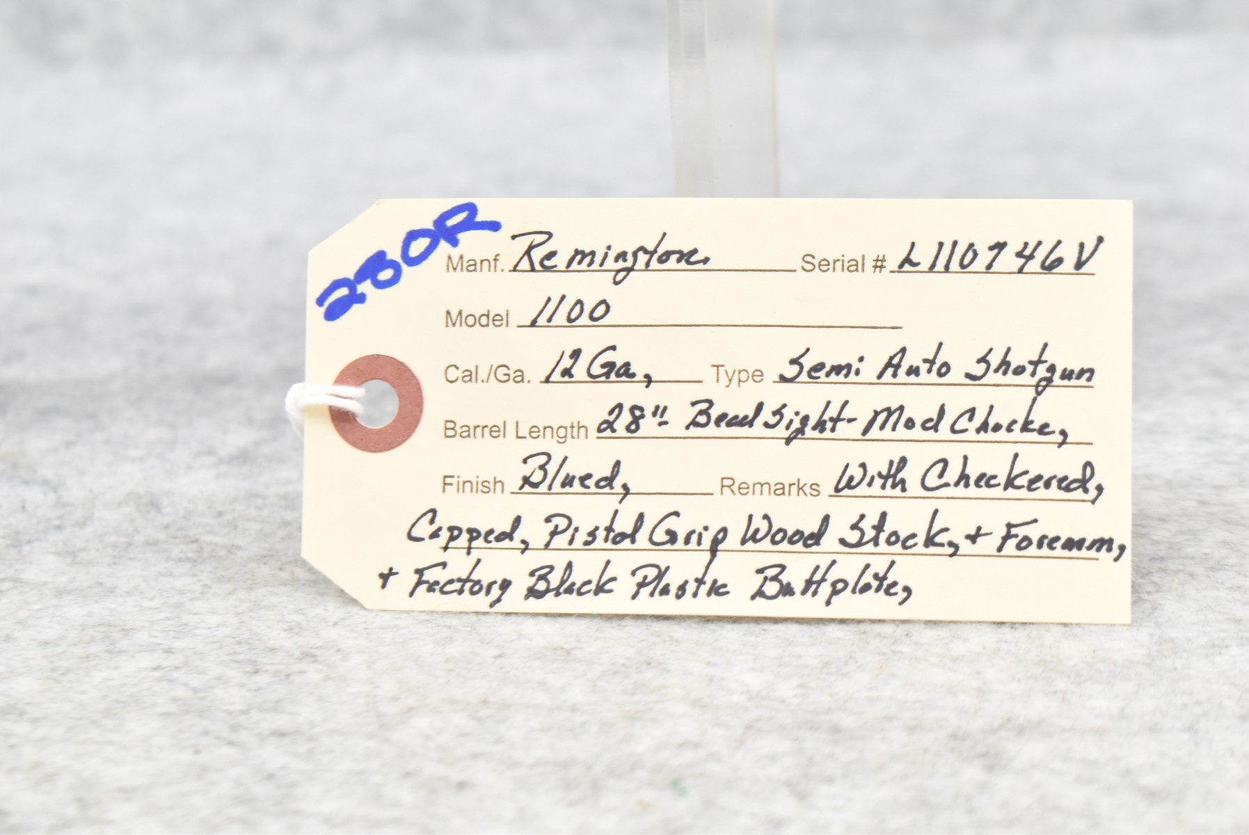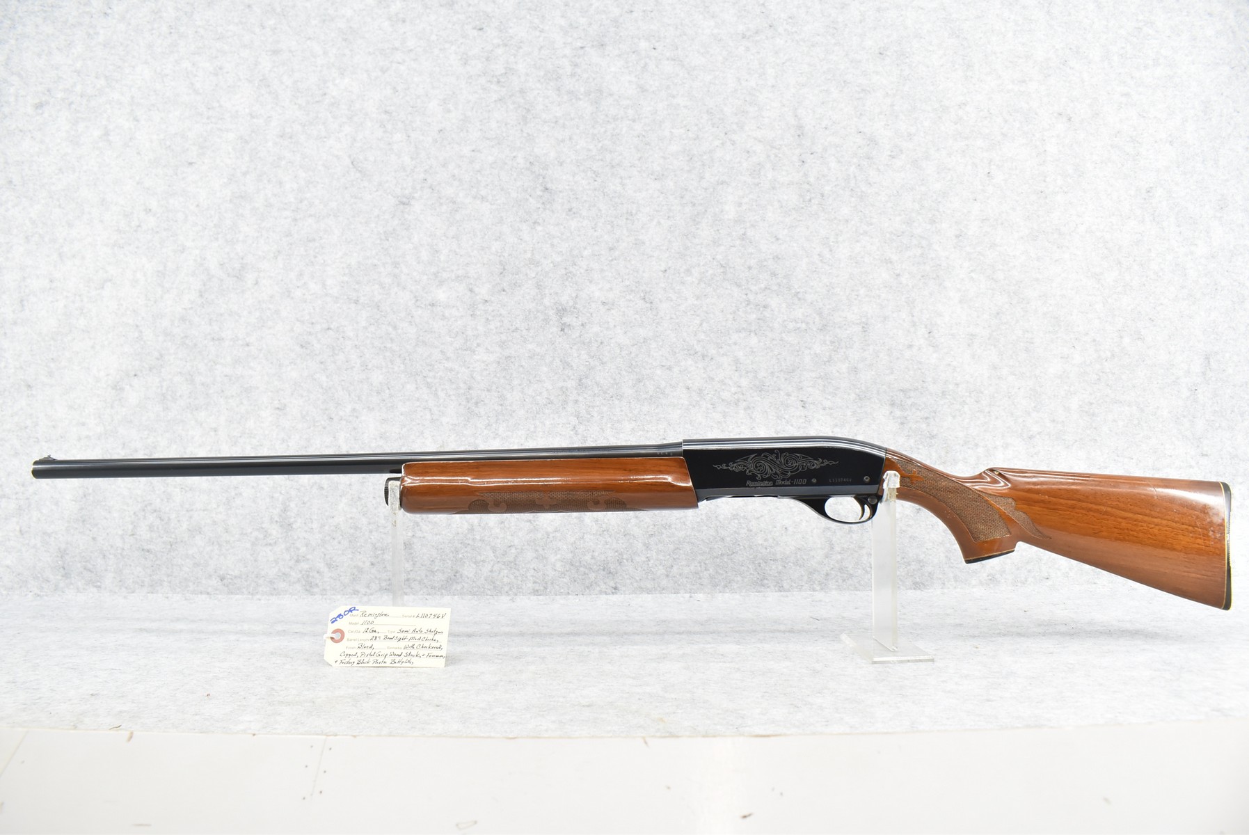 280R.     Remington – Mod. 1100 – 12ga. Semi-Auto Shotgun – w/28” Mod. Choke Barrel w/Bead Sight – Blued Finish – w/Checked Capped Pistol Grip Wood Stocks w/Factory Butt Plate